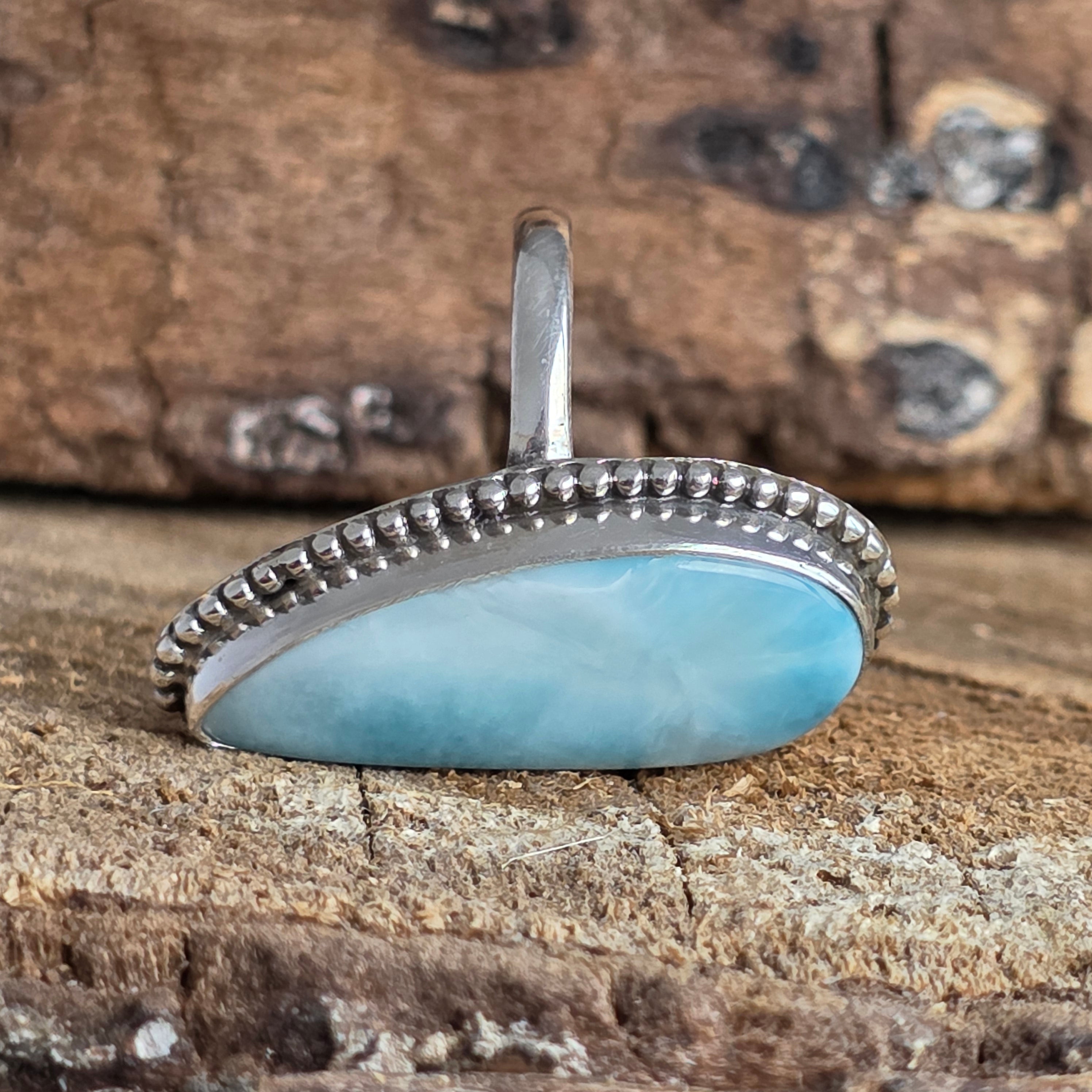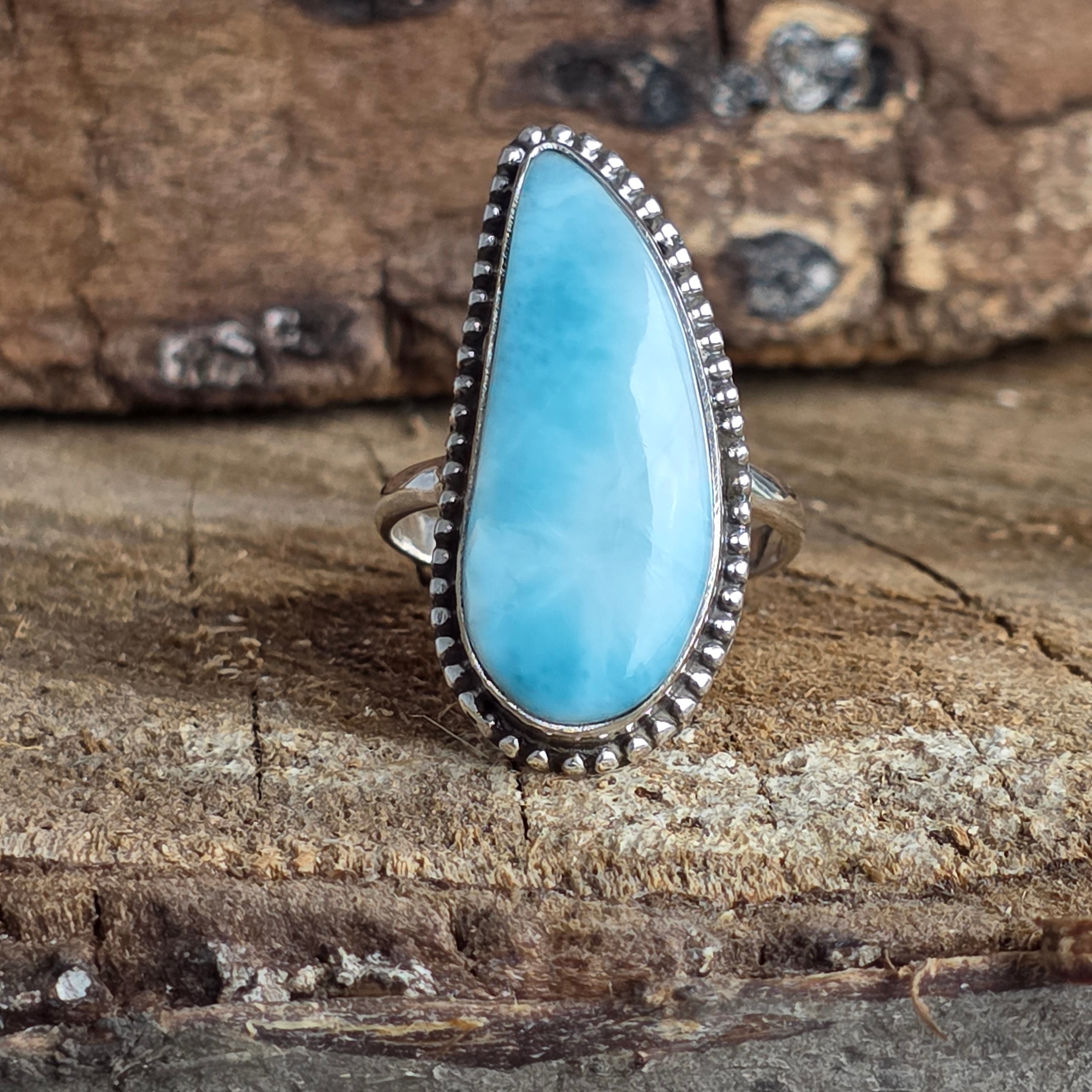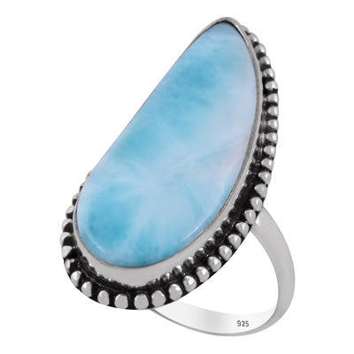 Един впечатляващ пръстен от сребро 925 с естествен ларимар в удължена форма, която подчертава неговите сини и тюркоазени нюанси. Дизайнът rawa work, изработено ръчно, добавя дълбочина и текстура, превръщайки всяко отражение в покана за спокойствие и яснота.