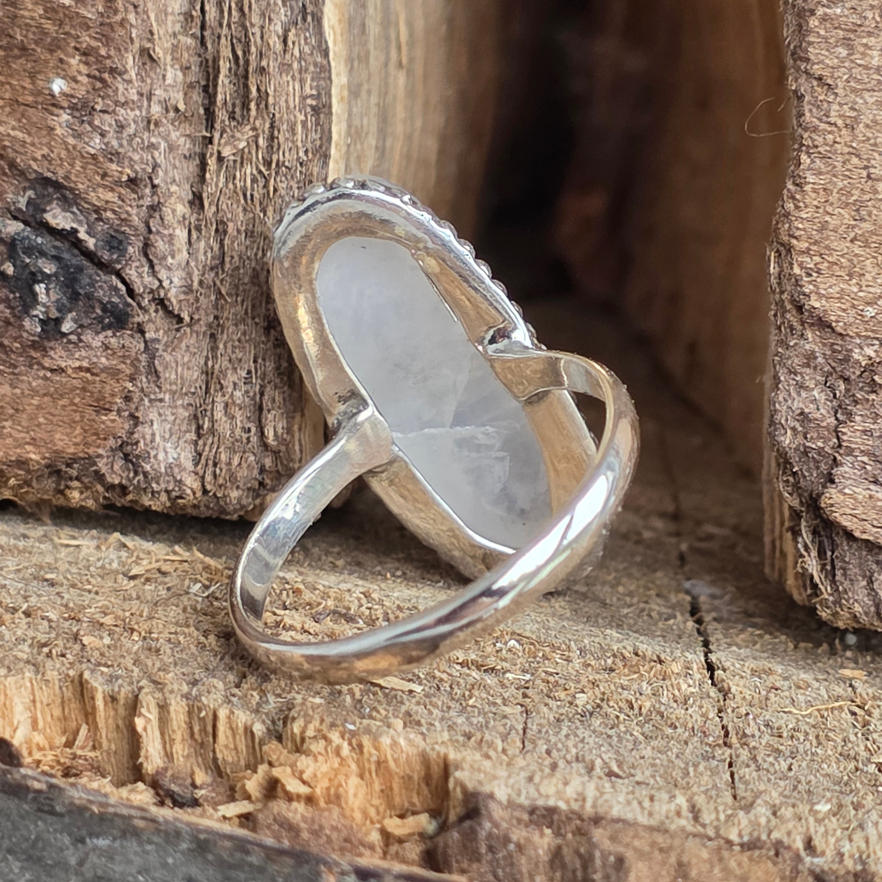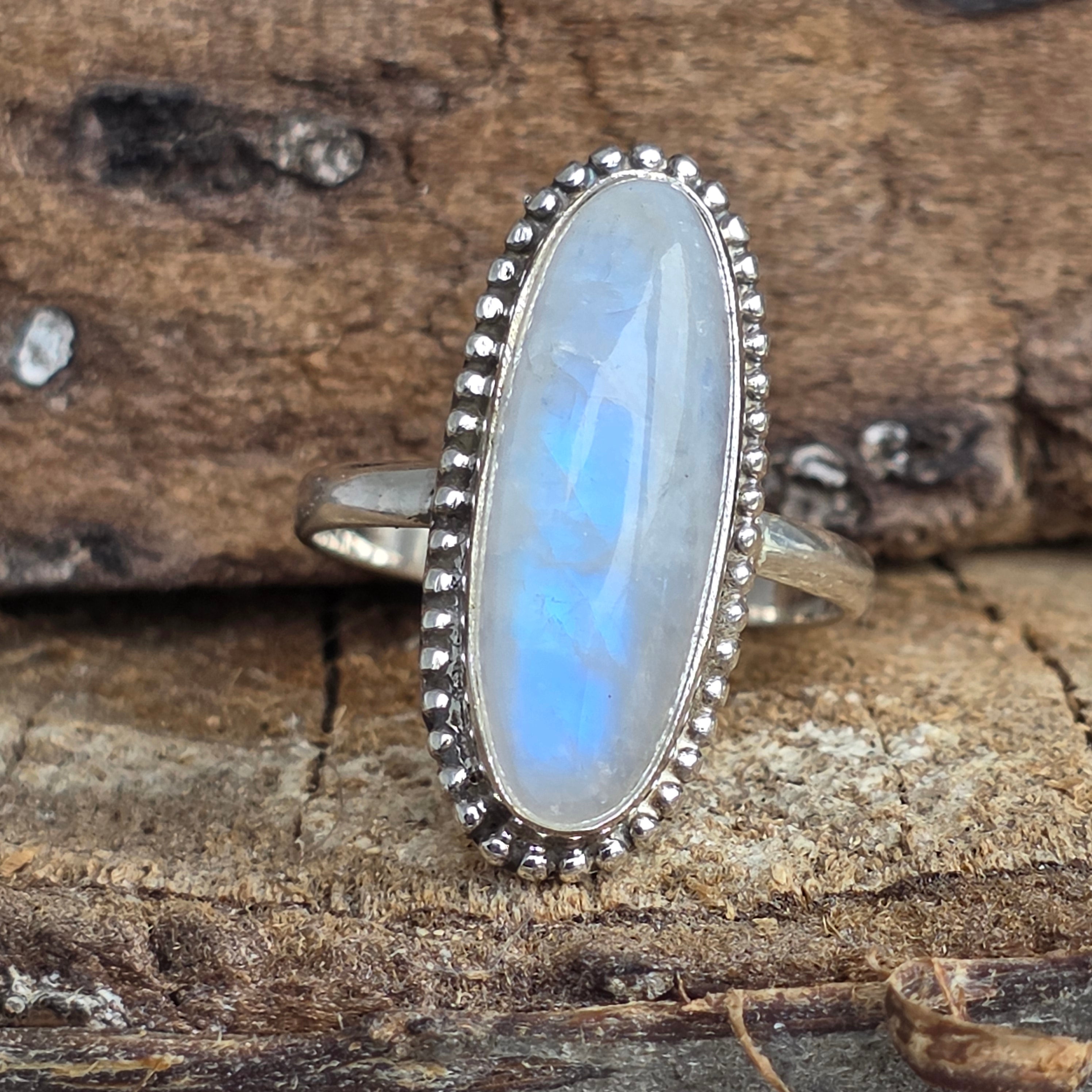 Елегантен и ярък сребърен пръстен 925 с естествен дъгов лунен камък, разпознаваем със синьо, сребърни и перлени отражения. Дизайн rawa работа ръчно изработеното подчертава издължената форма на камъка, създавайки бижу, което е изискано и деликатно в същото време.