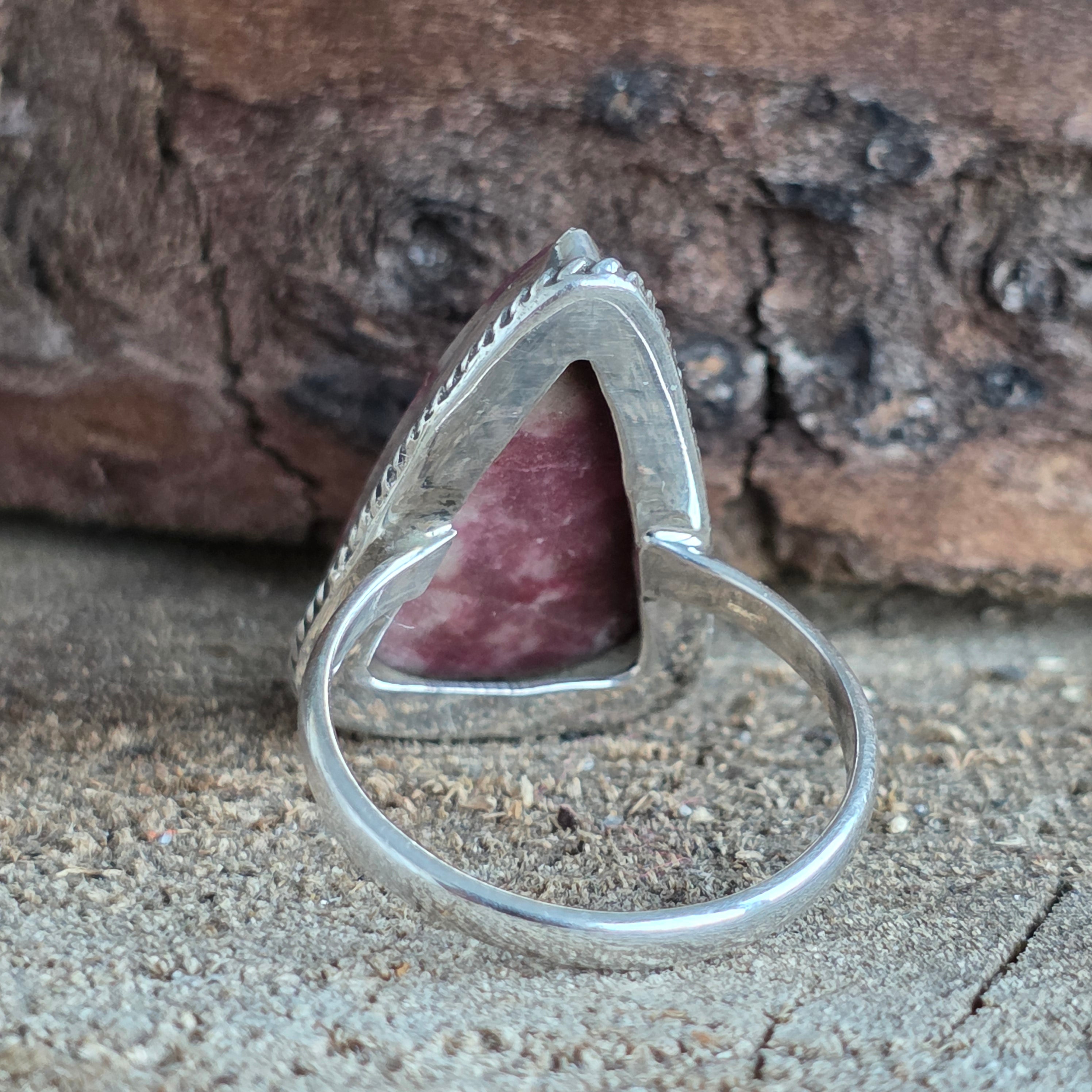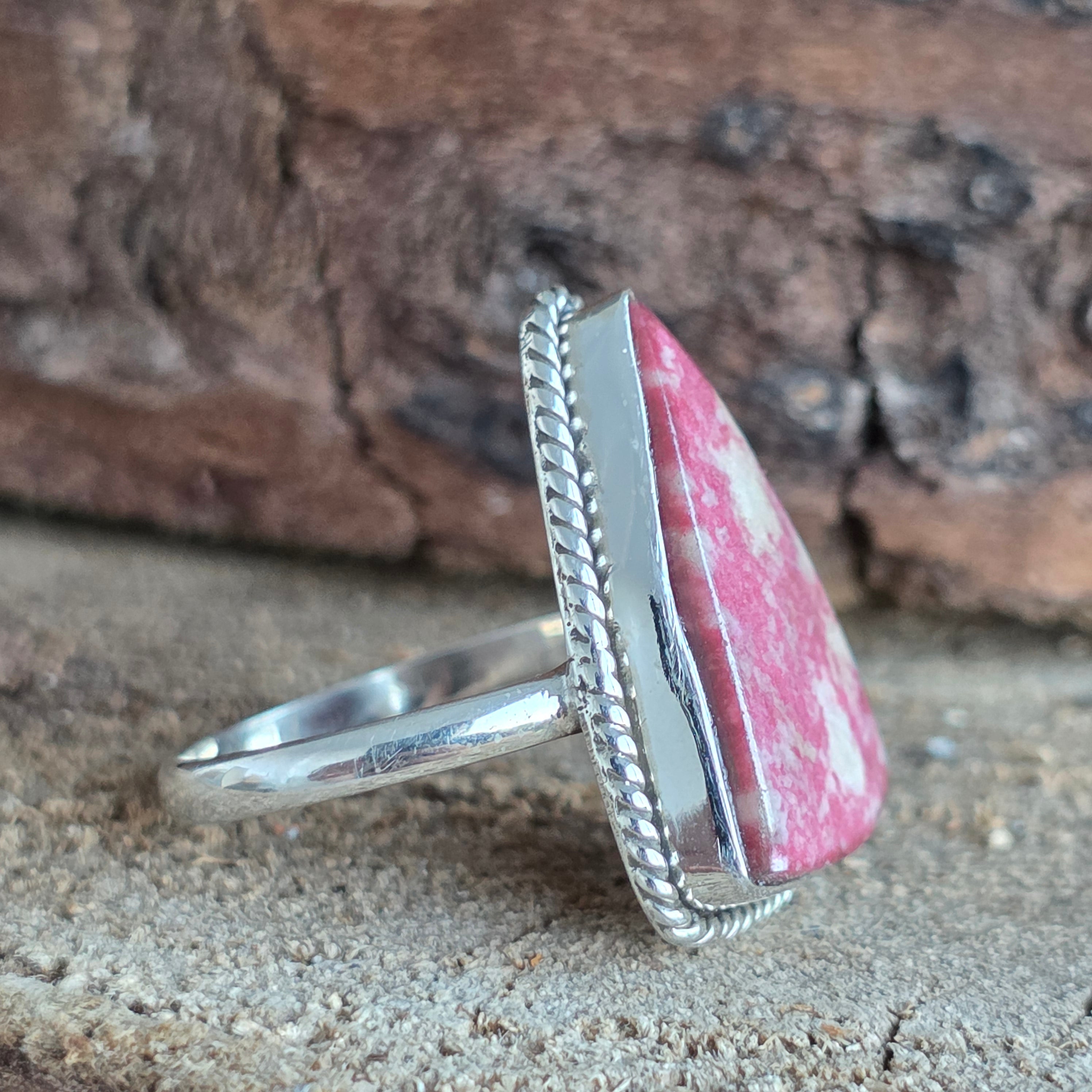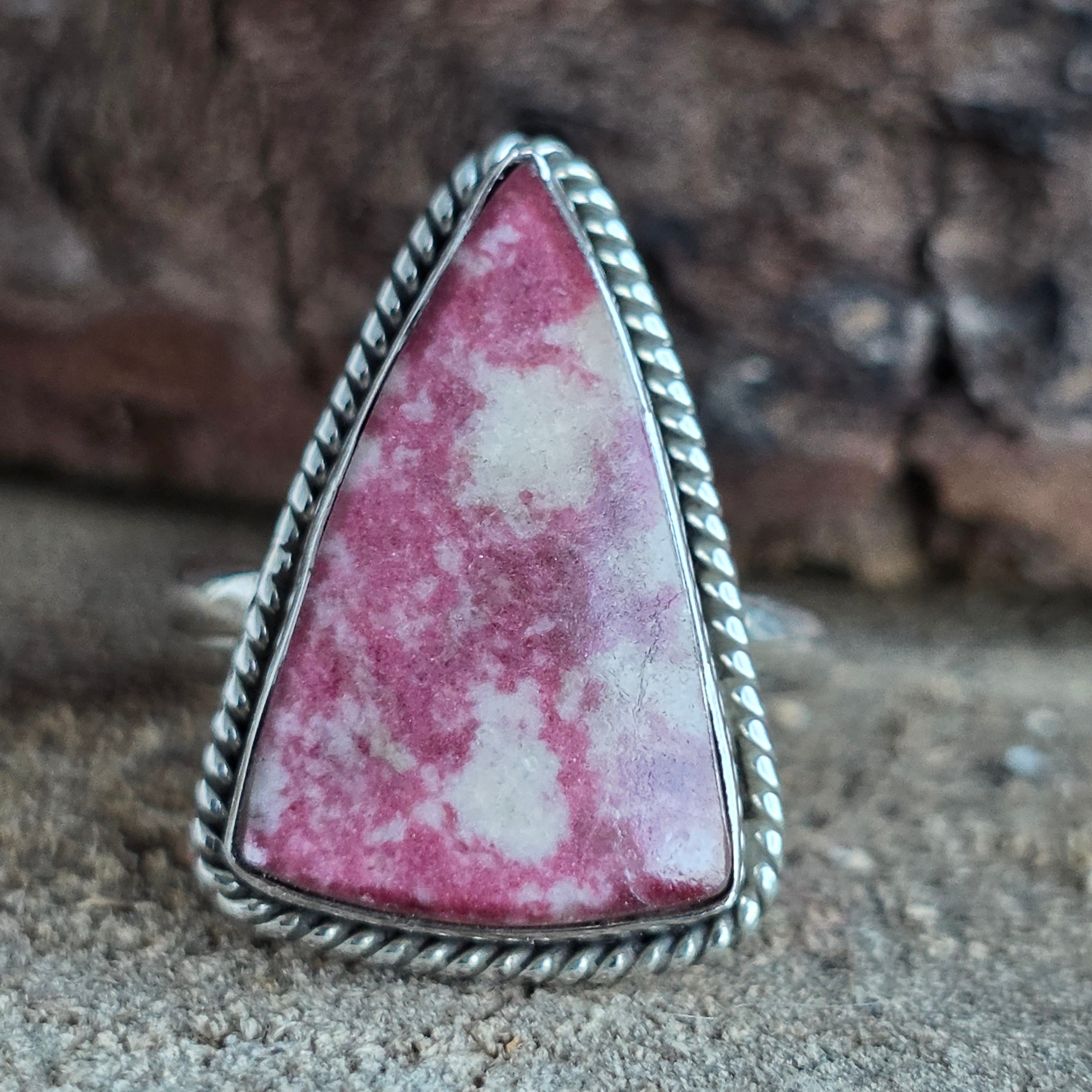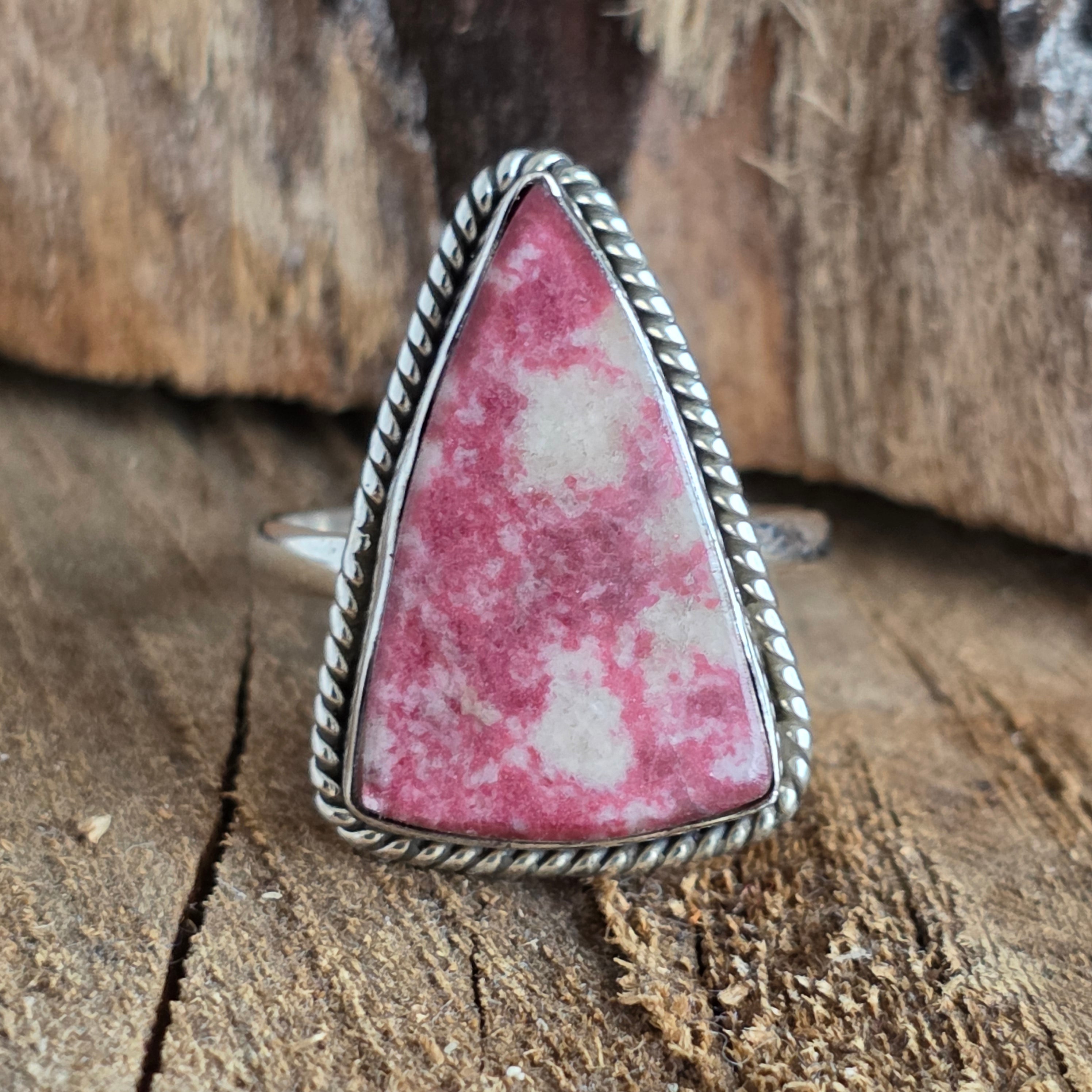 Пръстен от сребро 925, който носи в себе си енергията на северната земя – Тулитът, розова разновидност на зоизит, с естествена текстура и деликатни цветови вариации между сьомга розово, фуксия и варовиково бяло.