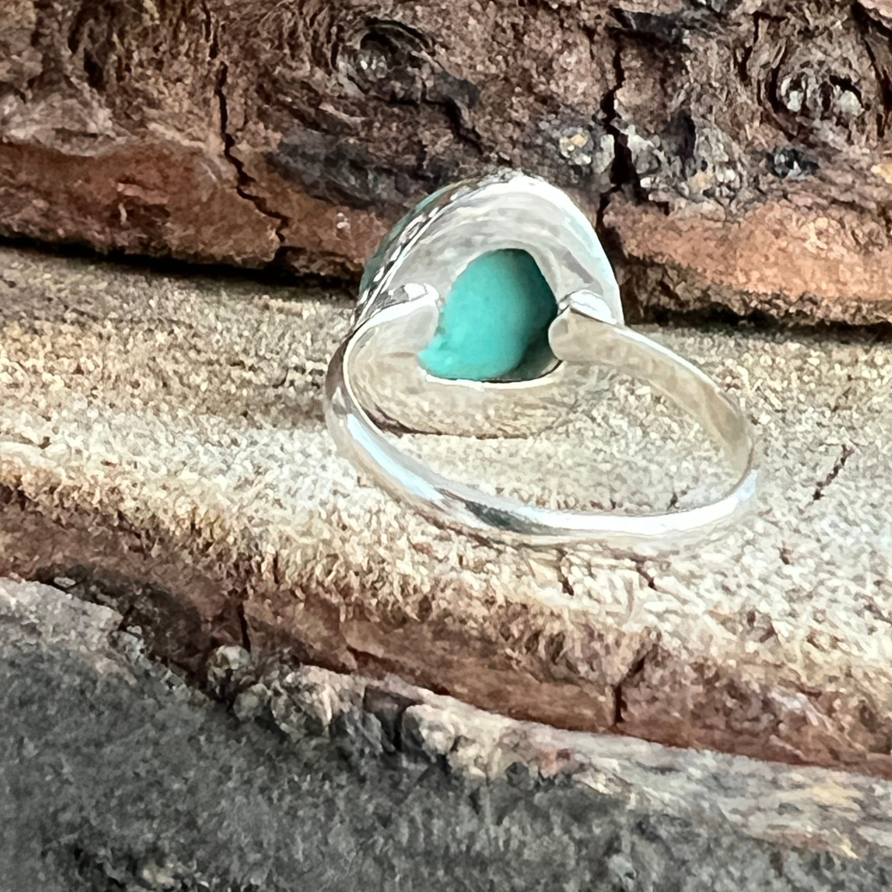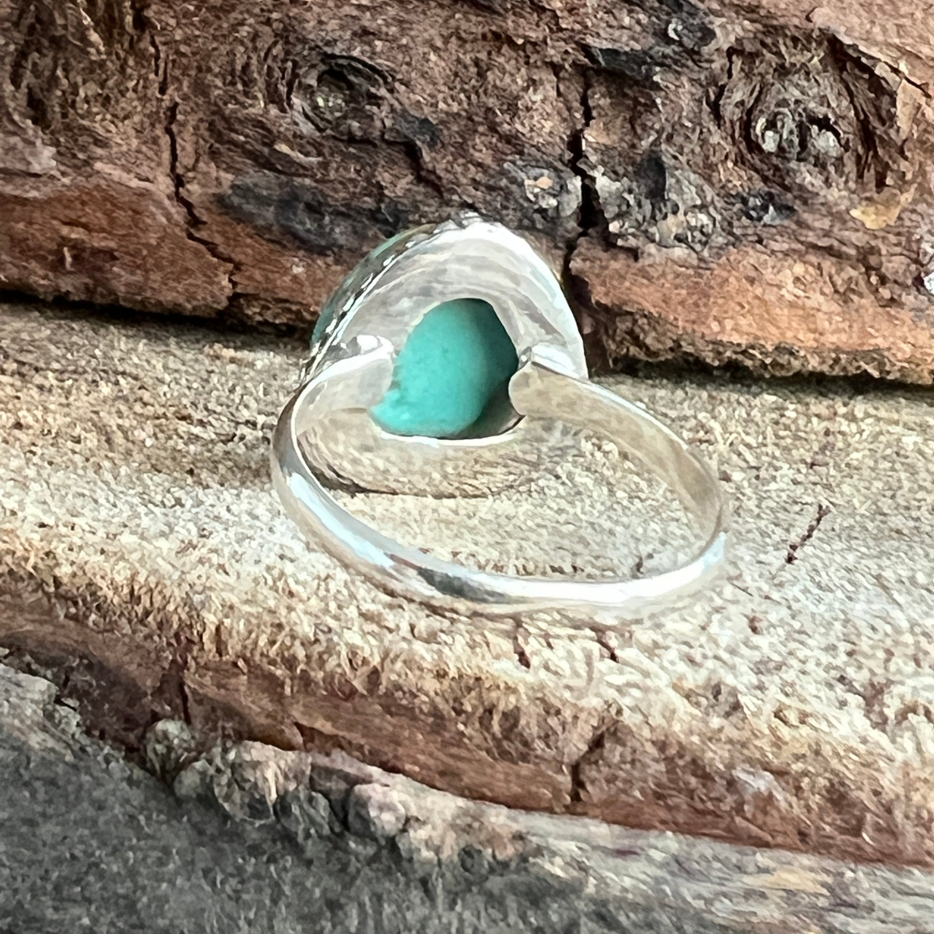 Елегантен пръстен от сребро 925,с натурален камък тюркоаз с нюанси, вариращи между небесносиньо и аквамарин, пресечен с фини кафяви и сиви жилки. Минималистичният дизайн тип plain collet оставя цялото внимание върху камъка, като подчертава неговата органична красота и автентична текстура.