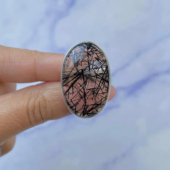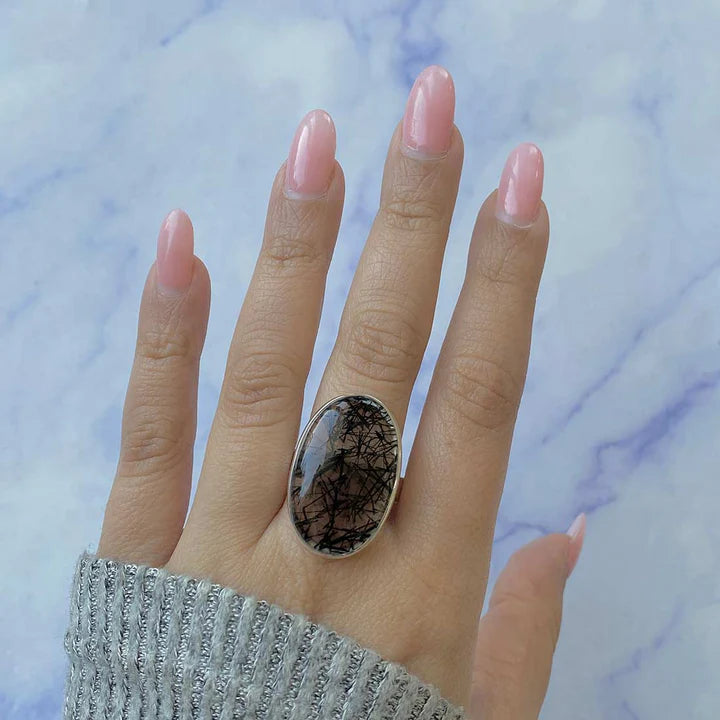 Изберете този сребърен пръстен с натурален черен рутилен кварц, едно бижу с изразителен характер и завладяващ вид, подчертан от фините, тъмни включвания, които създават уникална игра от линии вътре в камъка. Всеки екземпляр е различен, превръщайки това бижу в автентичен и специален избор.