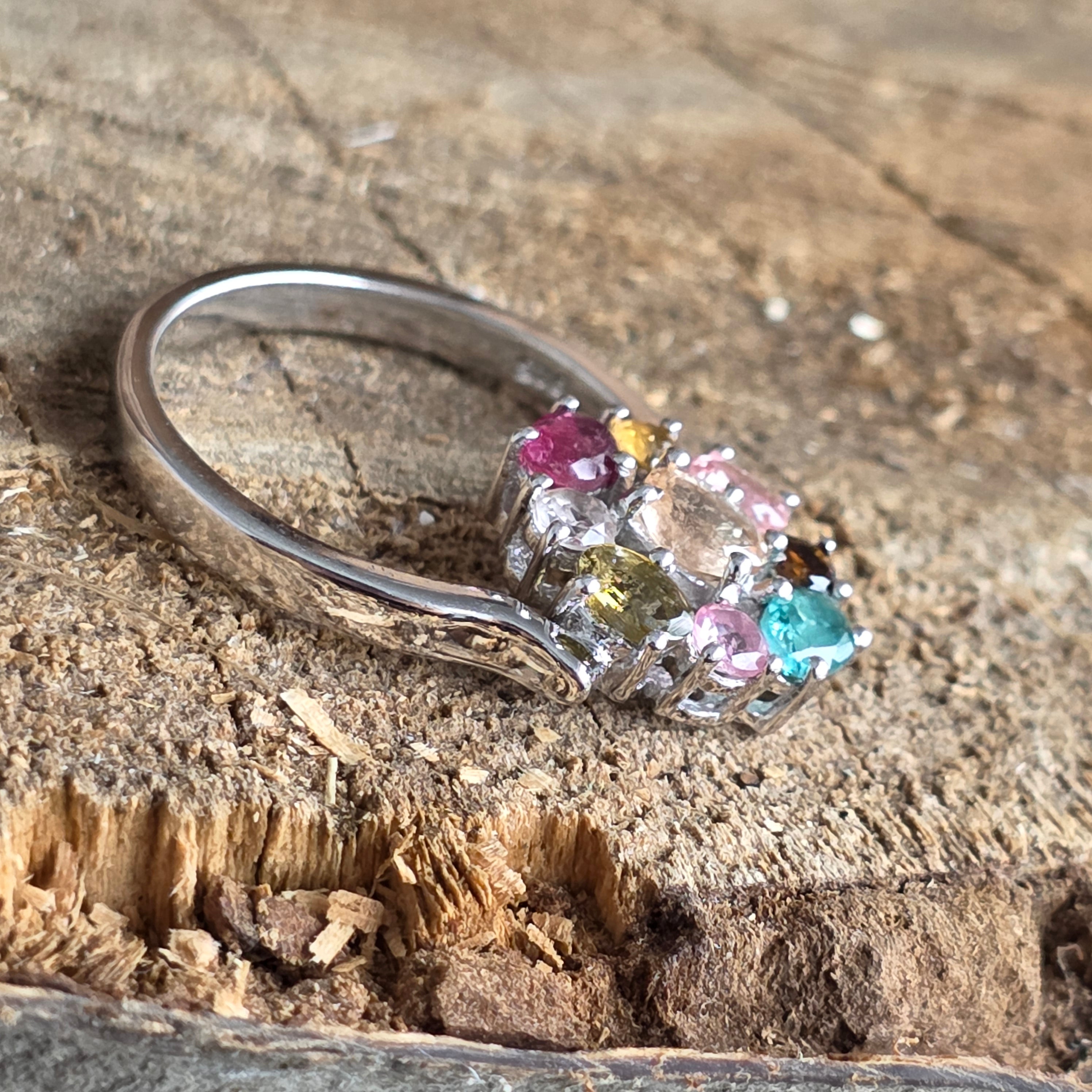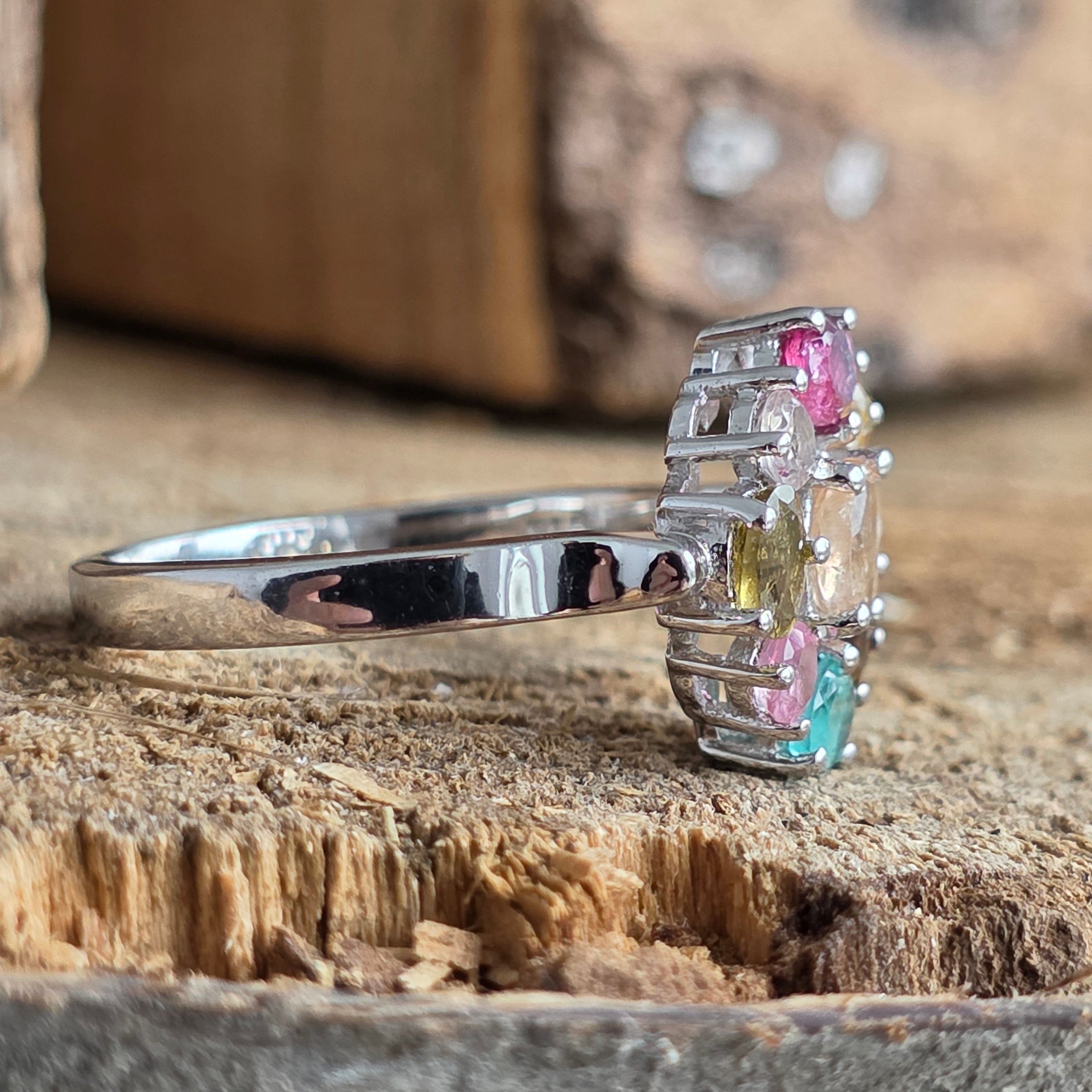 Експлозия от цвят, уловен в елегантен дизайн – това 925 сребърен пръстен обединява очарователните нюанси на естествен турмалин, от нежно розово до живо зелено и златисто жълто.