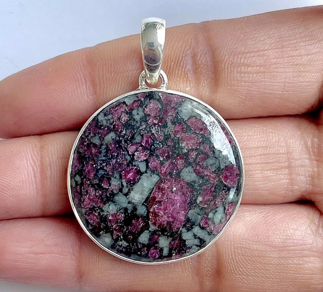Тази уникална висулка от евдиалит излъчва сила и страст чрез живия контраст между наситено червено и минерално зелено, които се преплитат в естествена мозайка. Неговата органична текстура прави всяко парче абсолютно неповторимо, носейки в себе си енергията на Земята в нейната най-жива форма.