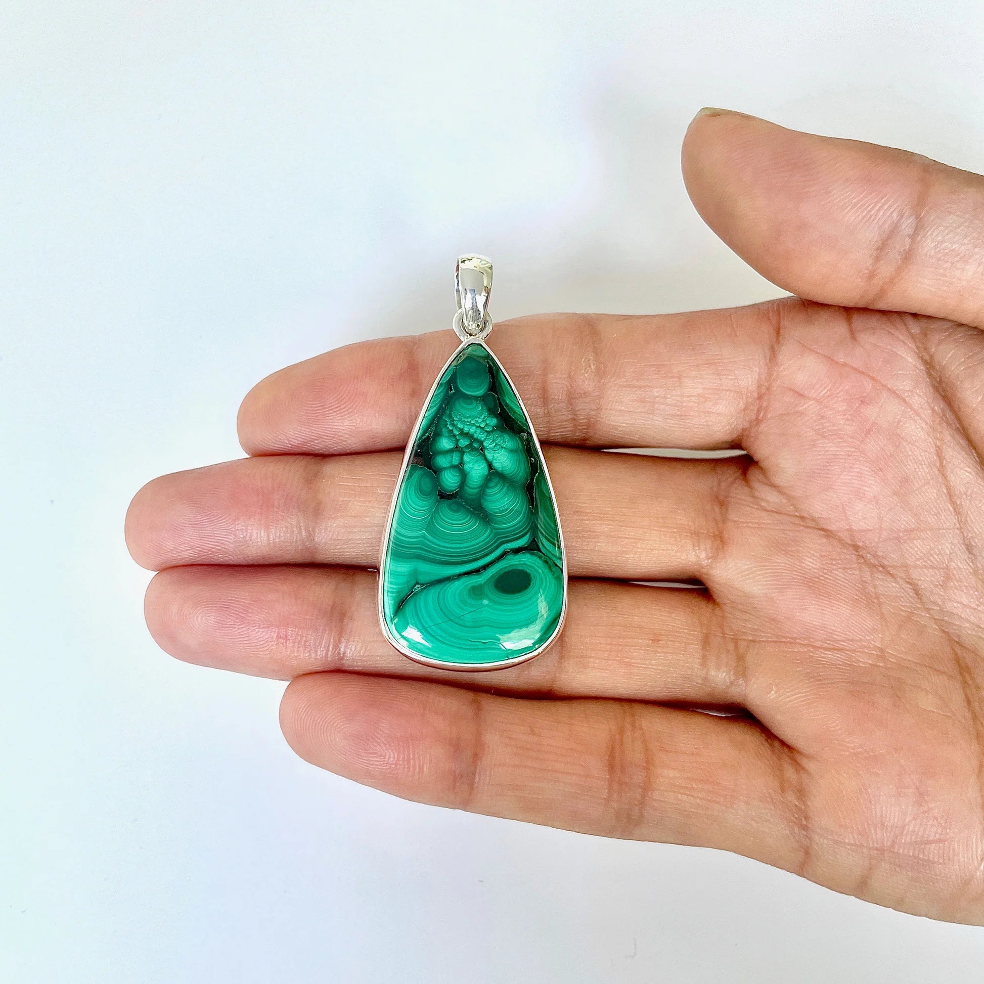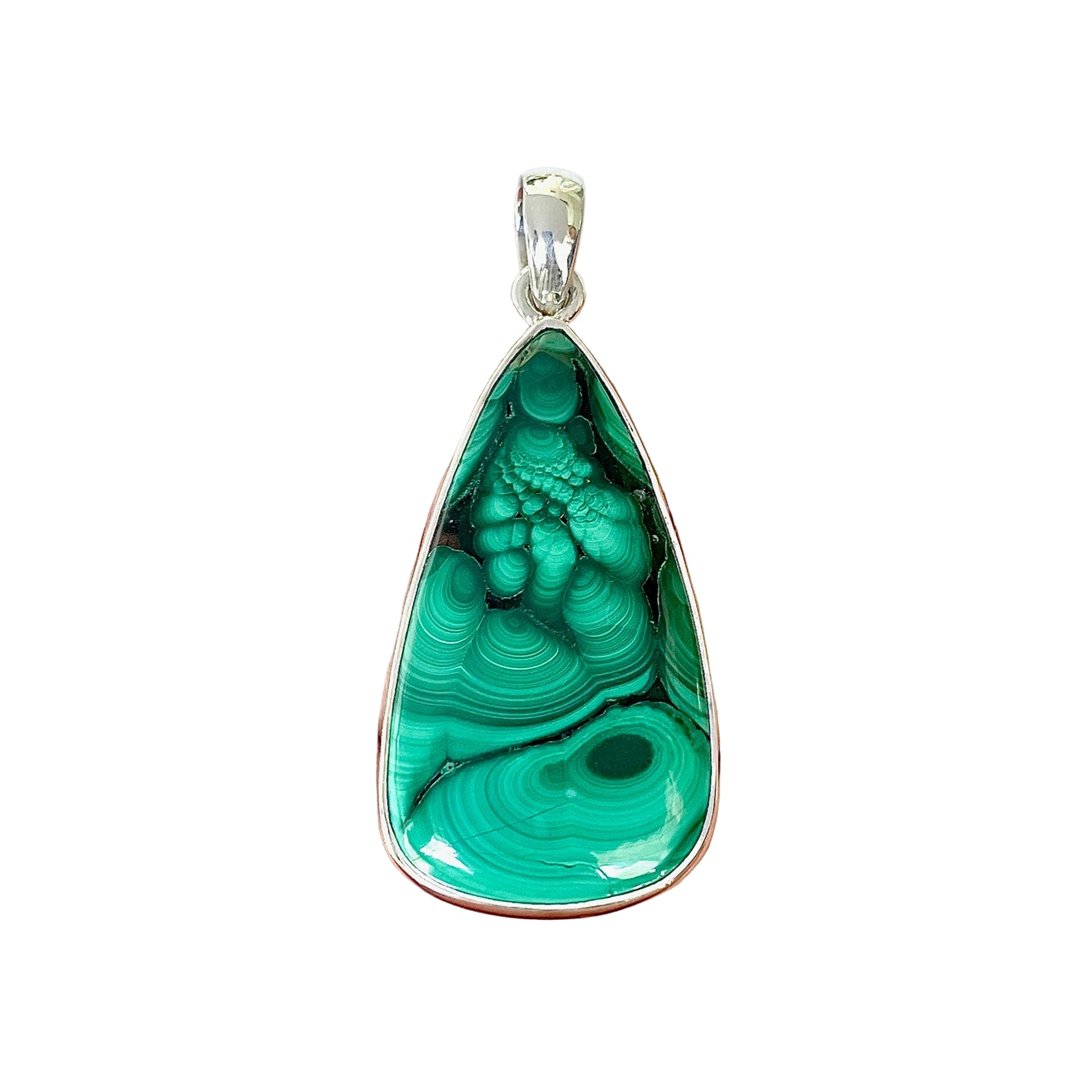 Тази масивна висулка от естествен малахит и 925 сребро се откроява със своите интензивни нюанси на зелено и ефектни кръгли шарки, характерни за този минерал. Овално изрязаният камък в стил кабошон е подсилен от семпла сребърна обстановка, която запазва естествената му красота.
