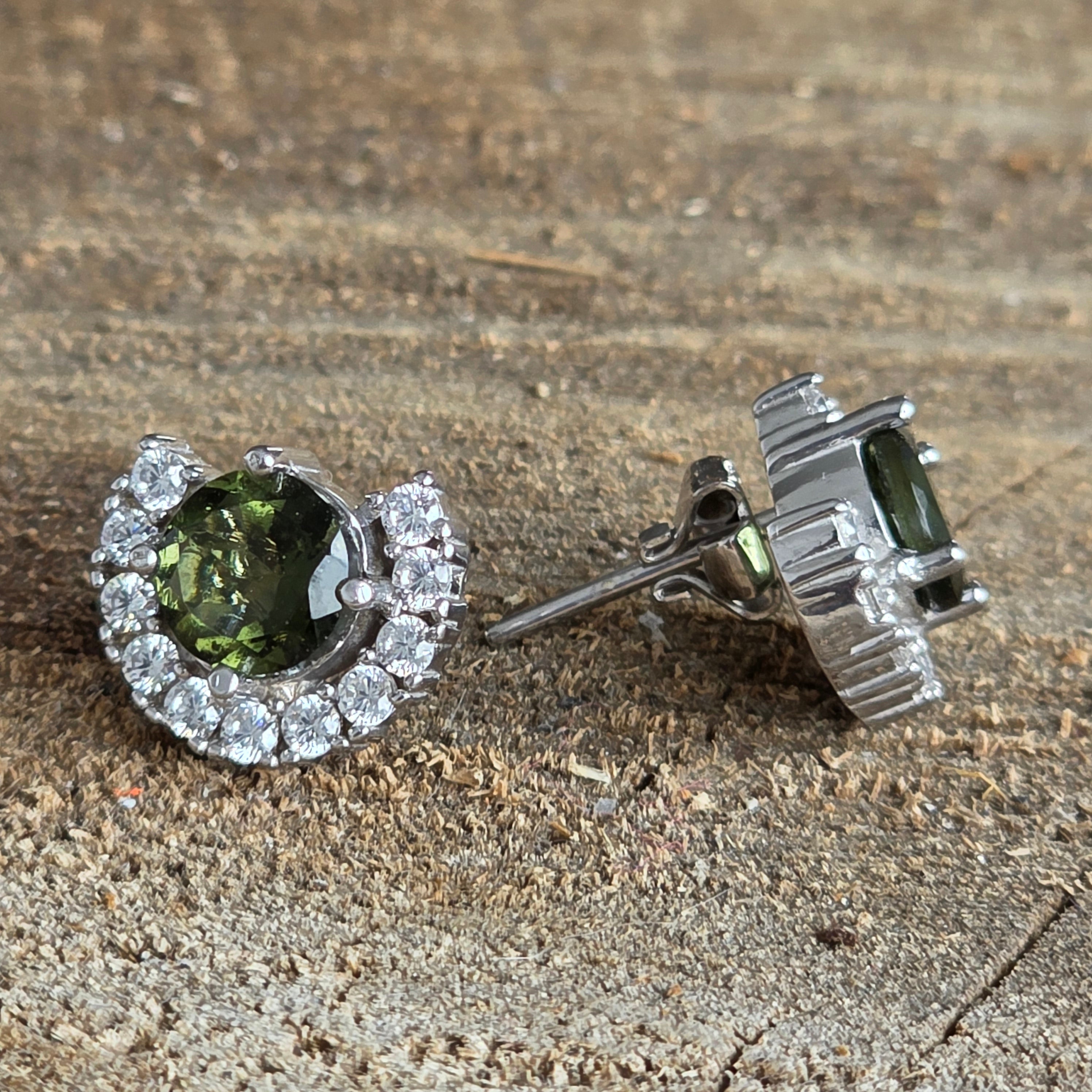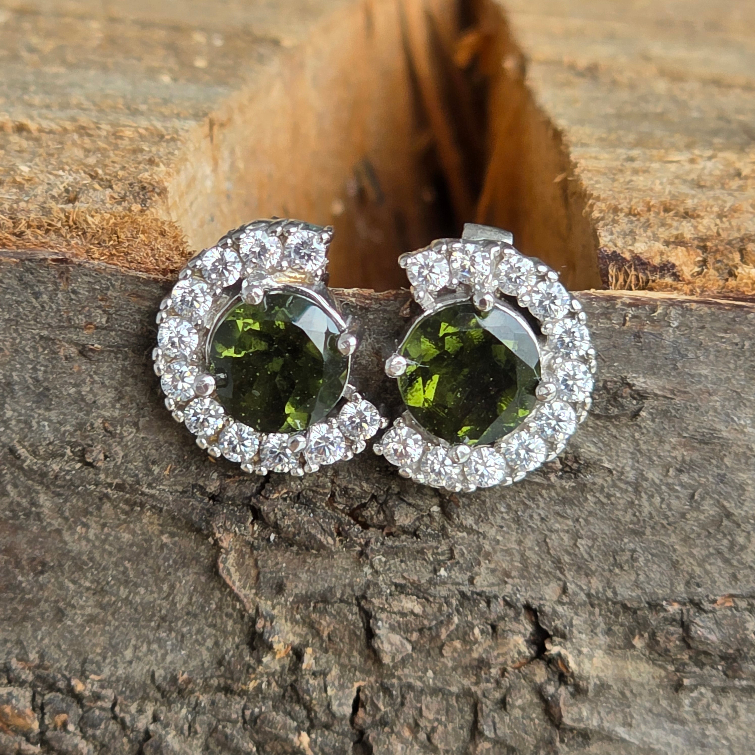 Тези изящни сребърни обеци с проба 925 подчертават рядката красота на естествения молдавит, централно монтирани и заобиколени от стилна корона от искрящи кубични цирконии здравей. Елегантният дизайн подчертава наситения зелен нюанс на молдавита, внасяйки допълнителна яркост и елегантност. Подходящи са както за ежедневно носене, така и за специални поводи, което ги прави отличен избор за любителите на редки камъни и вечни бижута.