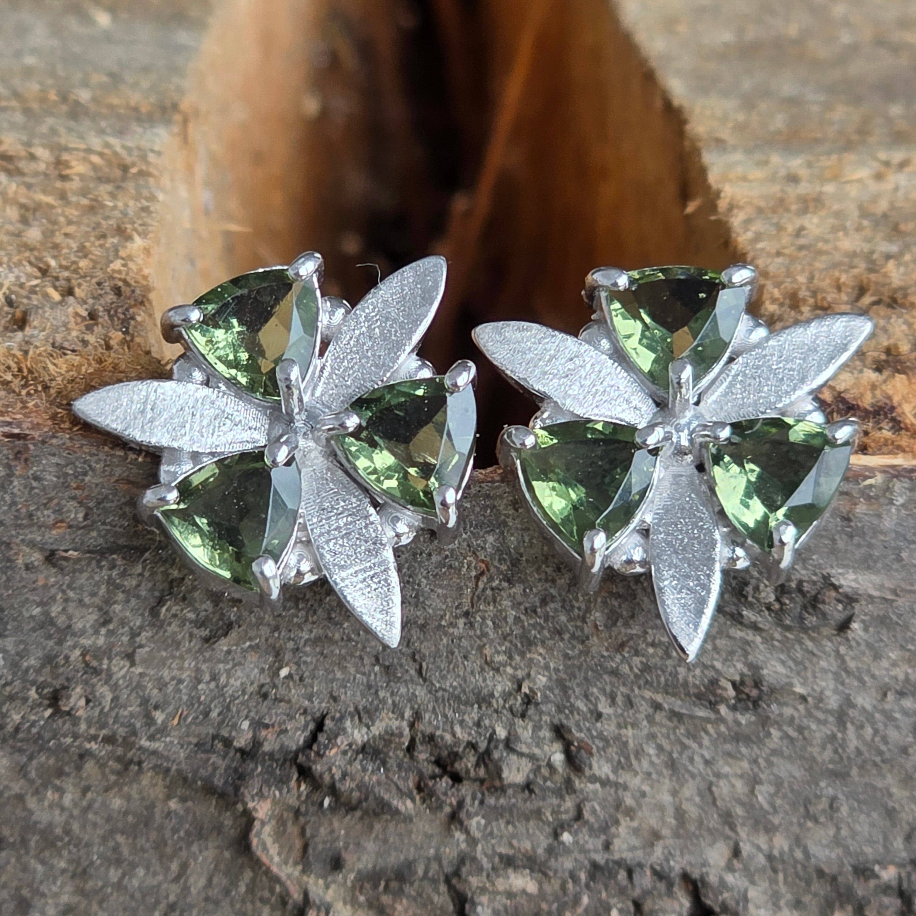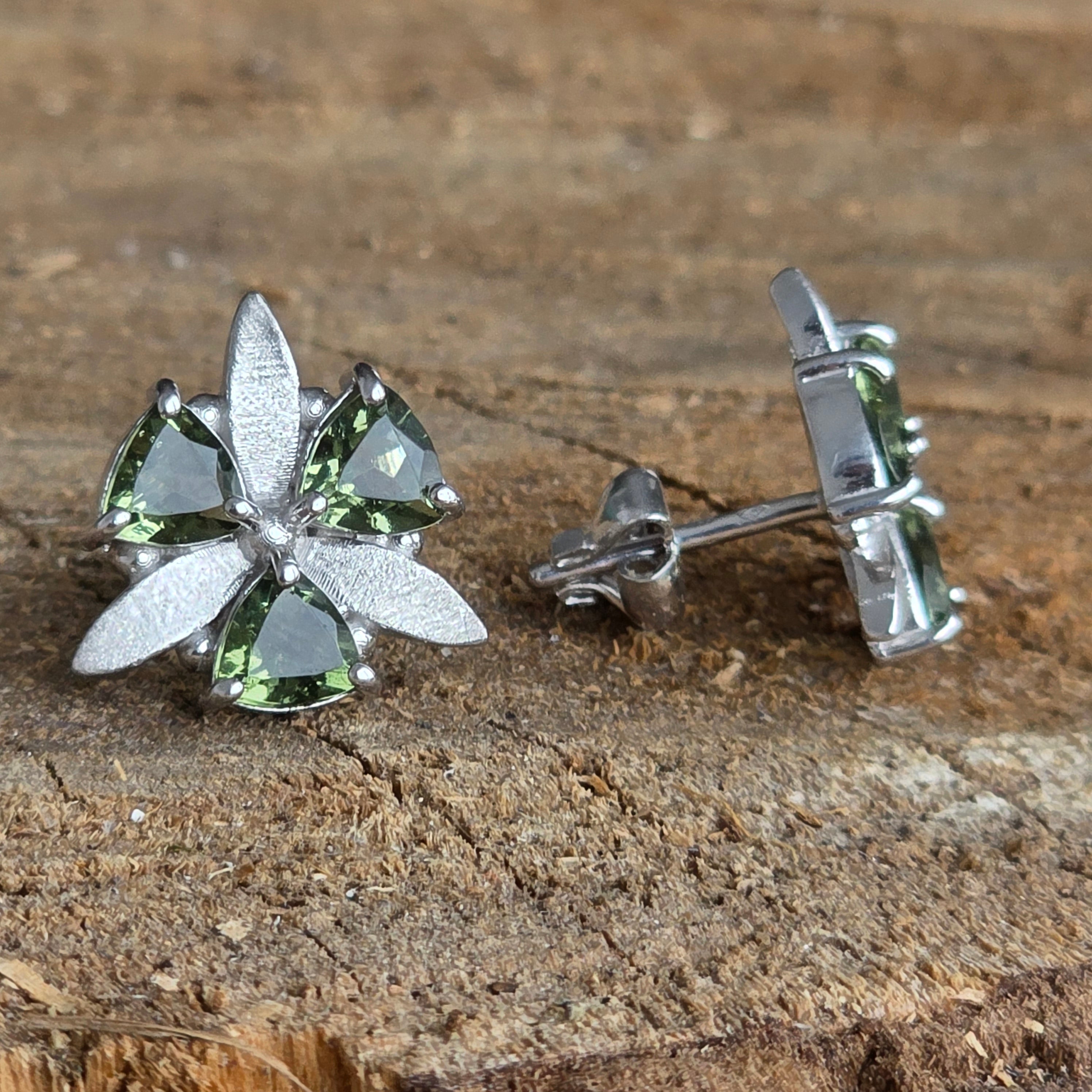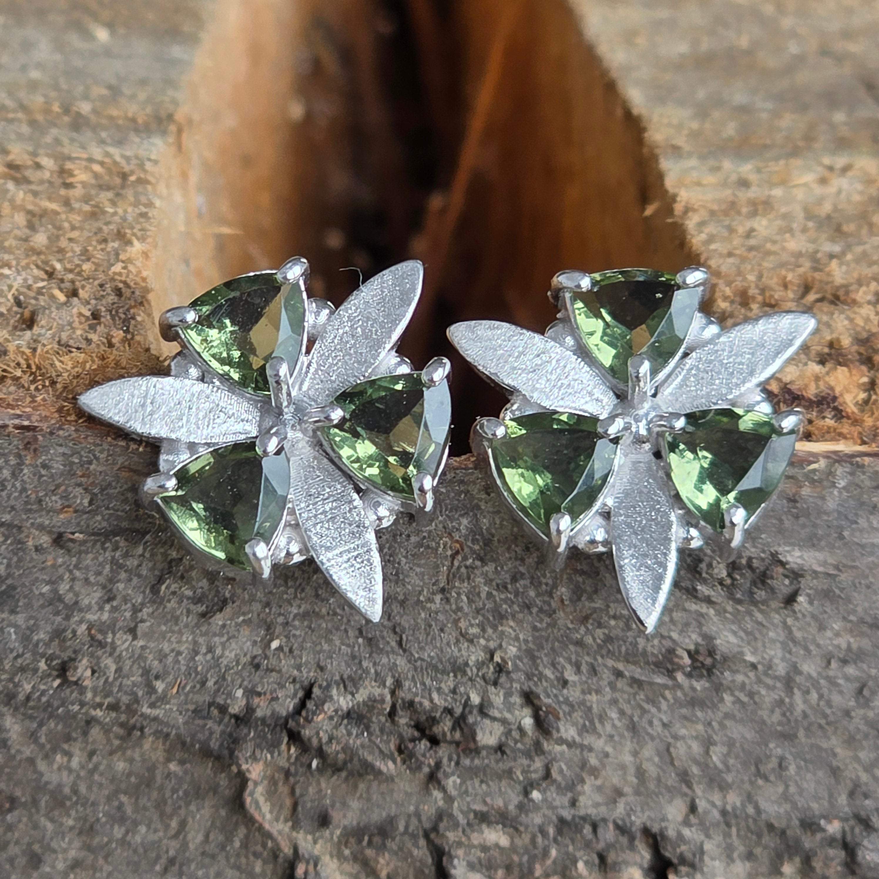 Тези елегантни обеци от сребро 925 представят естествената красота на молдавита в композиция с флорално вдъхновение. Всяка обеца е съставена от три фасетирани камъка молдавит, подредени хармонично като венчелистчетата на рядък цвете, комбиниращи деликатността на дизайна с уникалната вибрация на камъка.