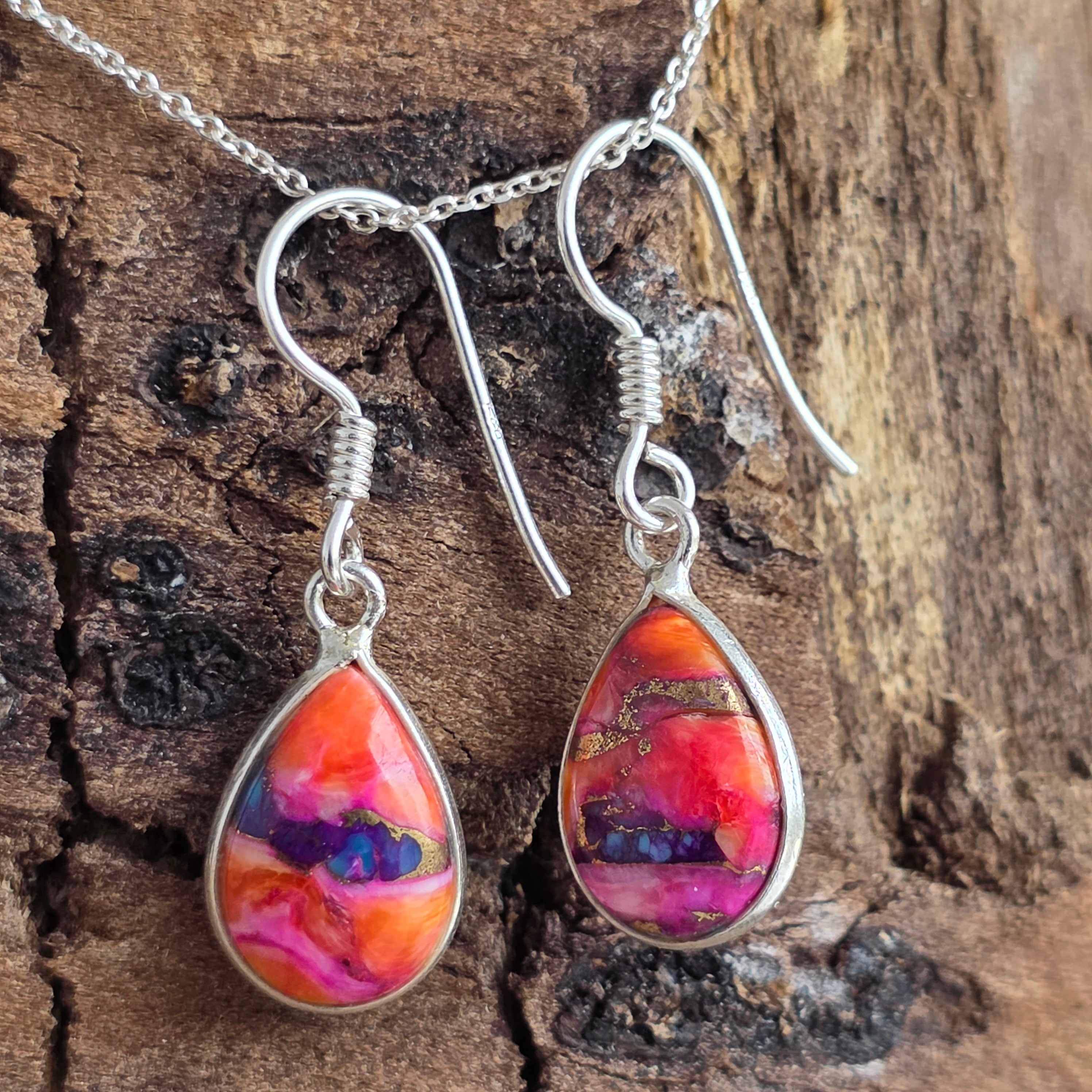 Тези обеци от 925 сребро носят експлозия от цвят и положителна енергия, благодарение на камъните на Pink Dahlia Copper Turquoise, ефектна комбинация от розово-магента, оранжеви и сини нюанси, пресечени от фини вени от естествена мед.