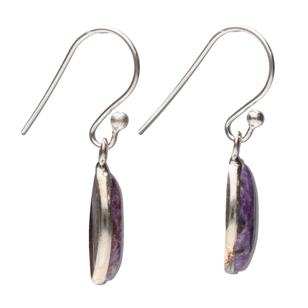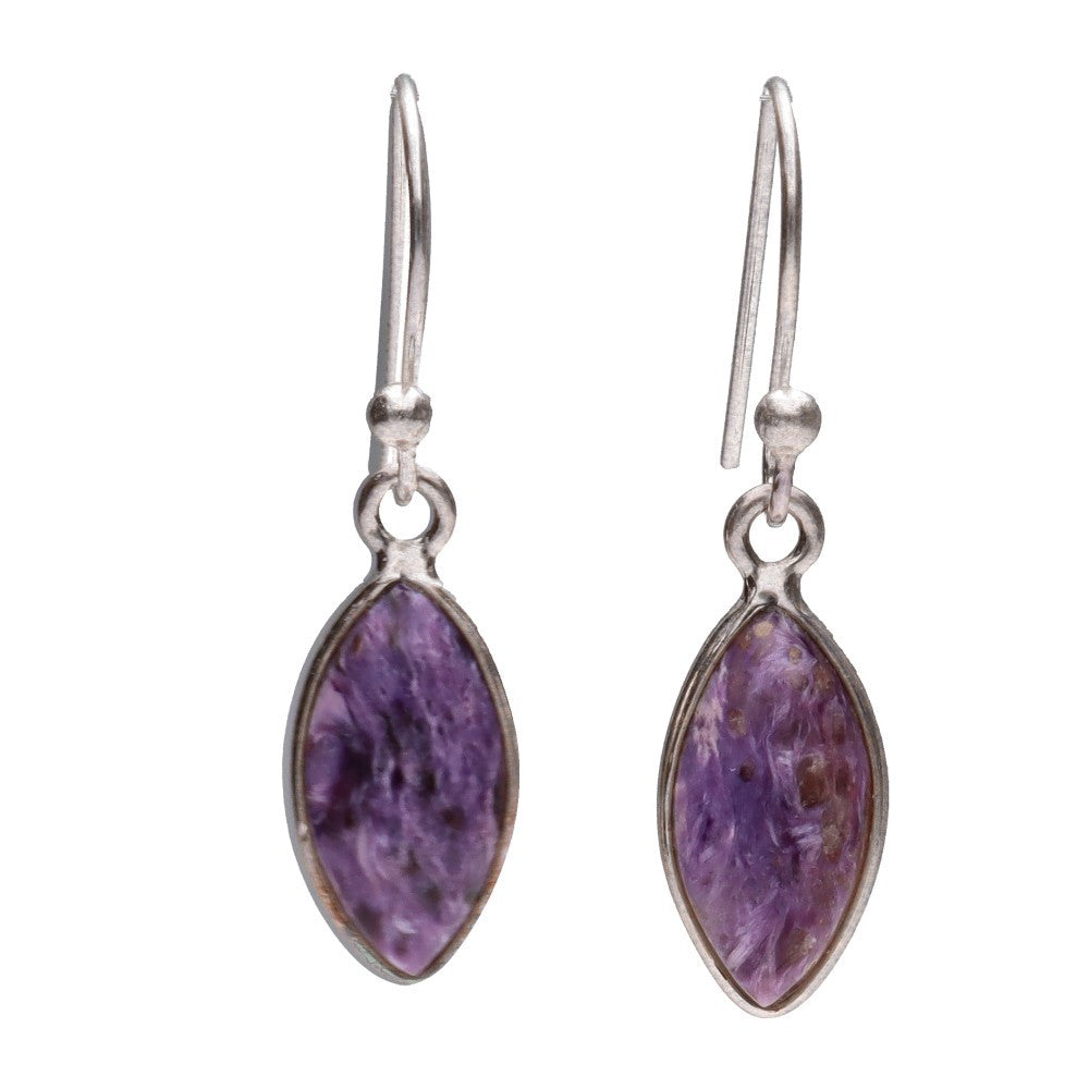 Тези изискани обеци във форма на око са изработени от сребро 925 и декорирани с естествен чароит— рядък камък от Русия, известен със своите уникални лилави оттенъци и копринени иризации, които създават усещане за дълбочина.