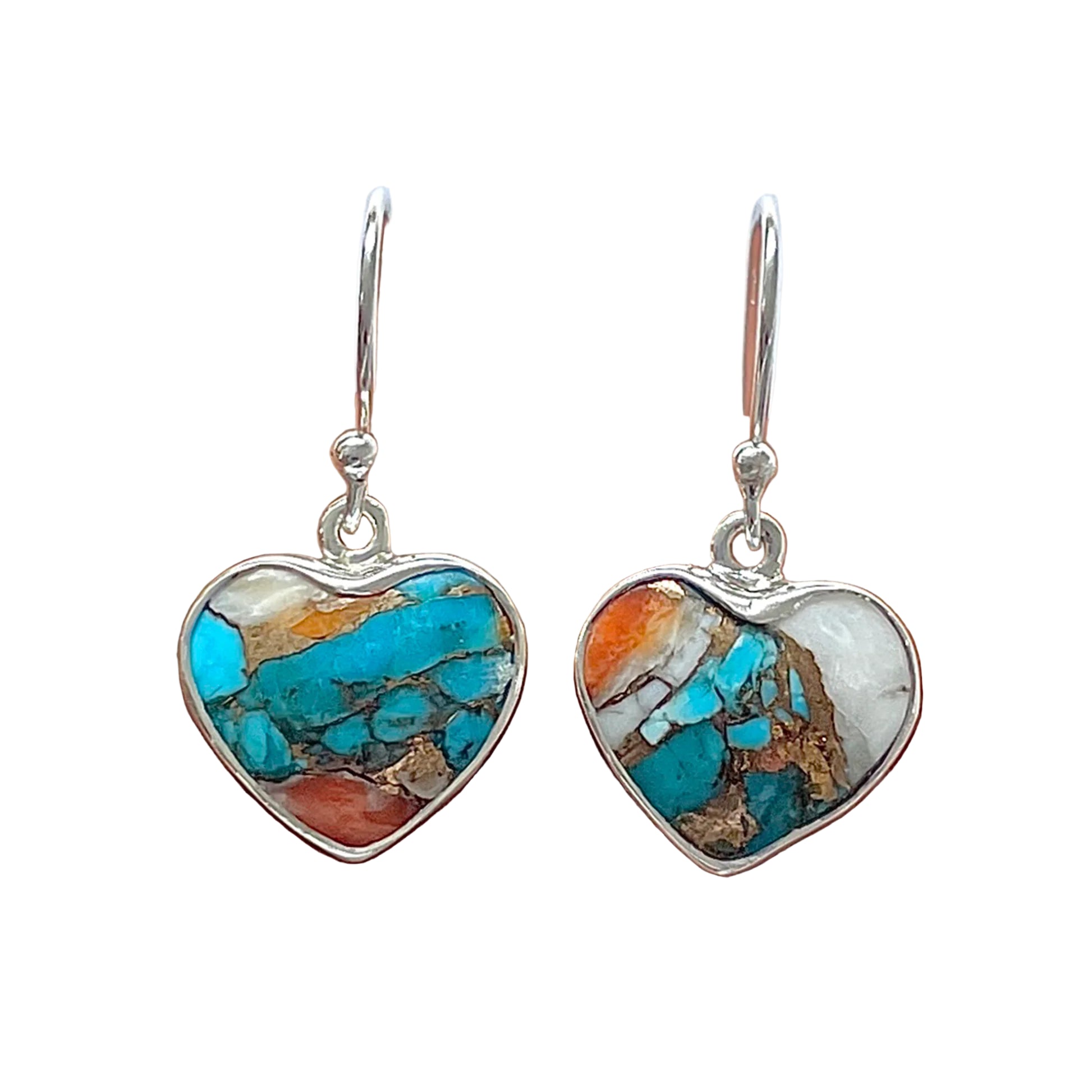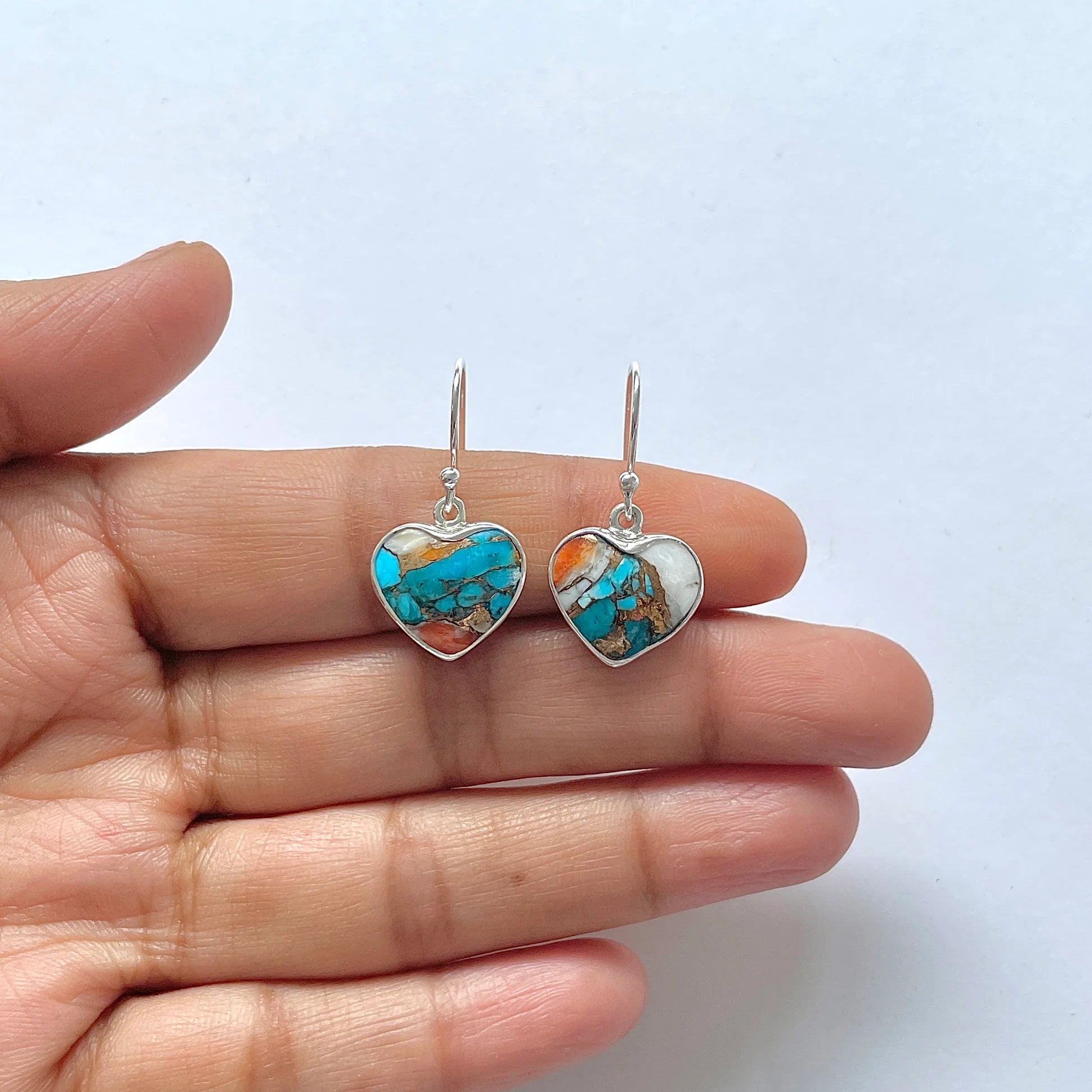 Тези сребърни обеци с форма на сърце и Spiny Oyster Turquoise възпроизвеждат красотата на океана и огнените залези. Естественият камък съчетава интензивен туркоаз, бели перлени фрагменти и ярки оранжеви акценти, създавайки минерален пейзаж, пълен с контраст и хармония. Всяка двойка е уникална, скулптирана от природата и ръчно завършена, за да подчертае автентичността.