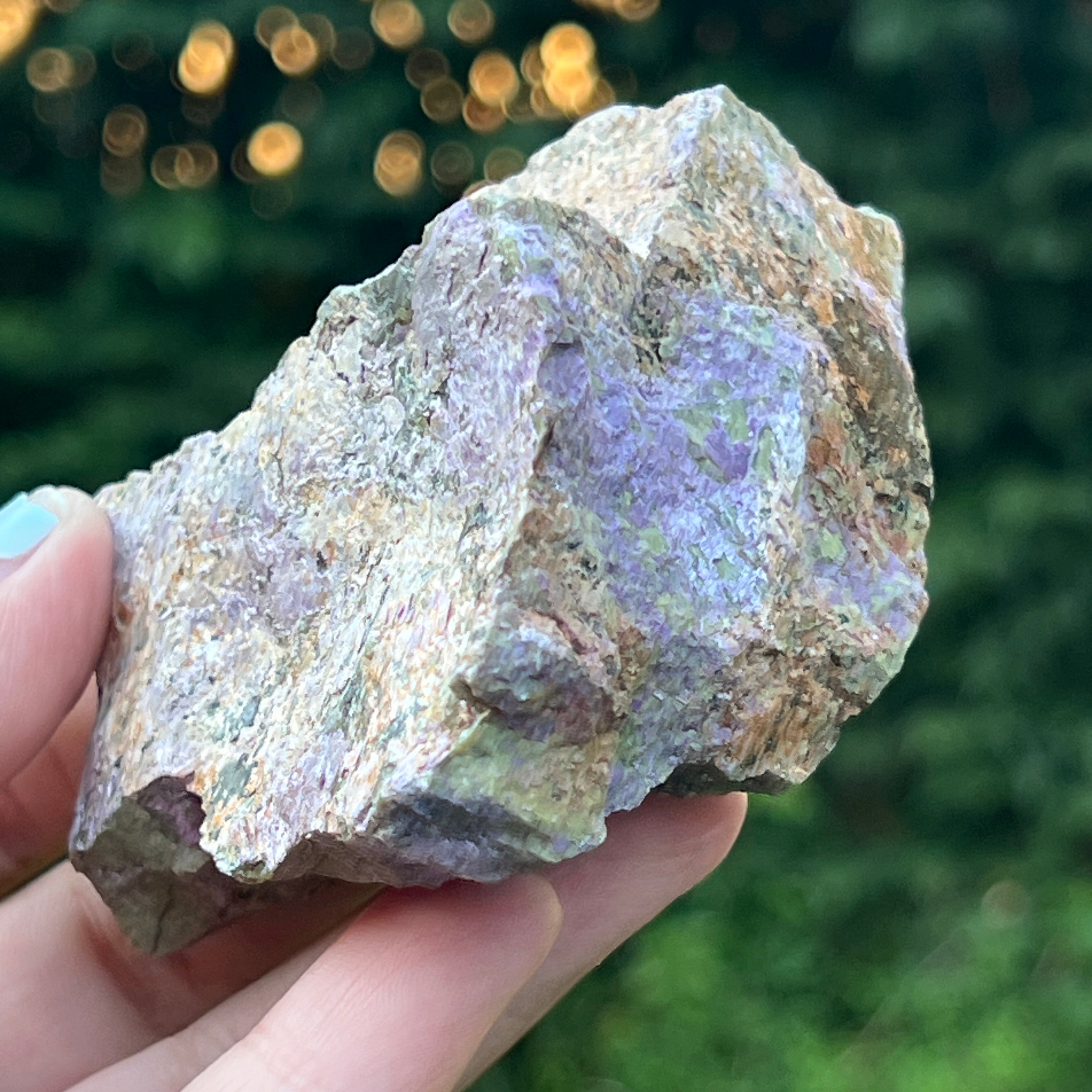 Стичтитът обикновено се разпознава по пастелните нюанси на лилаво, розово и пурпурно. Често се среща под формата на тънки жилки или покрития в серпентинитовите скали, създавайки приятен визуален контраст.
