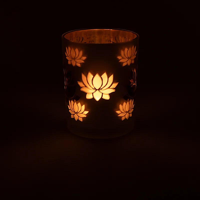 Тази стъклена стойка за свещи съвършено предава грацията на този свещен цвете. Когато пламъкът се запали, полупрозрачните венчелистчета се осветяват отвътре, проектирайки меки сенки и топли отблясъци. Резултатът е атмосфера на мир и изтънченост, идеална за медитация, релакс или тихи вечери у дома.