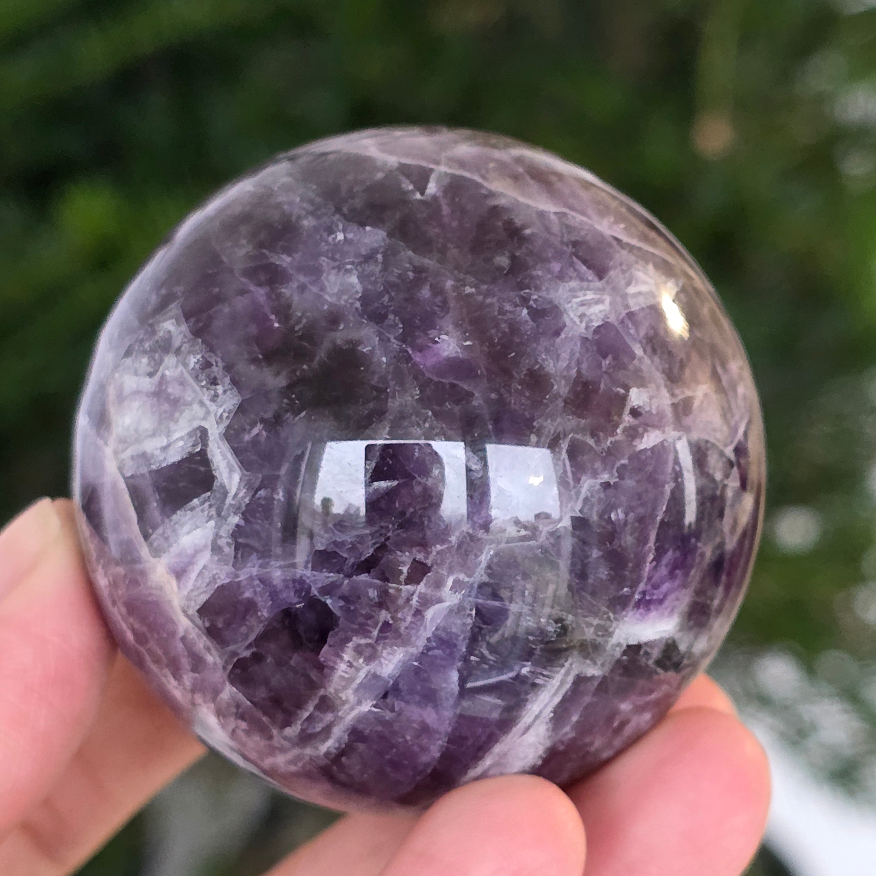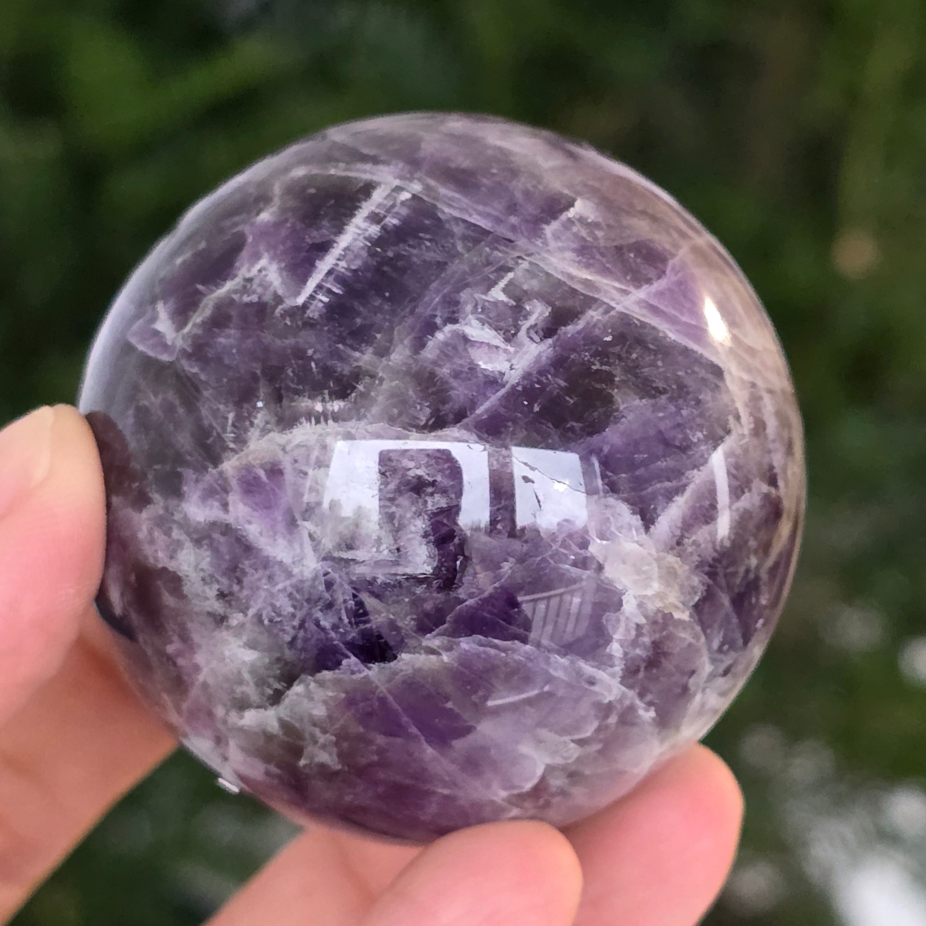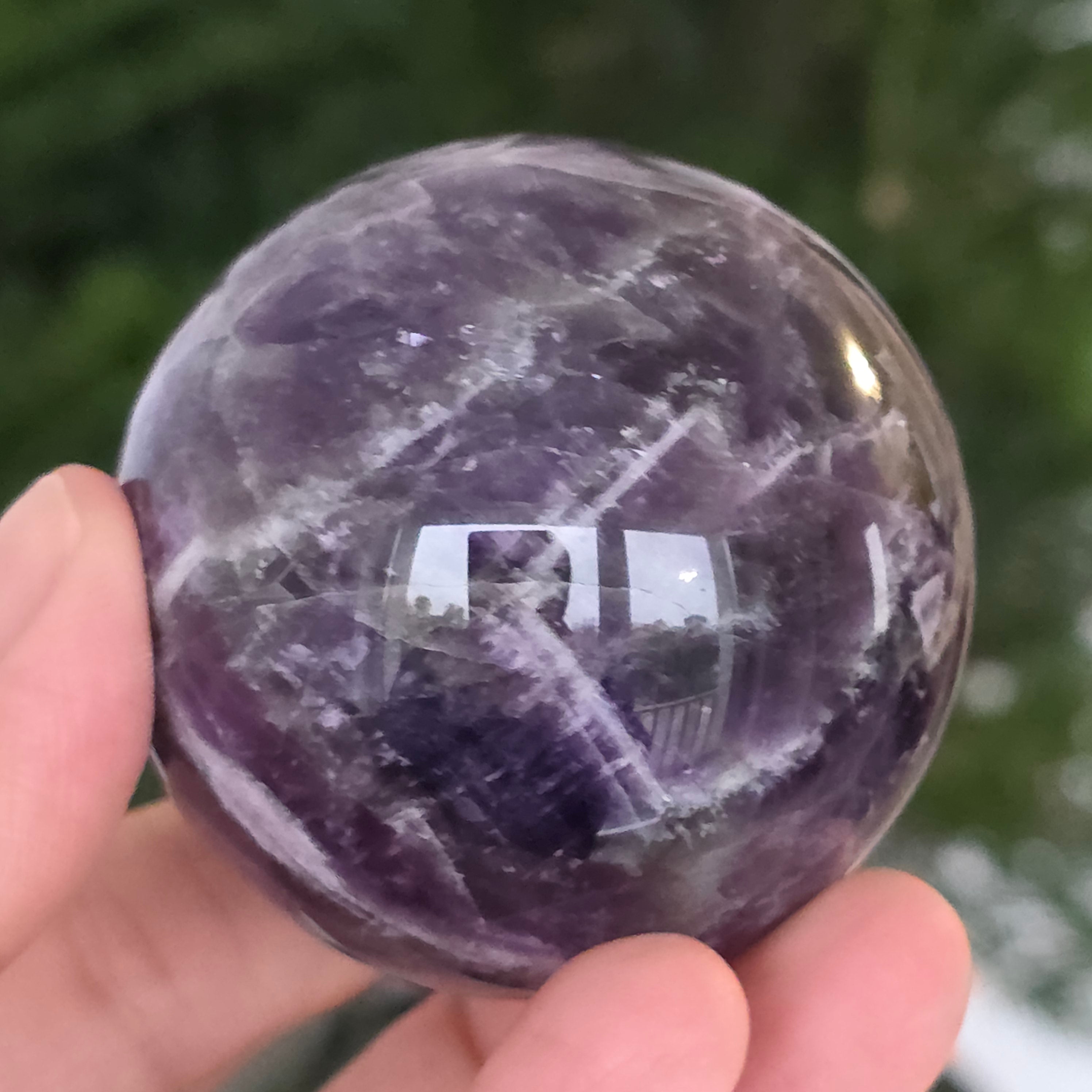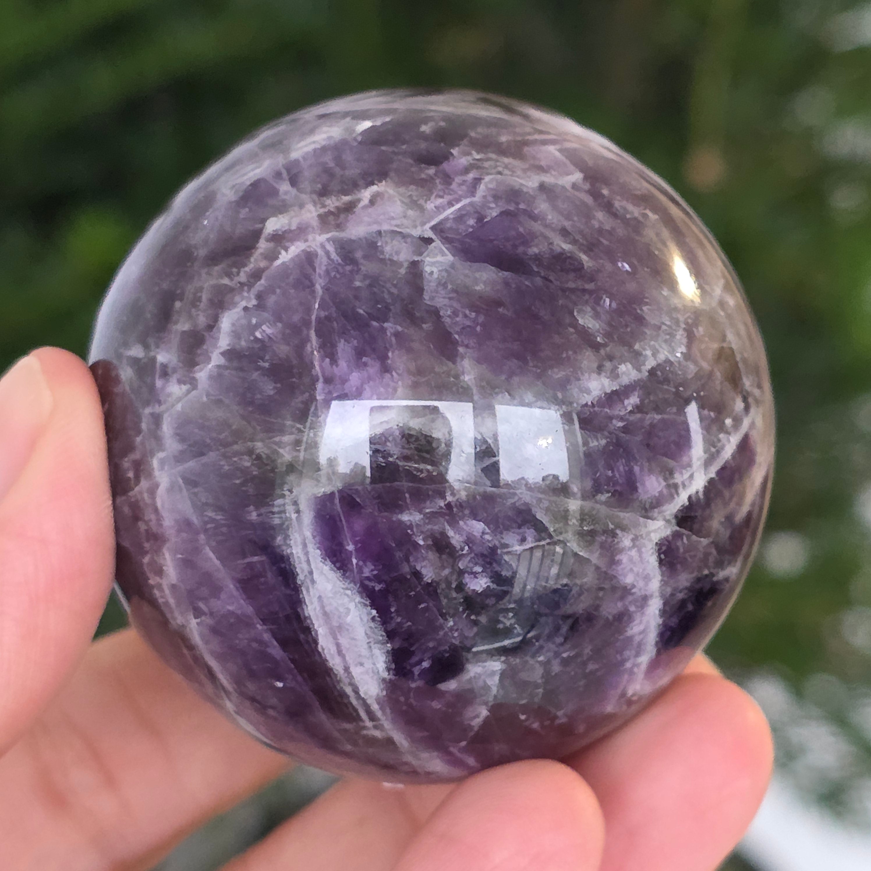 Сфера, която сякаш концентрира вътре светлината на лилава нощ. Тази уникална творба от натурален аметист шевронразкрива удивителни слоеве от виолетово, бяло и лавандула, подредени във форми на V – отличителен знак на този рядък вид аметист. Перфектно полираната повърхност, кадифено гладка на допир, отразява светлината с хипнотична деликатност, внасяйки спокойствие и изисканост във всяко пространство.