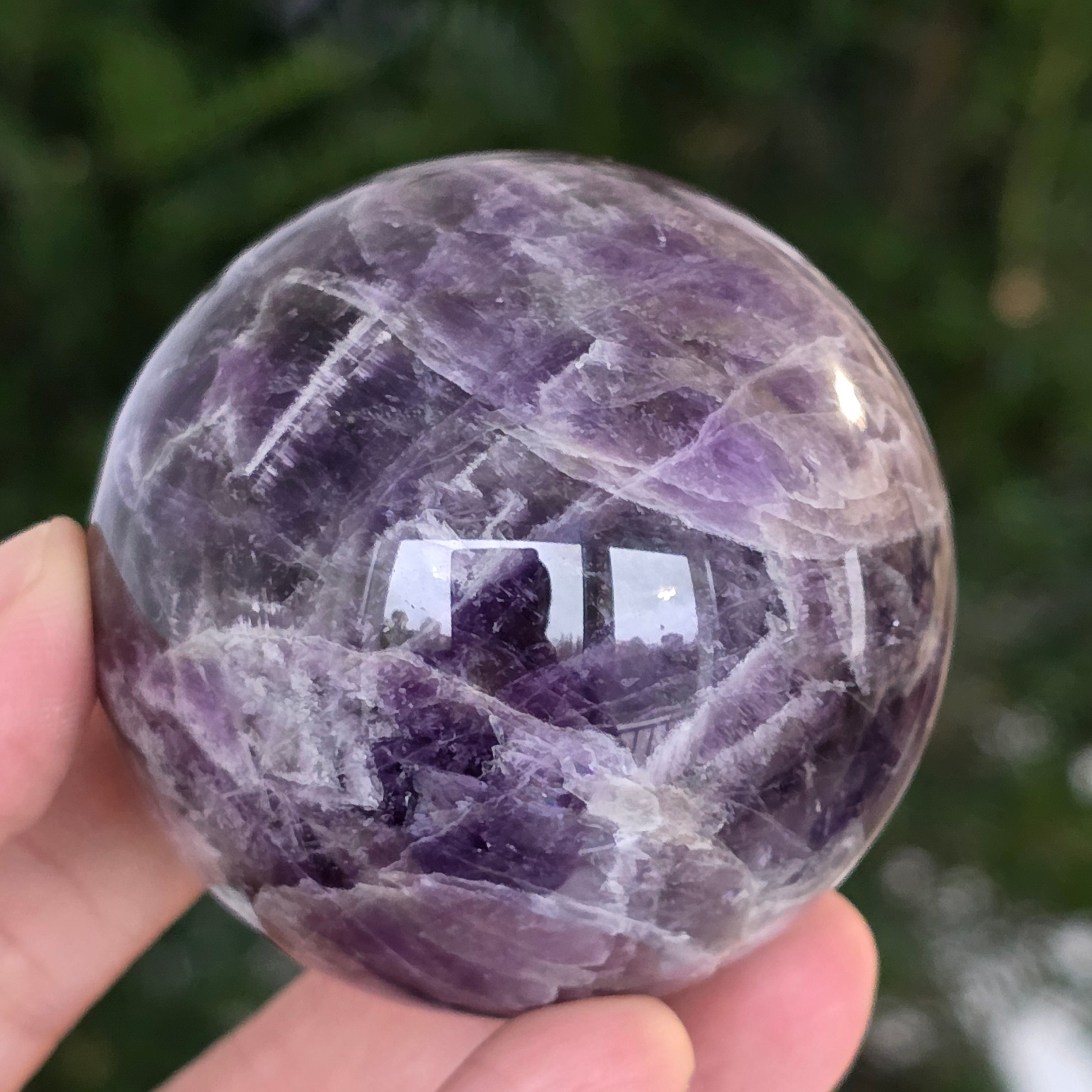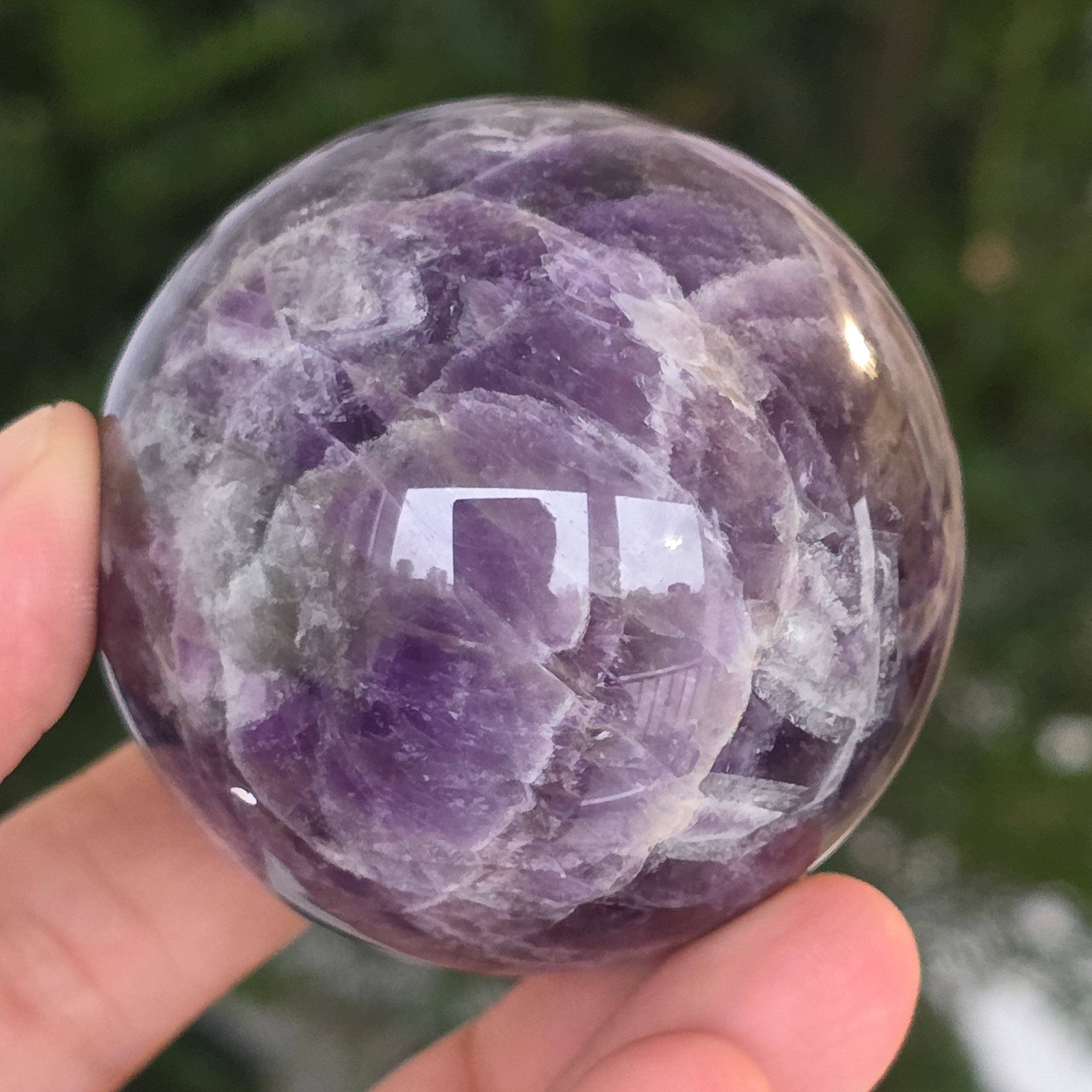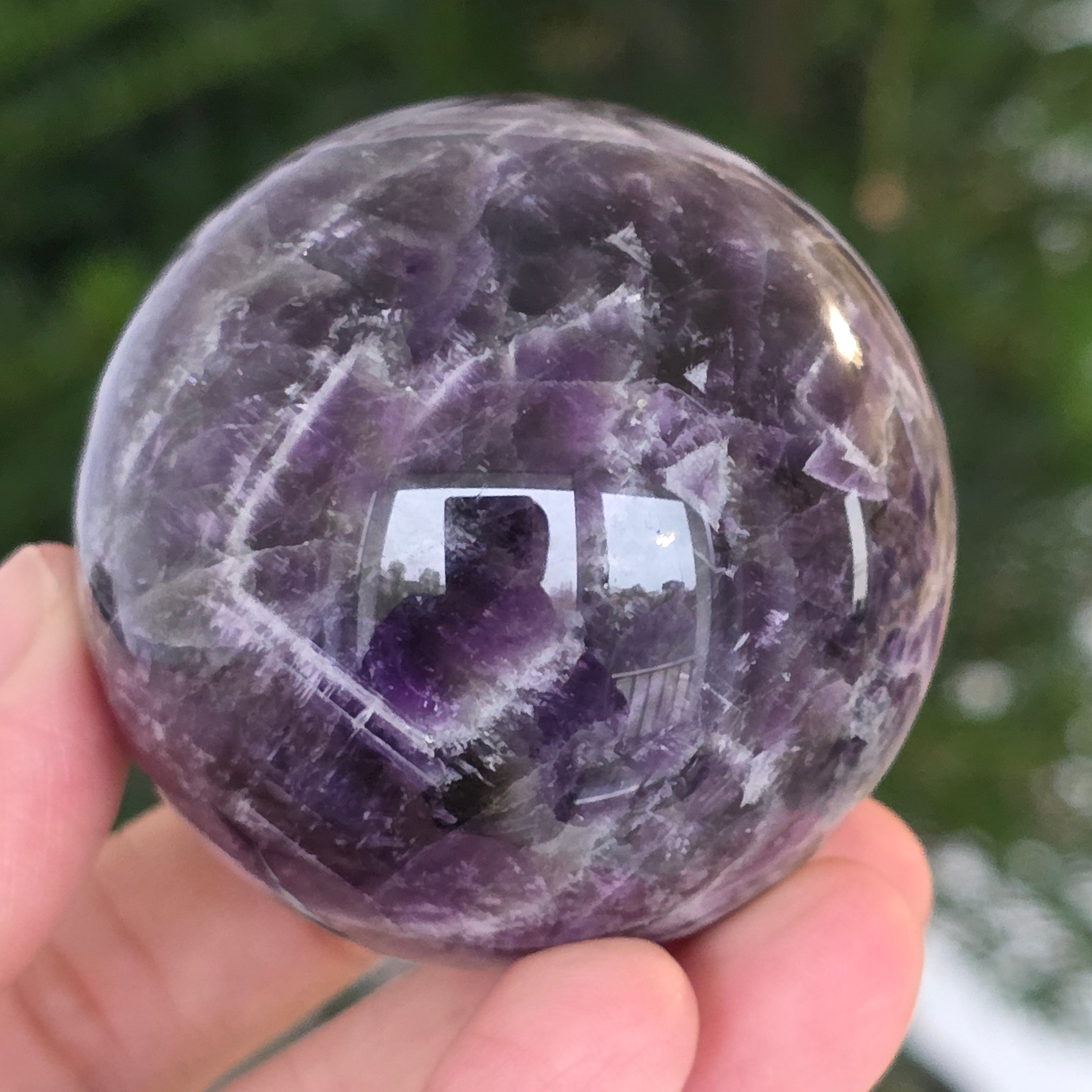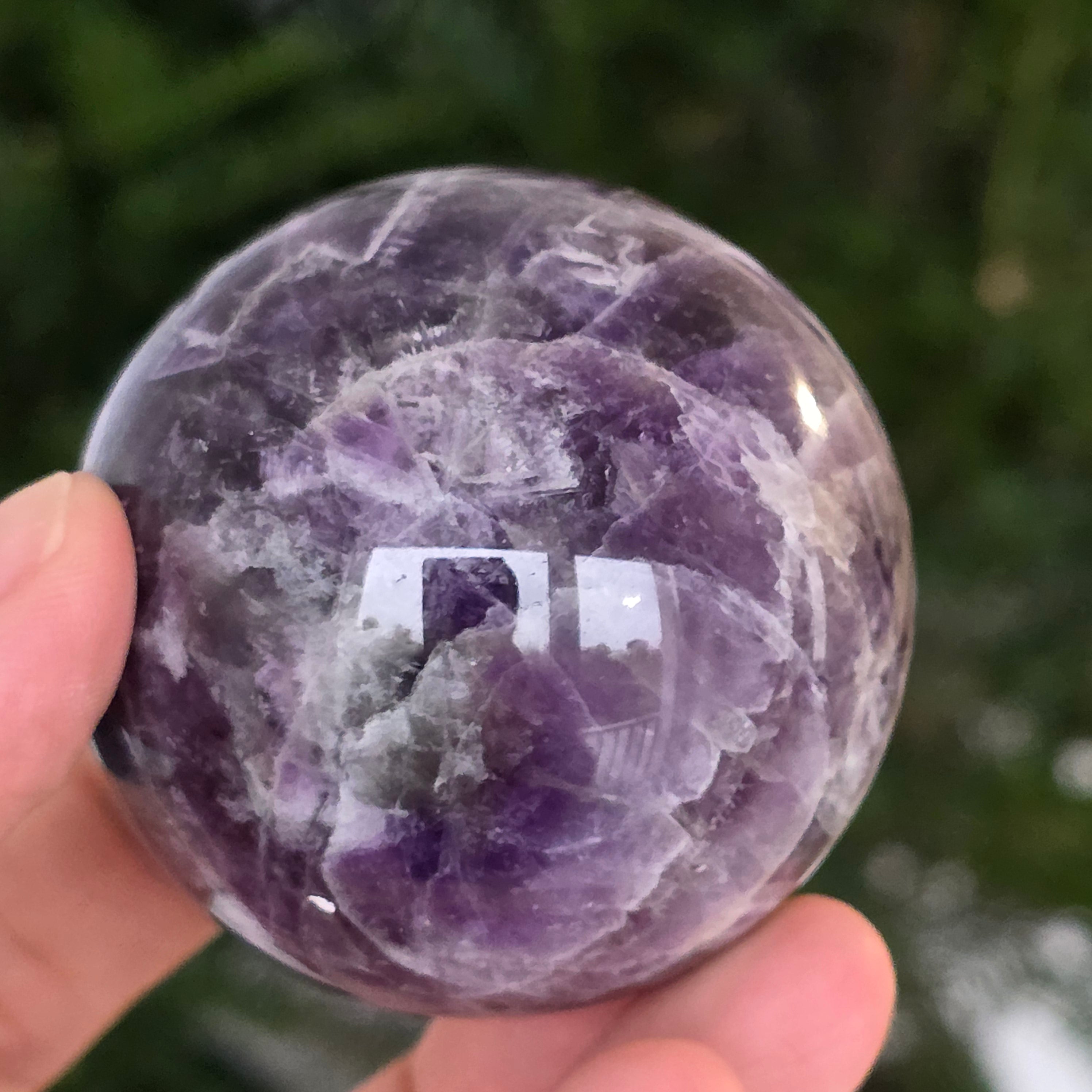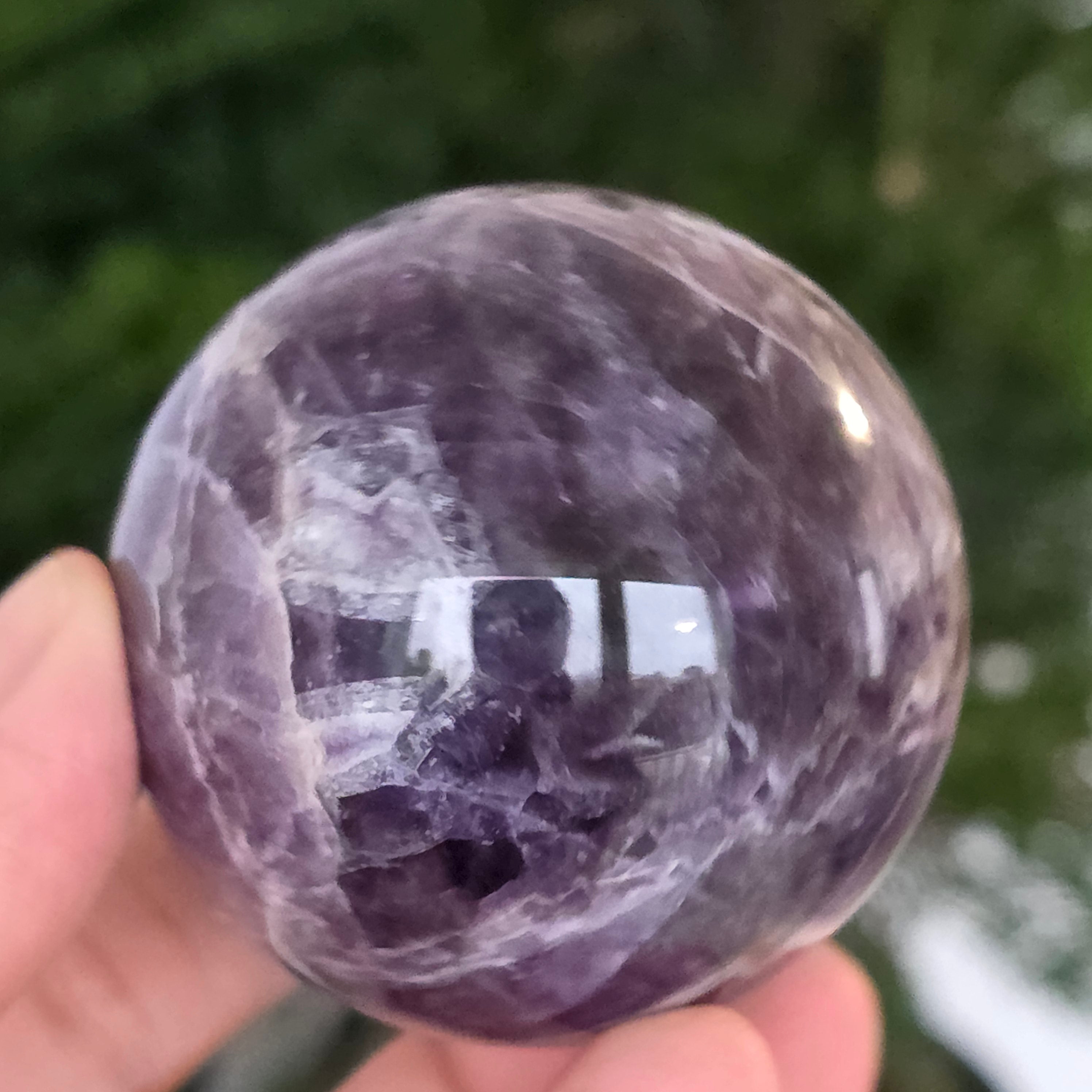 Сфера, която сякаш концентрира вътре светлината на лилава нощ. Тази уникална творба от натурален аметист шевронразкрива удивителни слоеве от виолетово, бяло и лавандула, подредени във форми на V – отличителен знак на този рядък вид аметист. Перфектно полираната повърхност, кадифено гладка на допир, отразява светлината с хипнотична деликатност, внасяйки спокойствие и изисканост във всяко пространство.