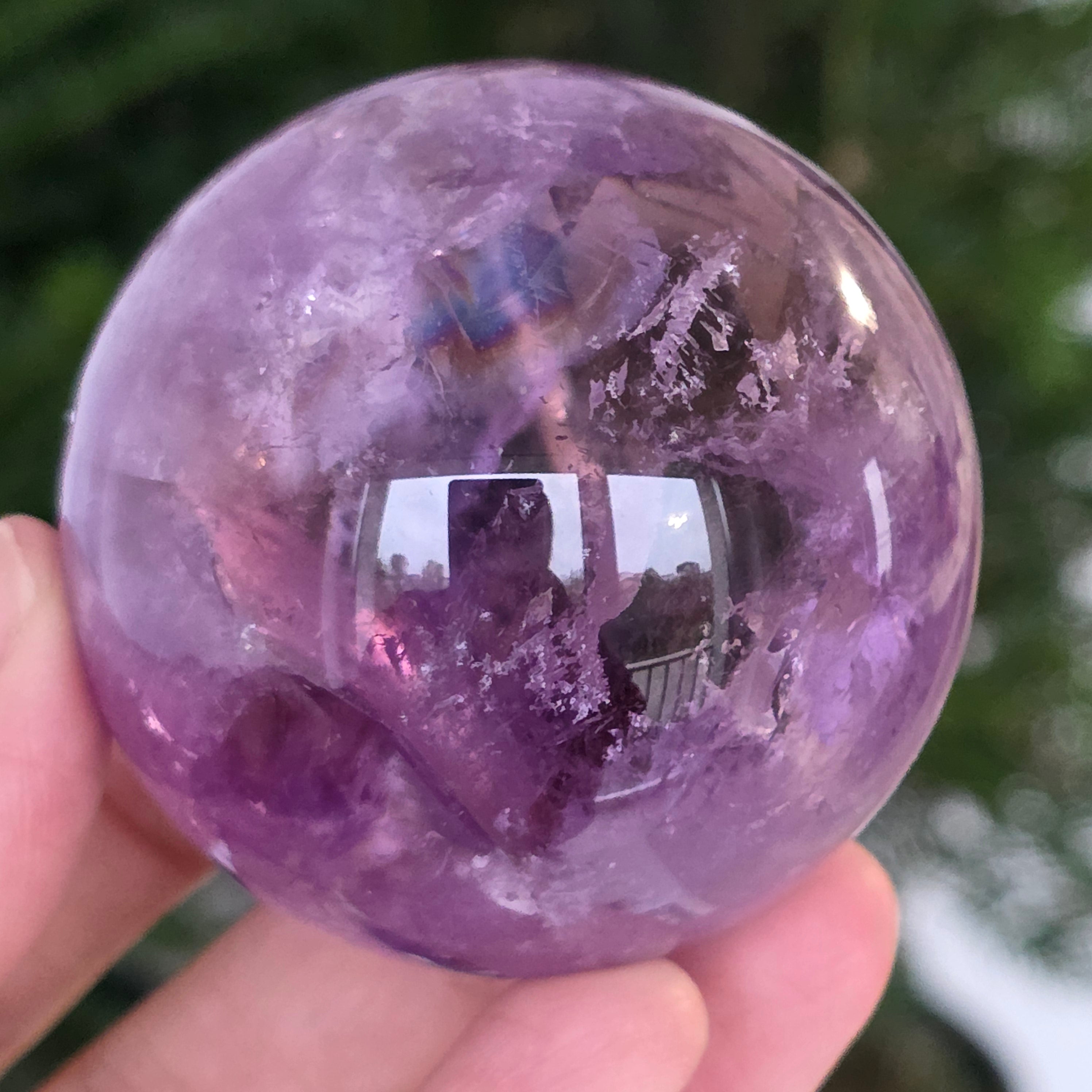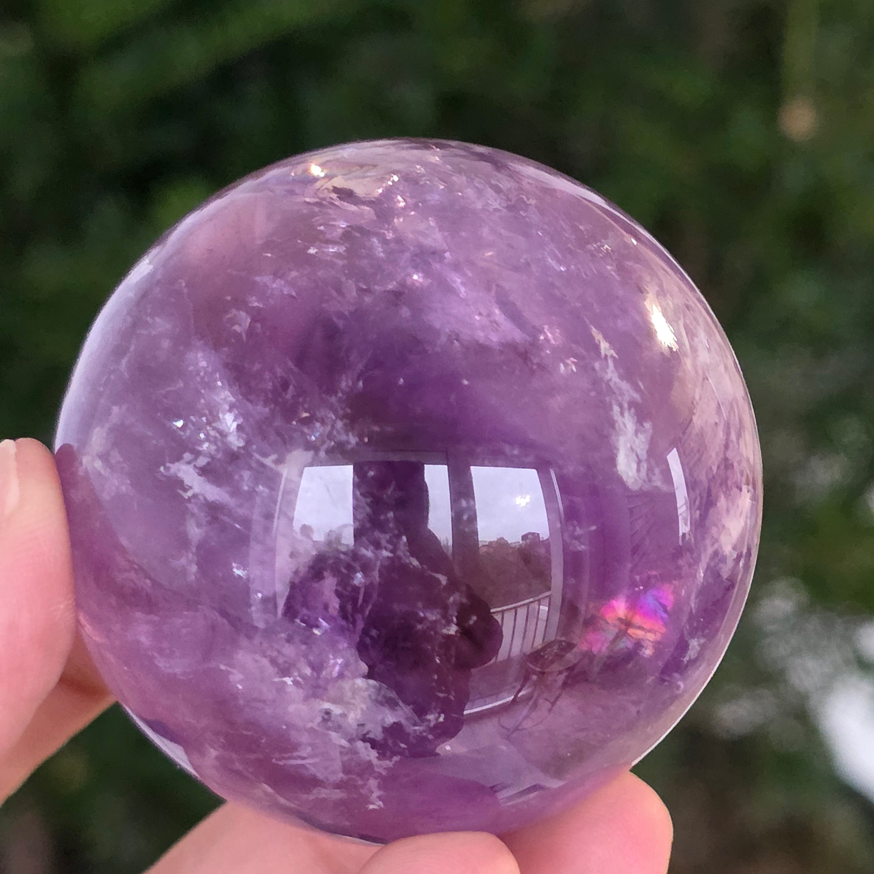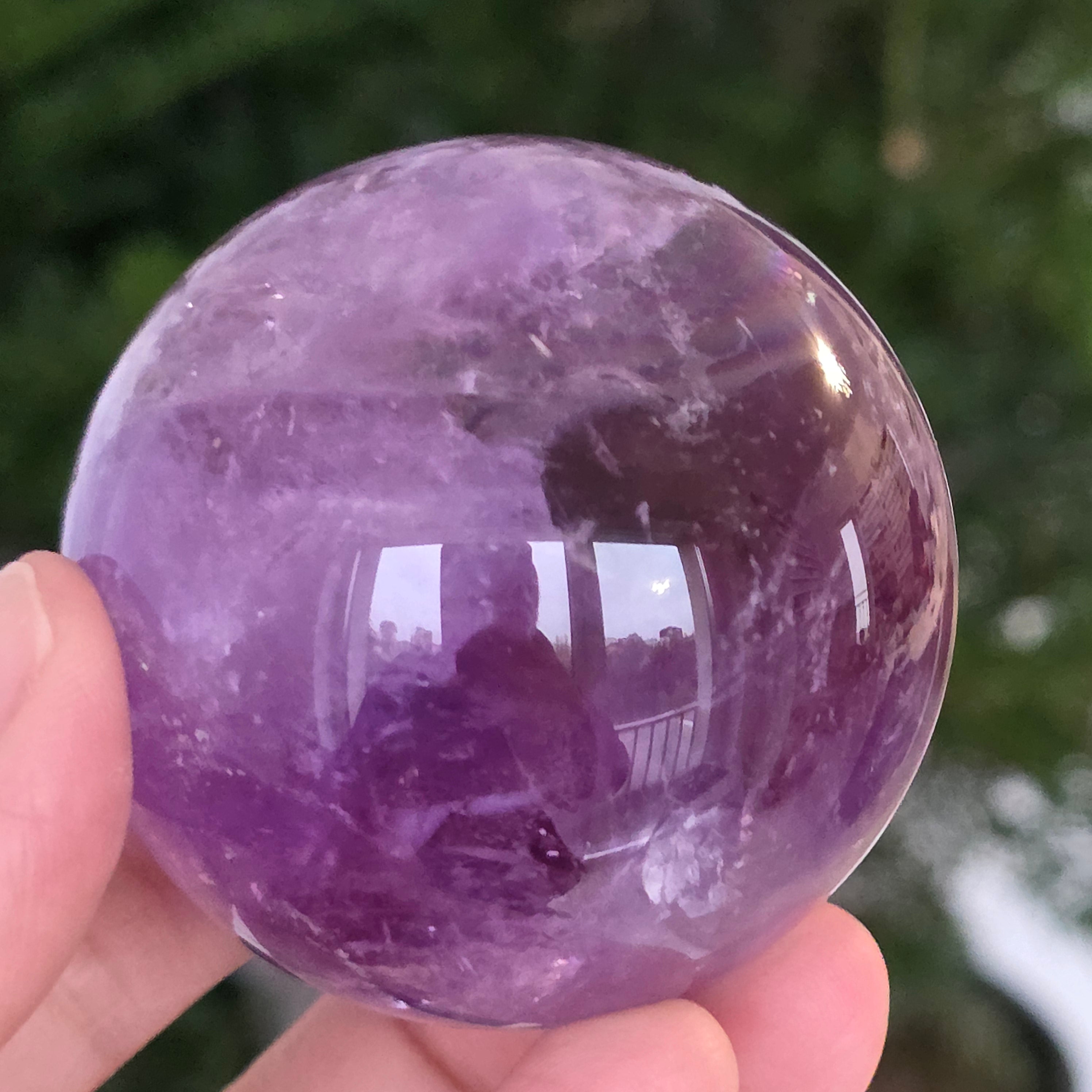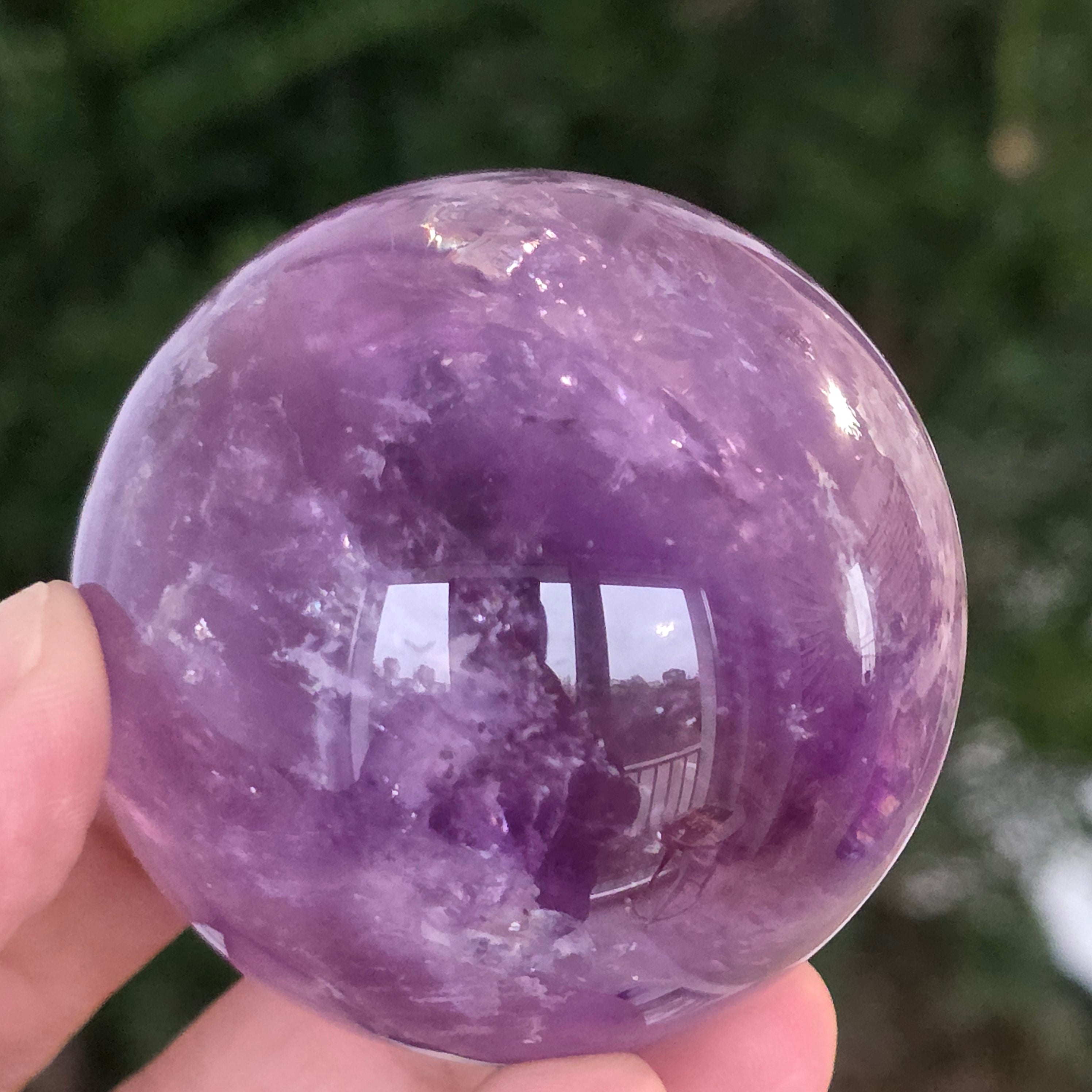 Сфера, която изглежда така, сякаш е уловила същността на небето при залез. Този уникатен екземпляр от естествен аметист AA от Бразилияизлъчва дълбок и прозрачен блясък с нюанси на кралско виолетово, люляково и сянка на лавандула, които се играят с светлината. Перфектно полираната повърхност изважда на преден план чистотата на кристала и фината текстура на естествения камък – минерално бижу с класическа и балансирана красота.