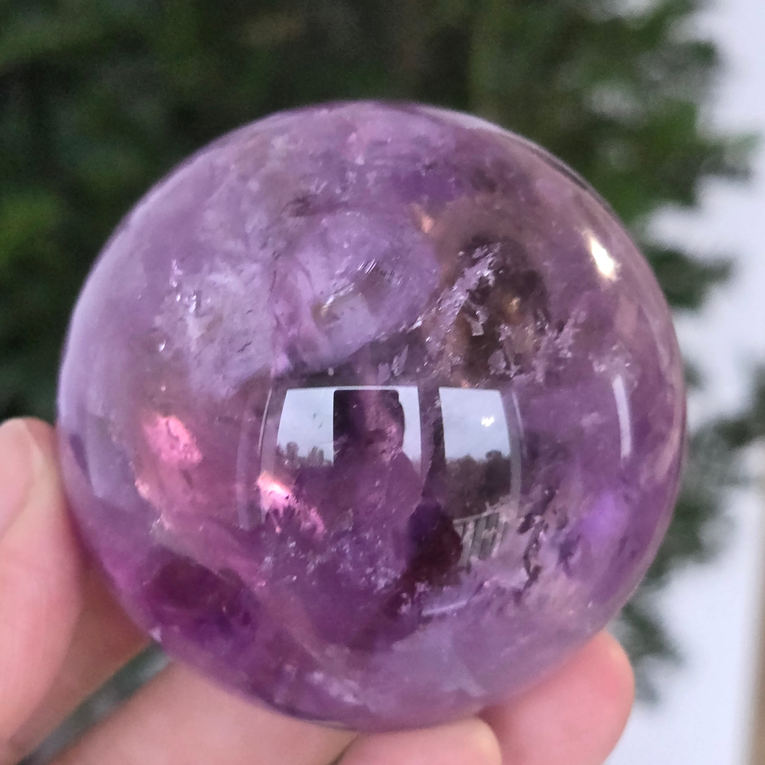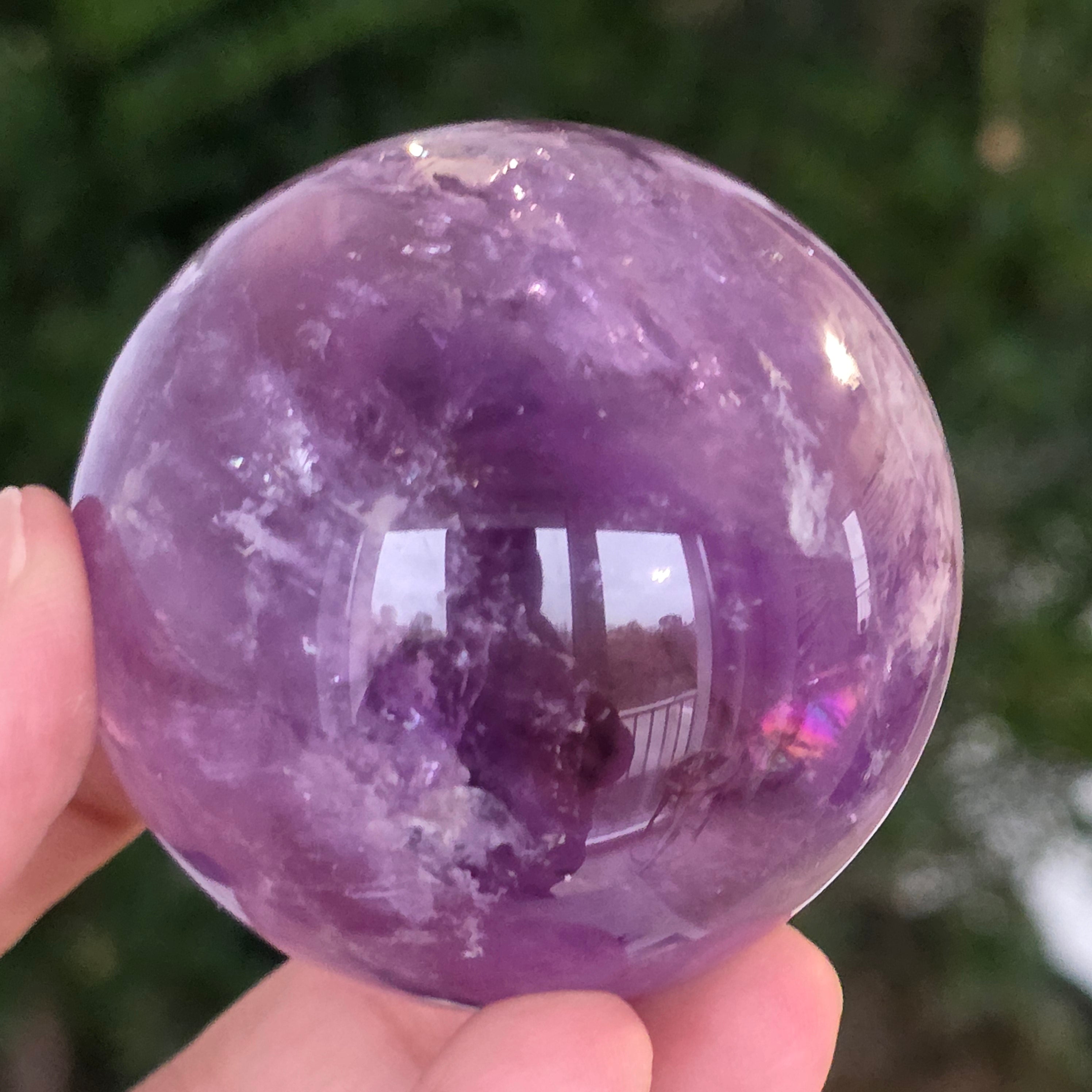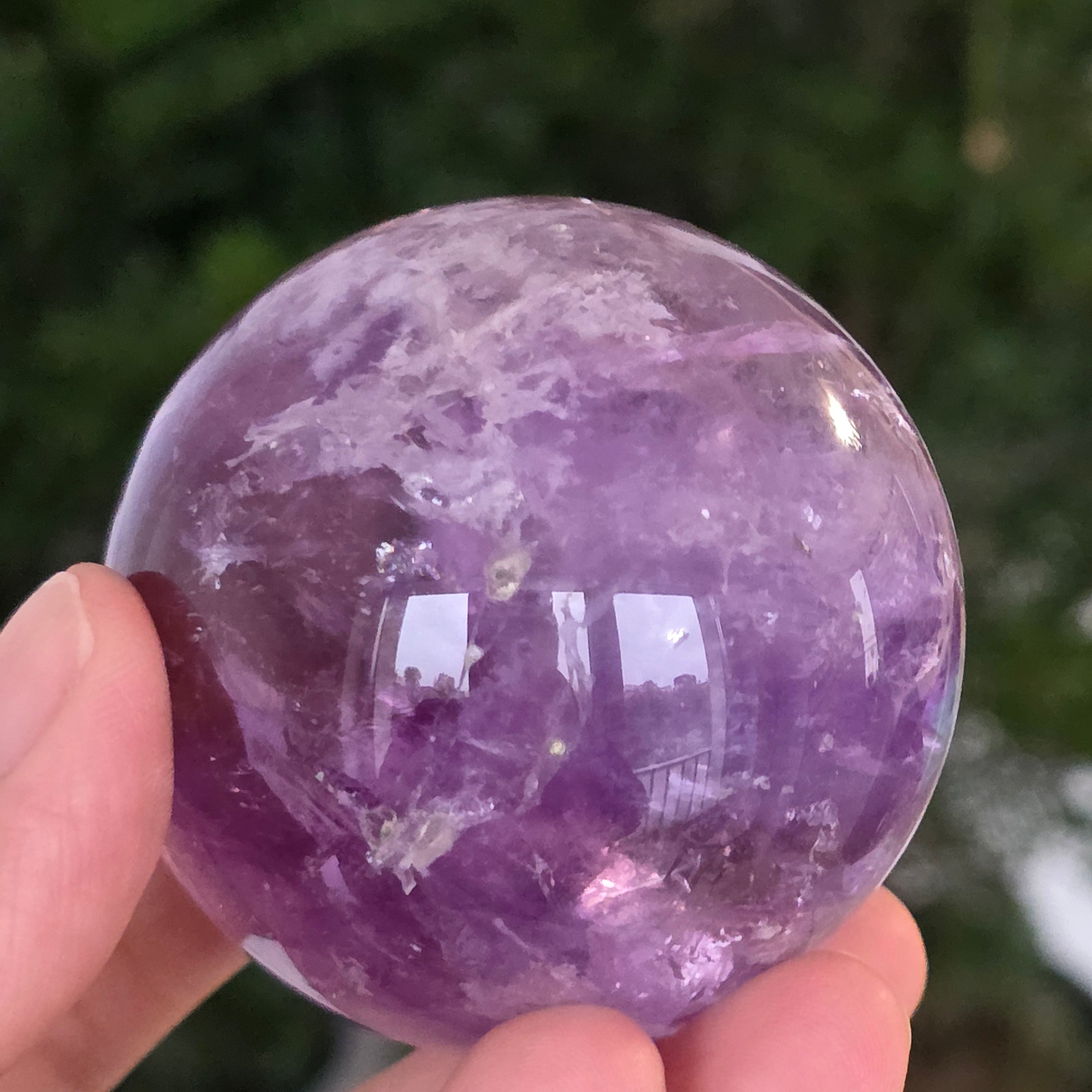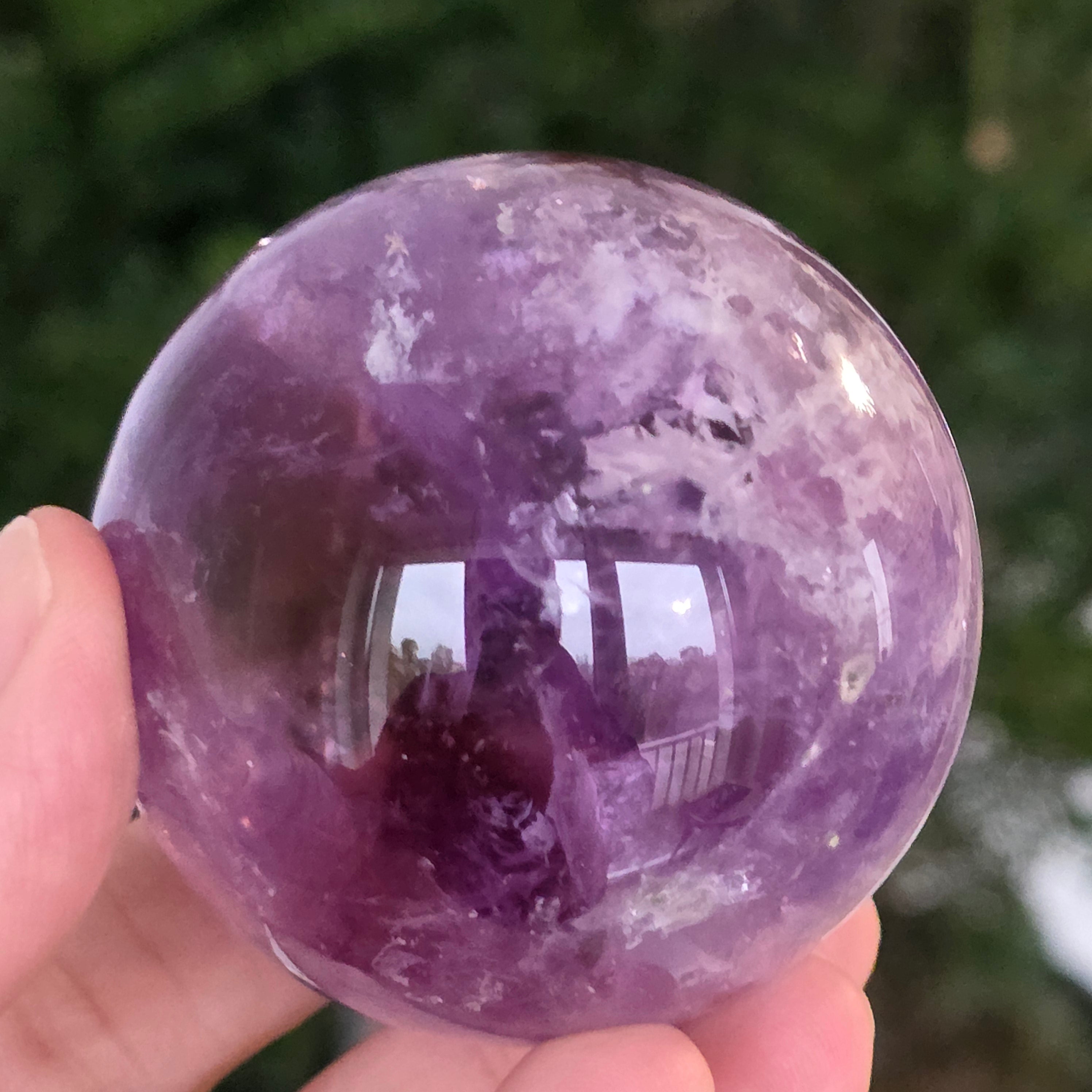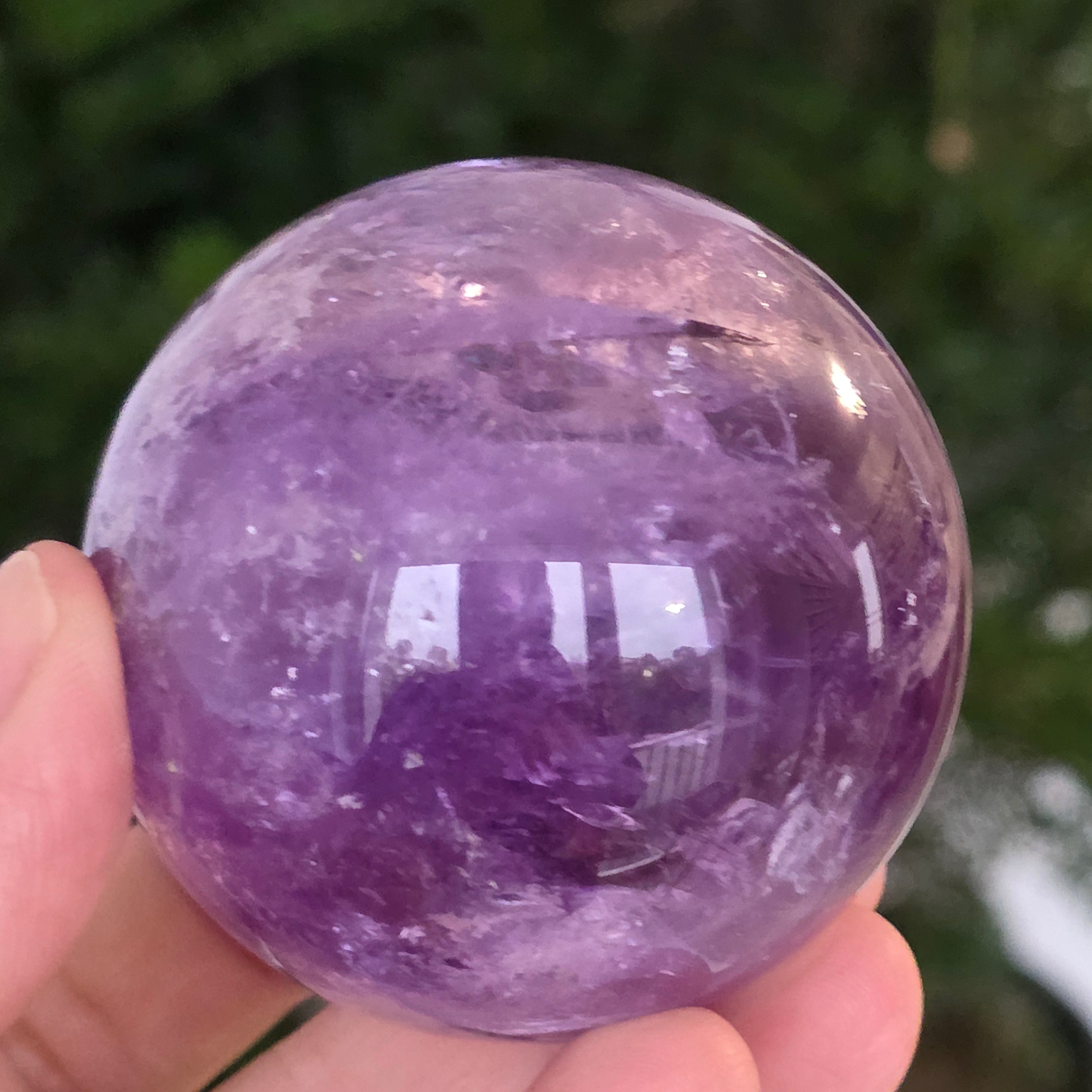 Сфера, която изглежда така, сякаш е уловила същността на небето при залез. Този уникатен екземпляр от естествен аметист AA от Бразилияизлъчва дълбок и прозрачен блясък с нюанси на кралско виолетово, люляково и сянка на лавандула, които се играят с светлината. Перфектно полираната повърхност изважда на преден план чистотата на кристала и фината текстура на естествения камък – минерално бижу с класическа и балансирана красота.