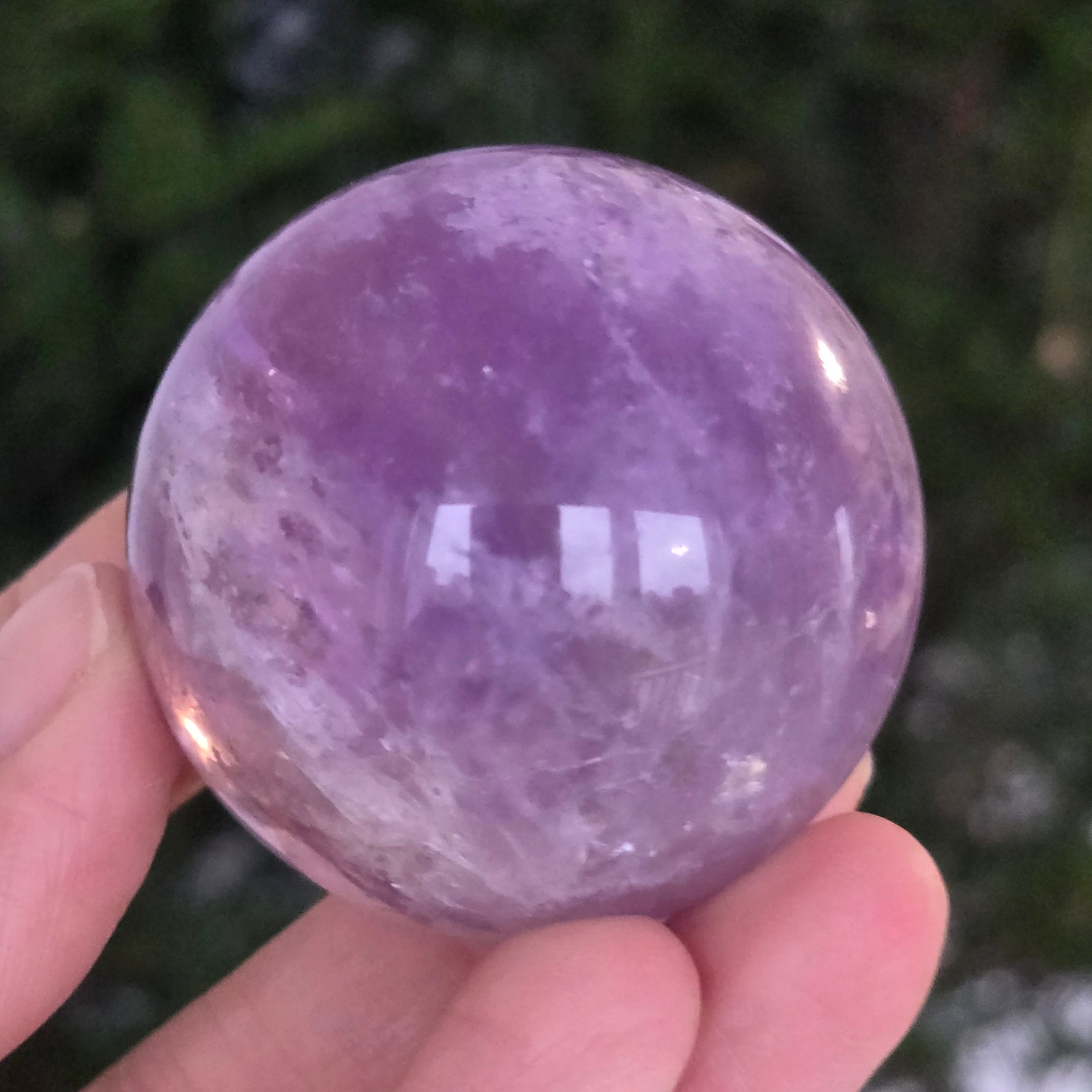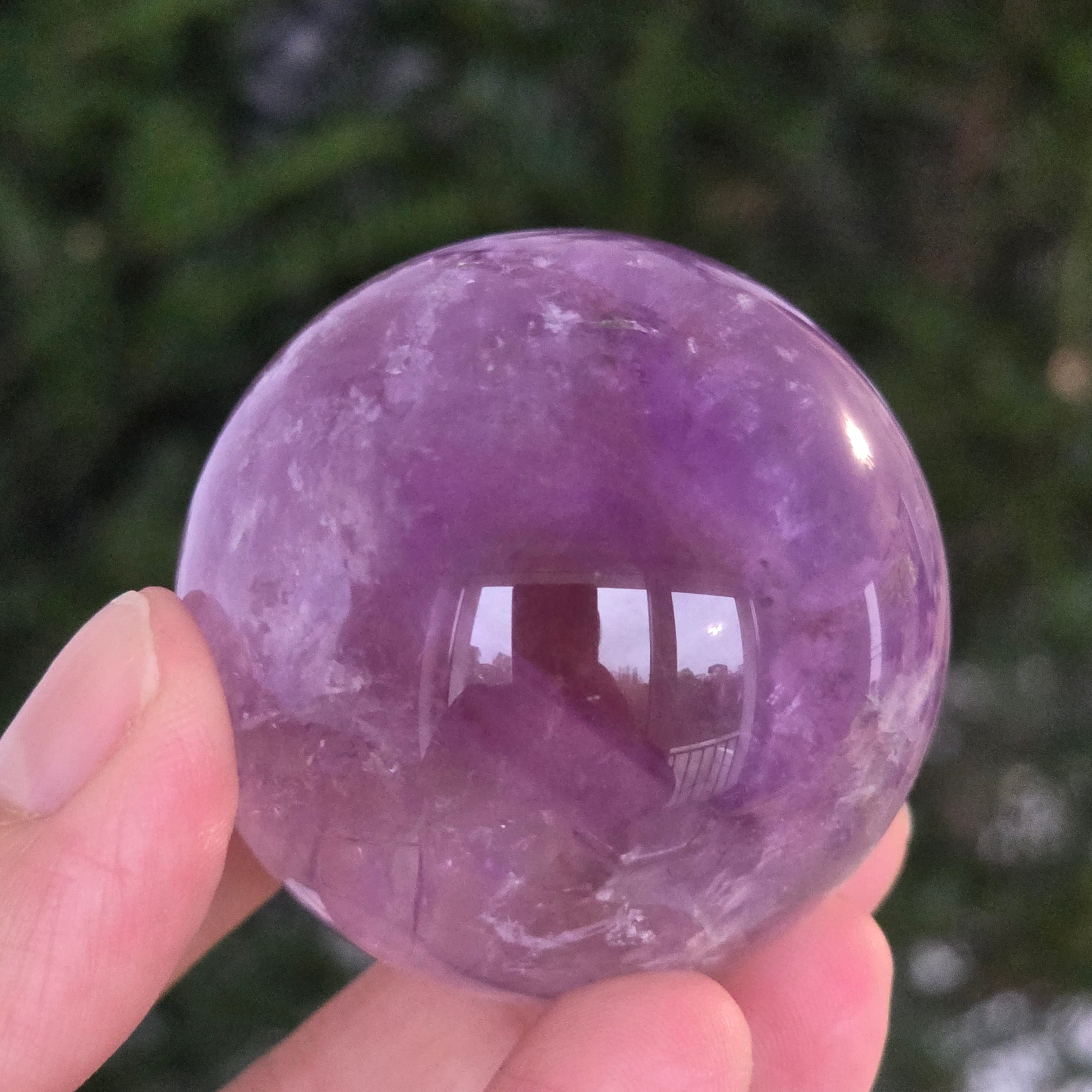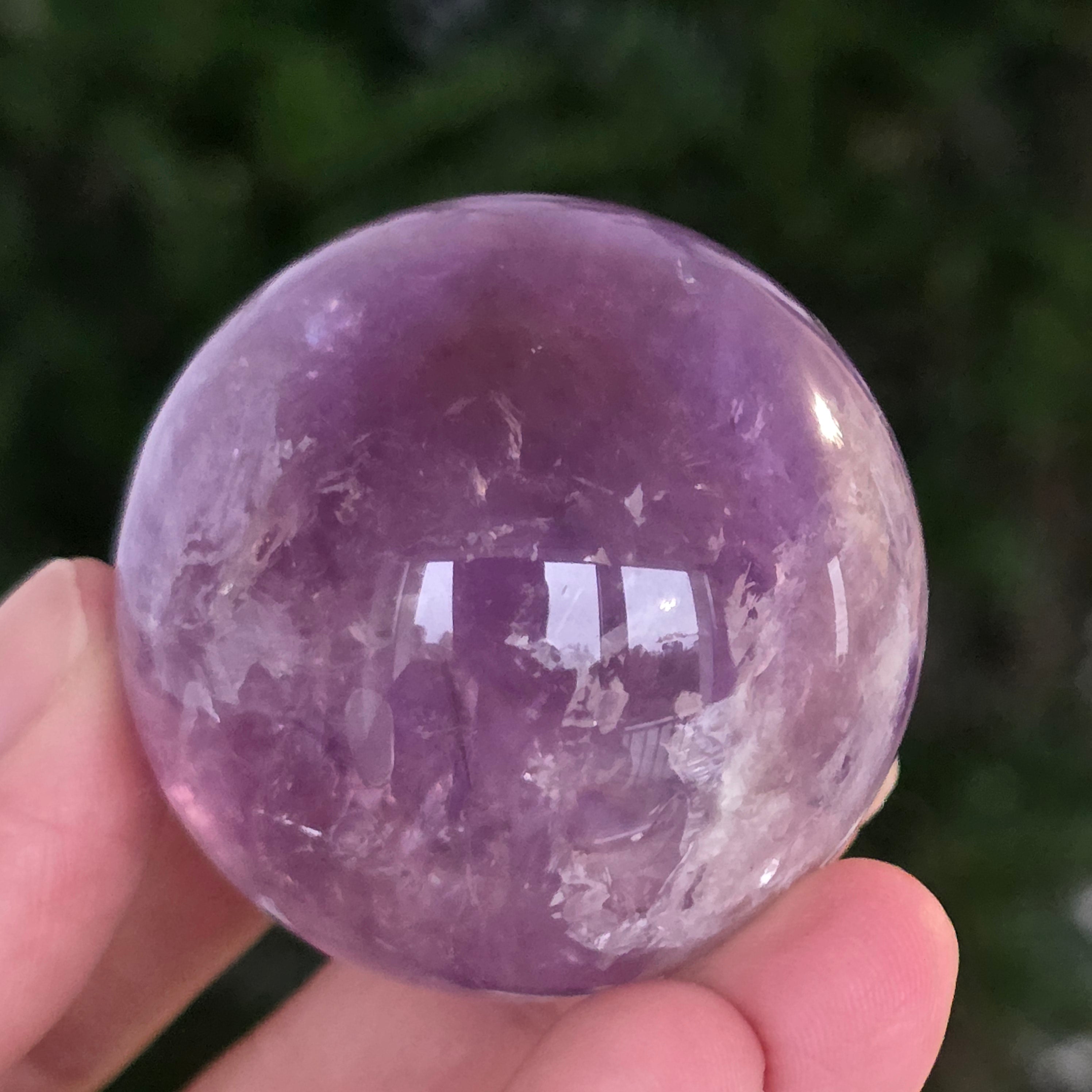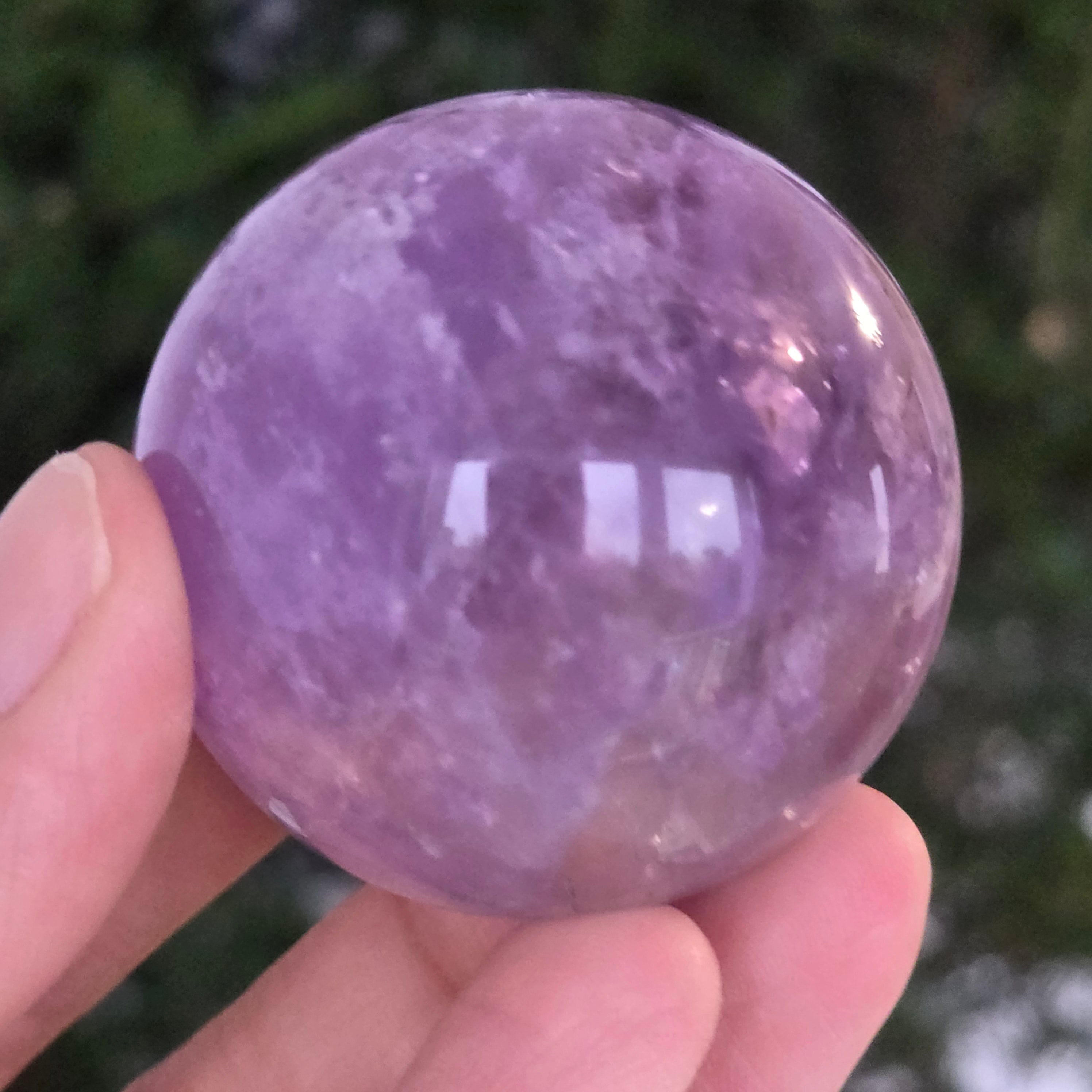 Сфера, която изглежда така, сякаш е уловила същността на небето при залез. Този уникален екземпляр от естествен бразилски аметист AAизлъчва дълбок и полупрозрачен блясък с нюанси на кралско виолетово, люляково и сянка на лавандула, които се играят с светлината. Перфектно полираната повърхност изважда на преден план чистотата на кристала и фината текстура на естествения камък – минерално бижу с класическа и балансирана красота.