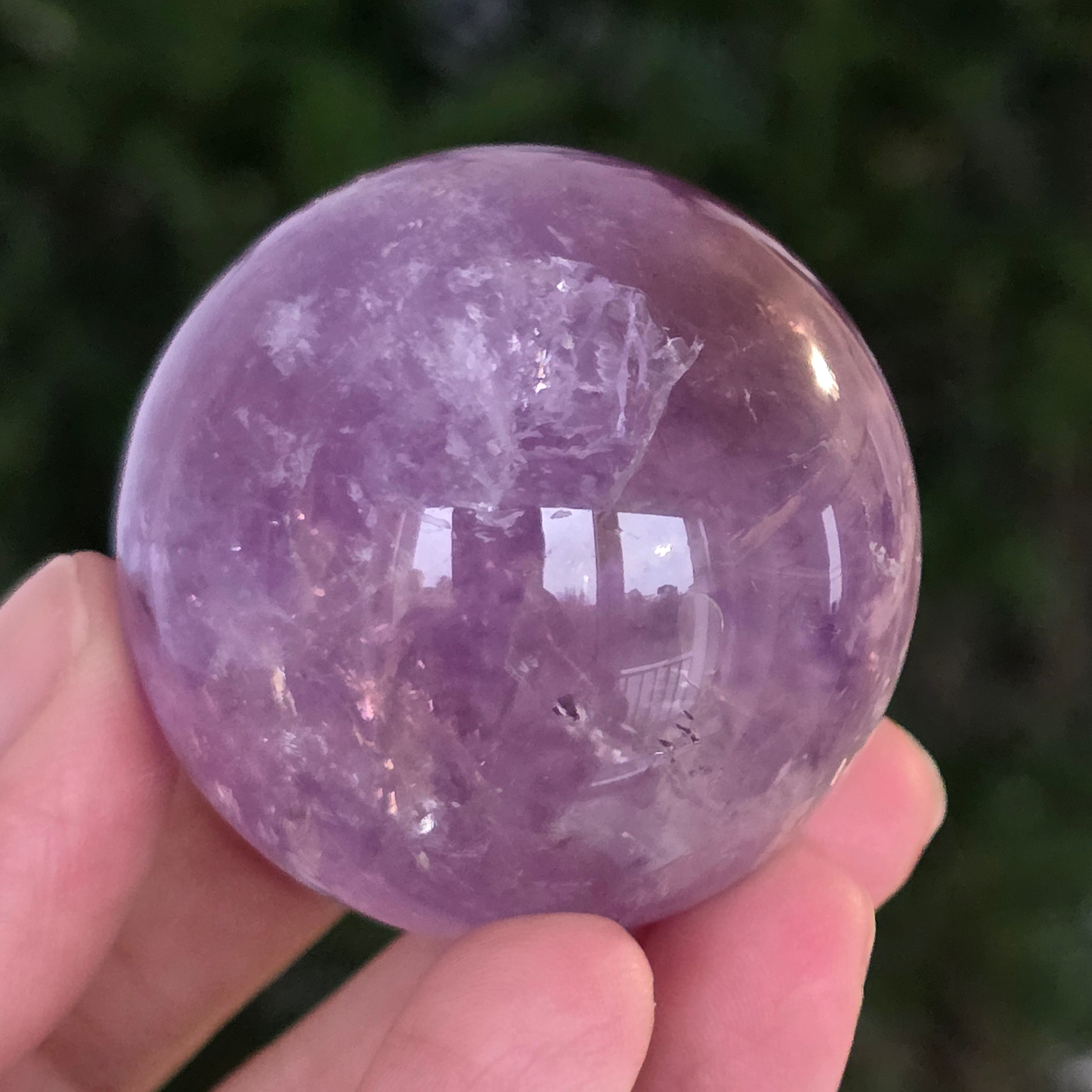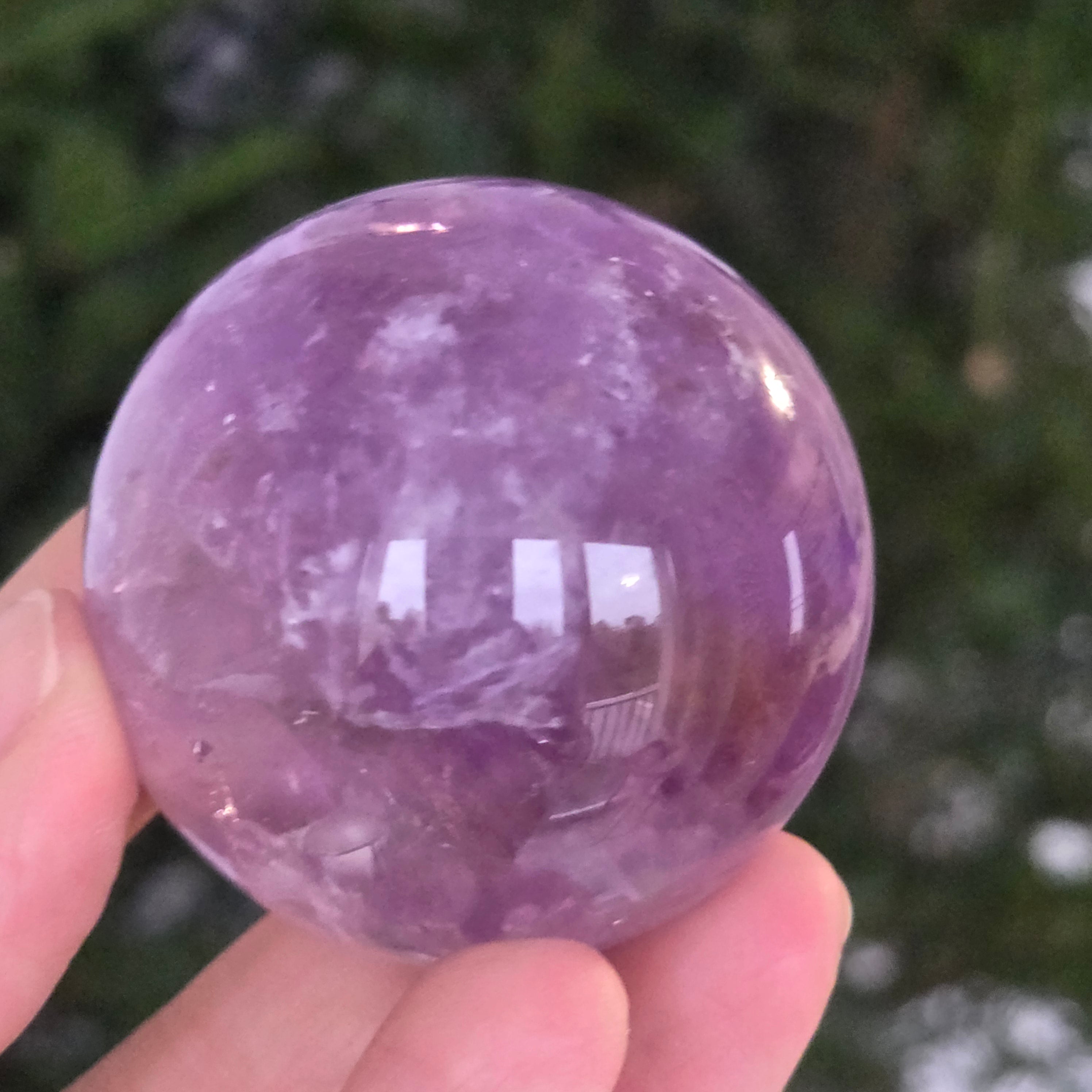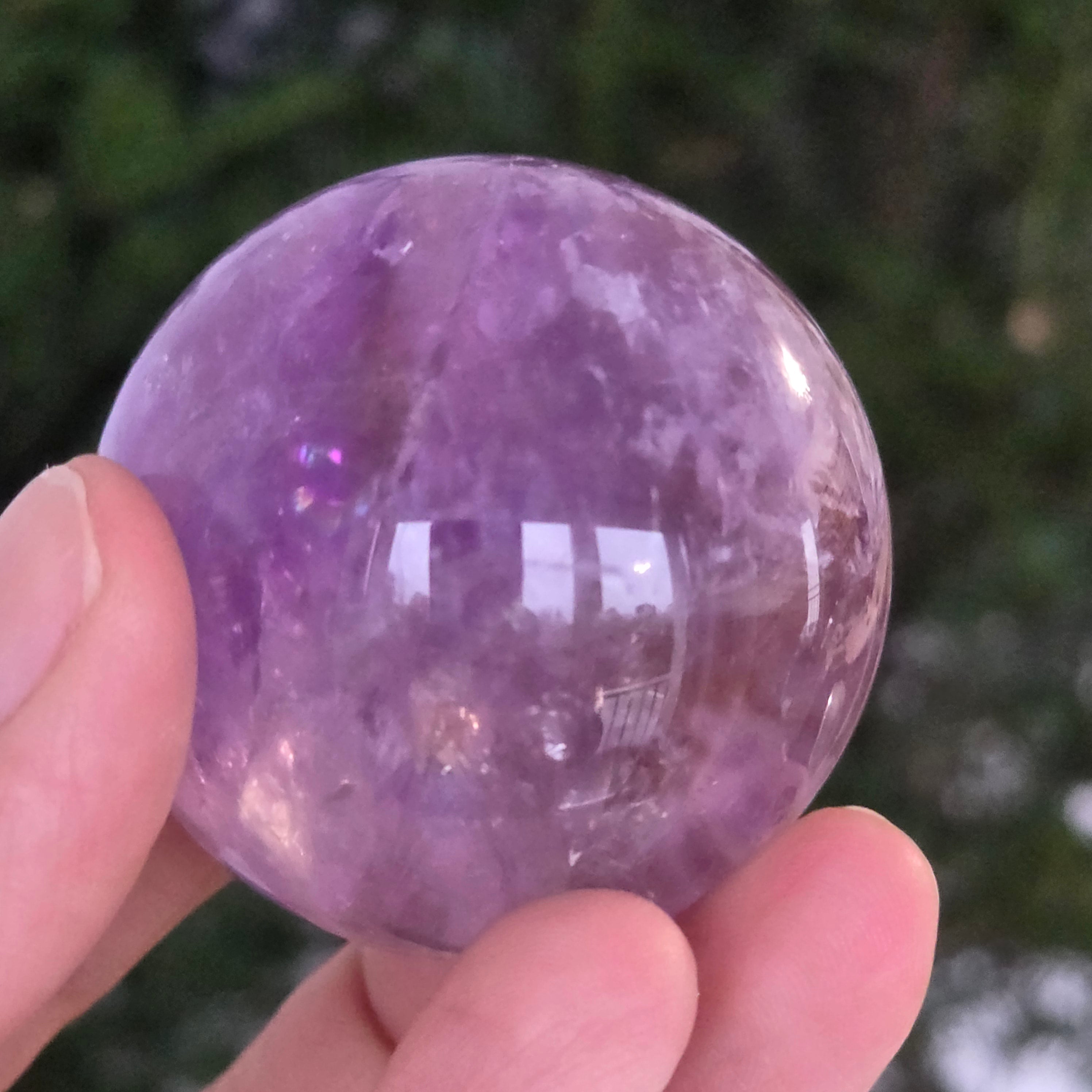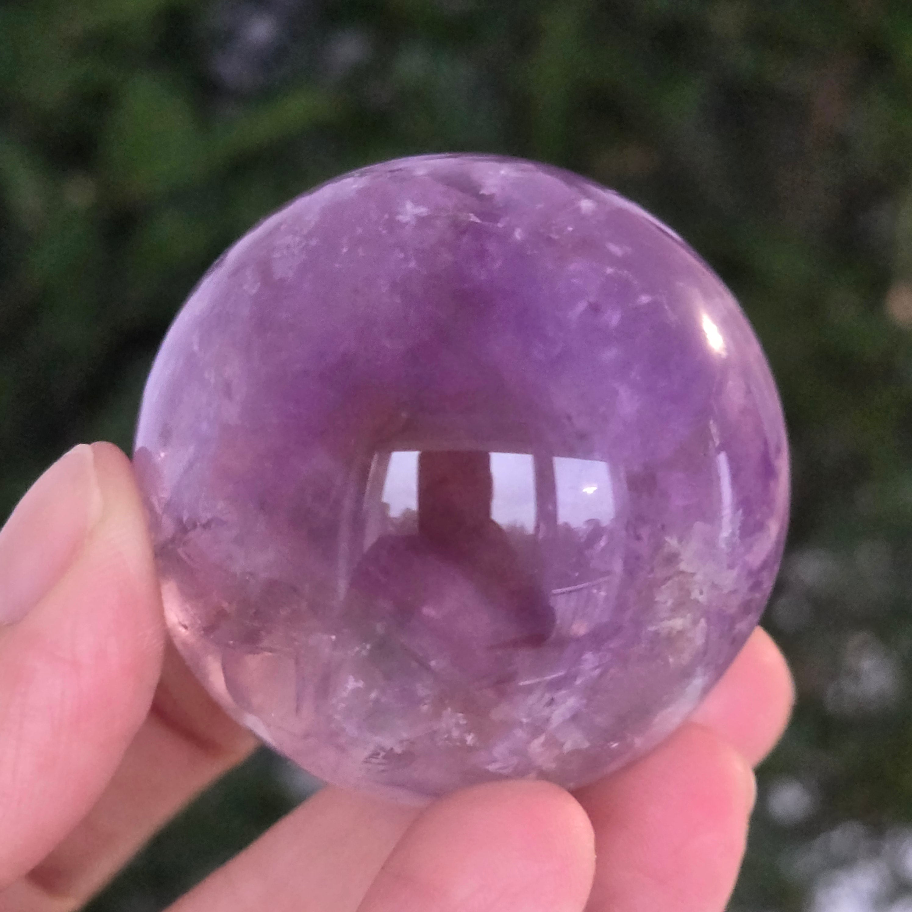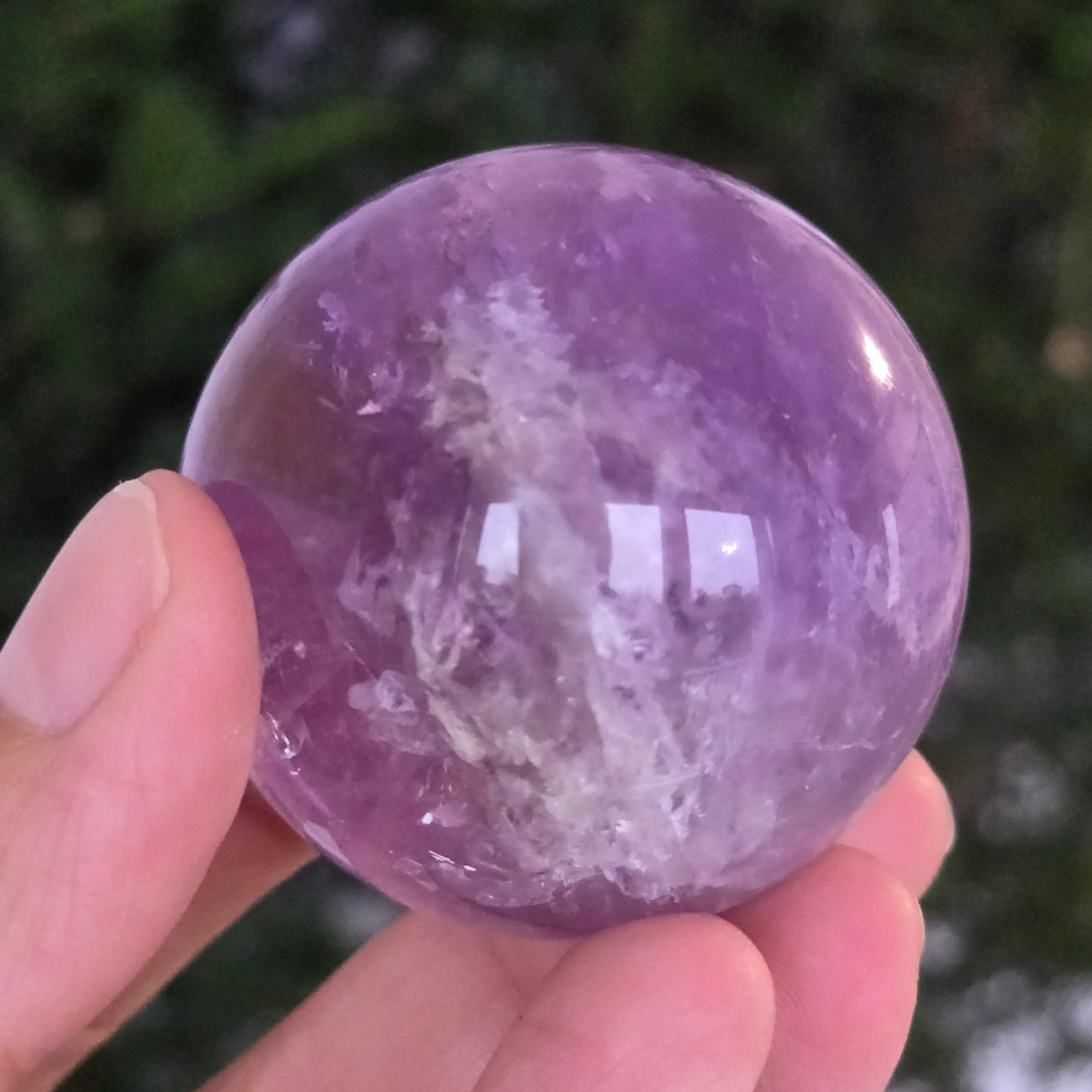 Сфера, която изглежда така, сякаш е уловила същността на небето при залез. Този уникален екземпляр от естествен бразилски аметист AAизлъчва дълбок и полупрозрачен блясък с нюанси на кралско виолетово, люляково и сянка на лавандула, които се играят с светлината. Перфектно полираната повърхност изважда на преден план чистотата на кристала и фината текстура на естествения камък – минерално бижу с класическа и балансирана красота.