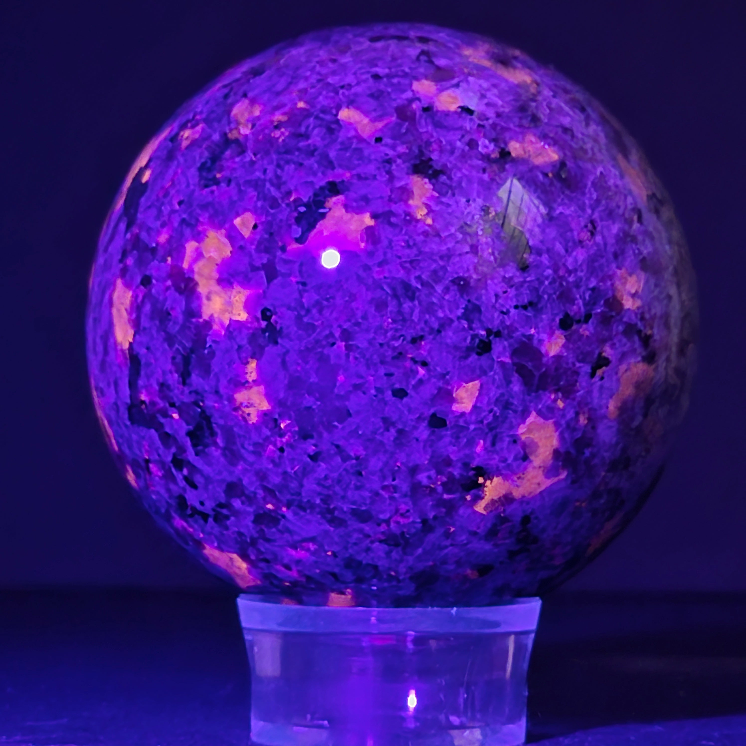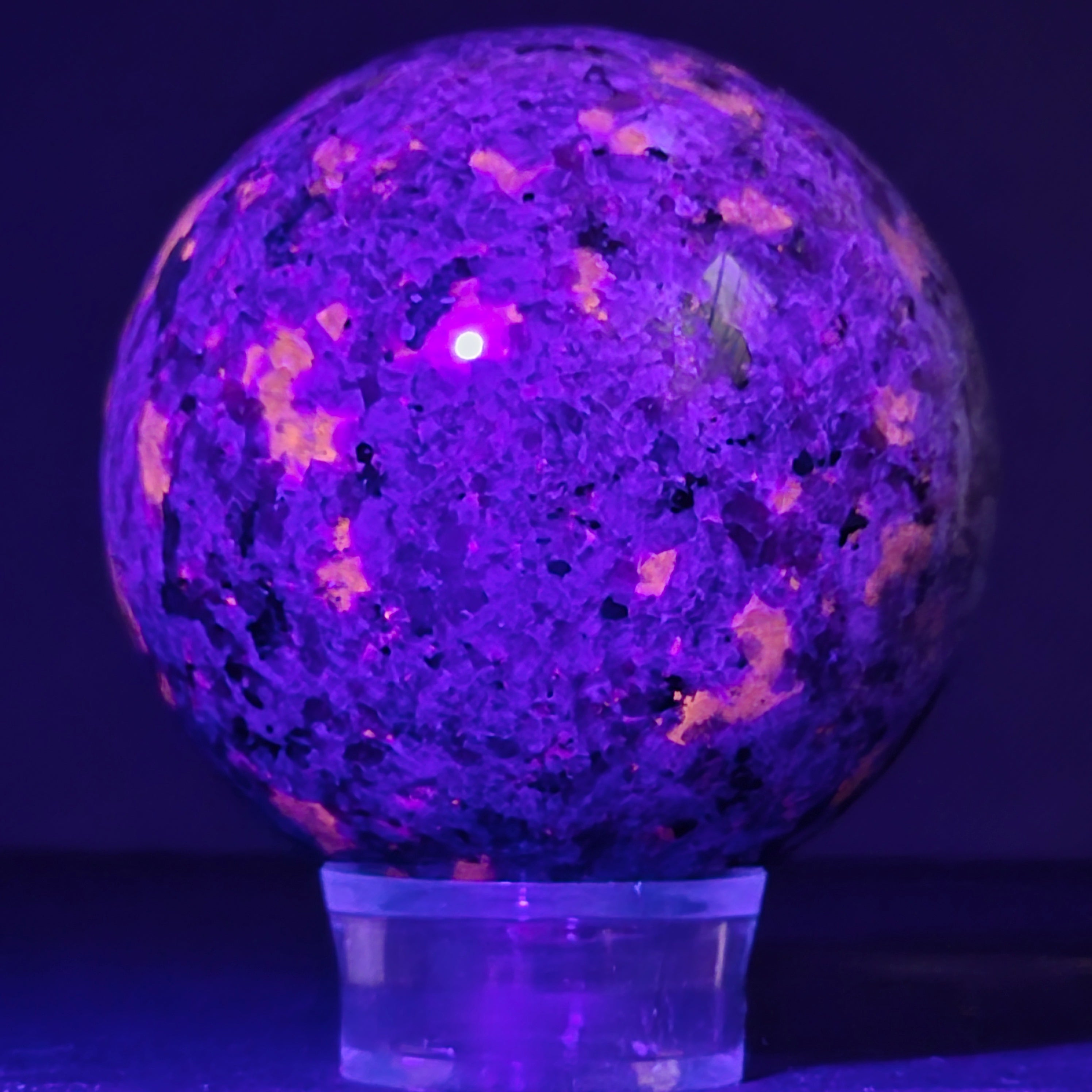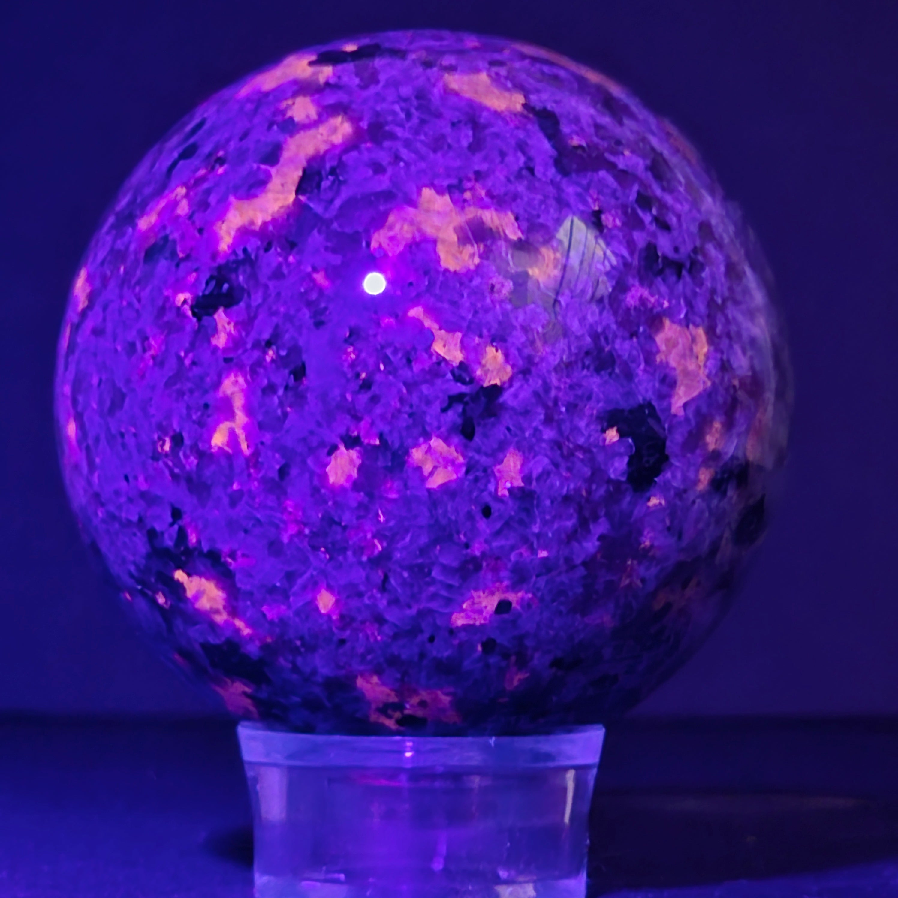 Геологически, йооперлитът е сиенитна скала, богата на содалит – и именно содалитът реагира на UV светлина и създава този впечатляващ ефект.