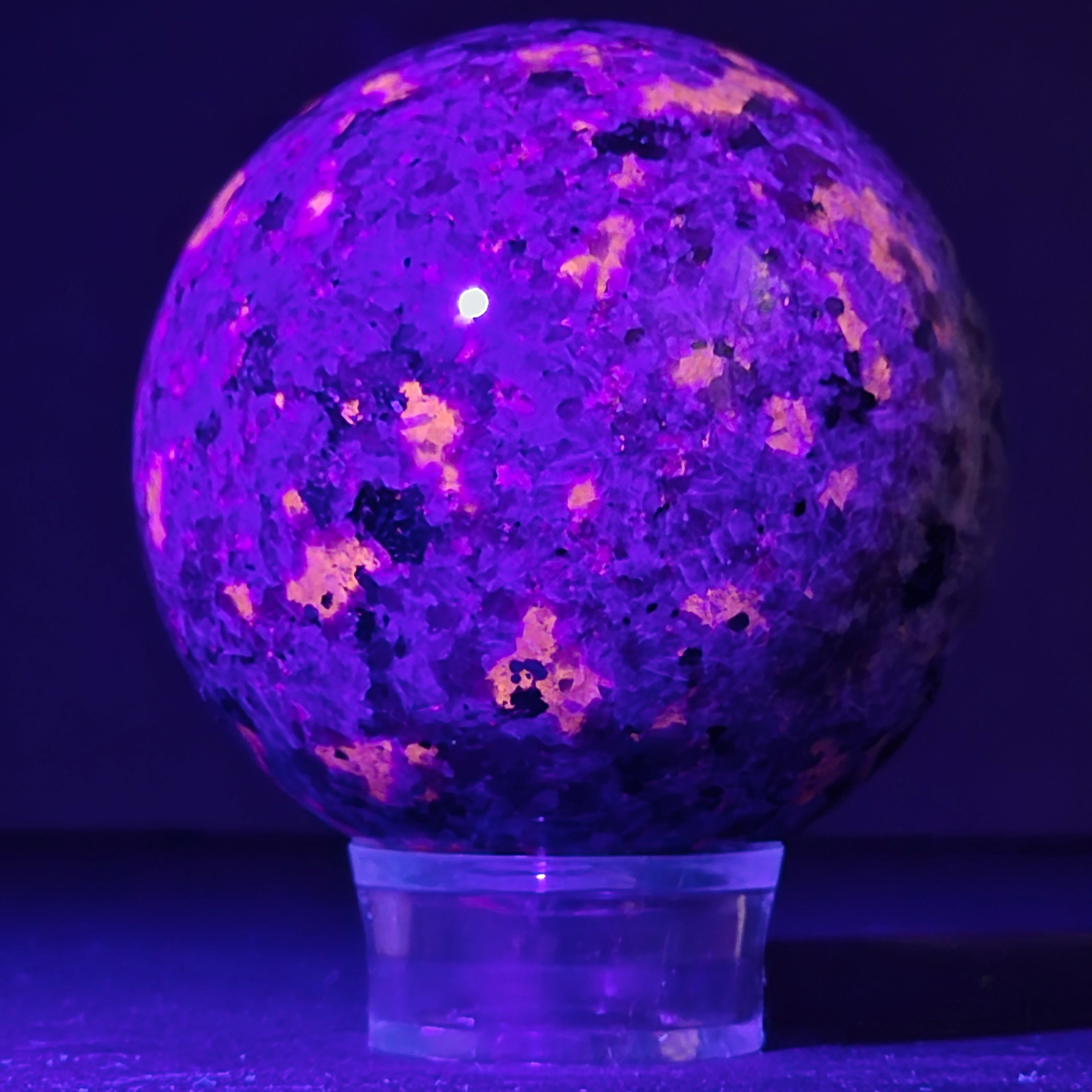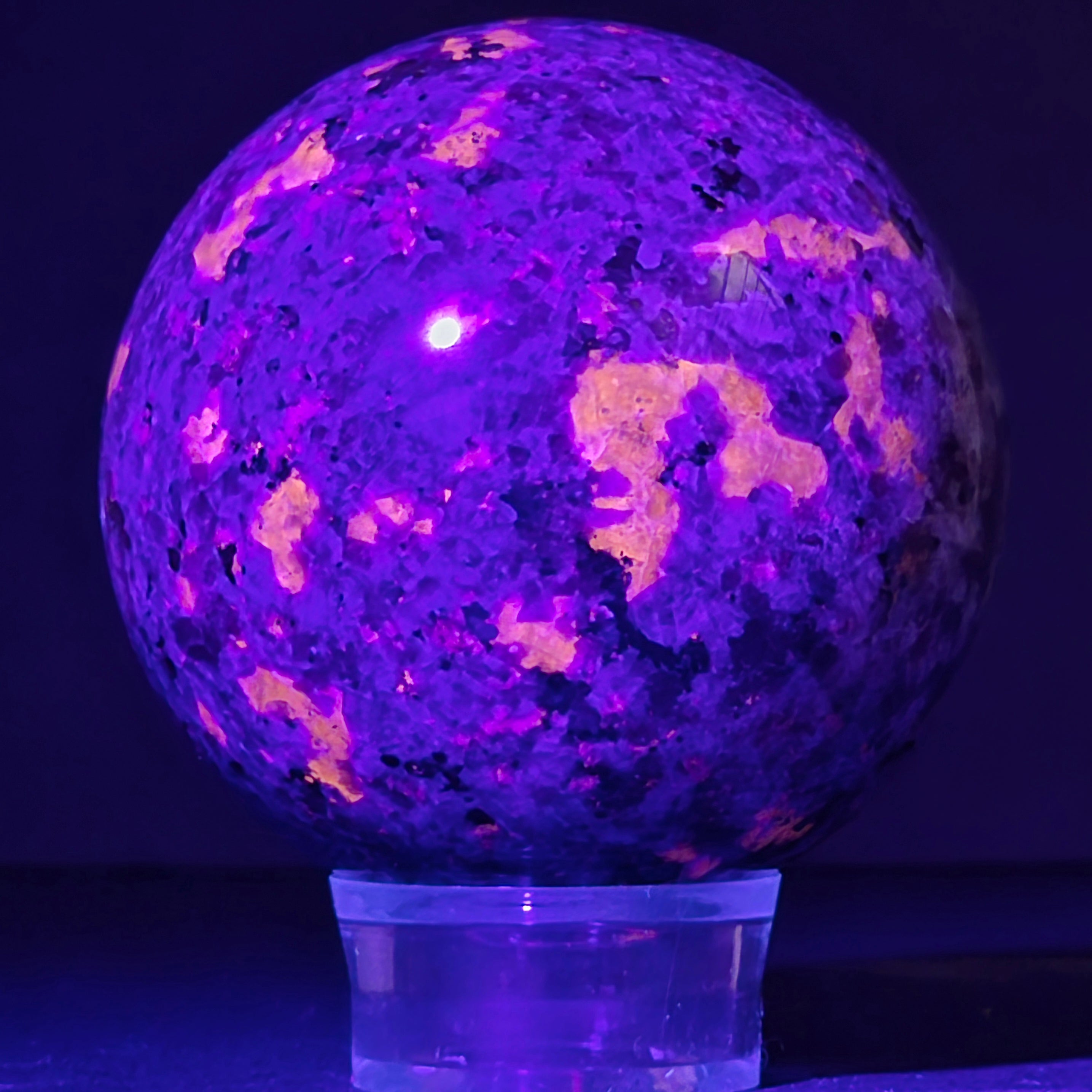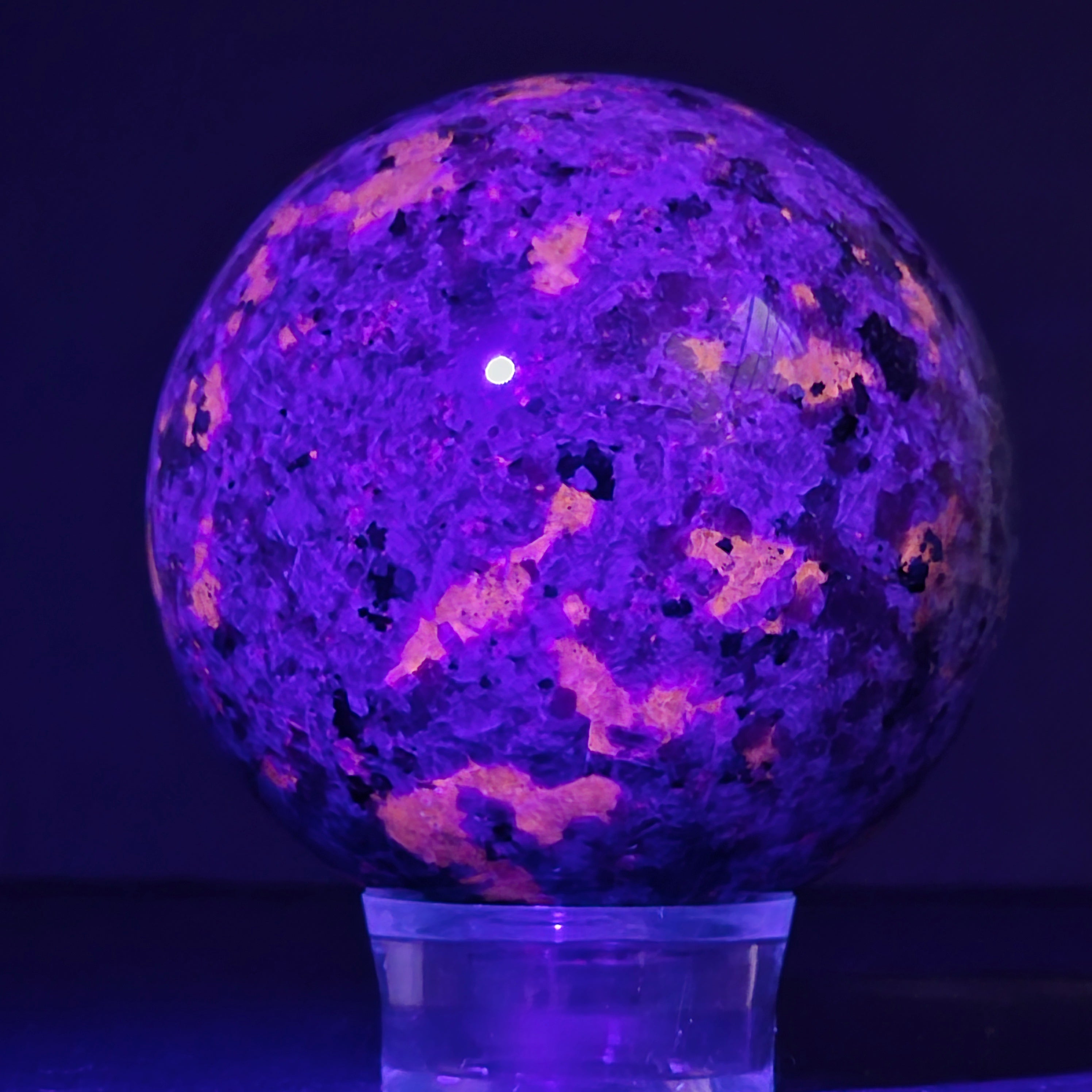 Геологически, йооперлитът е сиенитна скала, богата на содалит – и именно содалитът реагира на UV светлина и създава този впечатляващ ефект.