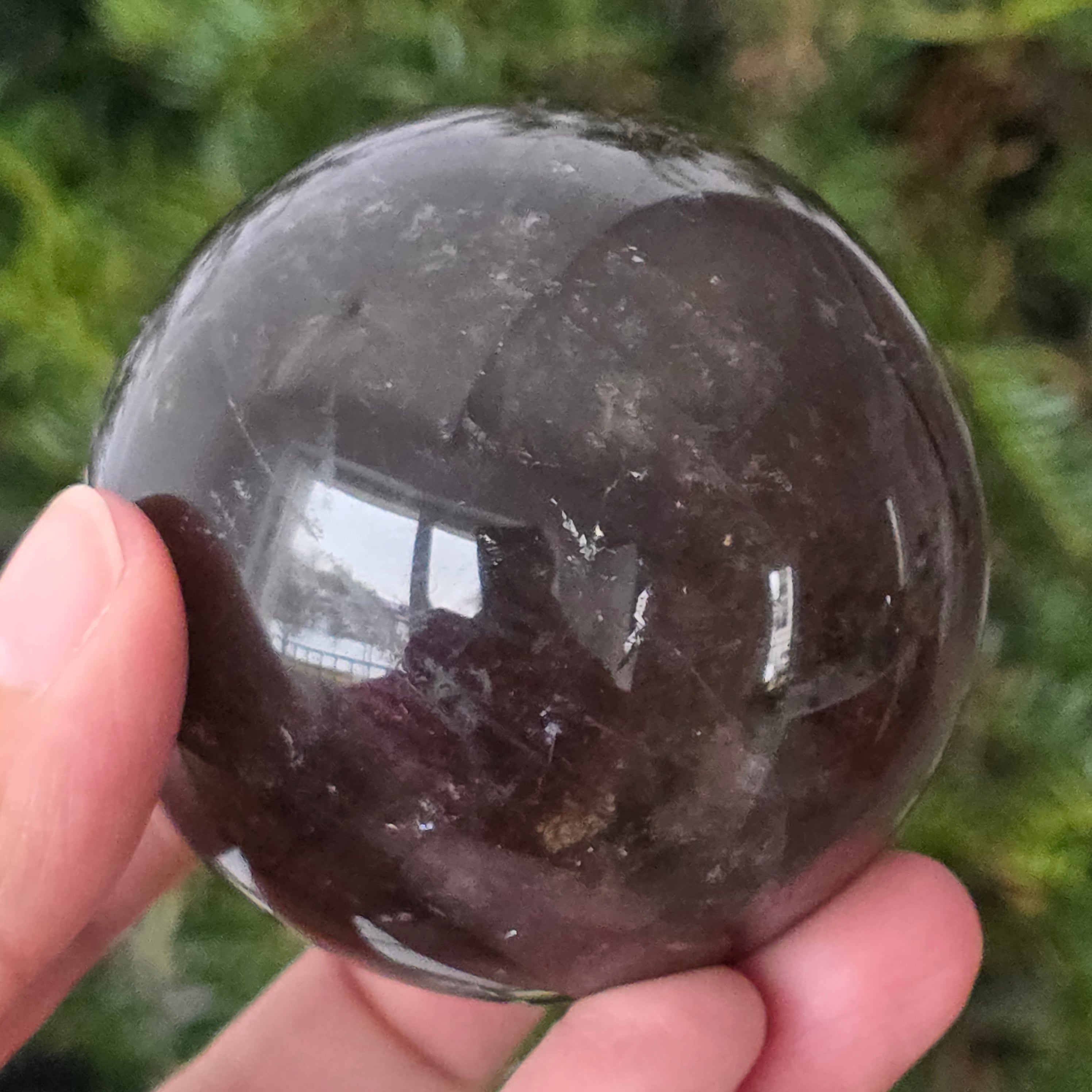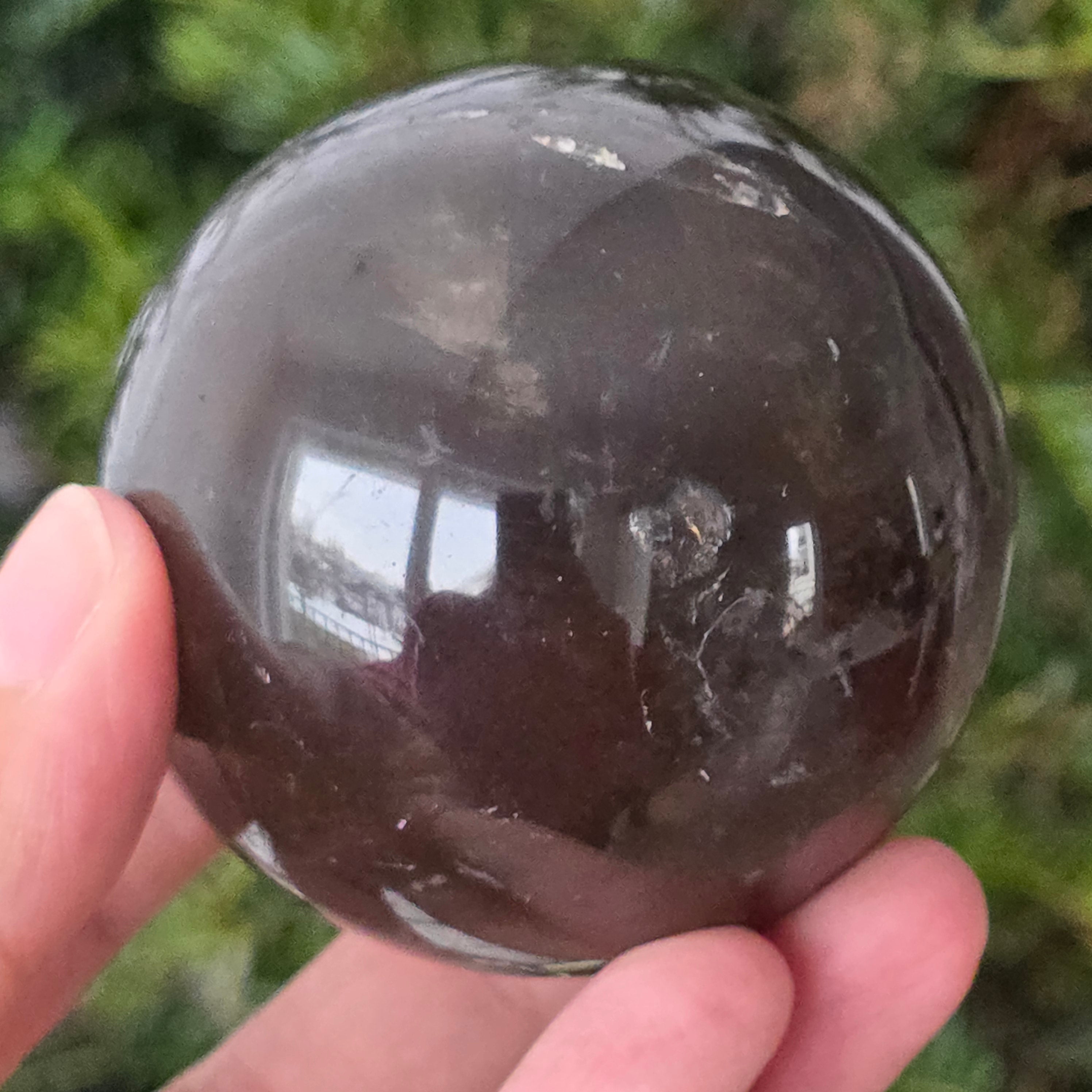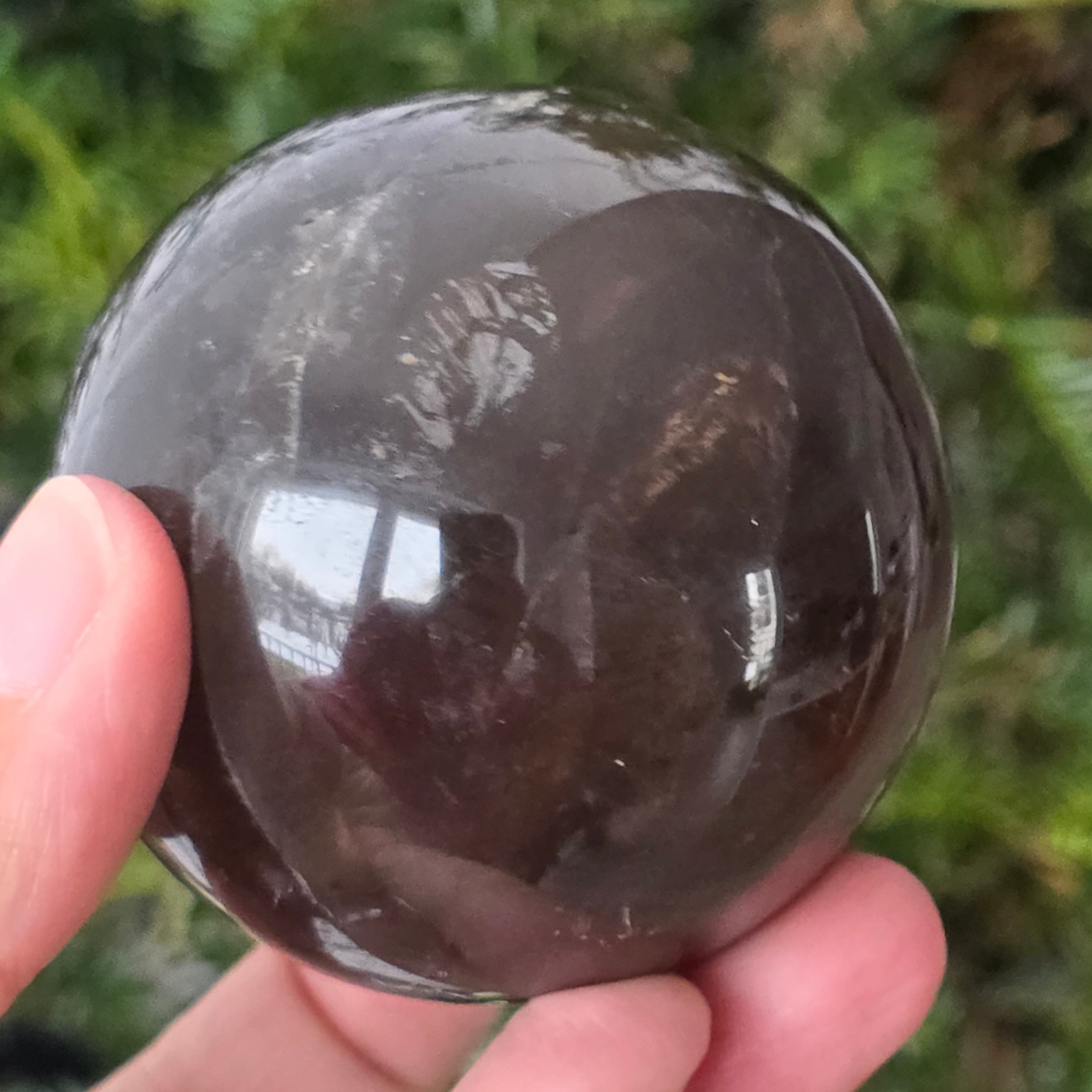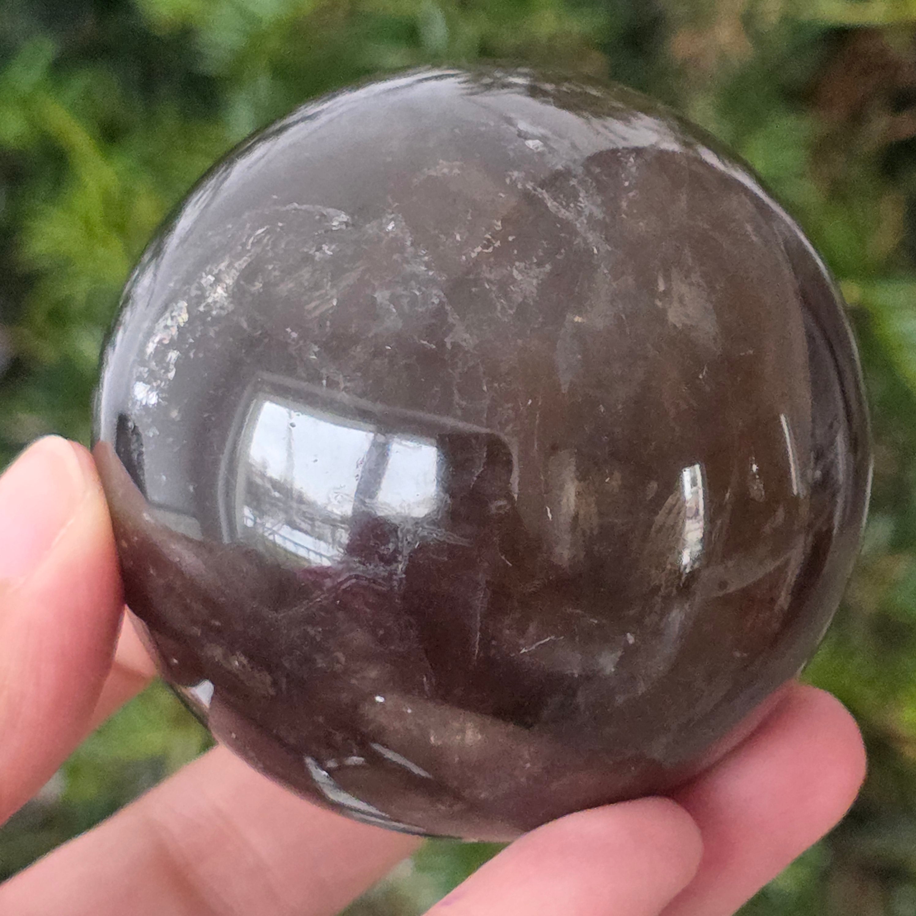 Сферата от морион кварц е мощен и елегантен предмет, известен с дълбокия си нюанс, наподобяващ гъст дим или прозрачен обсидиан. Морионът е най-тъмният вид пушен кварц, а в тази перфектно кръгла форма разкрива дискретни отражения, фини вътрешни детайли и наистина изтънчено визуално присъствие.