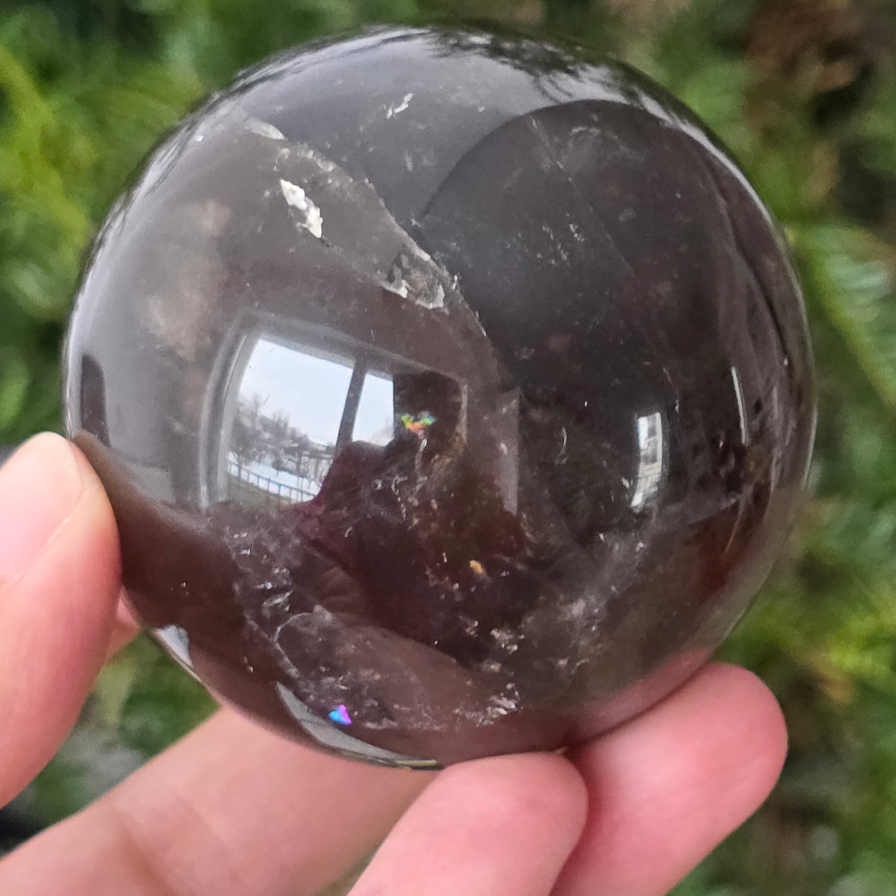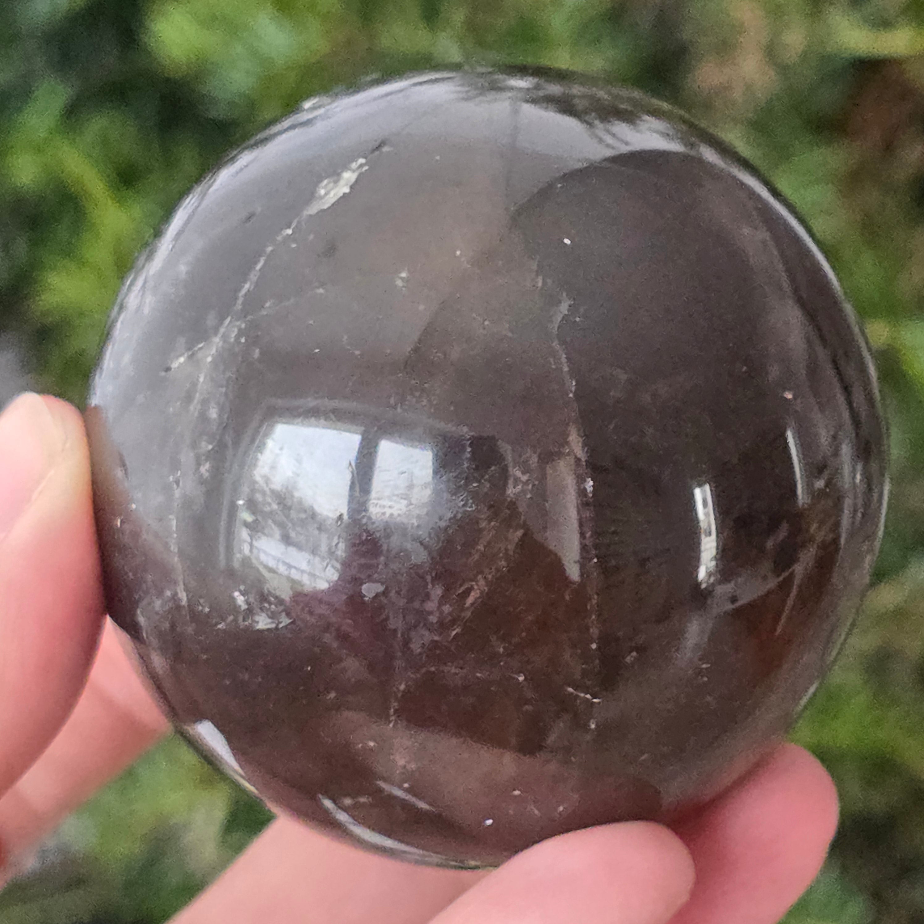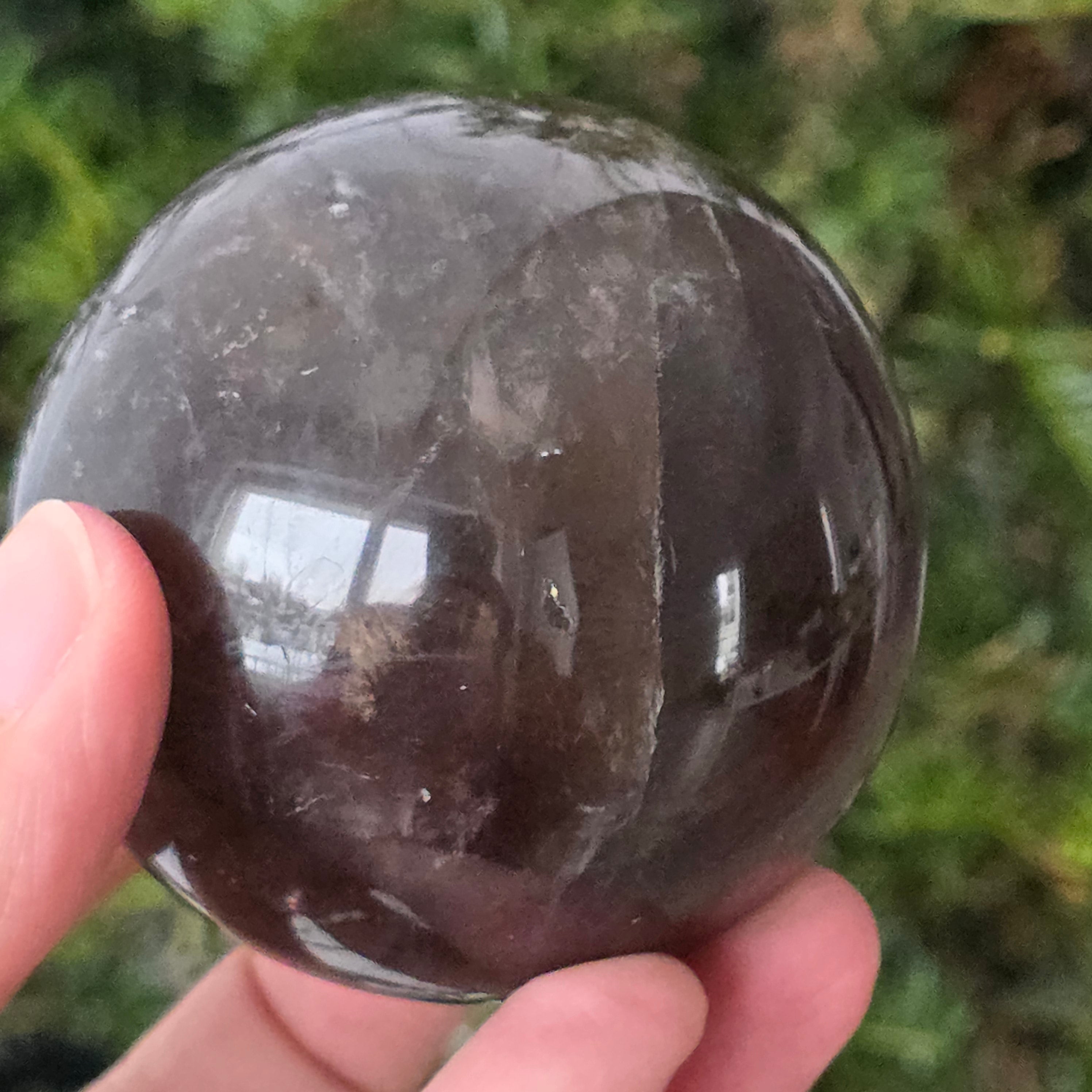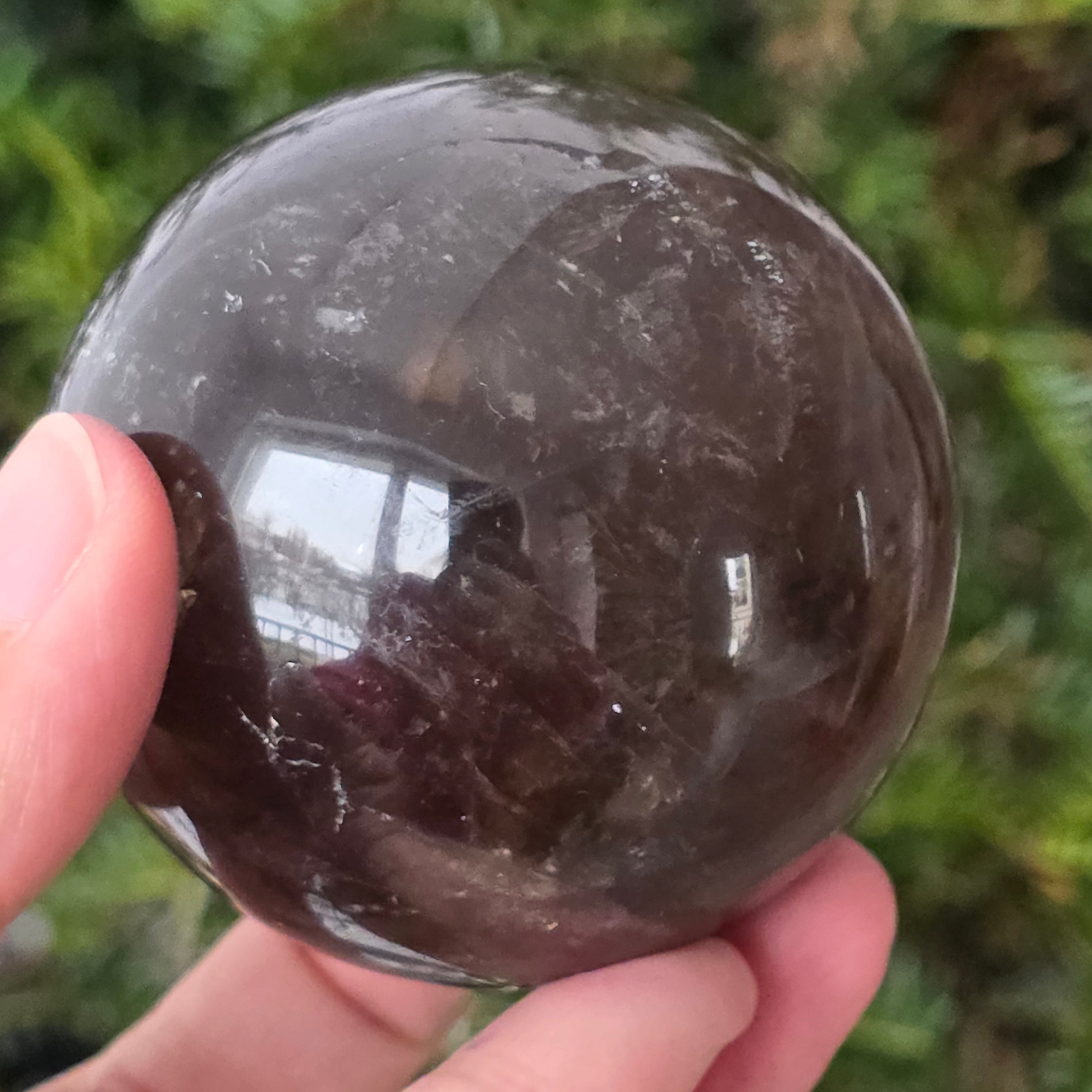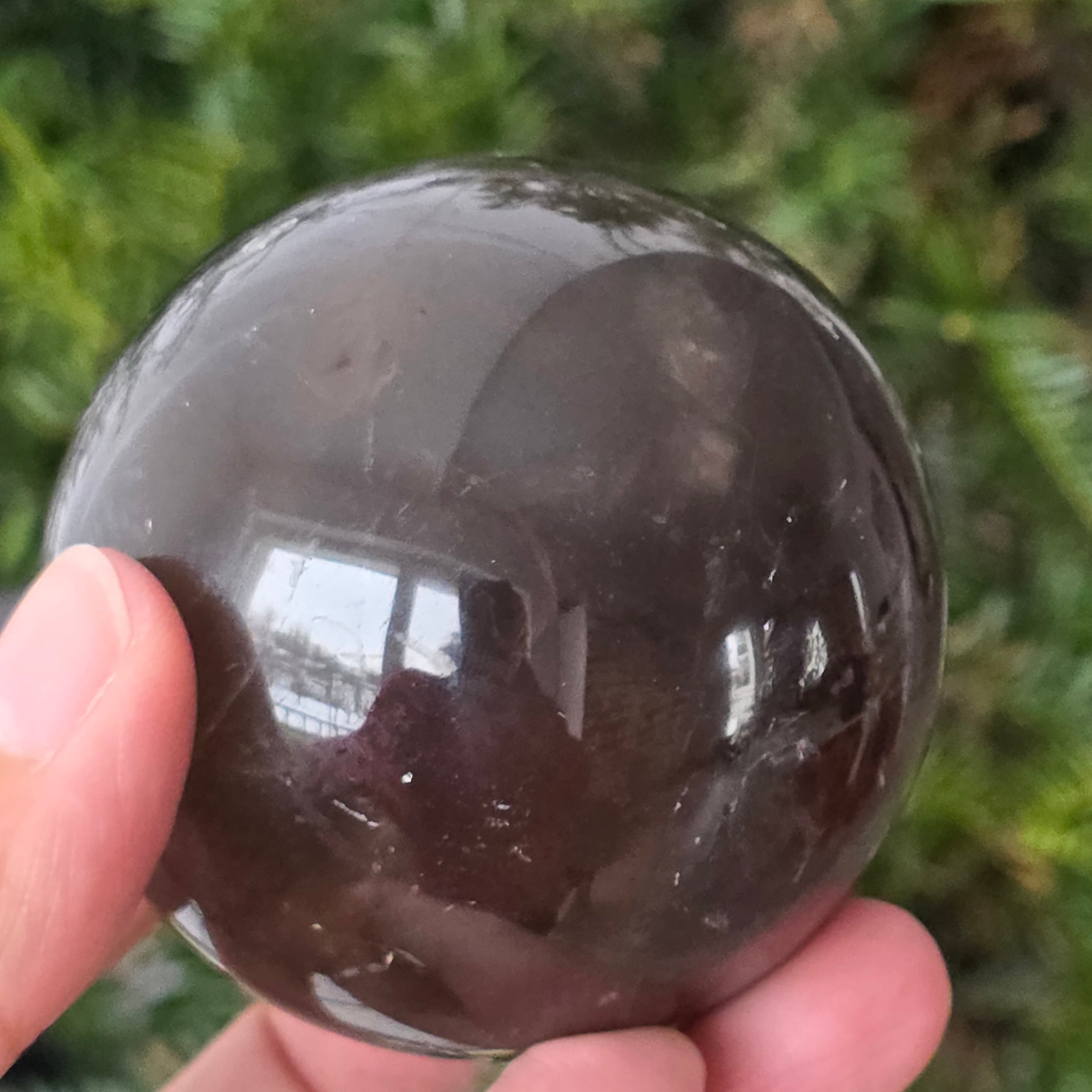 Сферата от морион кварц е мощен и елегантен предмет, известен с дълбокия си нюанс, наподобяващ гъст дим или прозрачен обсидиан. Морионът е най-тъмният вид пушен кварц, а в тази перфектно кръгла форма разкрива дискретни отражения, фини вътрешни детайли и наистина изтънчено визуално присъствие.