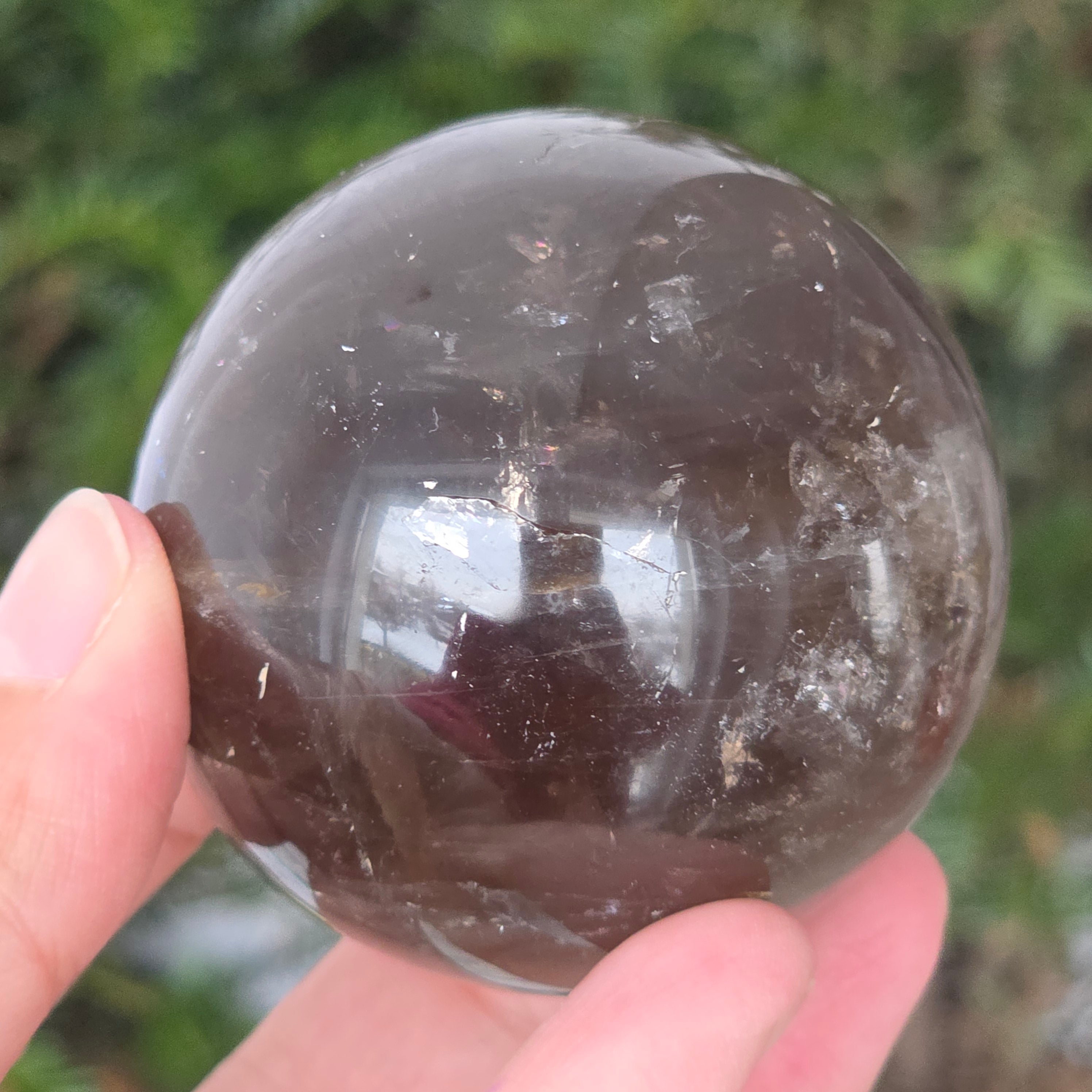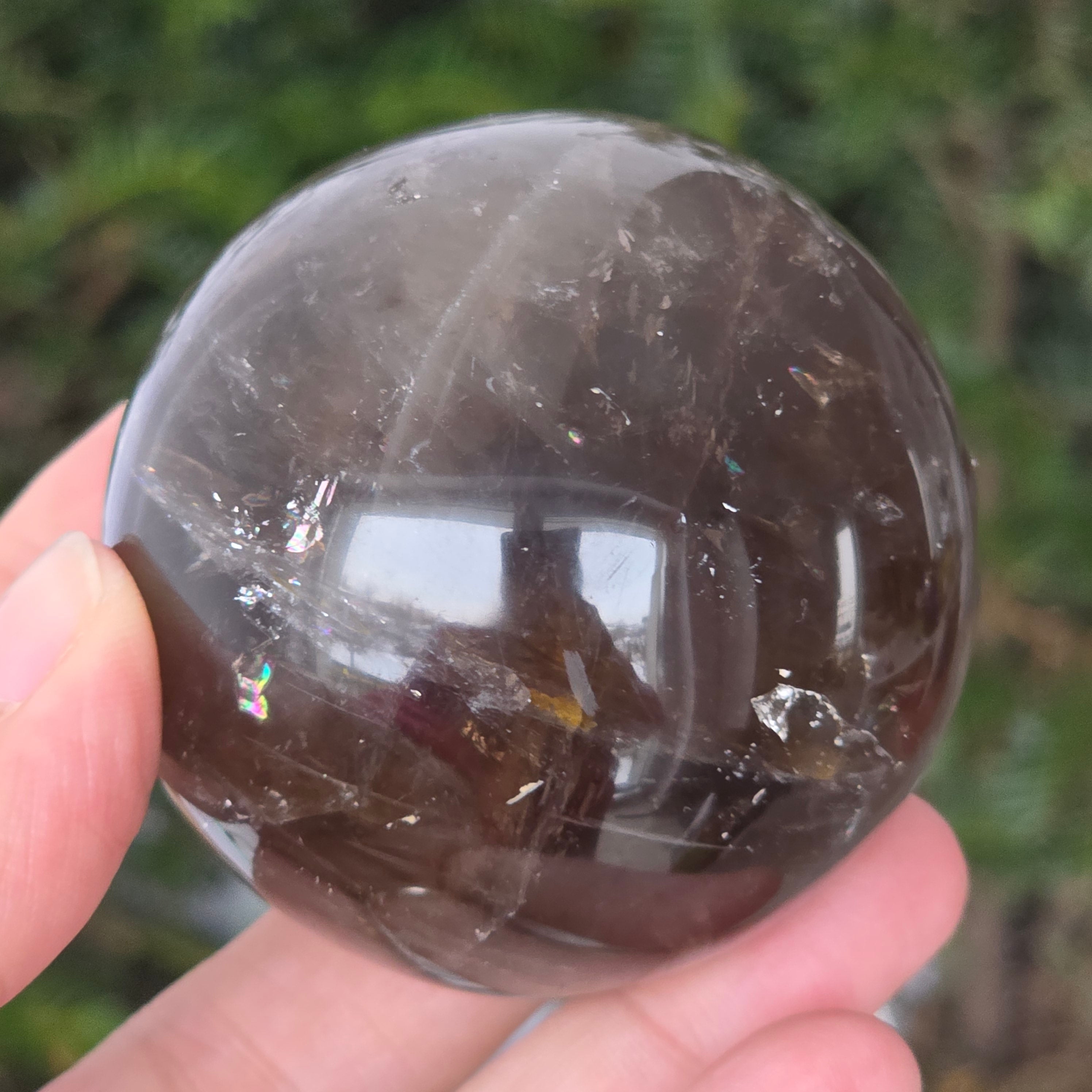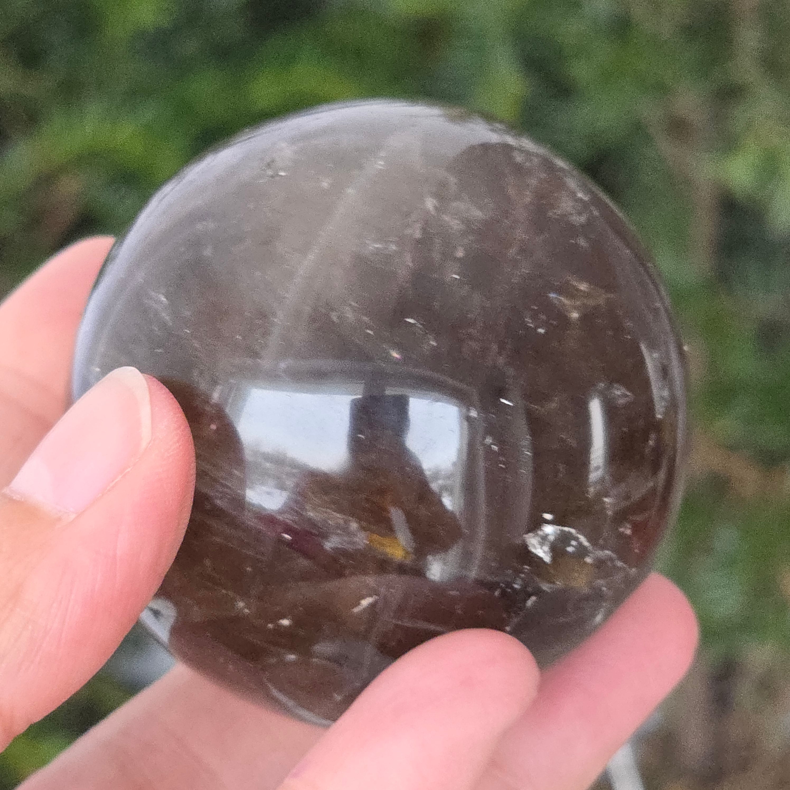 Сферата от морион кварц е мощен и елегантен артикул, известен със своята дълбока, димна или прозрачна обсидианова тоналност. Морионът е най-тъмният вид димно стъкло, а в тази перфектно кръгла форма разкрива дискретни отблясъци, фини вътрешни детайли и наистина изискано визуално присъствие.