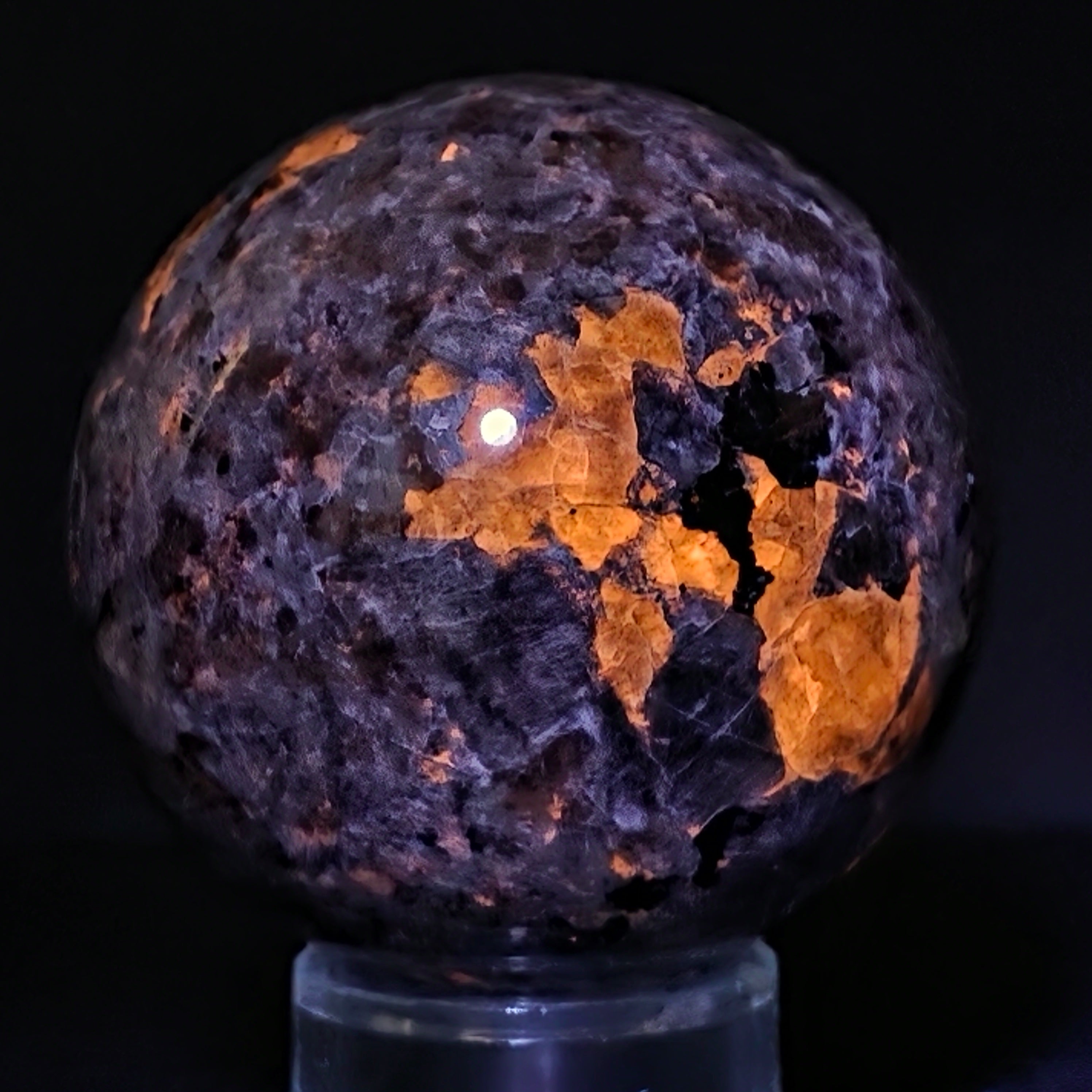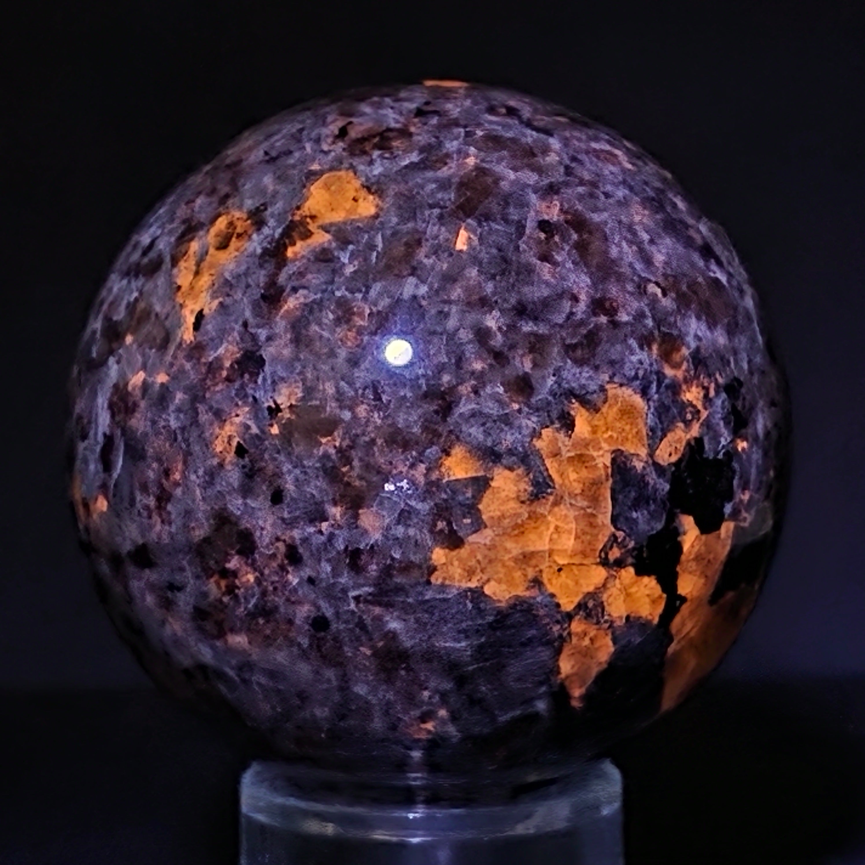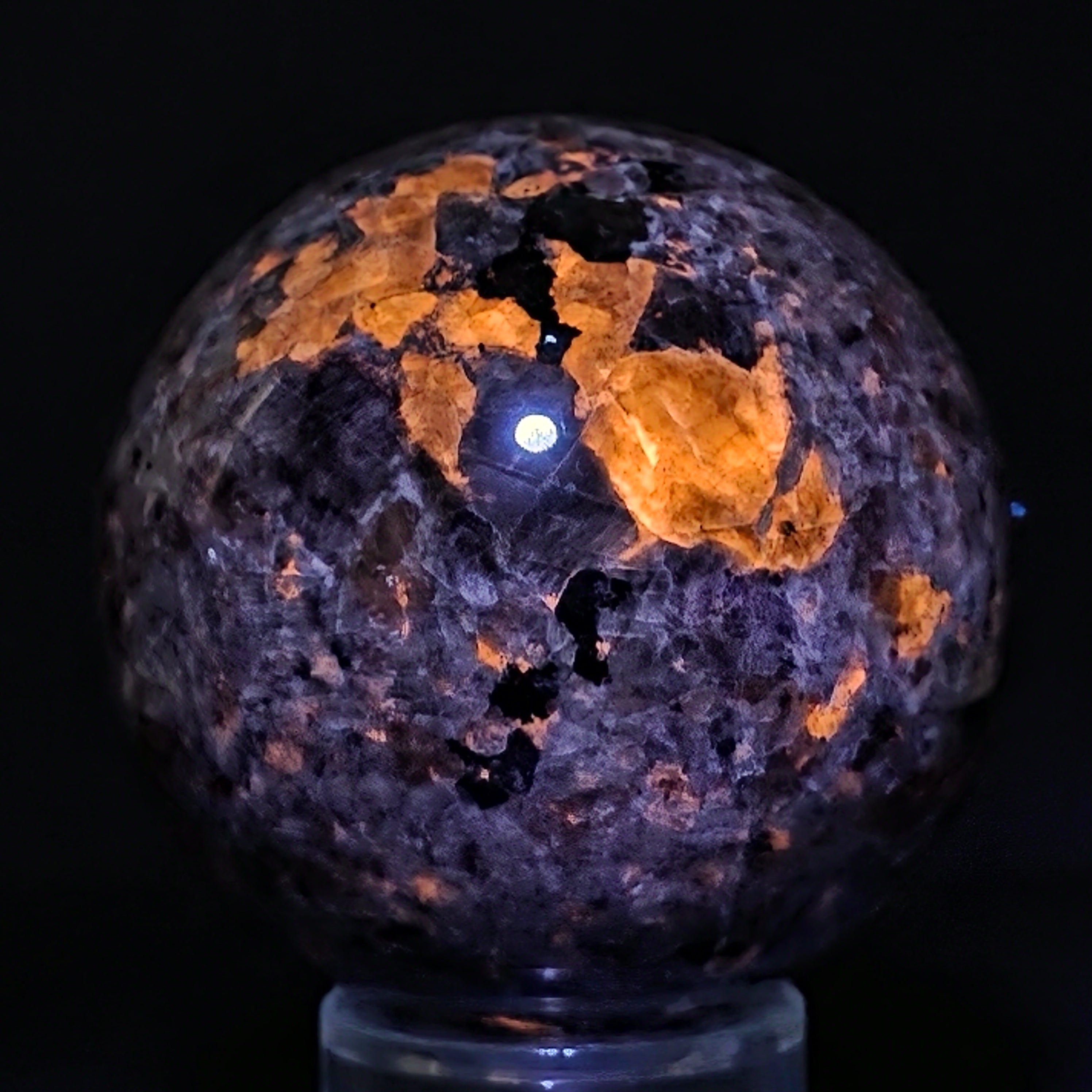 Геоложки погледнато, йооперлитът е сиенитова скала, богата на содалит – и именно содалитът реагира на UV и създава този впечатляващ ефект.