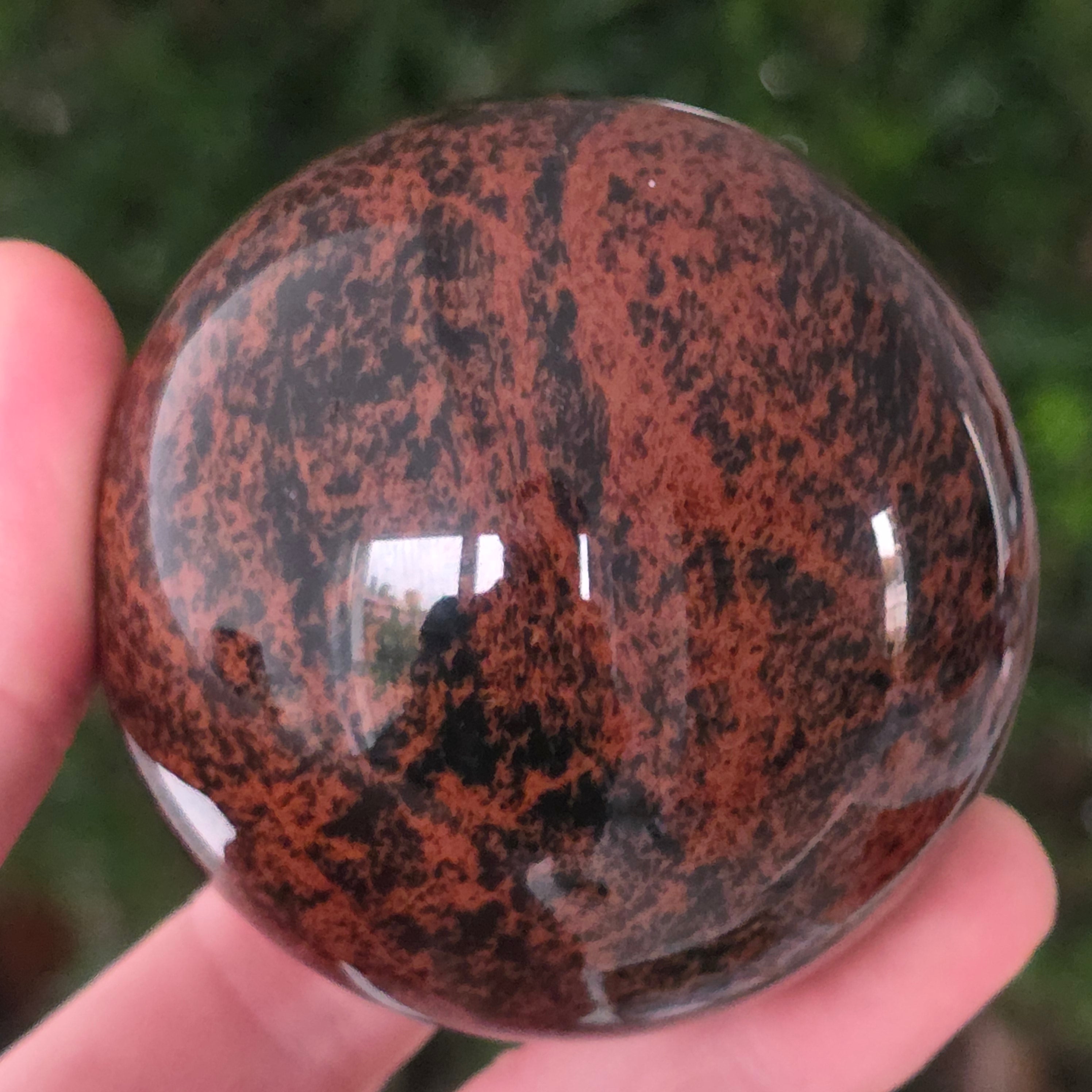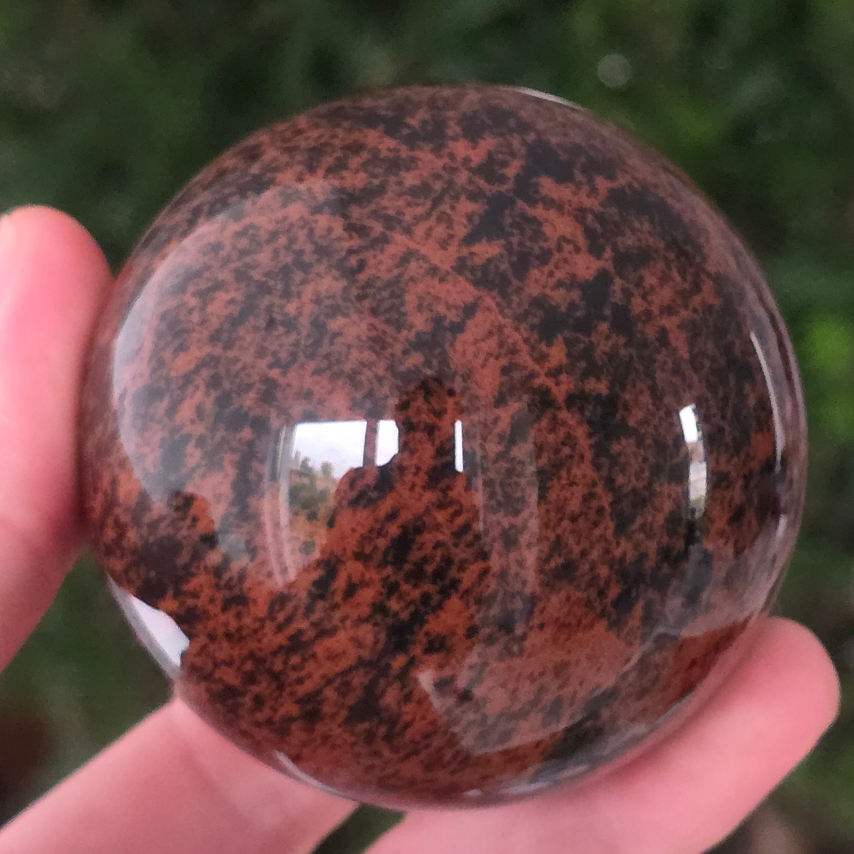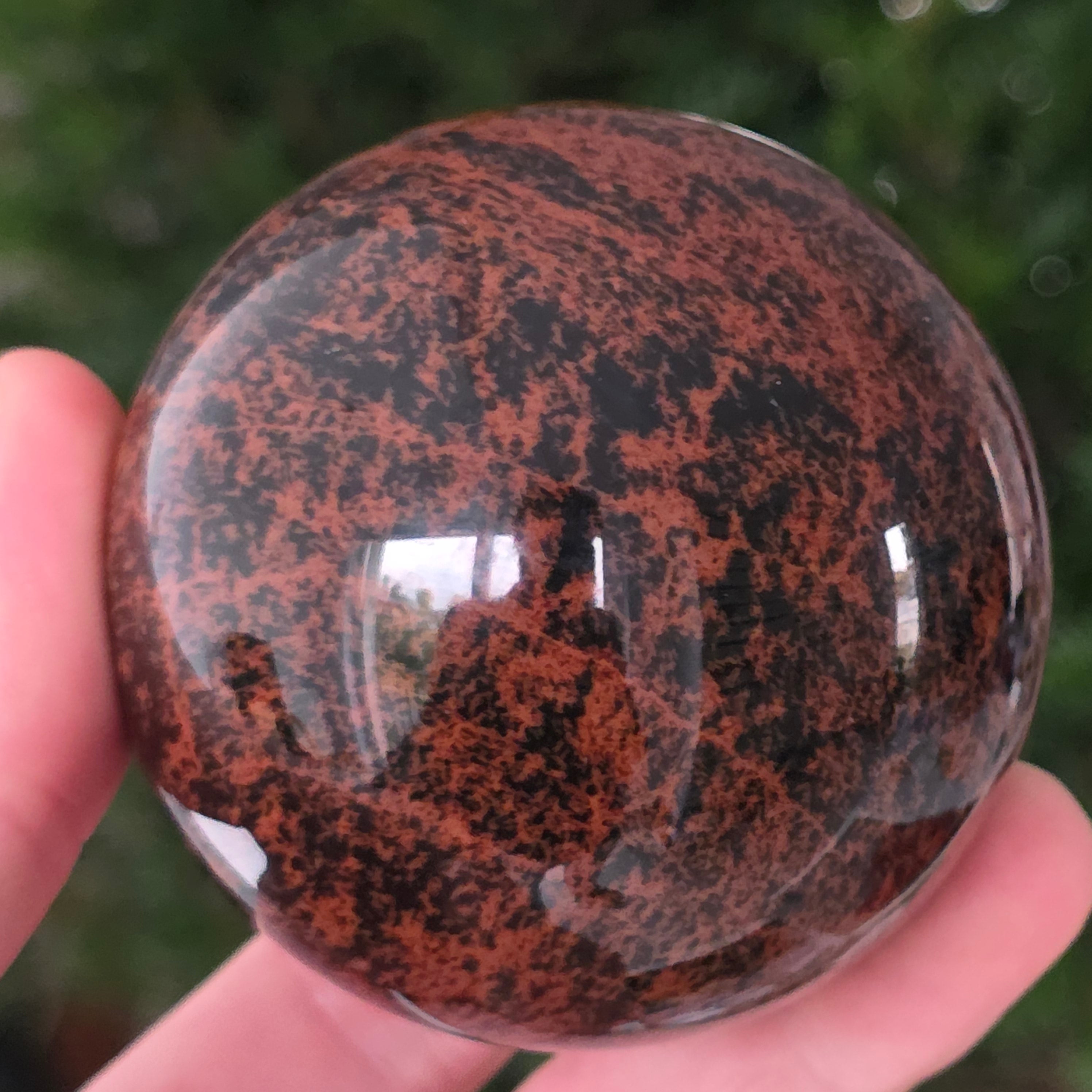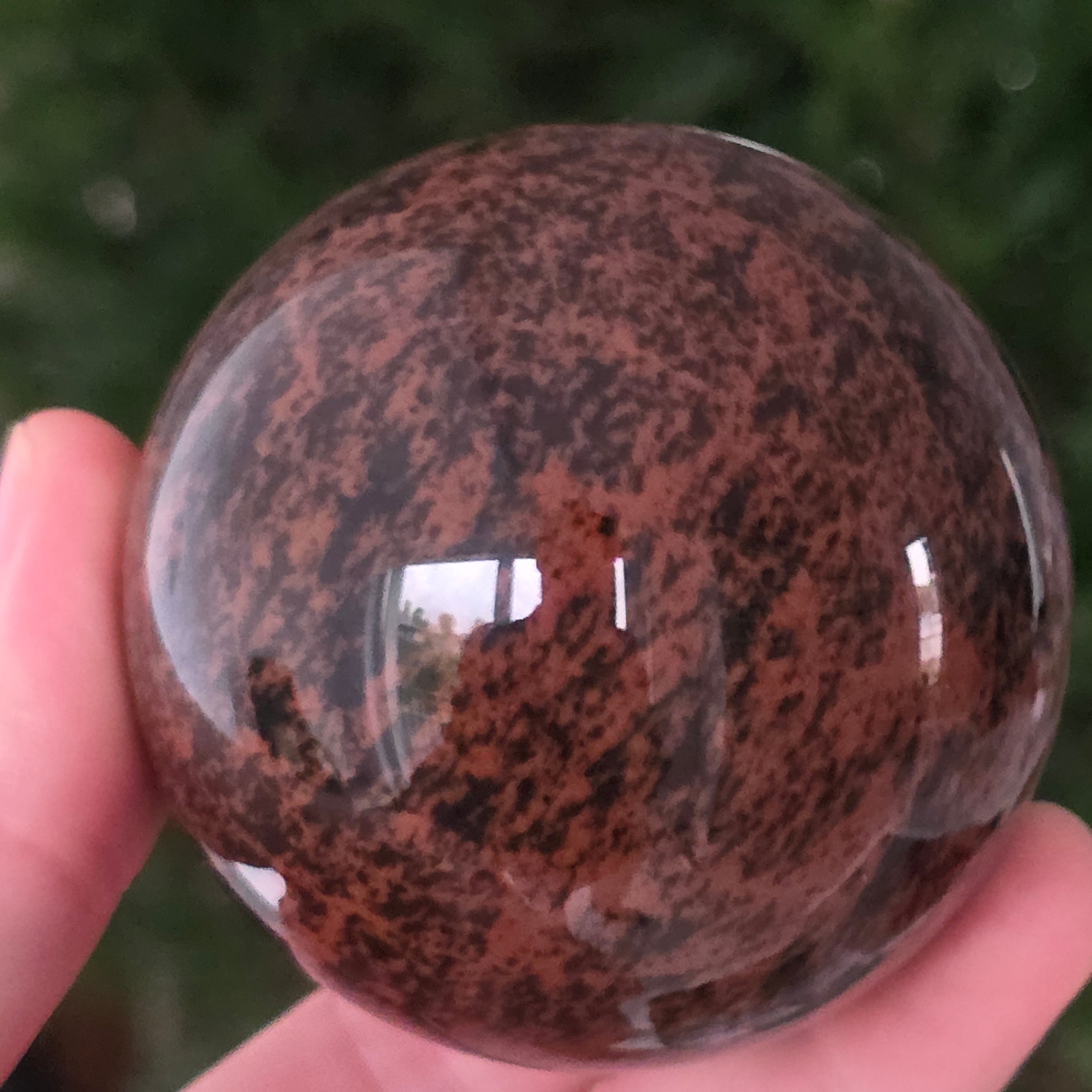Тази сфера от махагонов обсидиан е въплъщение на първичната сила на Земята — камък на корените, сигурността и вътрешната трансформация.