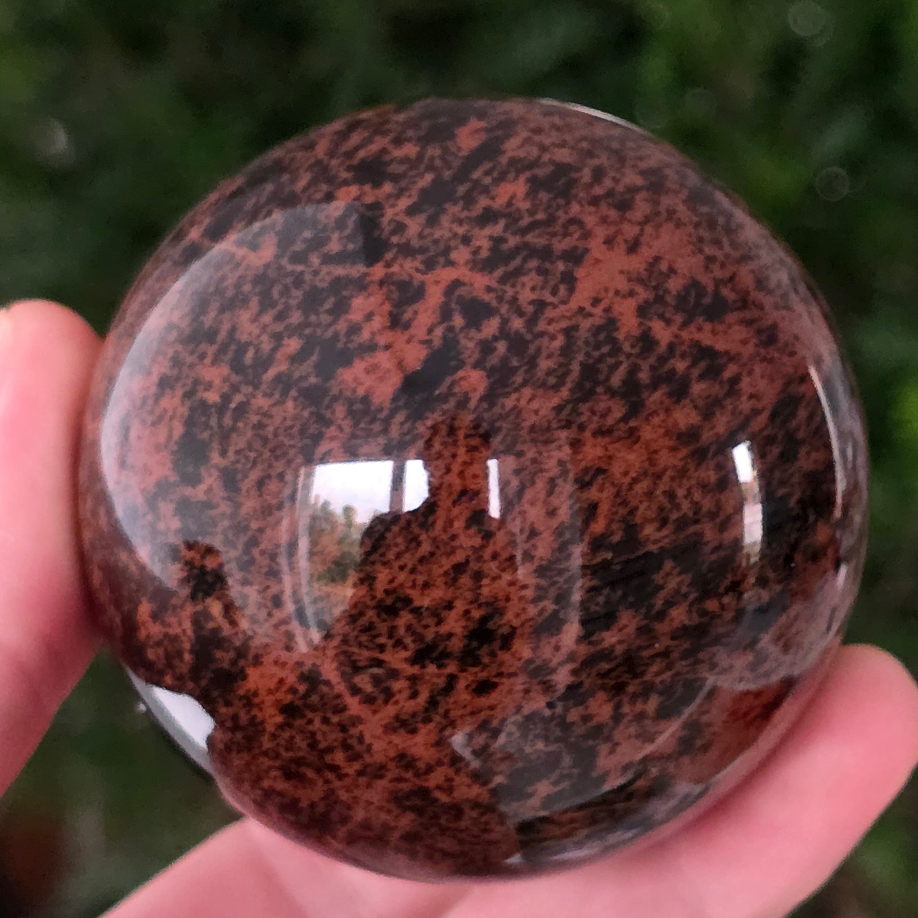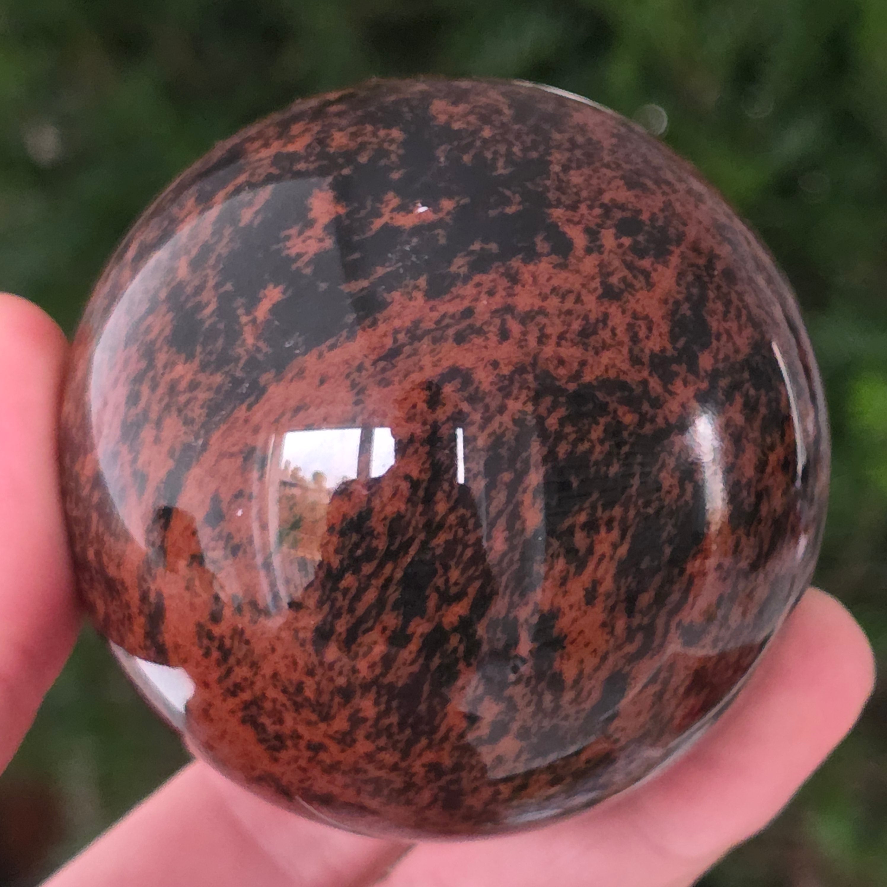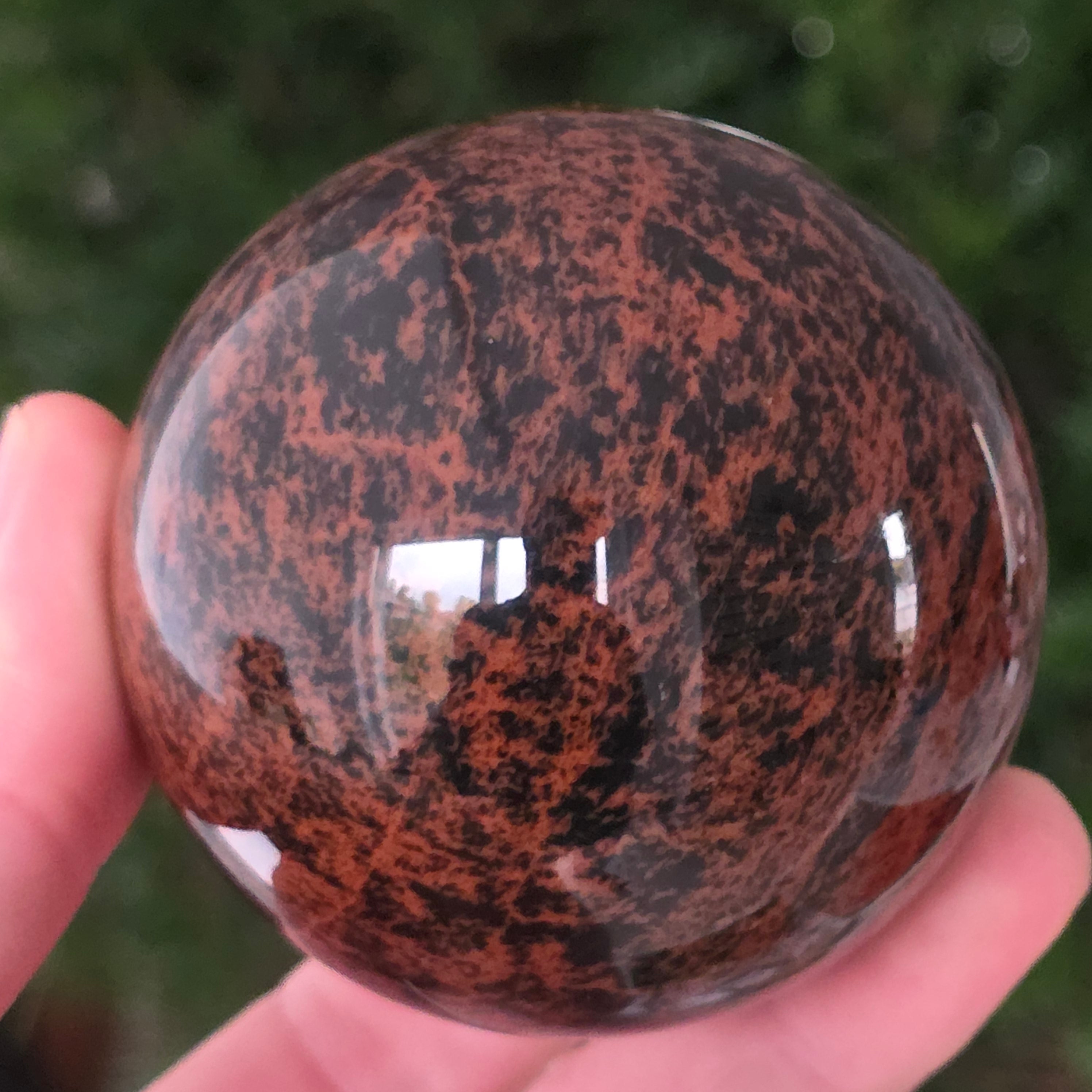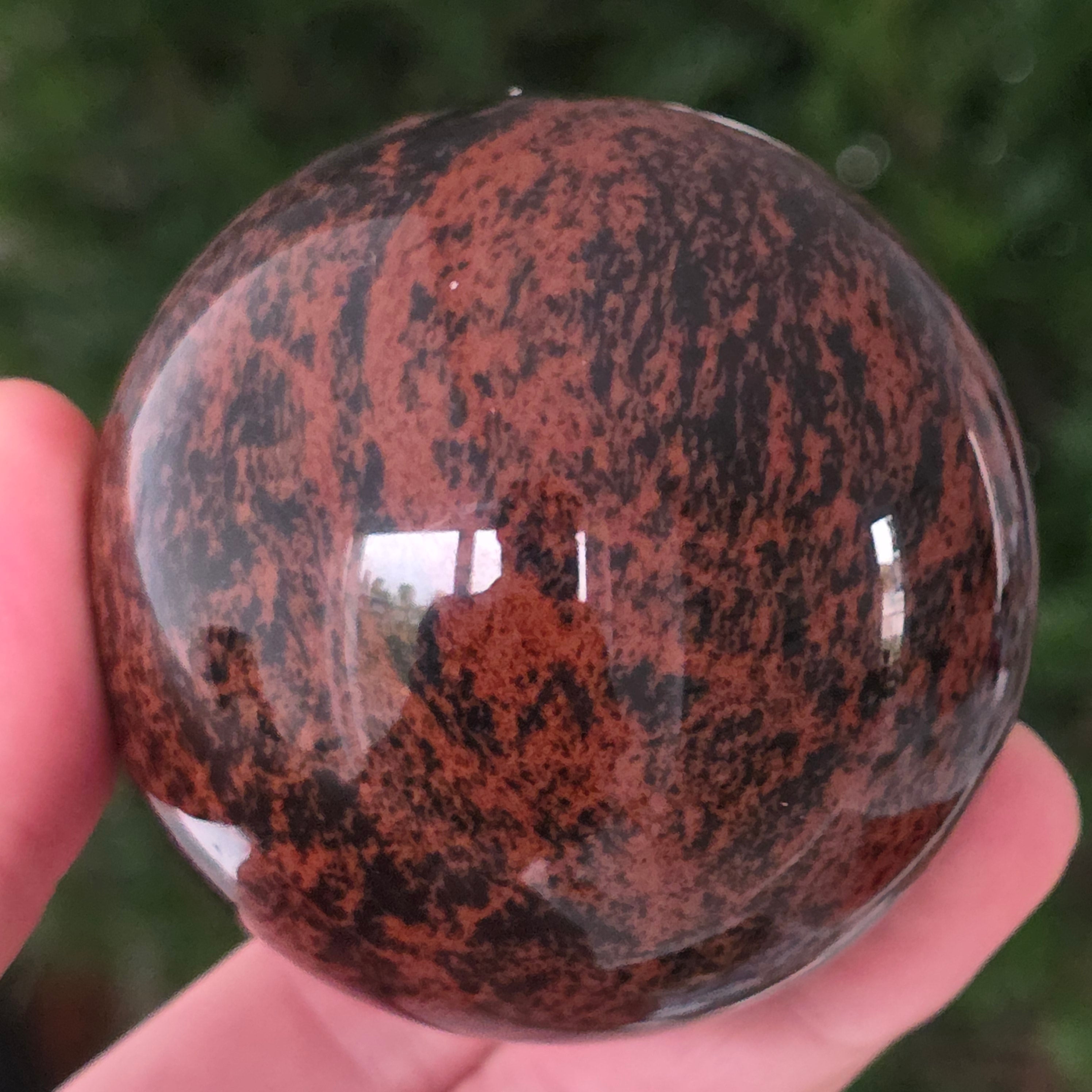 Тази сфера от махагонов обсидиан е въплъщение на първичната сила на Земята — камък на корените, сигурността и вътрешната трансформация.