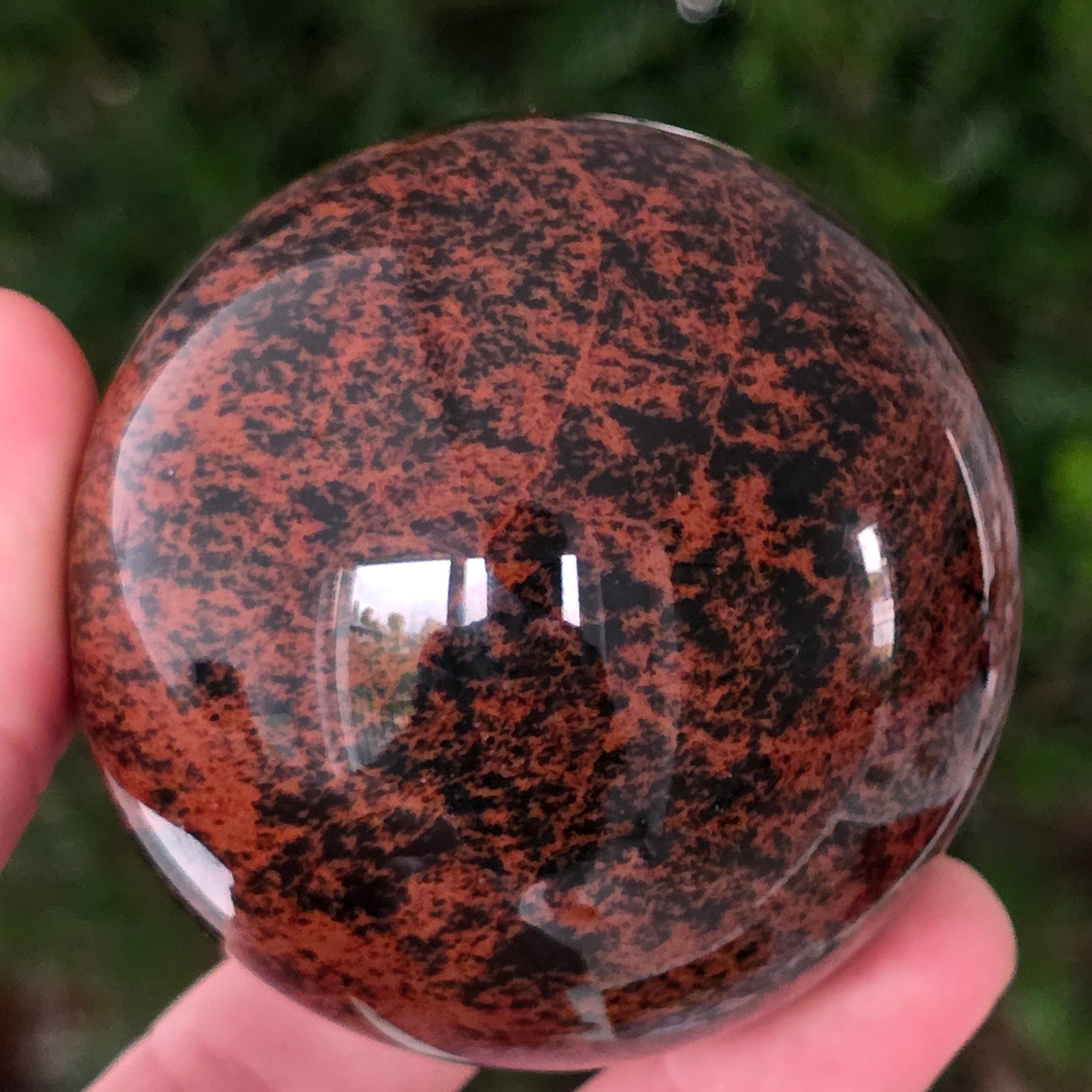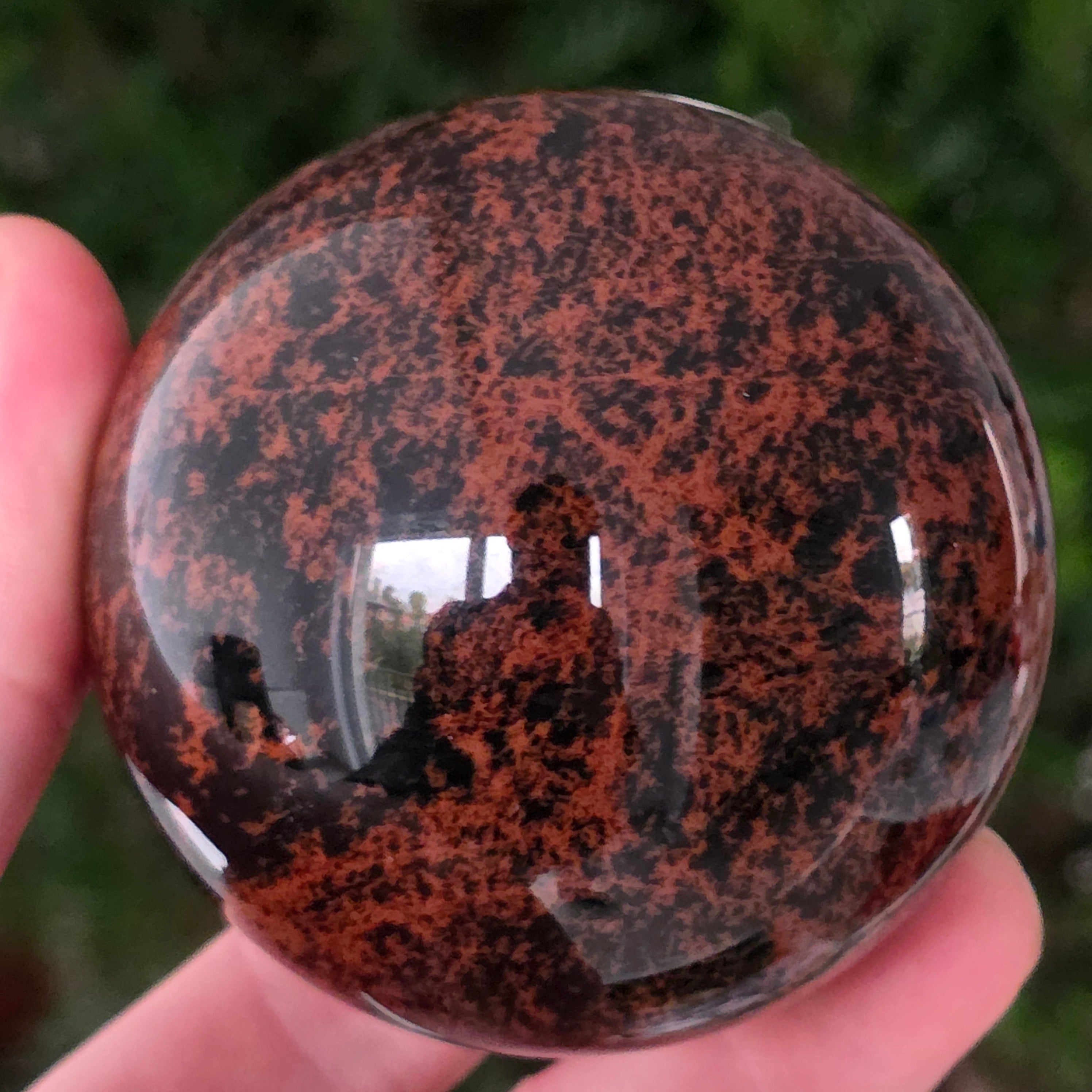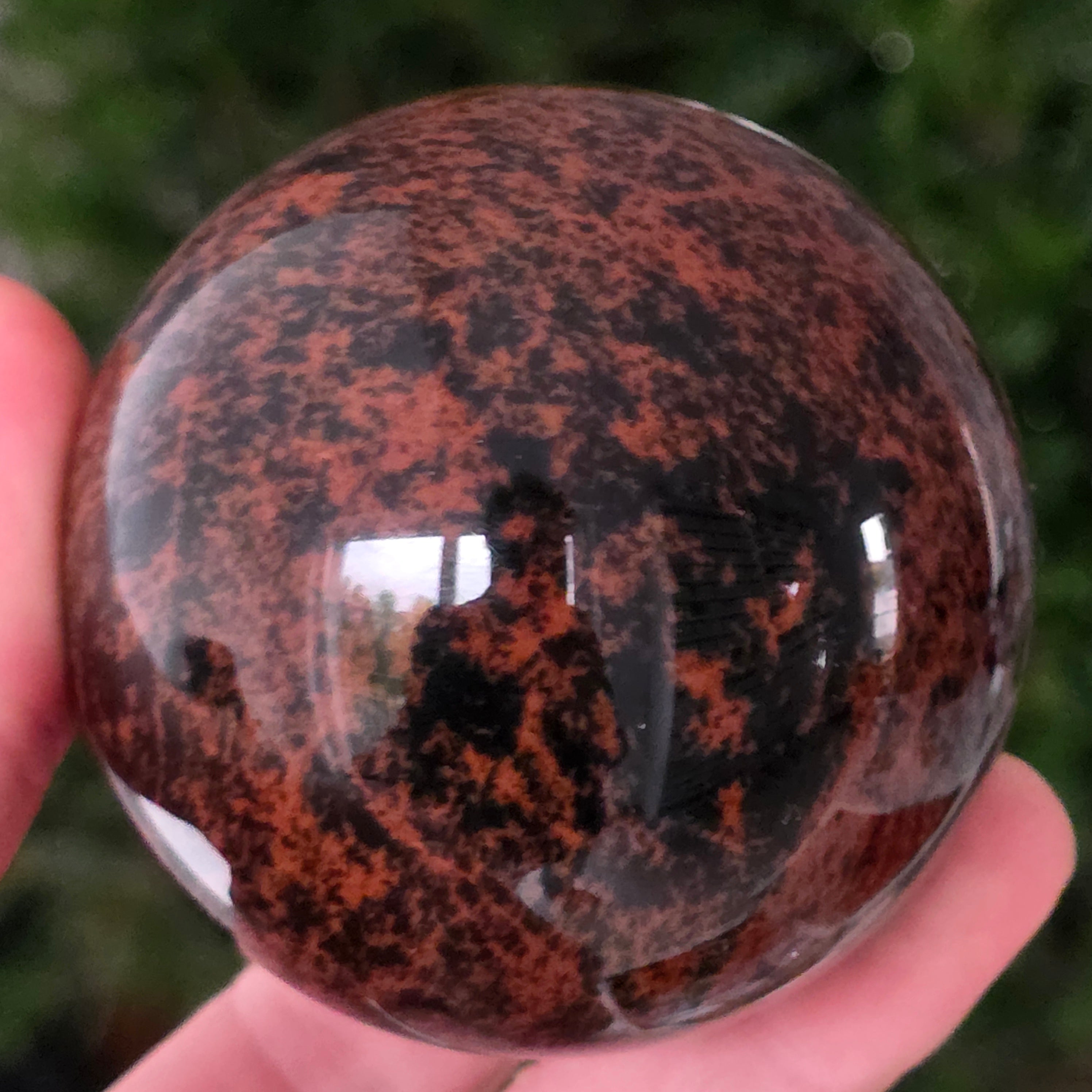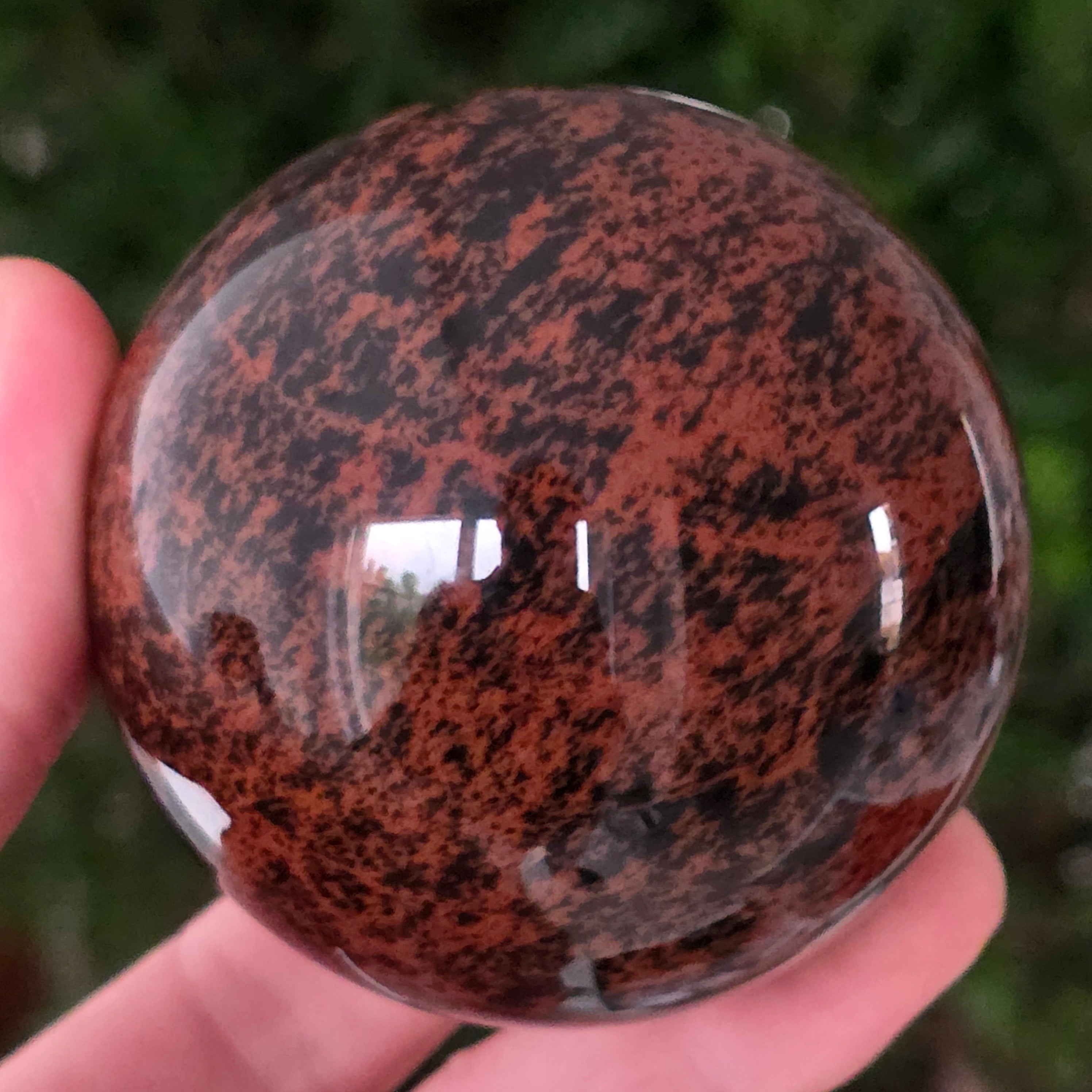 Тази сфера от махагонов обсидиан е въплъщение на първичната сила на Земята — камък на корените, сигурността и вътрешната трансформация.