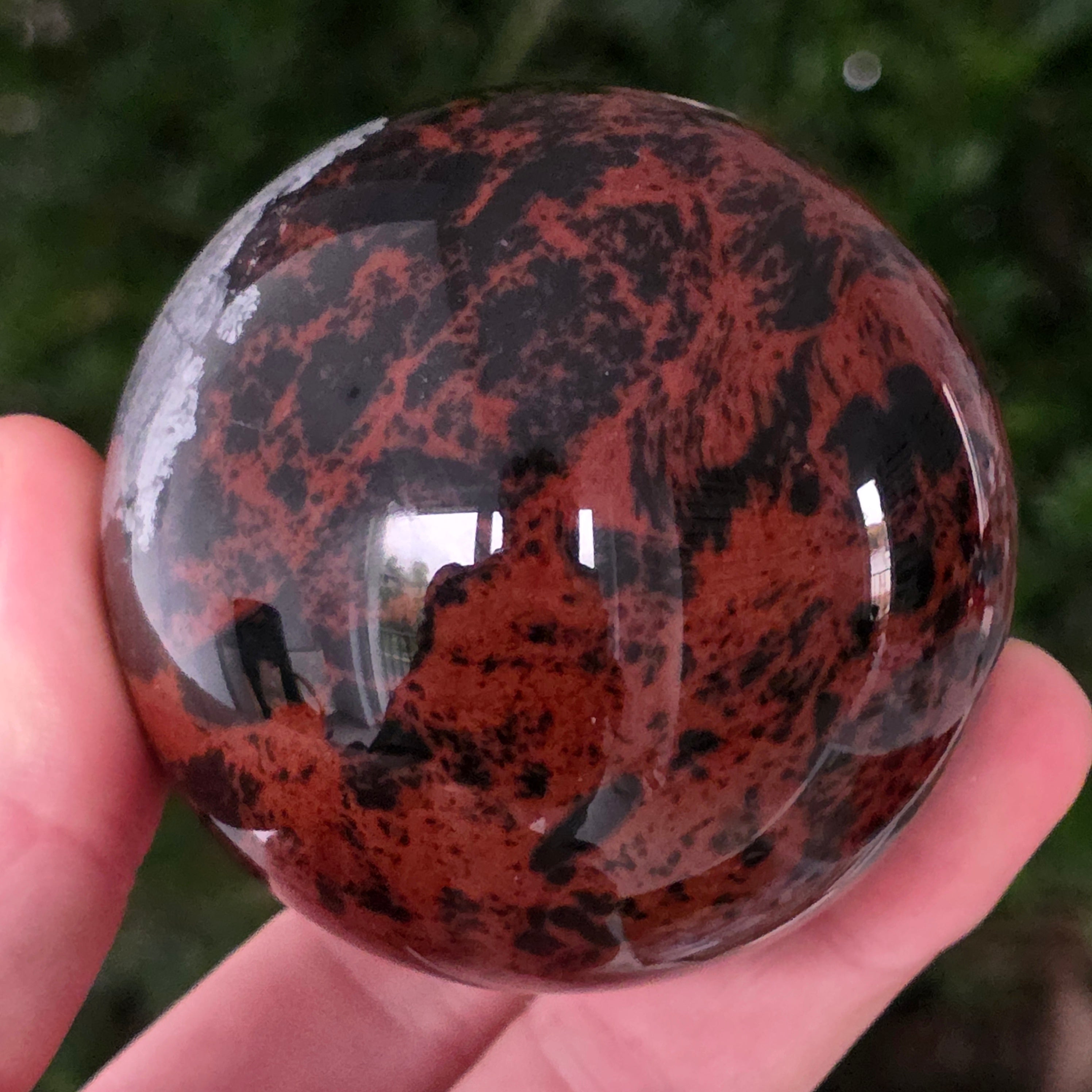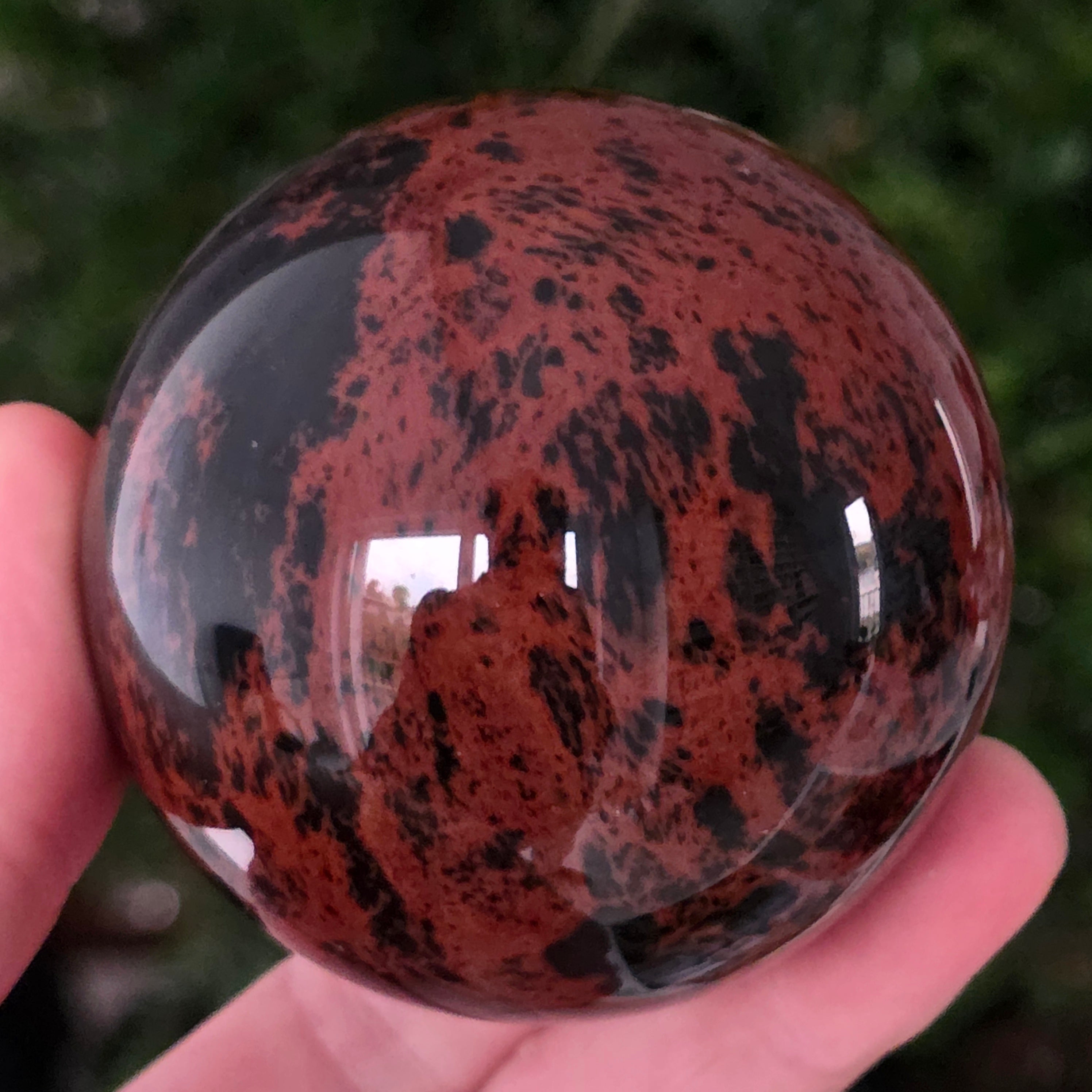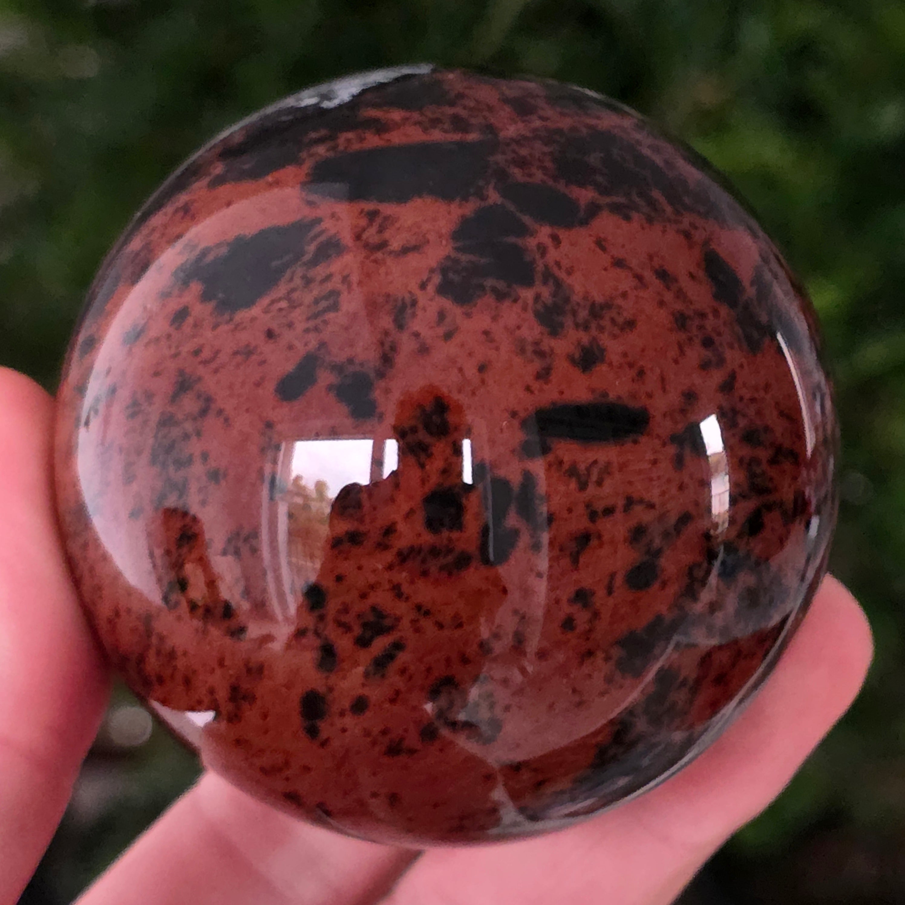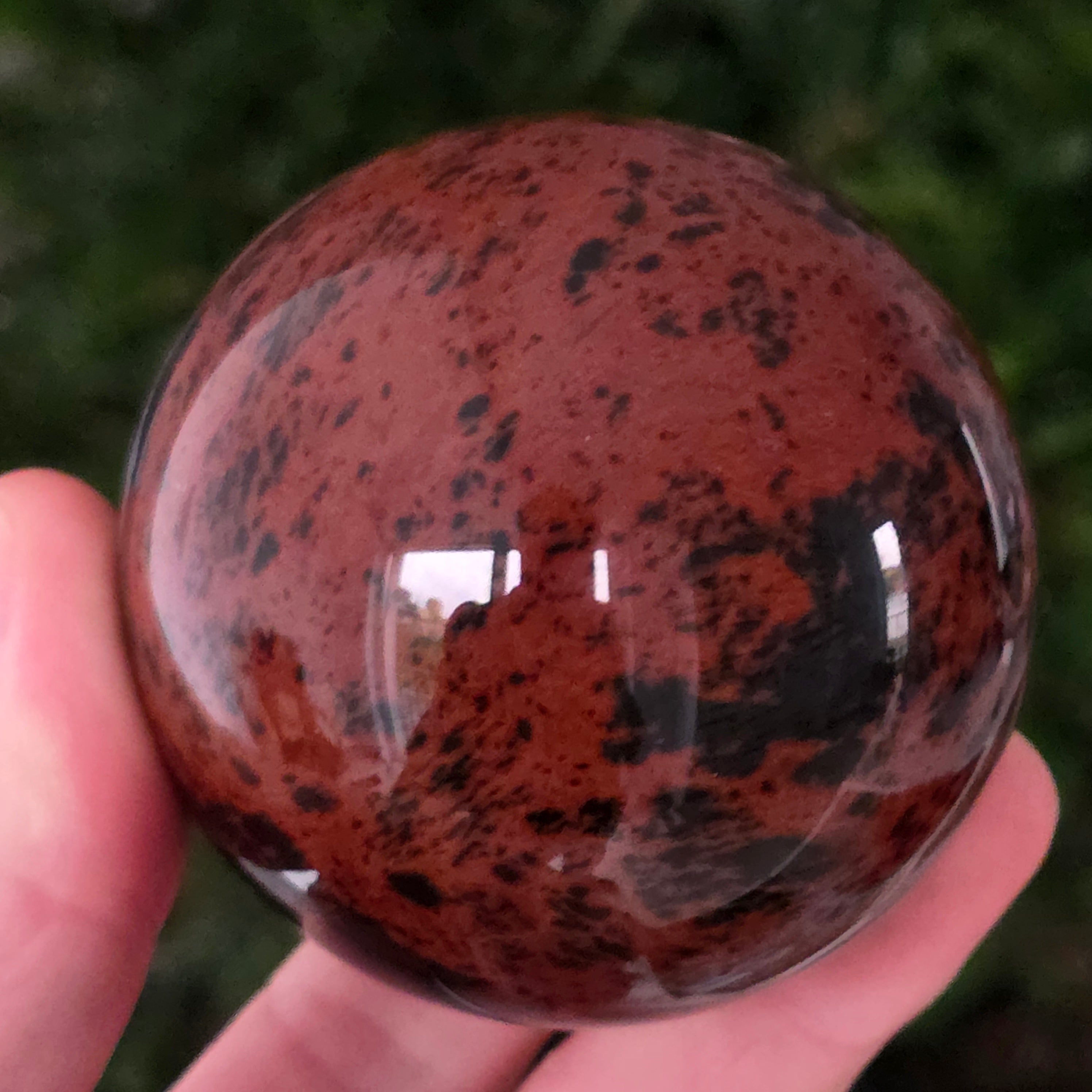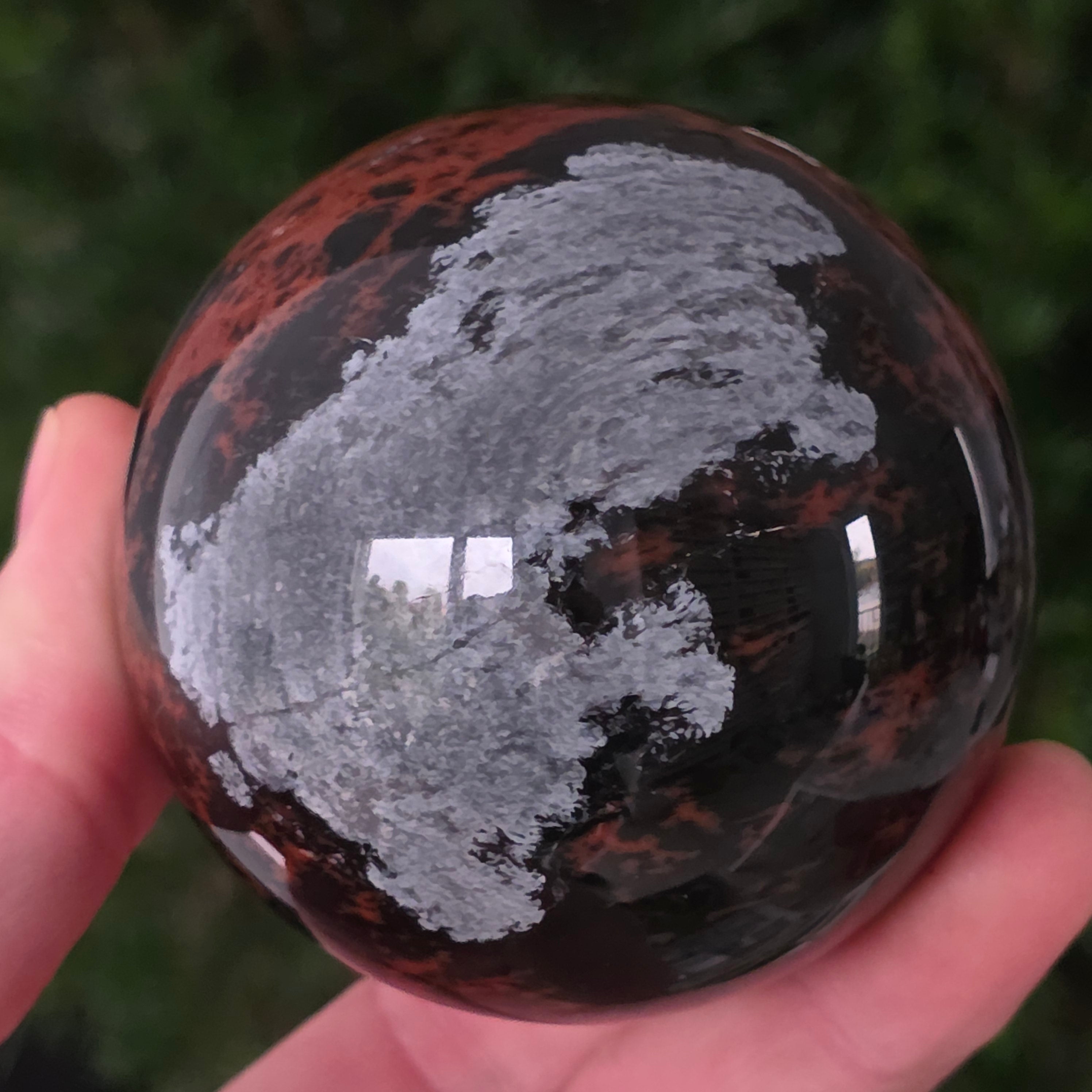 Тази сфера от махагонов обсидиан е въплъщение на първичната сила на Земята — камък на корените, сигурността и вътрешната трансформация.