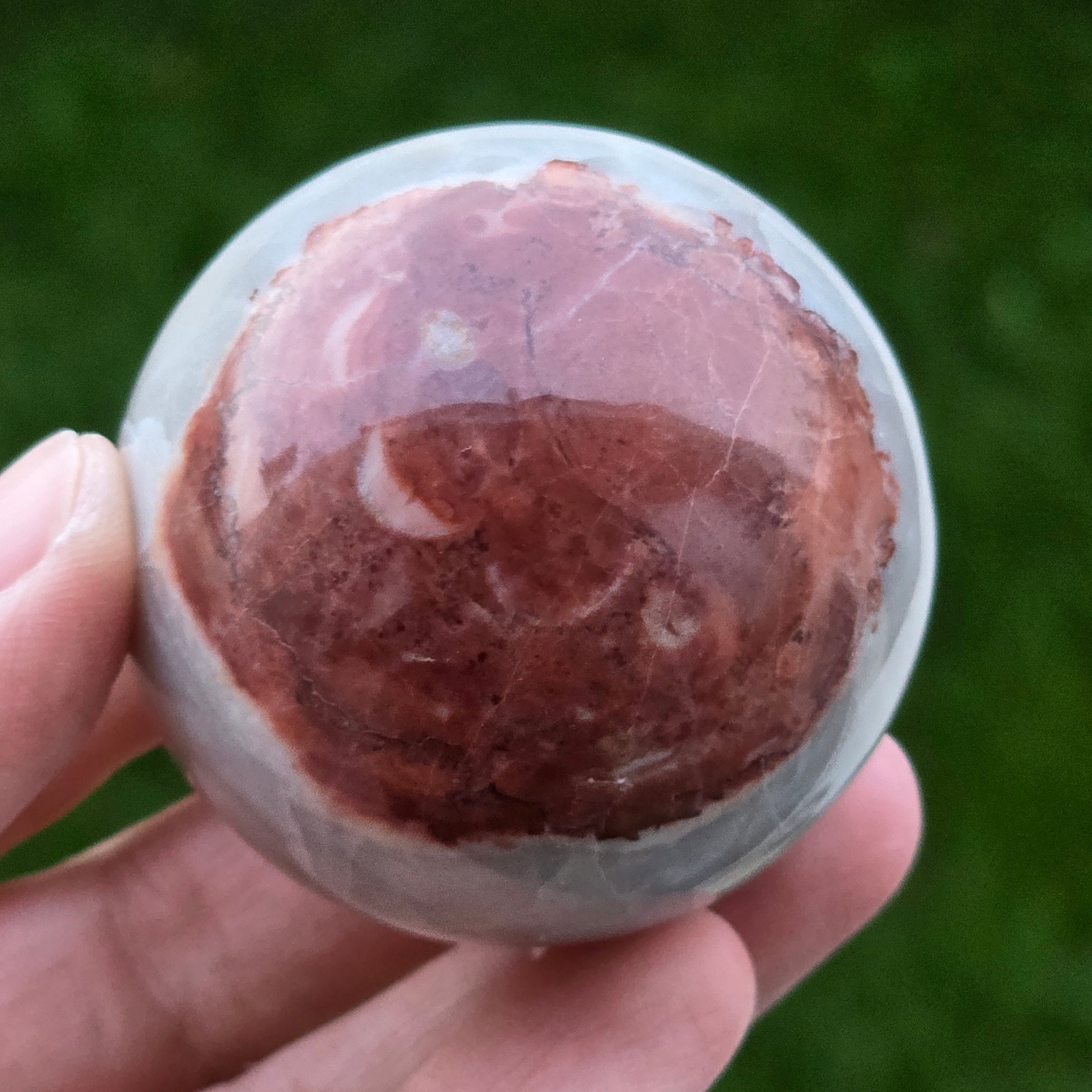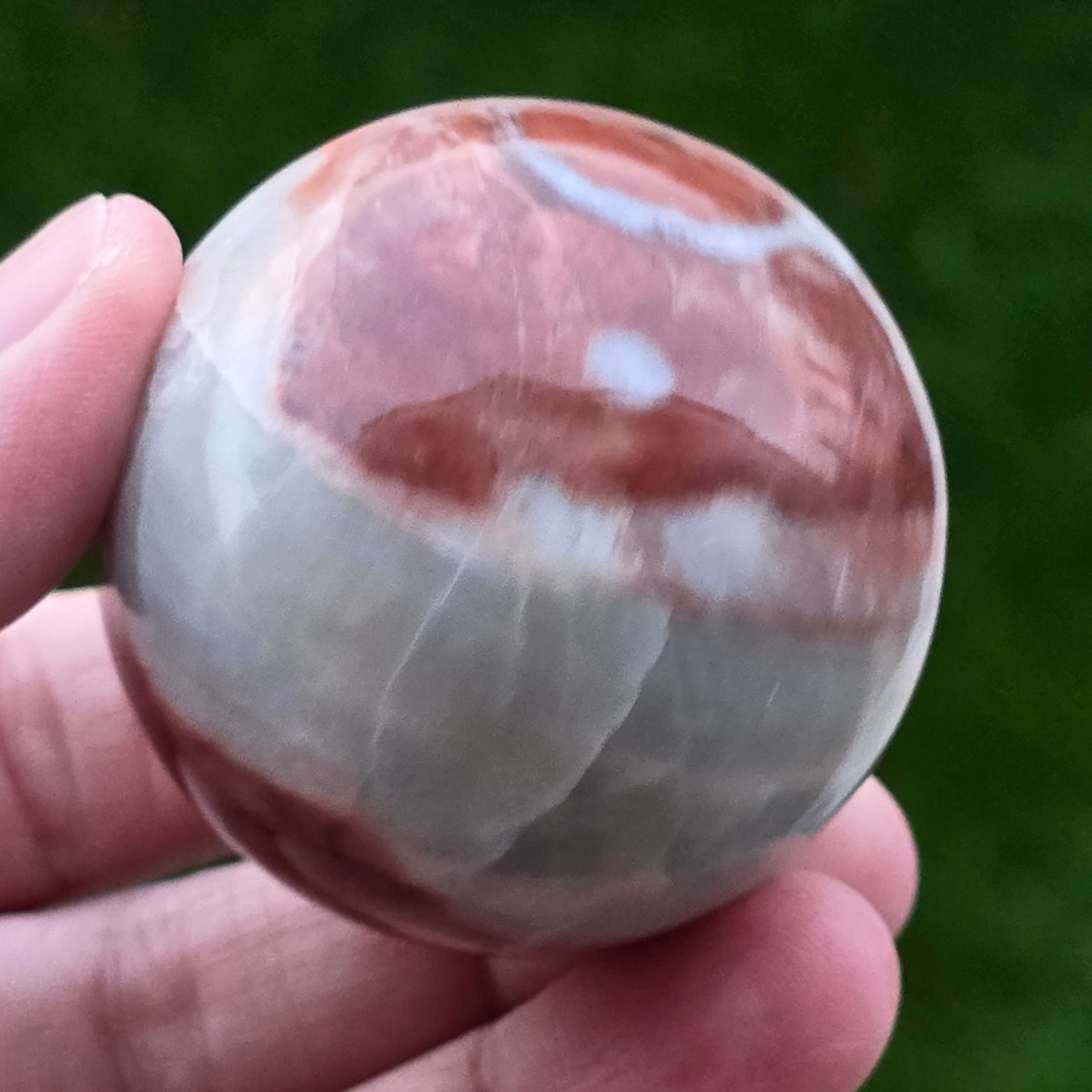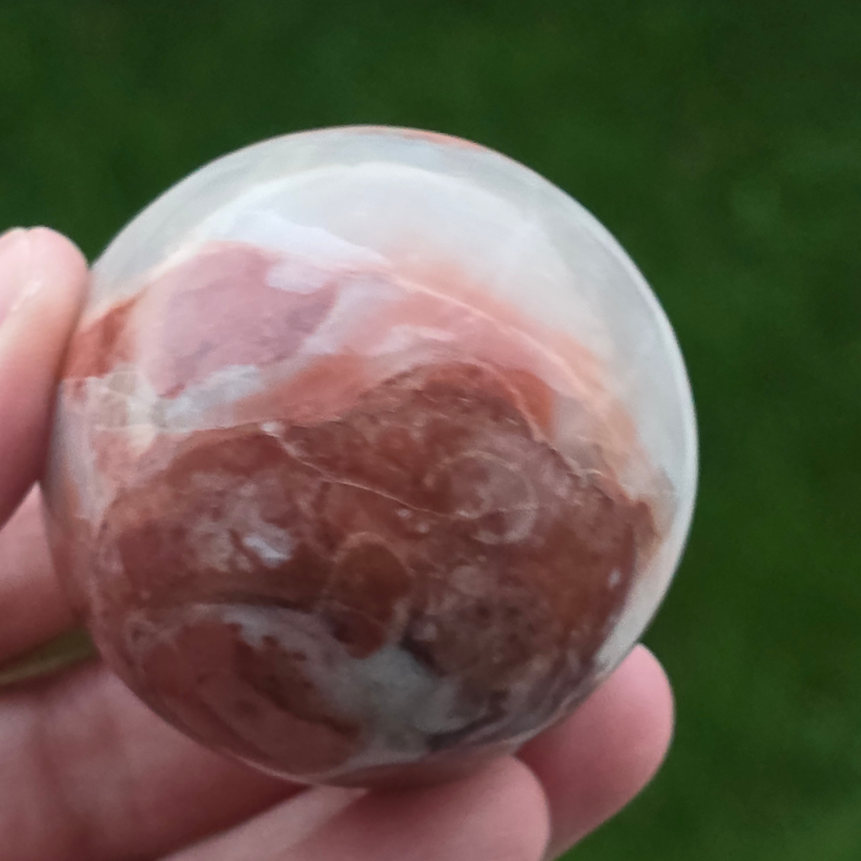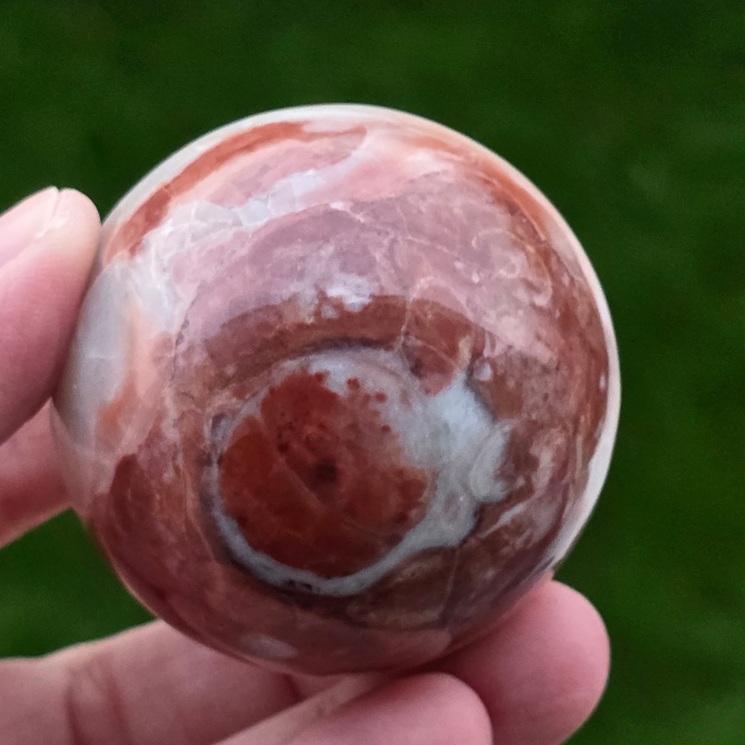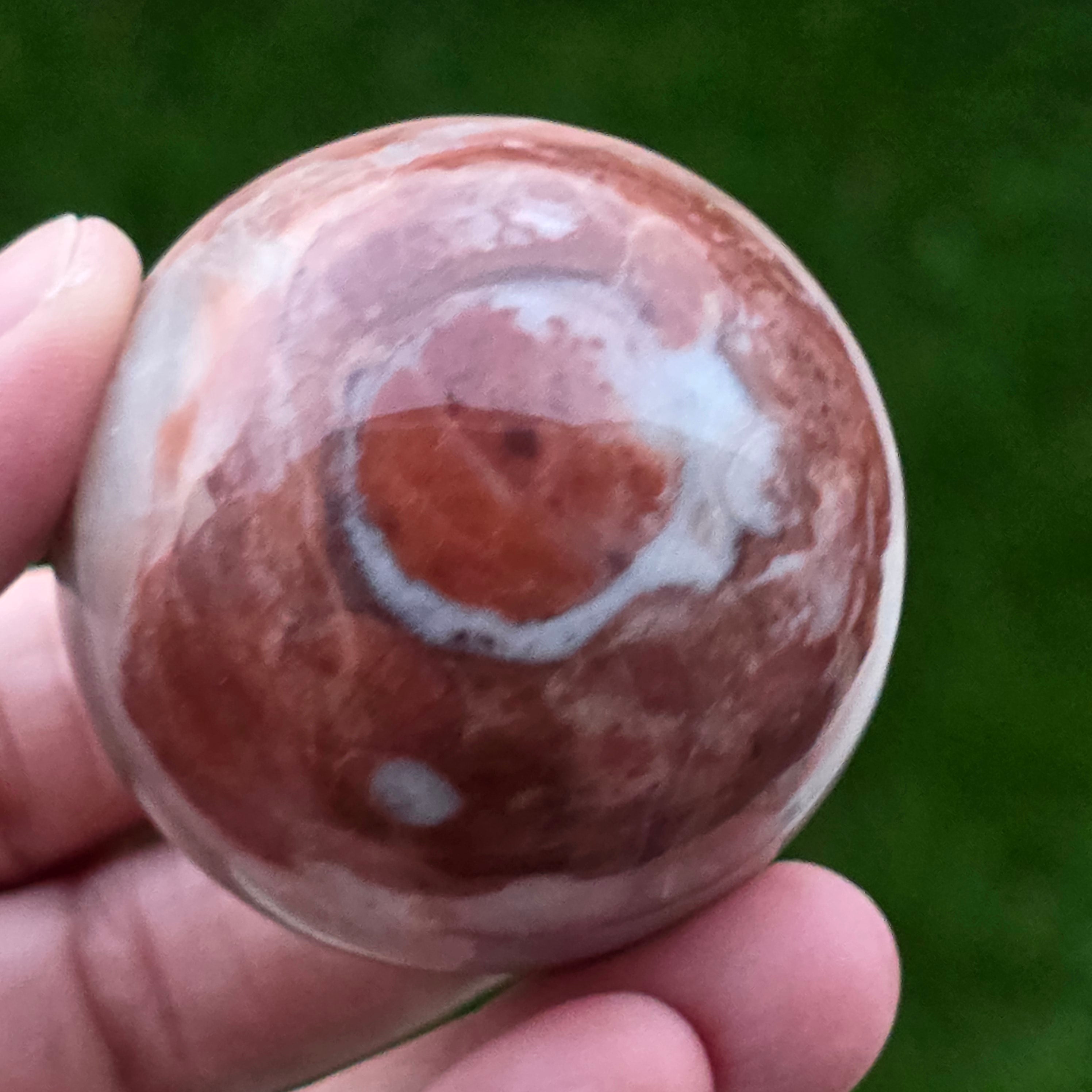 Сферата от ягодов яспис е ярко и изразително парче, изсечено с внимание, за да подчертае топлите оттенъци на ягодово червено, органичните текстури и минералния рисунък, характерен за този вид яспис. Всяко парче е напълно уникално, с естествени модели, които се преплитат в плавни форми, напомняйки за слоевете на скалите и тяхната груба красота.