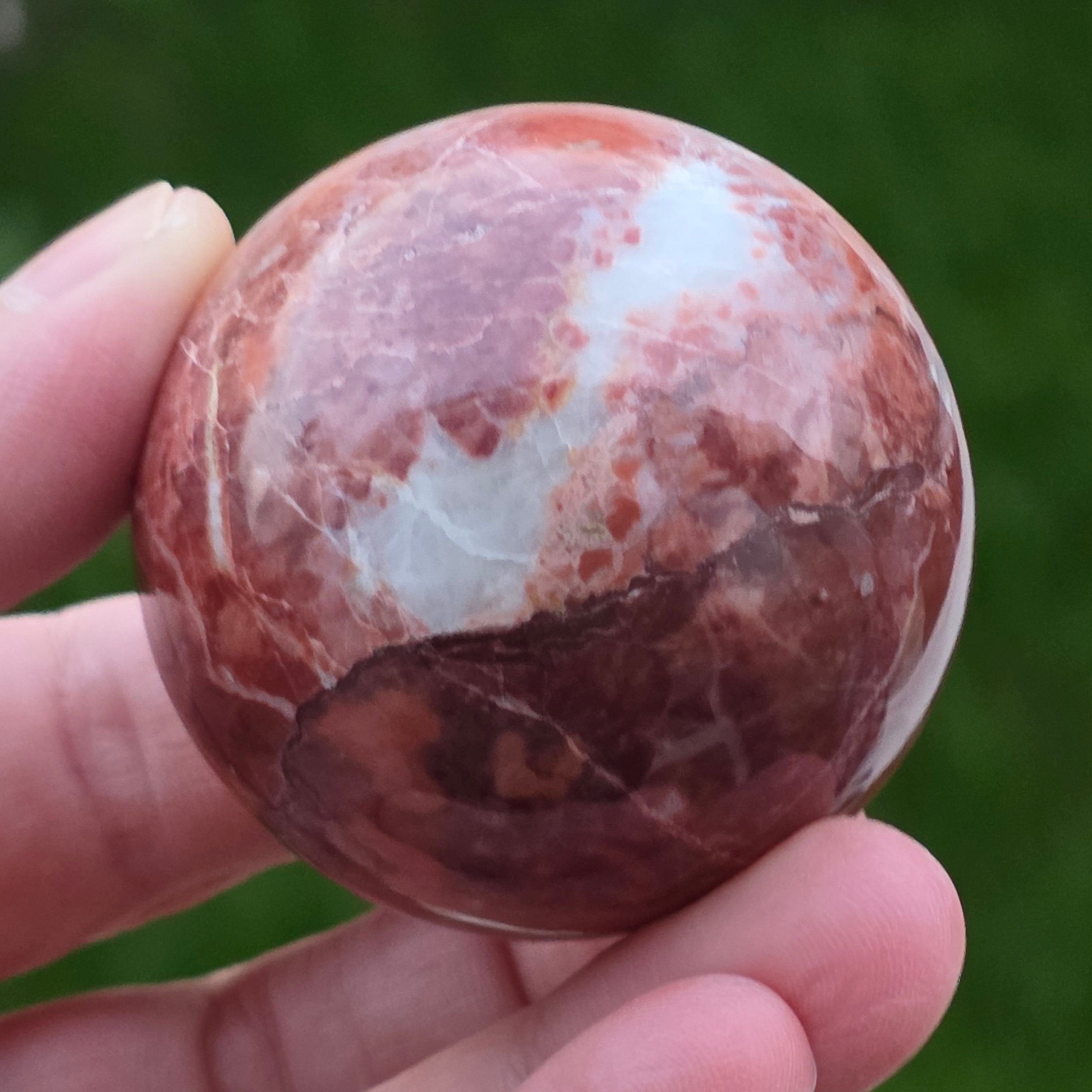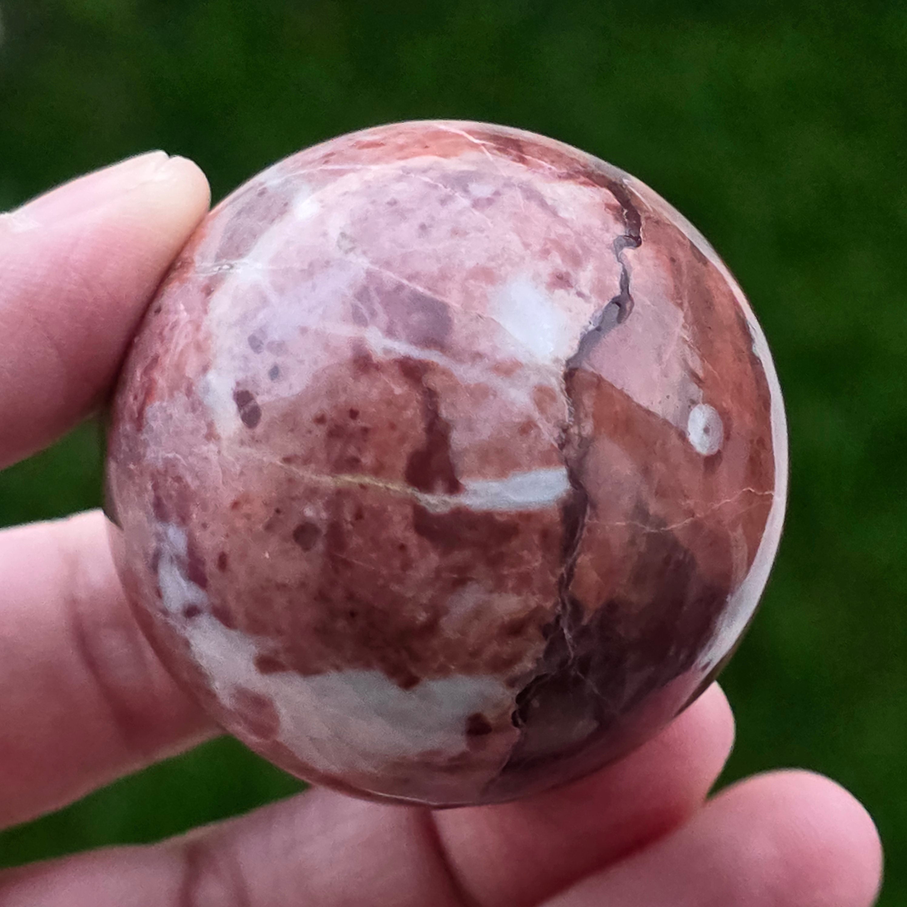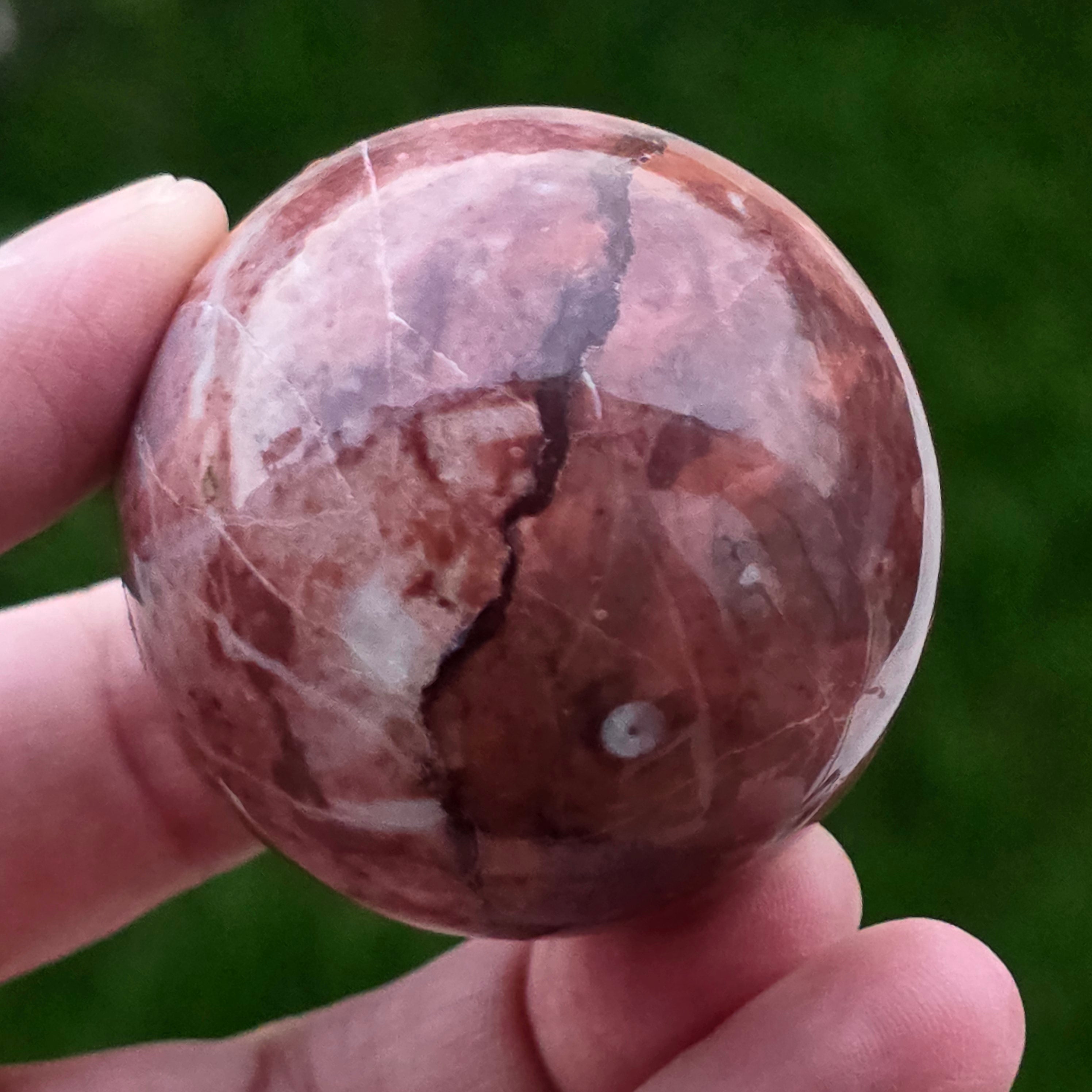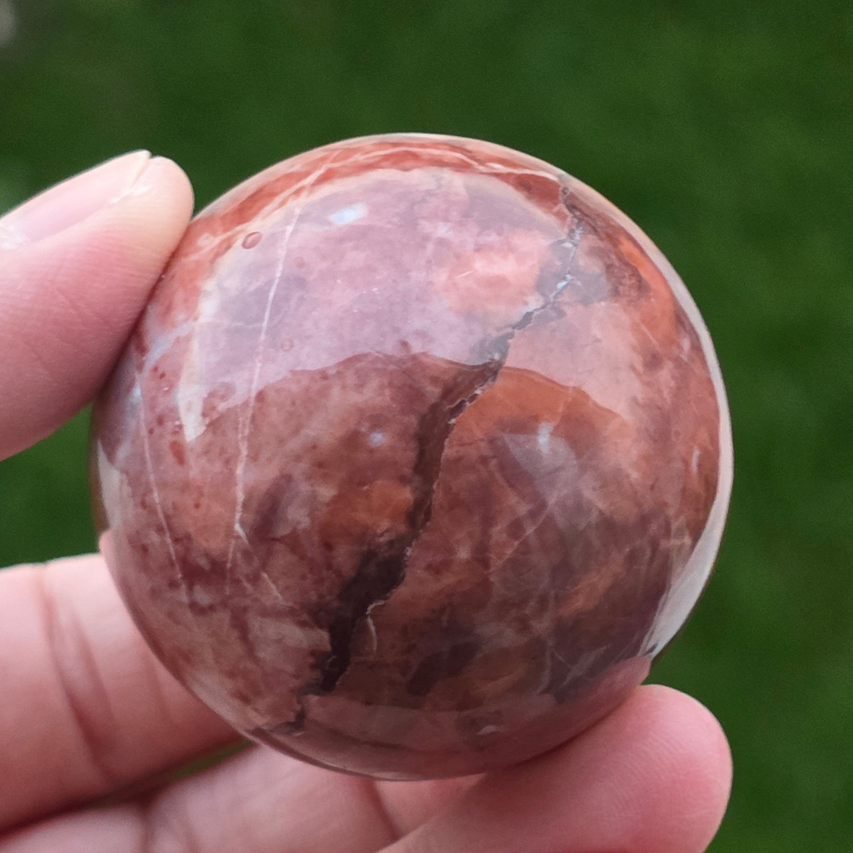 Сферата от ягодов яспис е жизнерадостен и изразителен предмет, внимателно издялан, за да подчертае топлите нюанси на ягодово червено, органичните текстури и минералния рисунък, характерен за този вид яспис. Всяка част е напълно уникална, с естествени модели, които се преплитат във флуидни форми, напомнящи за слоестата структура на скалите и тяхната груба красота.