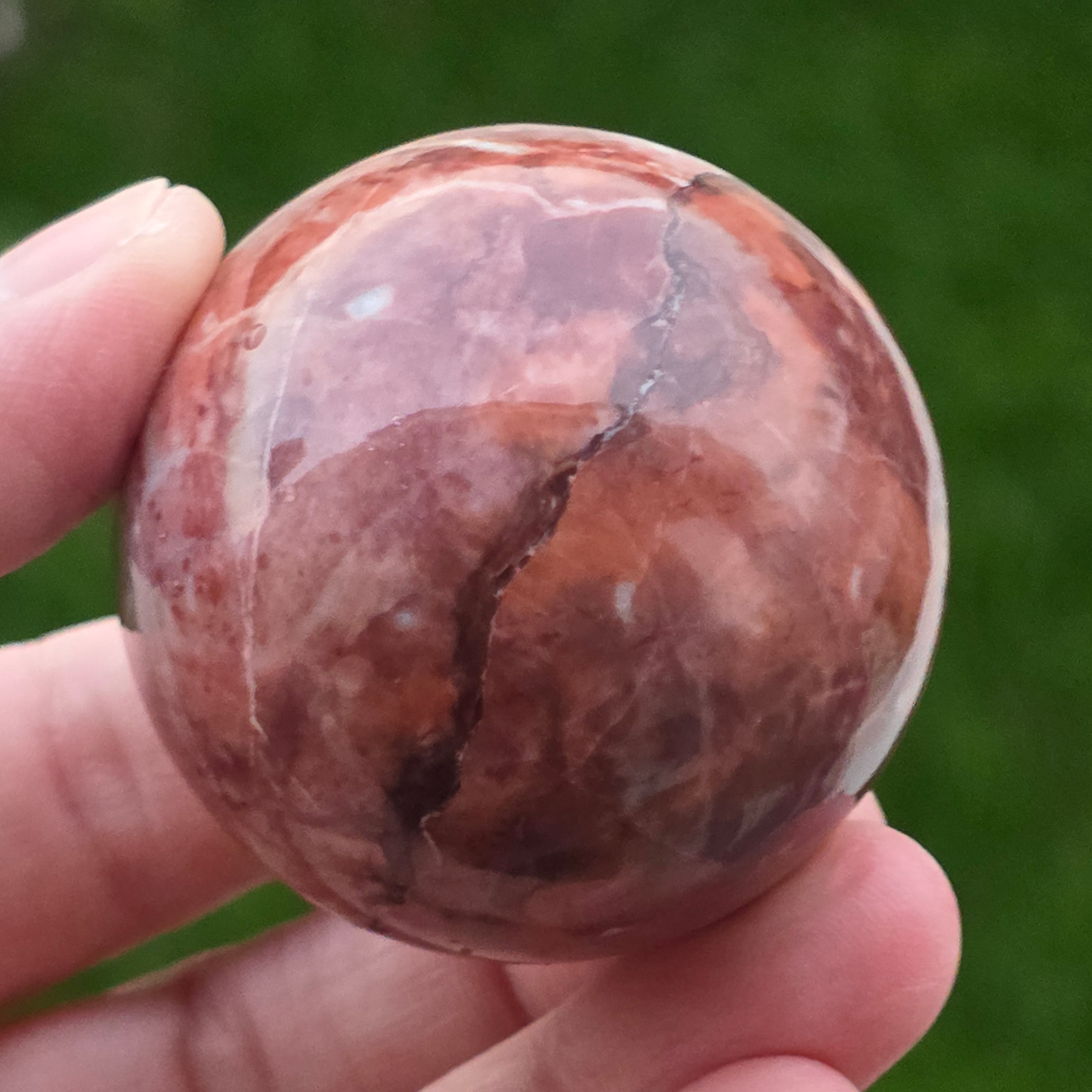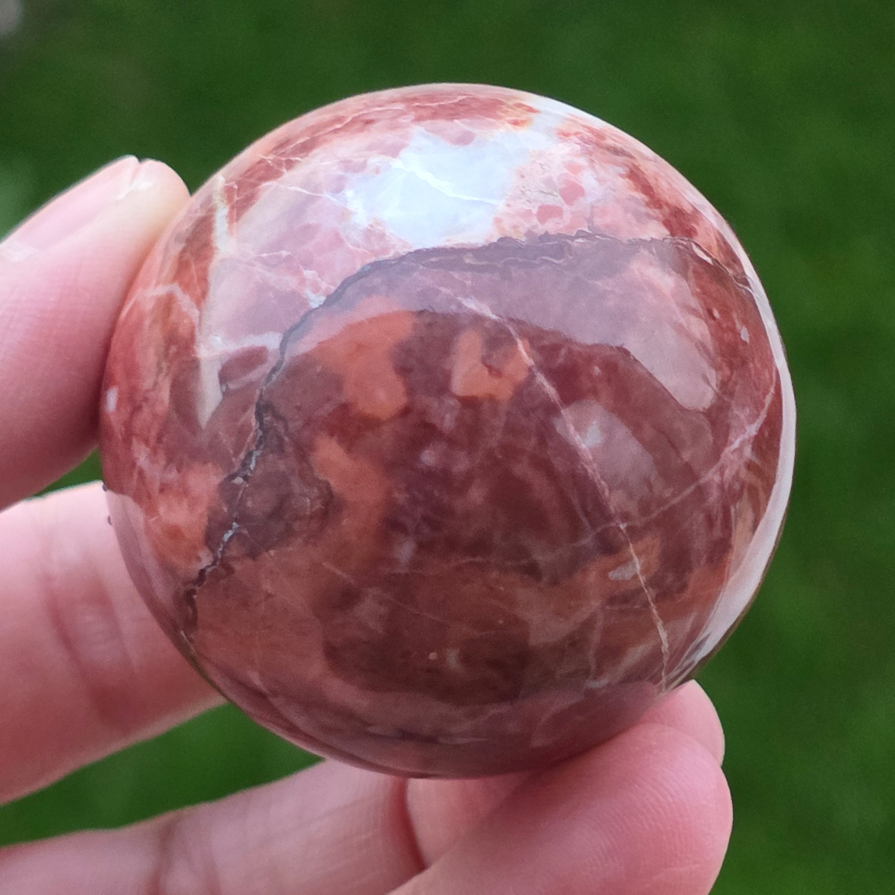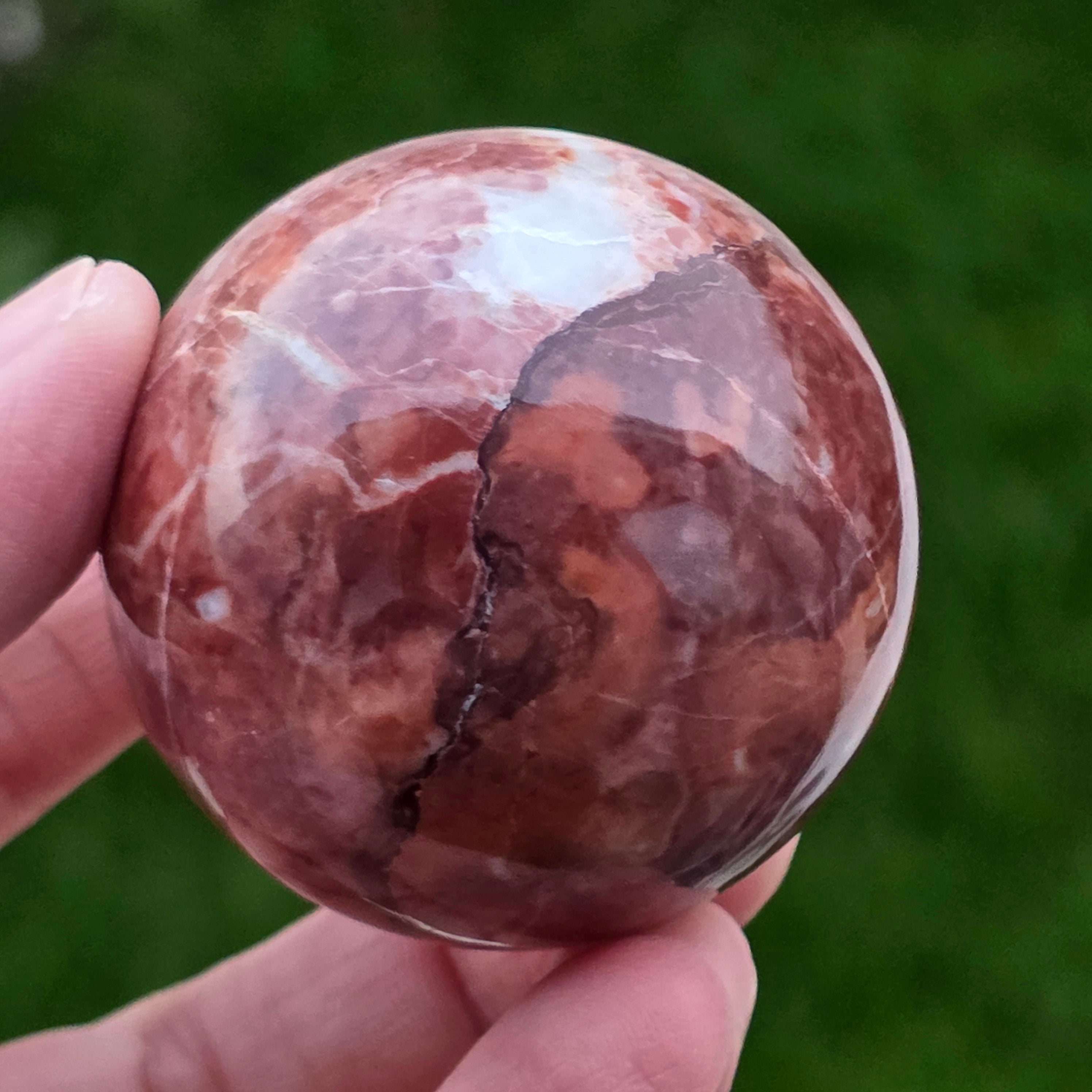 Сферата от ягодов яспис е жизнерадостен и изразителен предмет, внимателно издялан, за да подчертае топлите нюанси на ягодово червено, органичните текстури и минералния рисунък, характерен за този вид яспис. Всяка част е напълно уникална, с естествени модели, които се преплитат във флуидни форми, напомнящи за слоестата структура на скалите и тяхната груба красота.