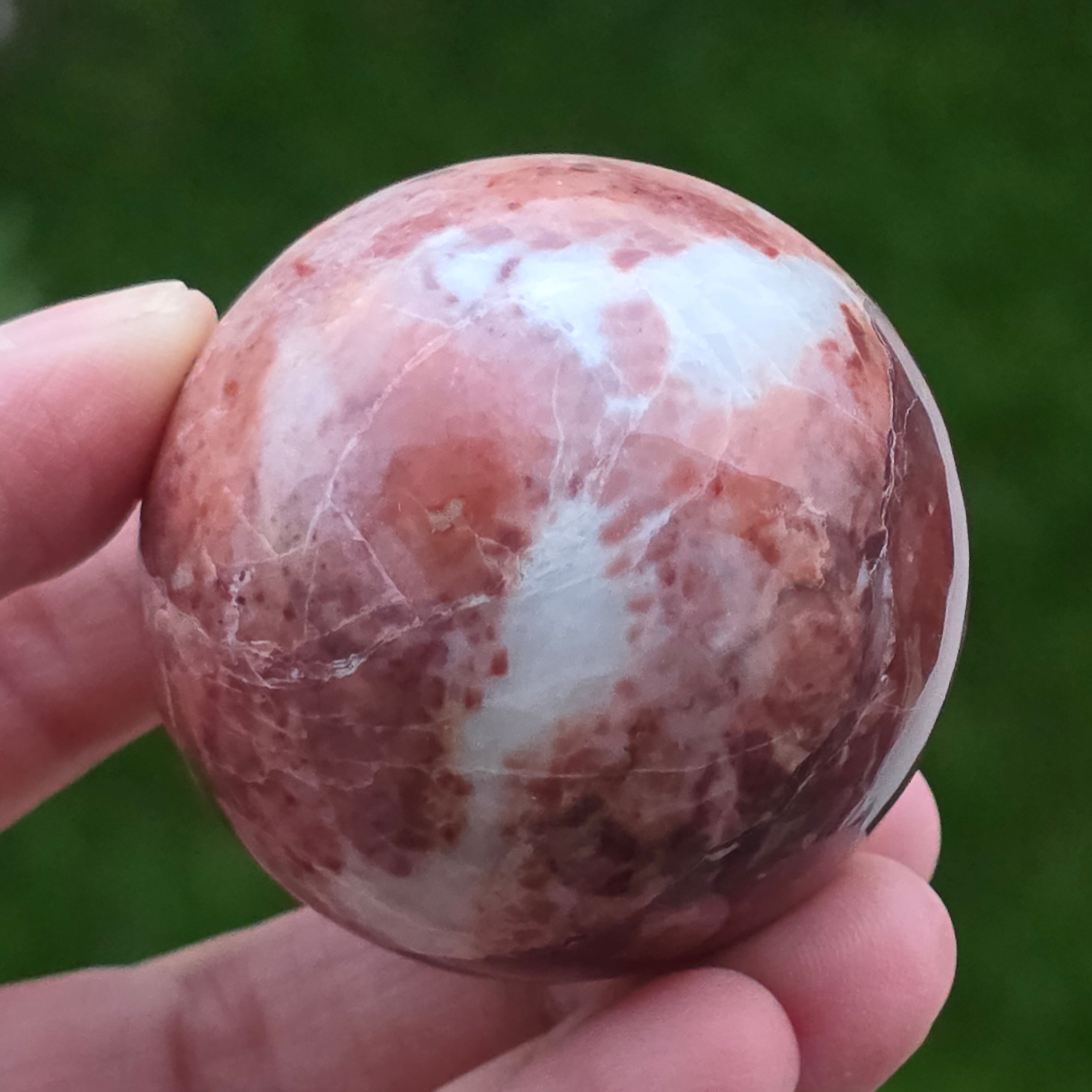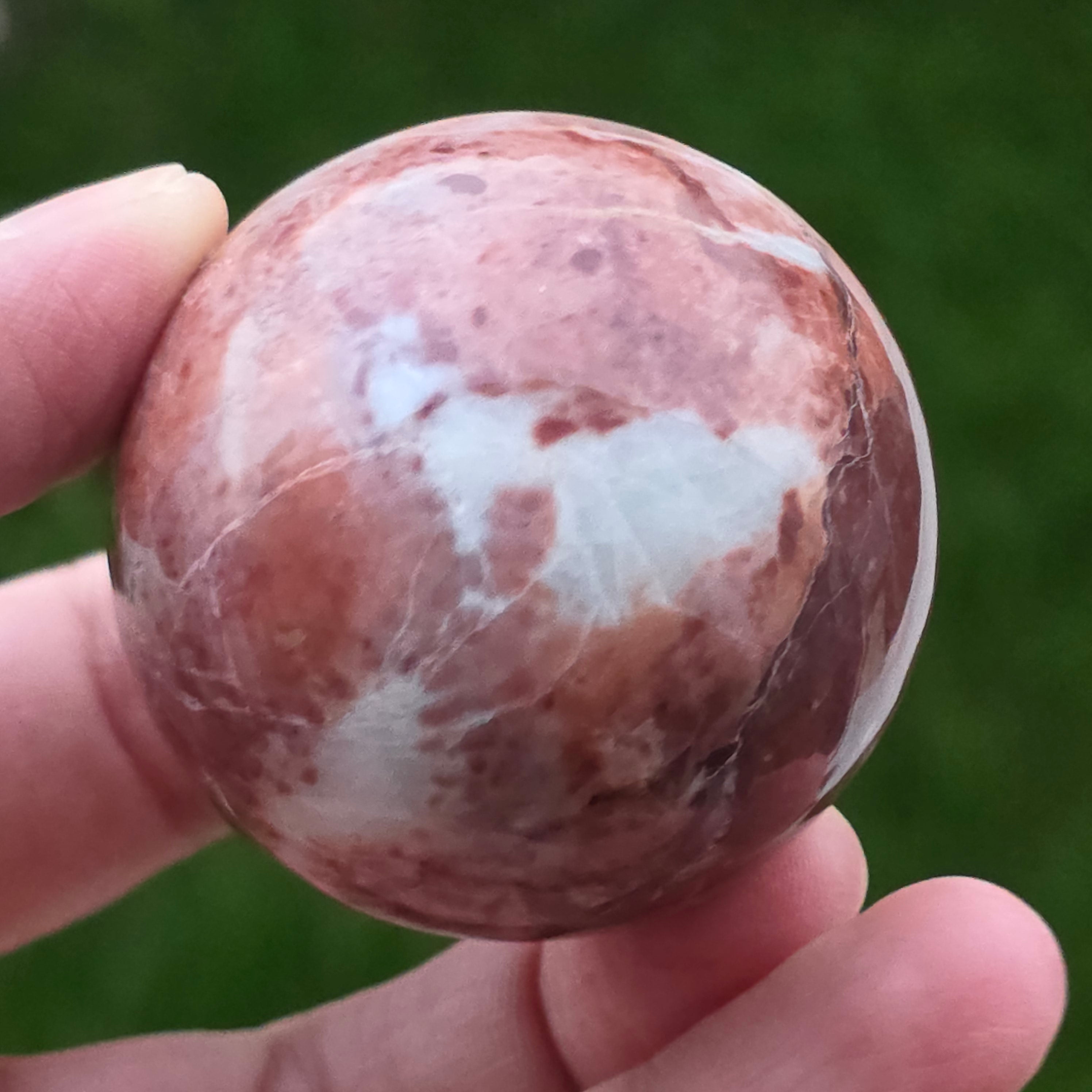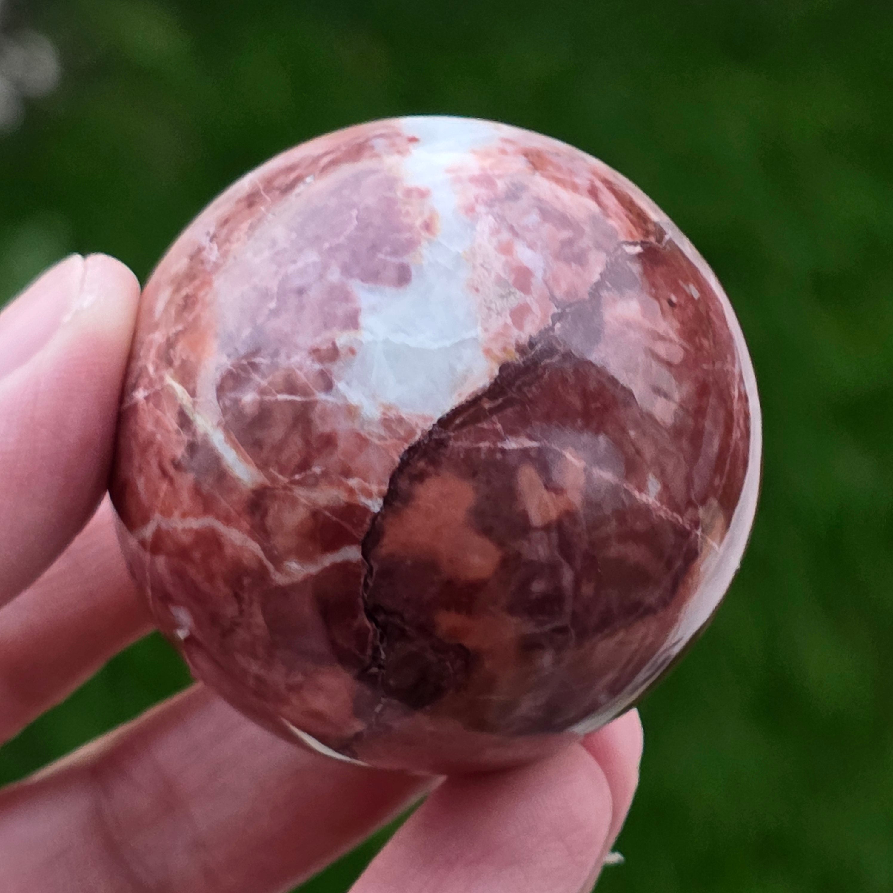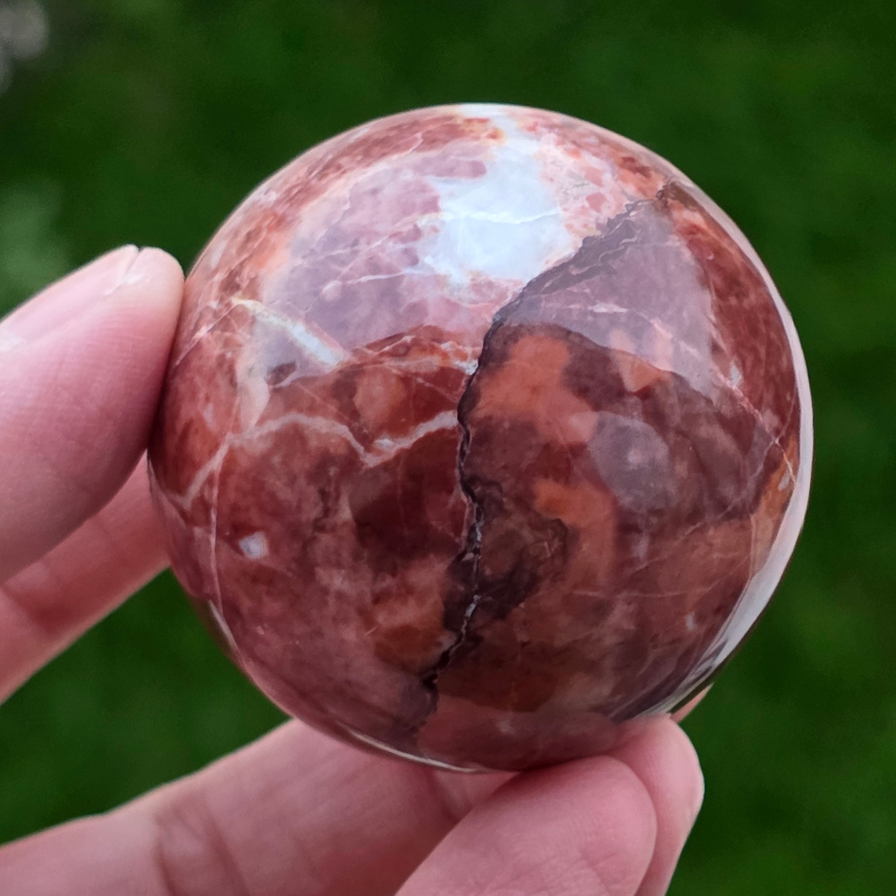 Сферата от ягодов яспис е жизнерадостен и изразителен предмет, внимателно издялан, за да подчертае топлите нюанси на ягодово червено, органичните текстури и минералния рисунък, характерен за този вид яспис. Всяка част е напълно уникална, с естествени модели, които се преплитат във флуидни форми, напомнящи за слоестата структура на скалите и тяхната груба красота.
