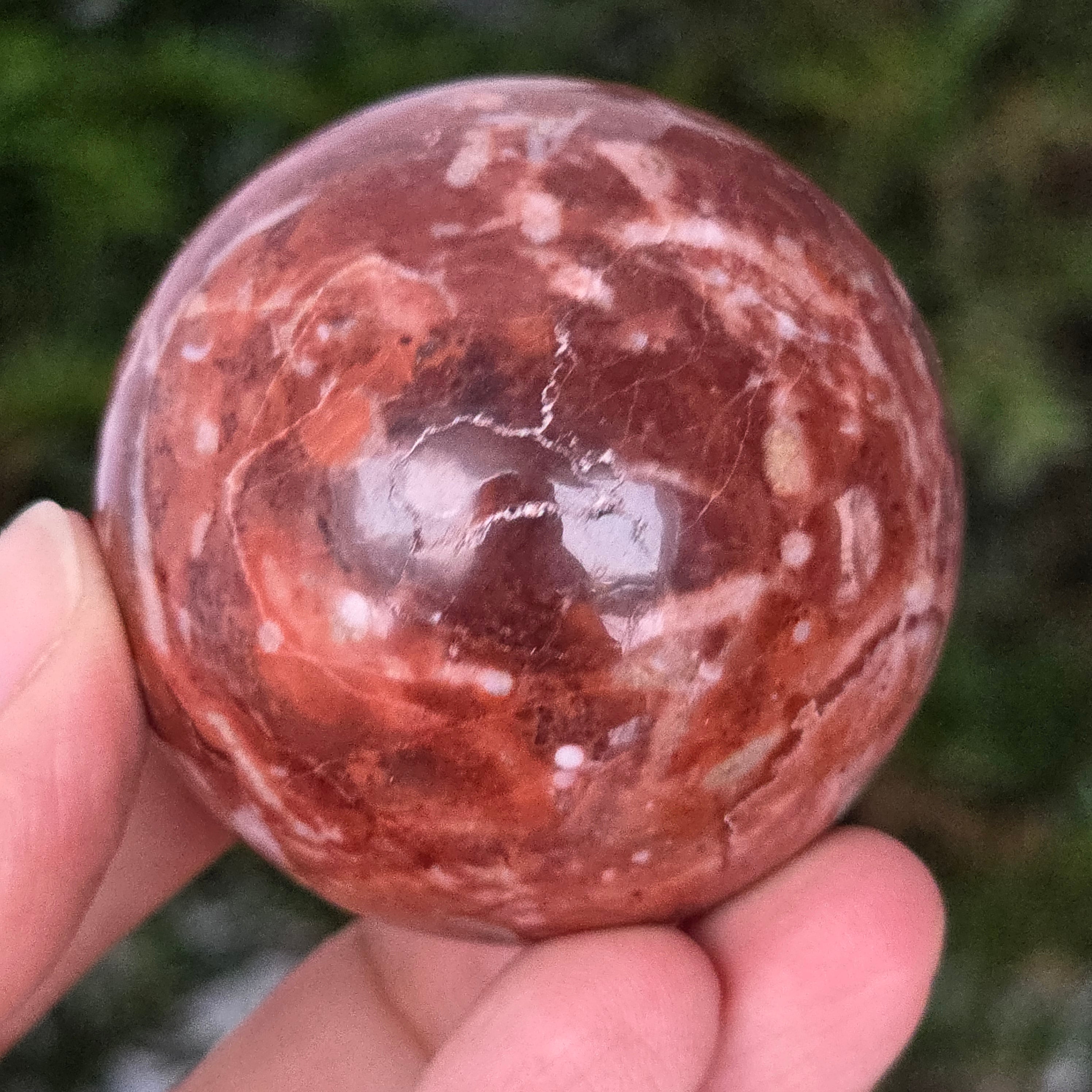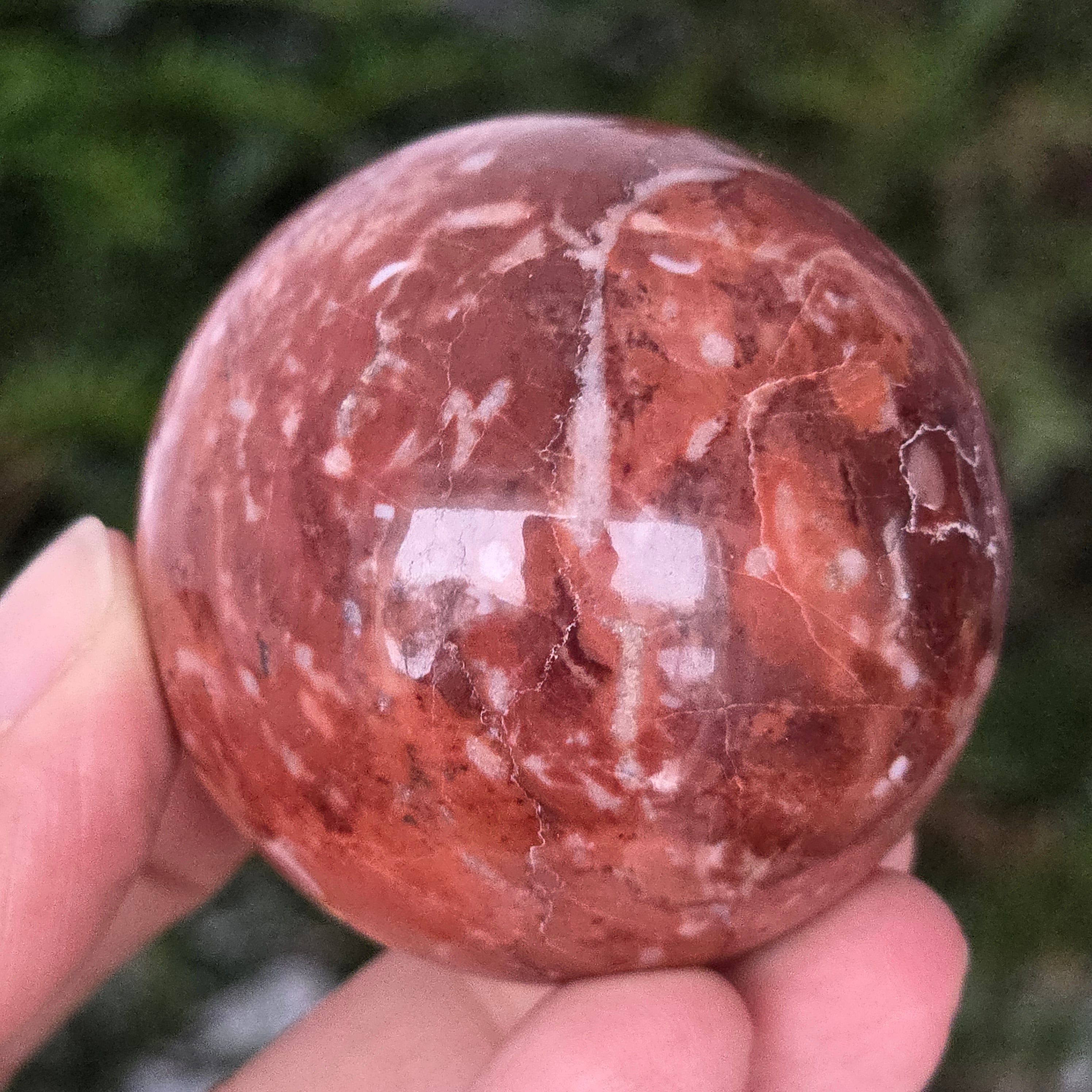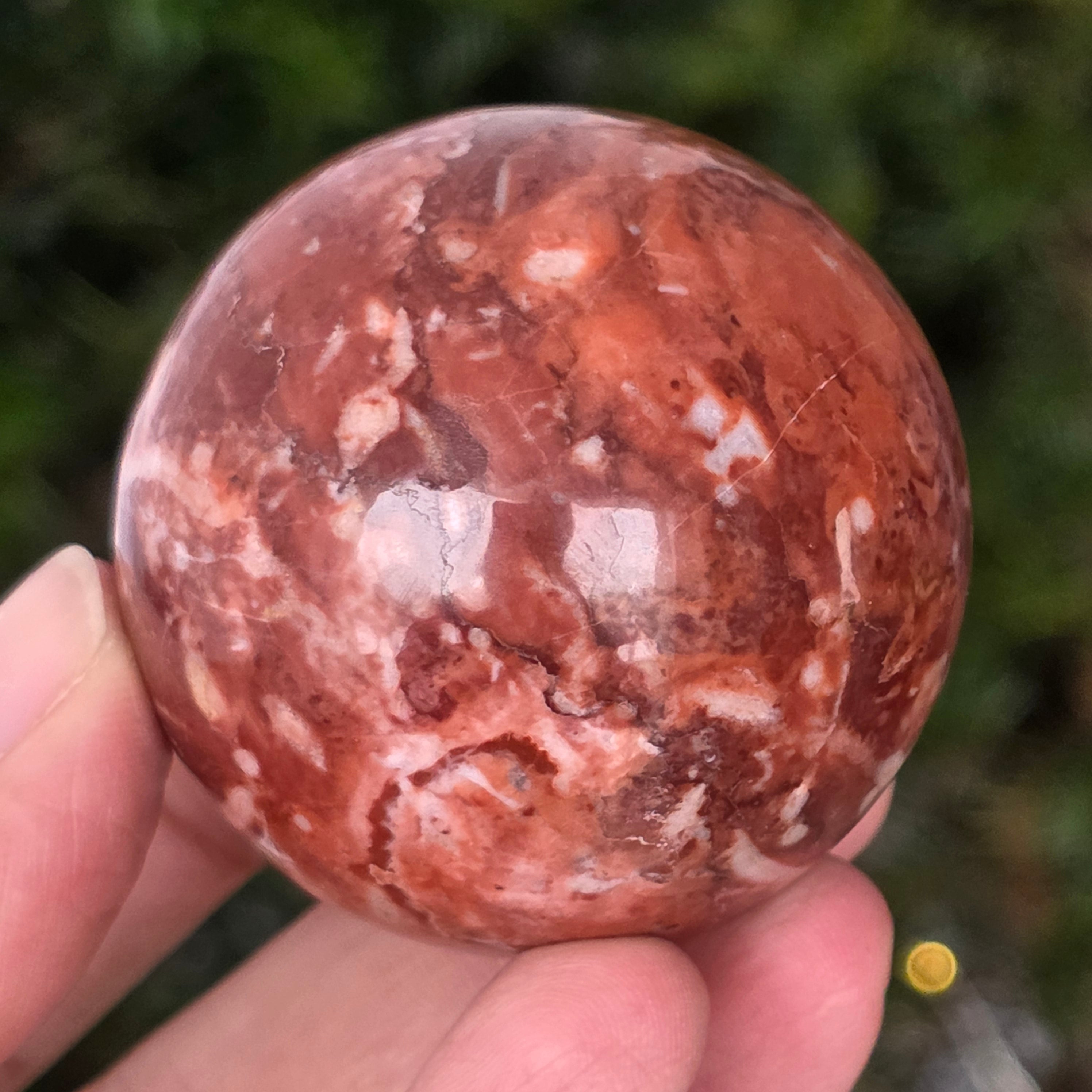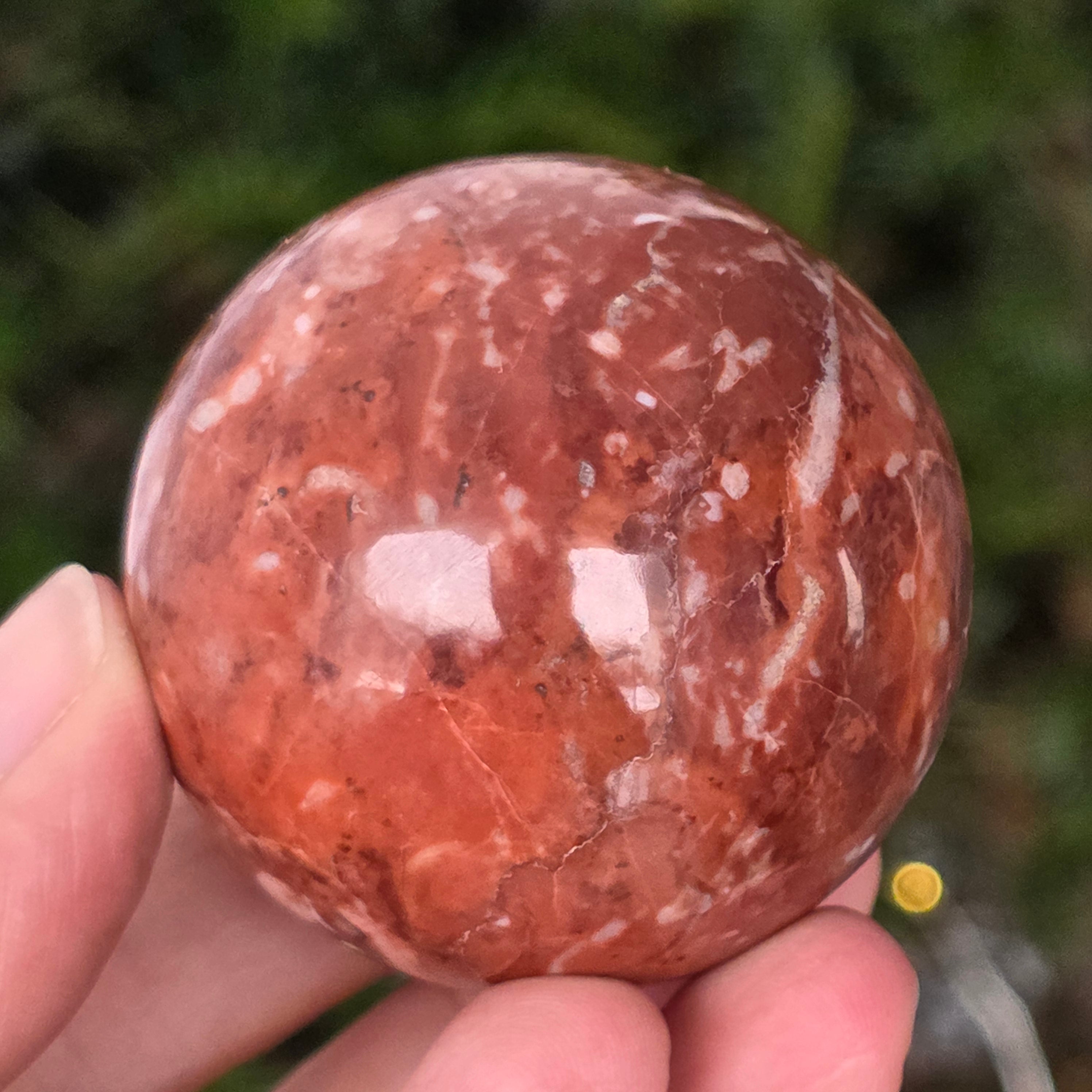 Оформено от дълбините на Земята, това Сфера от червен яспис Тя излъчва топла, стабилна и дълбоко закотвена енергия. Камъкът, известен от древността като "камъкът на жизнеността", носи цветовете на кръв и вътрешен огън – символ на жизнена сила, кураж и упоритост.