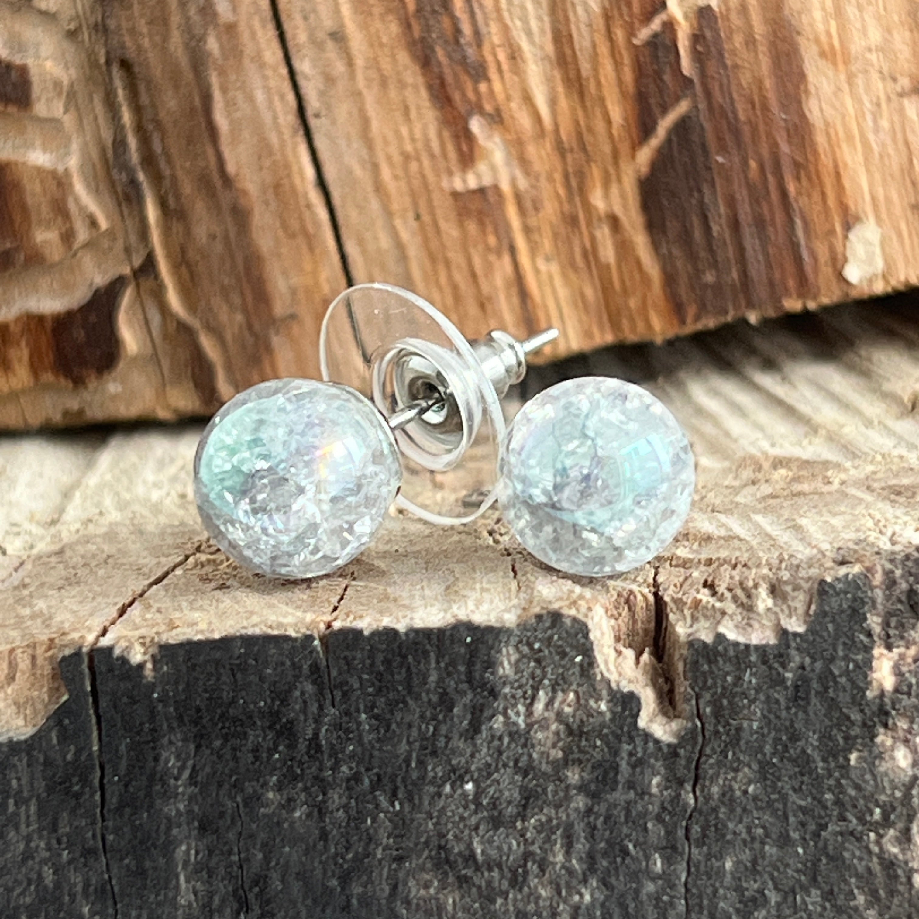 Тези Аура "смачкани" кварцови обеци Изглежда, че са издялани от фрагменти светлина. Вътрешната им текстура, пълна със сребърни отражения и фина иридесценция, създава игра на искри, напомняща на прозрачен лед или лунните лъчи, отразени в кристала.