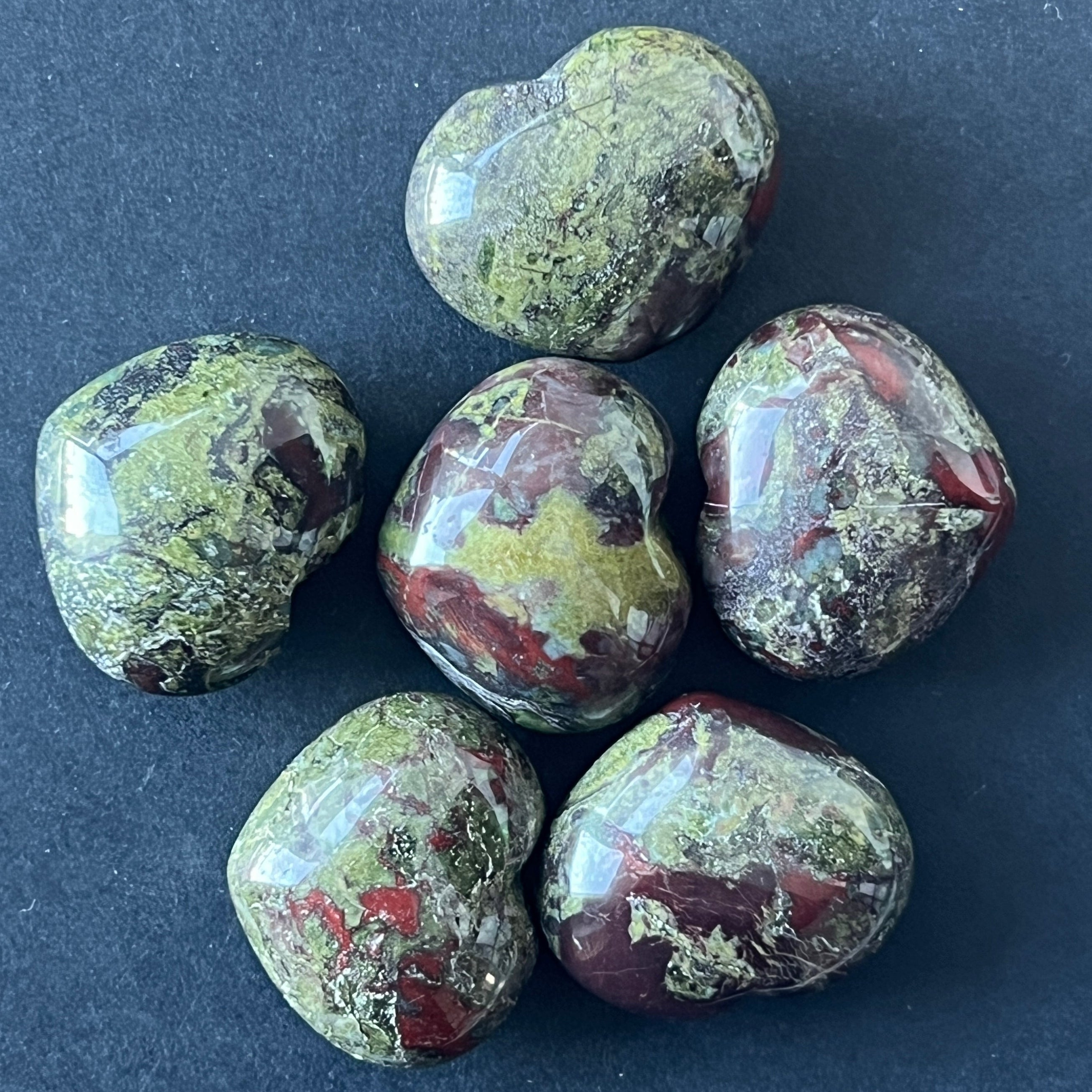 Сърцето от Яспис Драконова Кръв е камък на силата и праисторическата смелост, роден от срещата на първичните елементи. Дълбокозеленият му цвят и червените петна изглеждат като извадени от древни легенди, където драконовата кръв дава живот на Земята. Всяко сърце е уникално парче с неповторими текстури, което носи в себе си отпечатъка на живата енергия на природата.