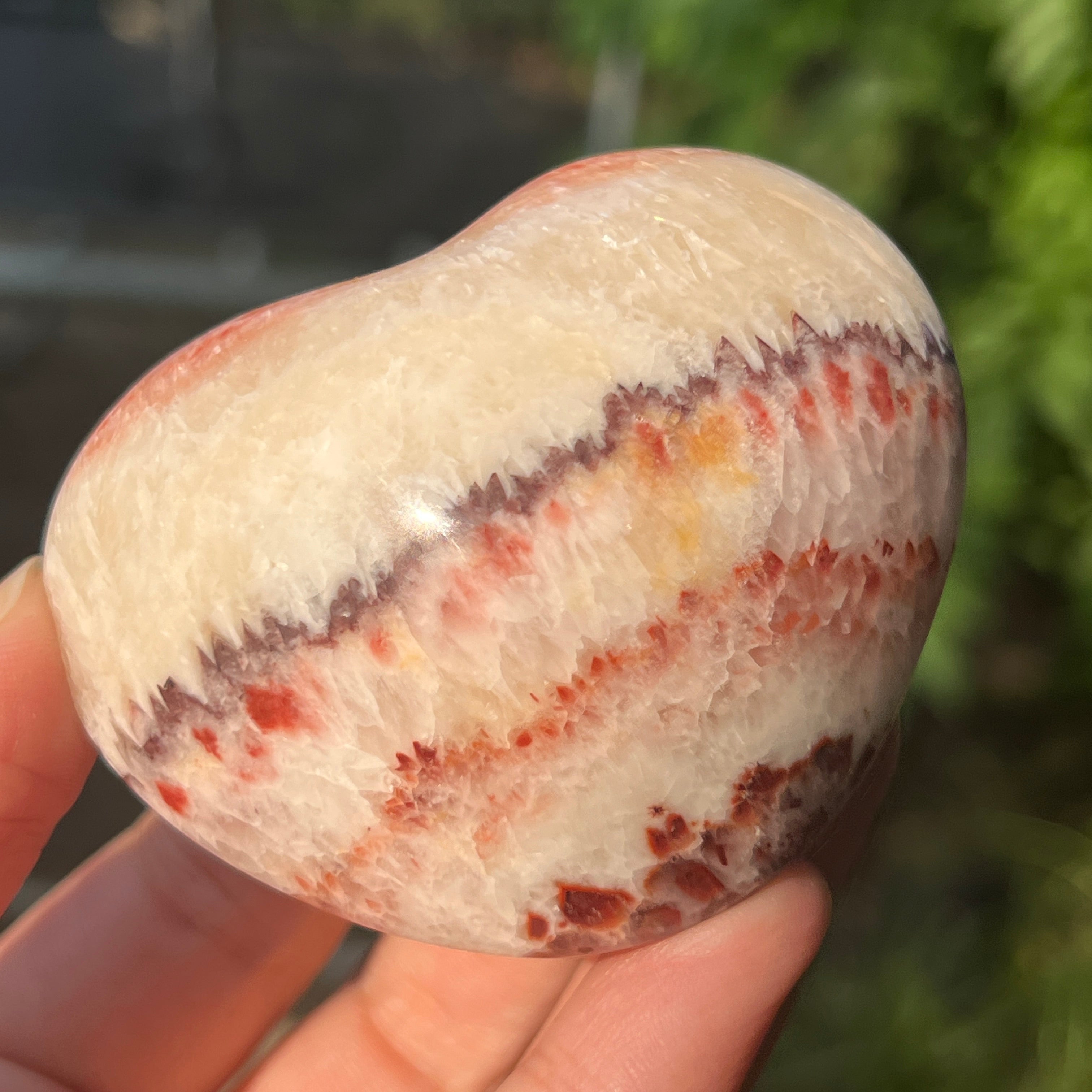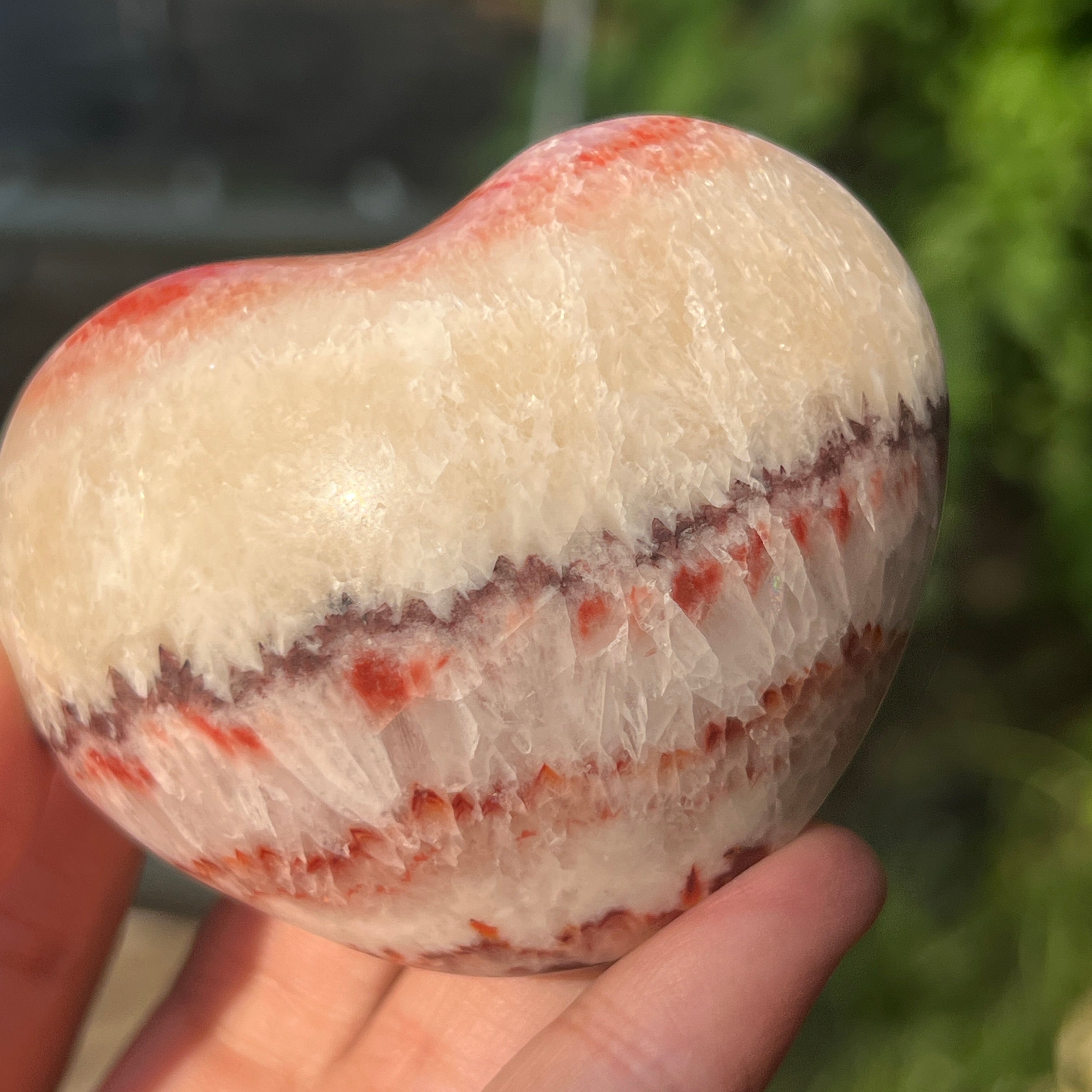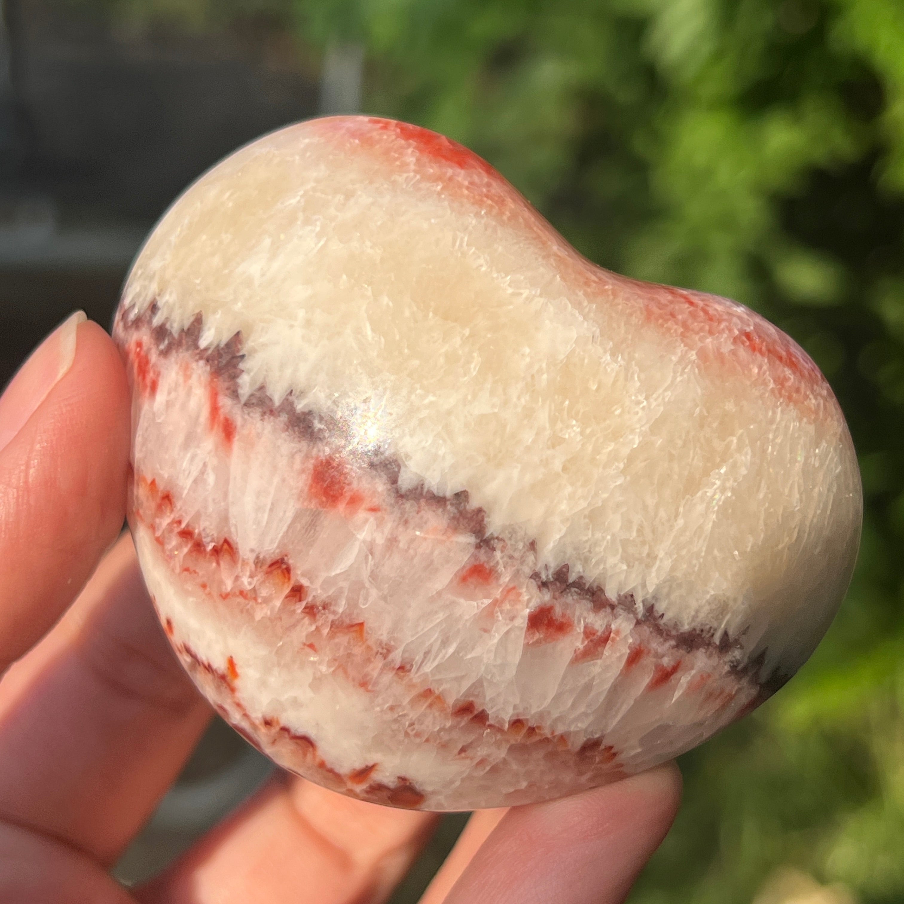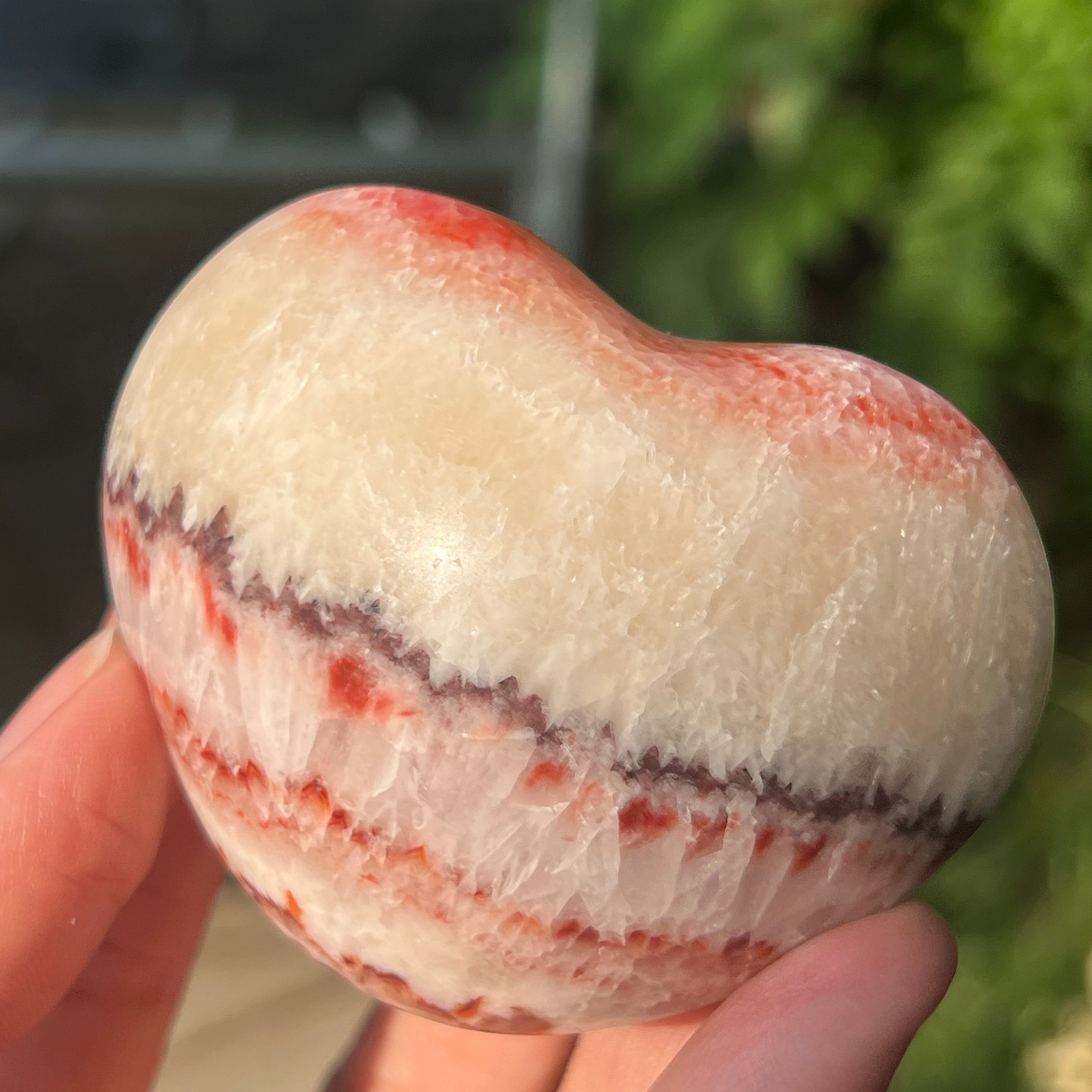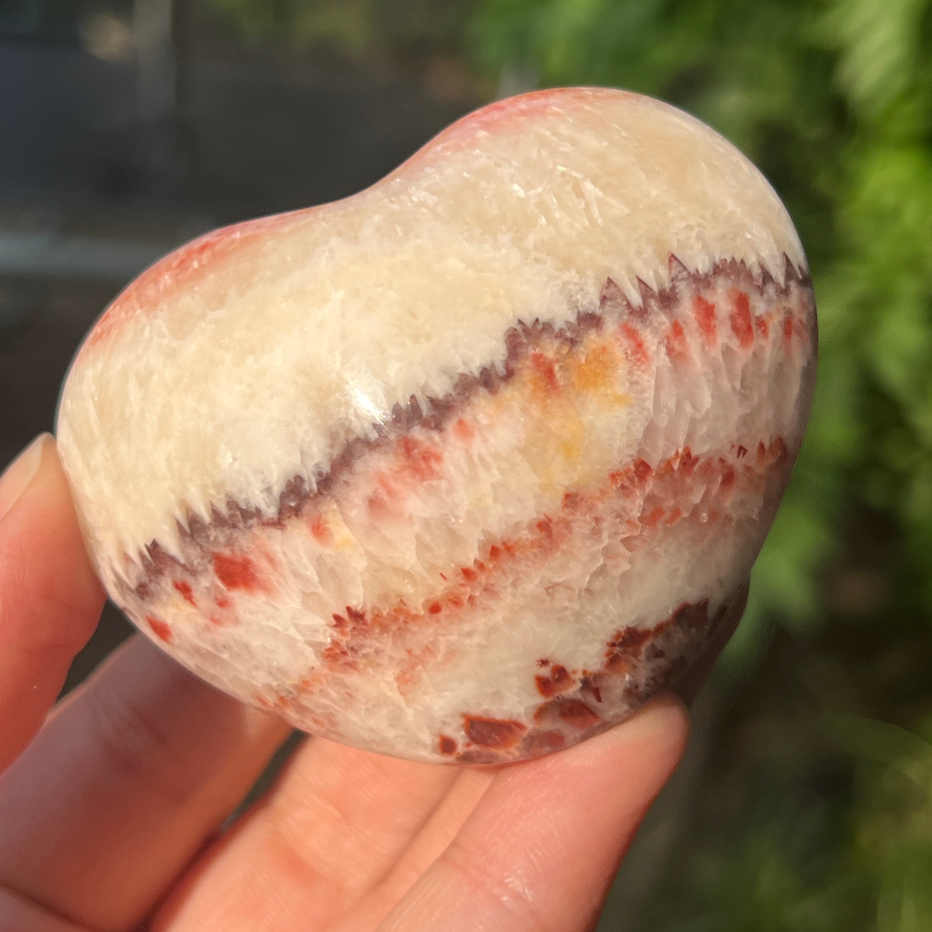 Това ръчно шлифовано сърце от розов ивичест калцит внася топлина и утеха във всяко пространство. Нежните розови нюанси, комбинирани с бели или кремави ивици, възпроизвеждат нежност, вътрешен баланс и духовна защита.