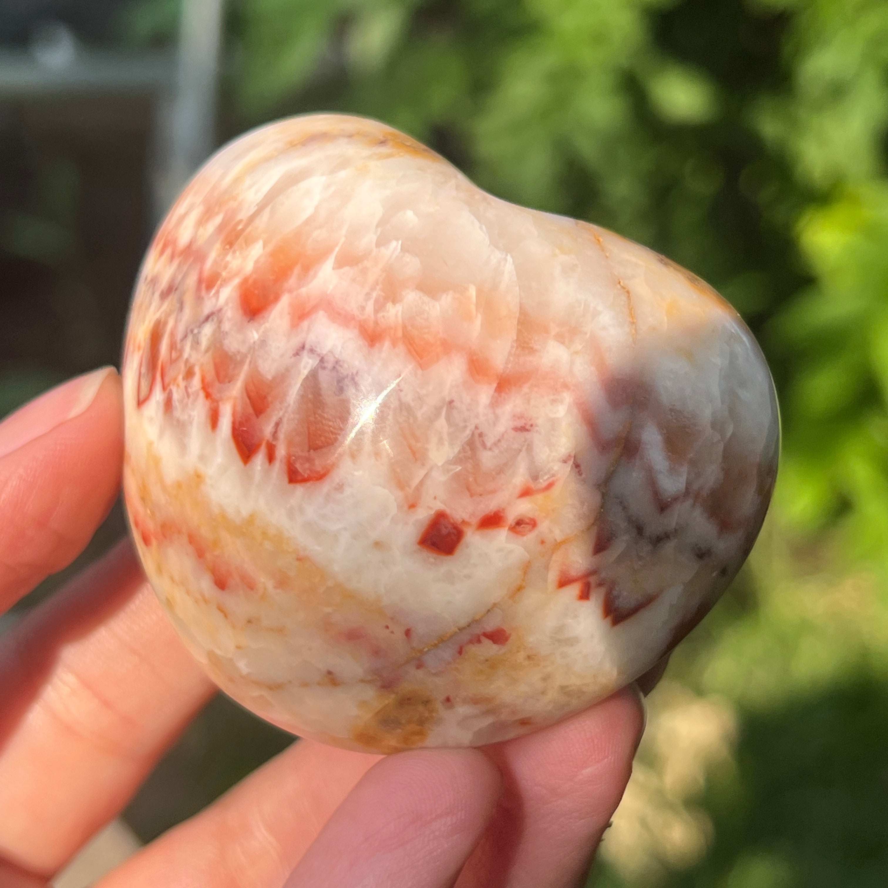 Това ръчно изработено сърце от розов райски калцит придава топъл и успокояващ акцент на всяко пространство. Меките нюанси на розово, комбинирани с бели или кремави ивици, навяват нежност, вътрешен баланс и духовна защита.