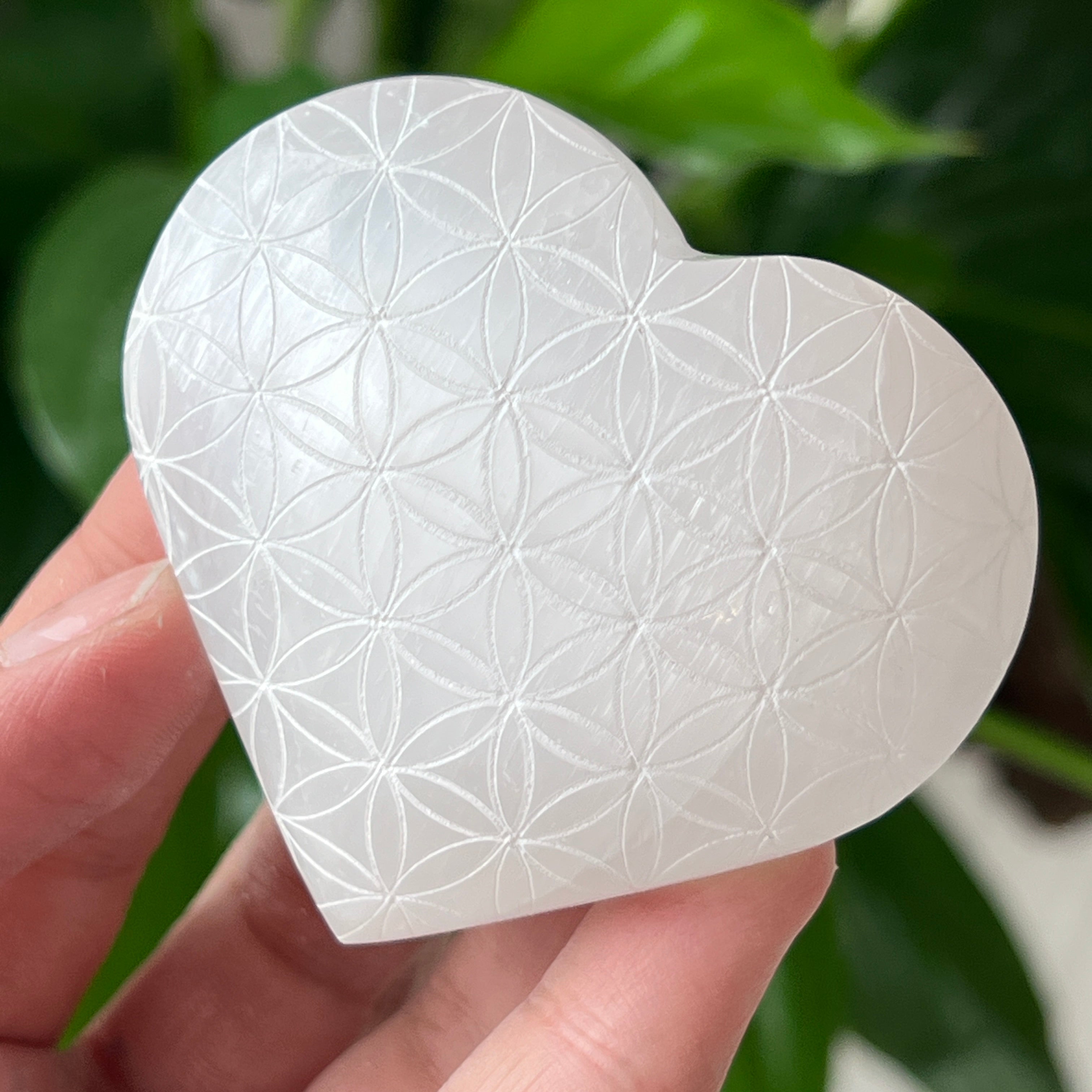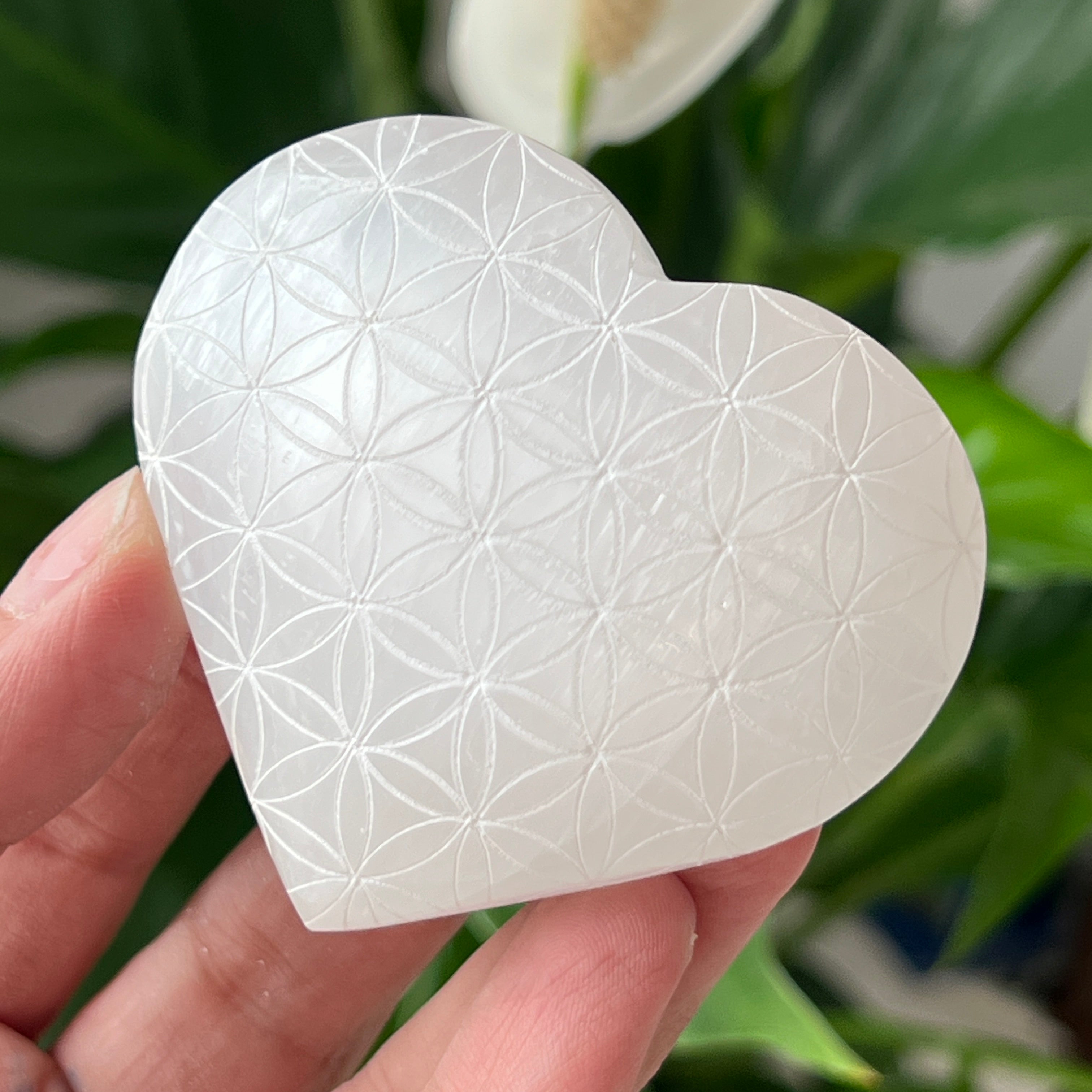 Изберете този селенитно сърце, гравирано с Цветето на живота за да донесеш повече светлина, защита и хармония в живота си ✨.