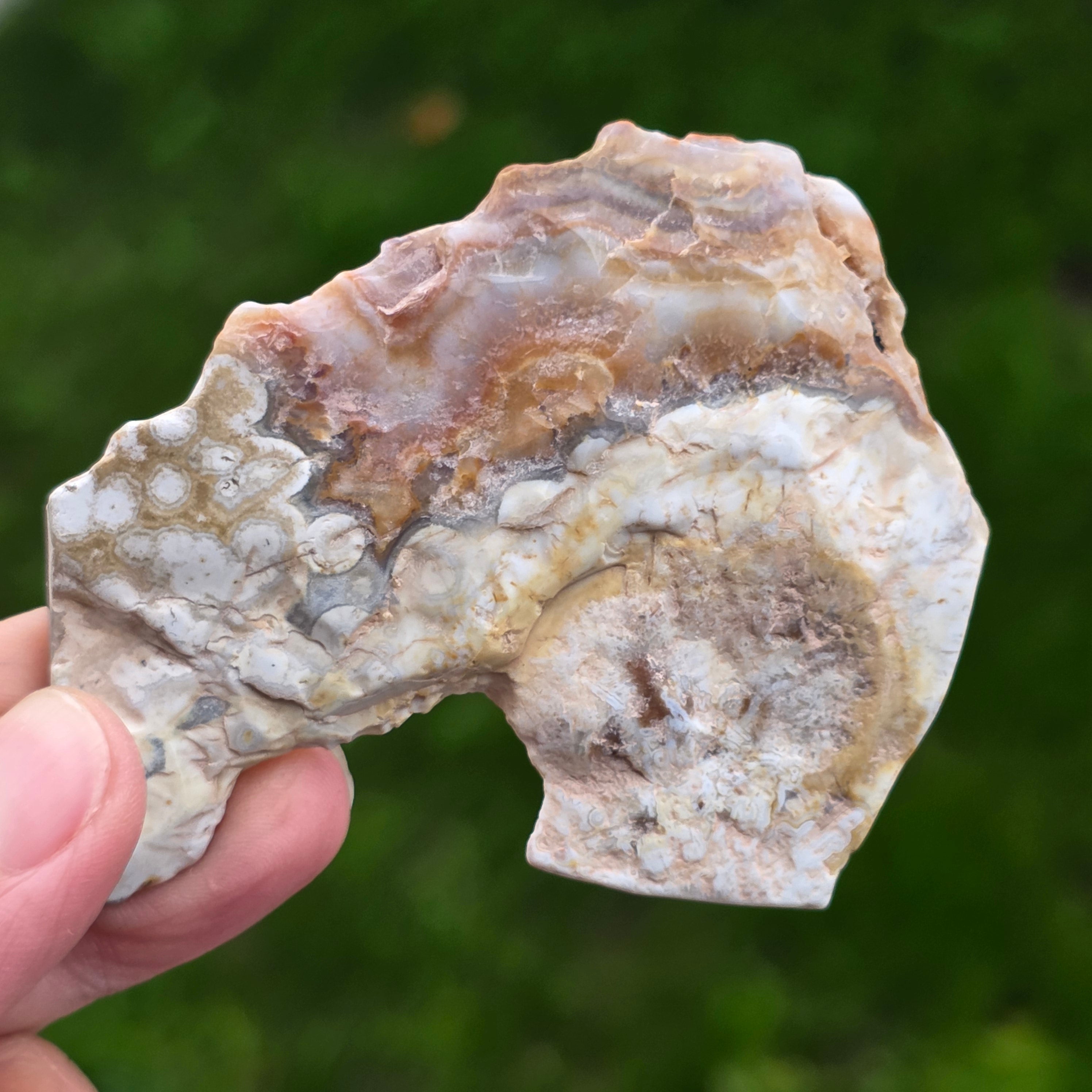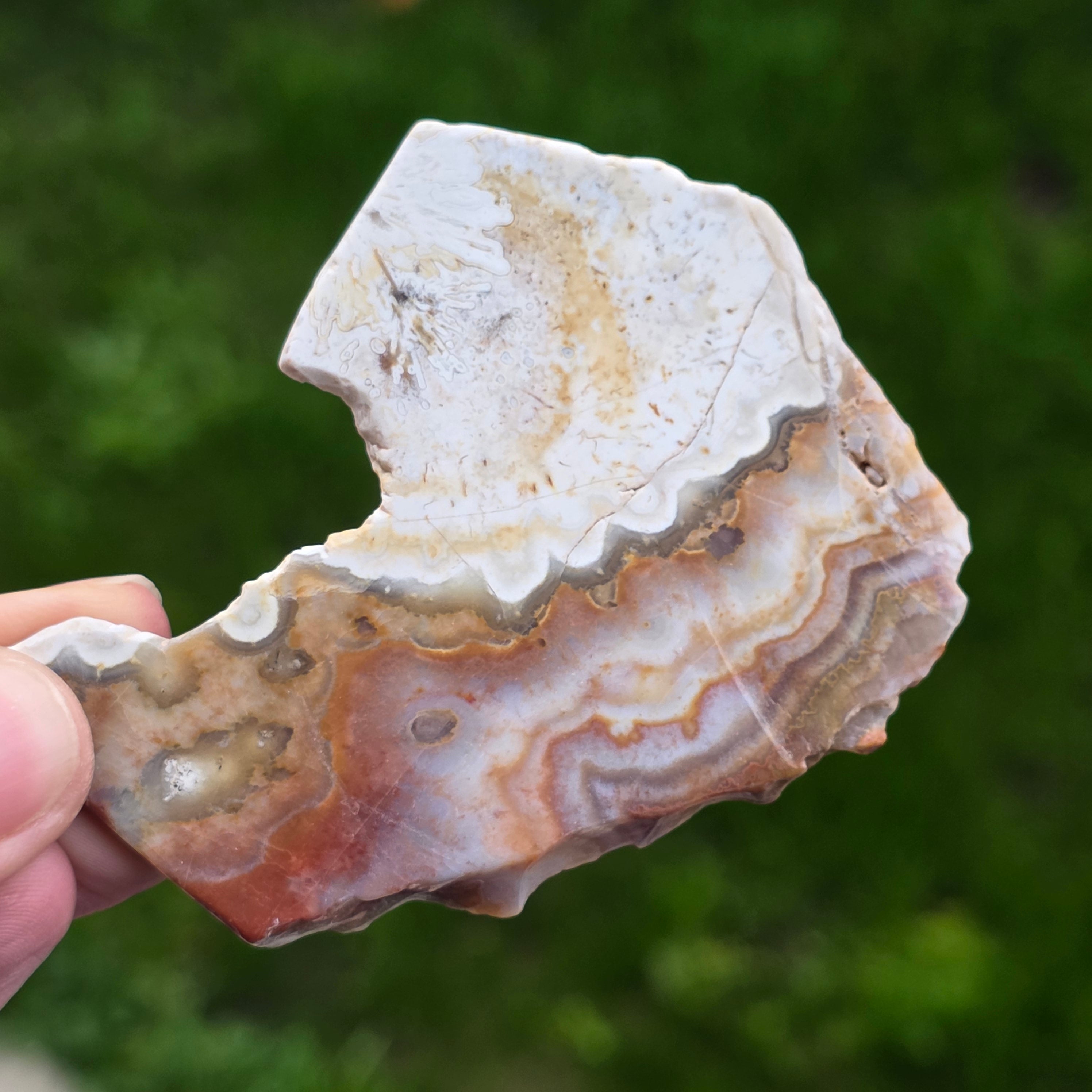 Агатът Crazy от Мексико е една от най-живописните и впечатляващи разновидности на агата, известен със своите вълнообразни линии и лудите цветови комбинации, които изглежда са нарисувани от свободна ръка, без правила. В този малък, но изключително изразителен натурален срез се разкрива цялата история на камъка: землисти слоеве, топли оттенъци на карамел, яркочервено, оранжево, сиво и кремаво, смесени в спираловидни модели, които сякаш пулсират с живот.