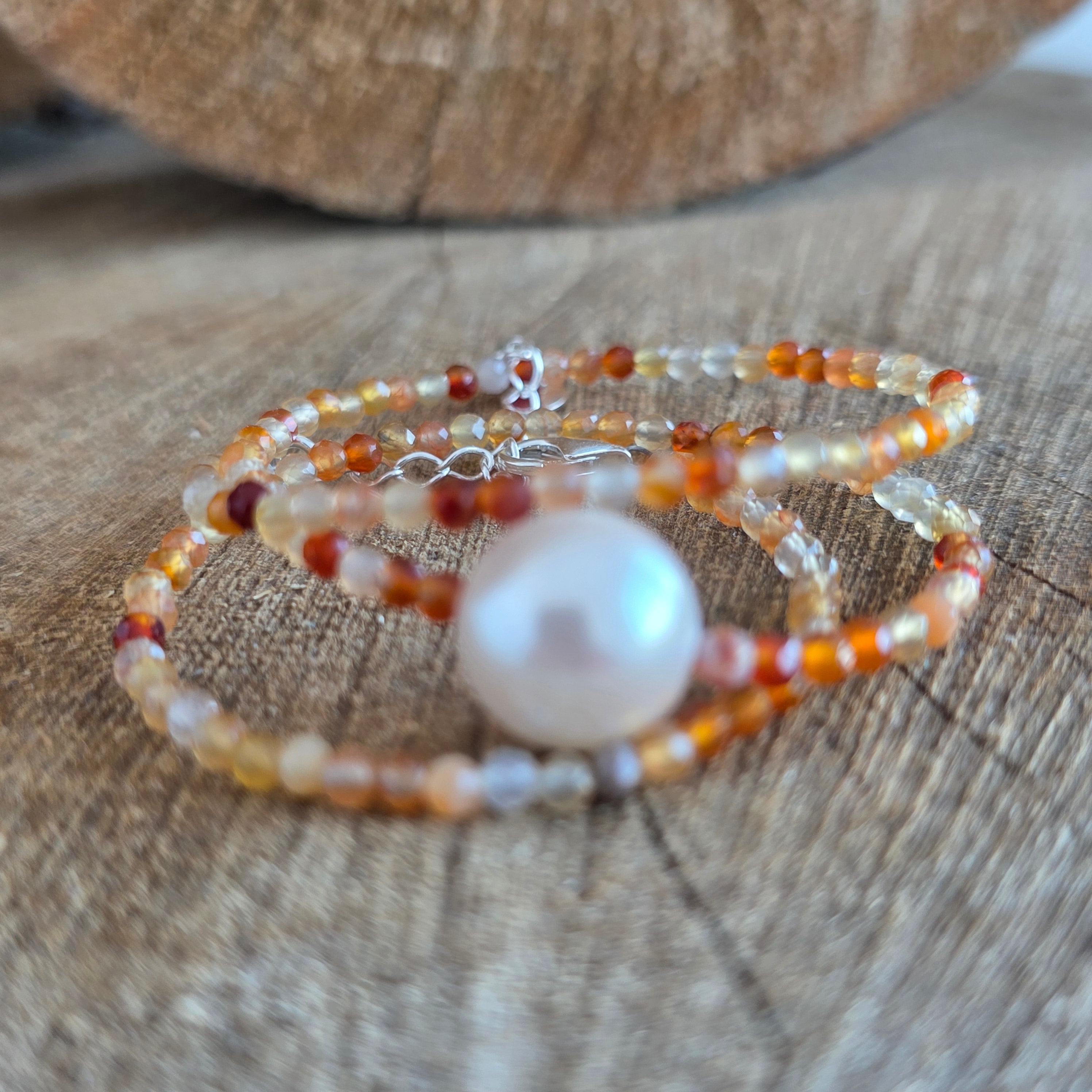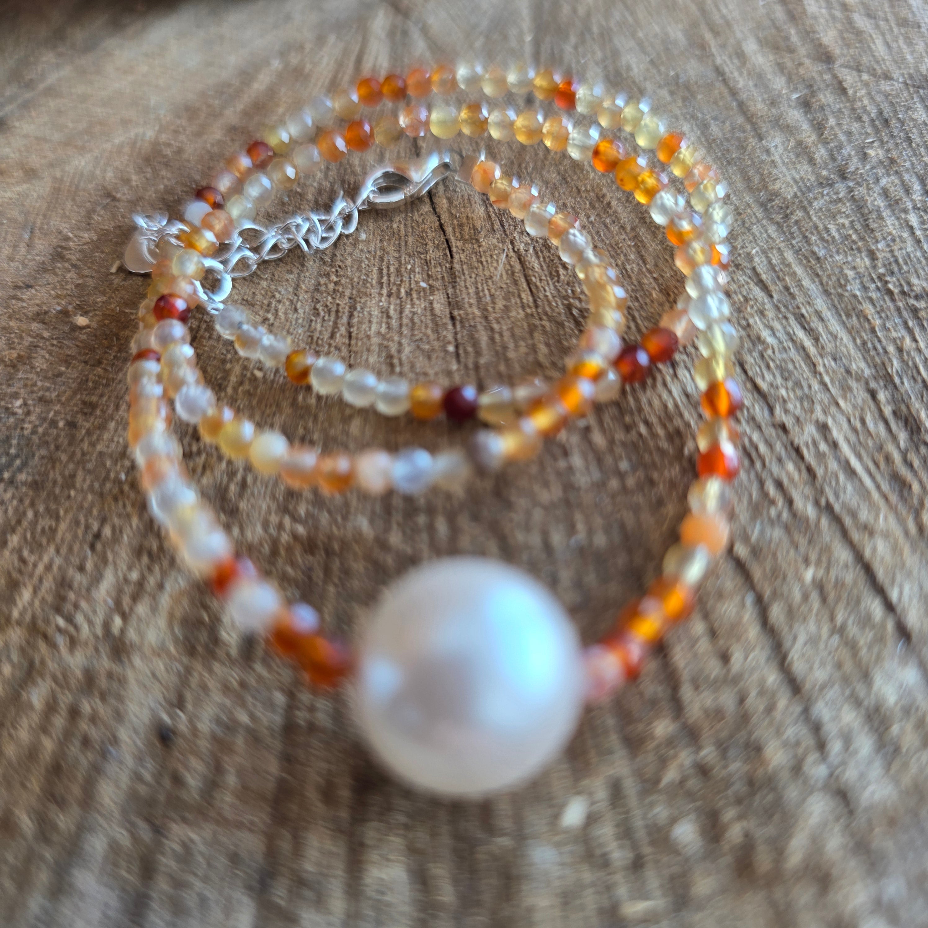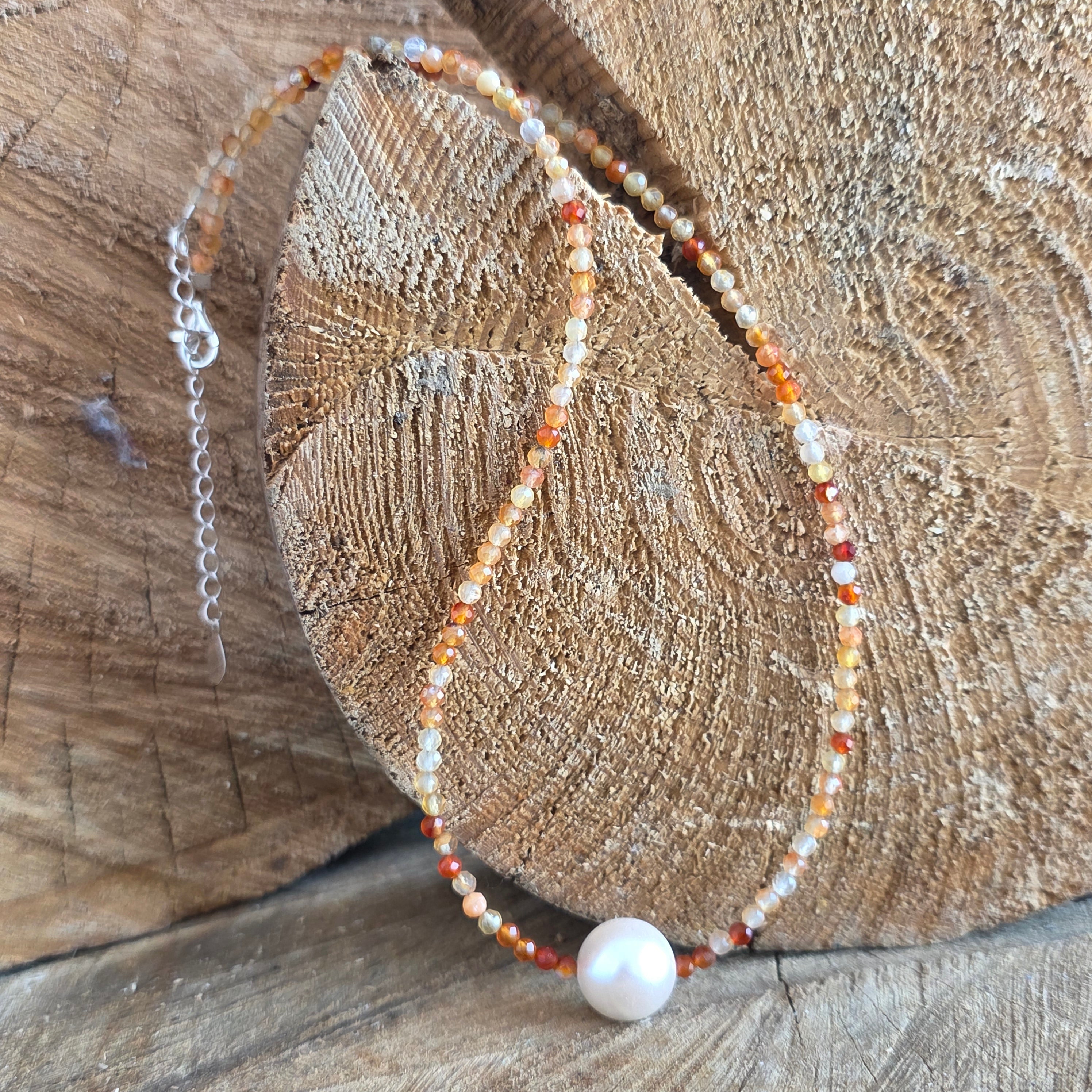 Колие с топло и живо присъствие, направено от 8 мм карнеолинови сфери, които се намират хармонично около врата, образувайки кръгла и балансирана линия. Богатите нюанси на оранжево и изгорено червено, понякога с прозрачни вариации, подчертават живия характер на камъка, а сферичната форма подчертава усещането за непрекъснатост и визуална плавност. Дизайнът е чист и вечен, като естественият цвят и текстурата на карнелиана излизат на преден план.
