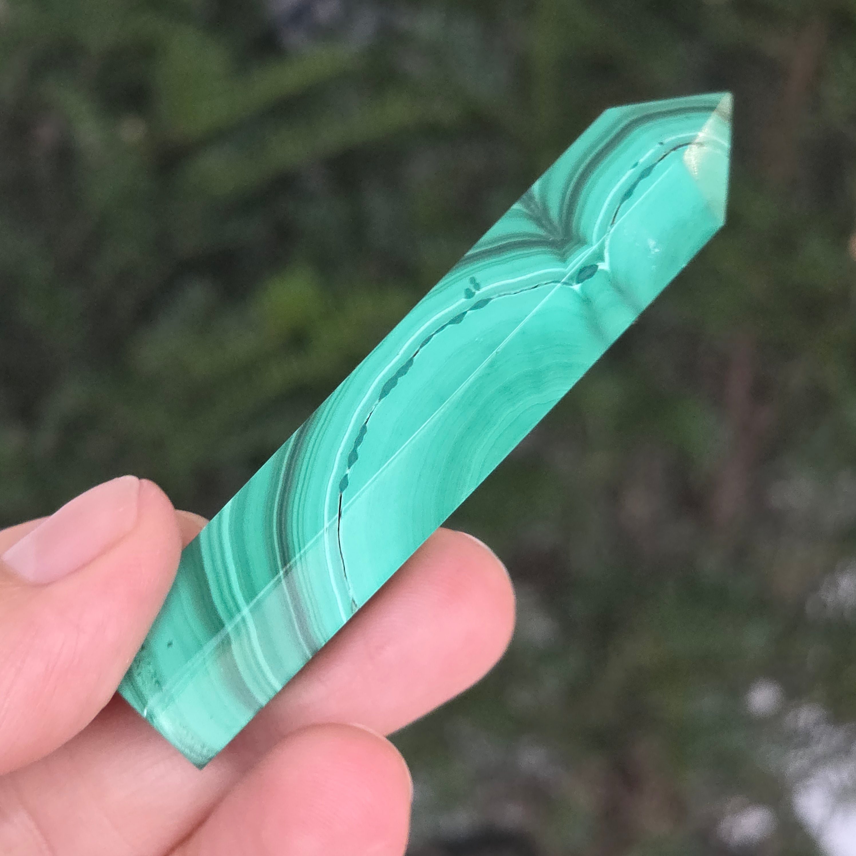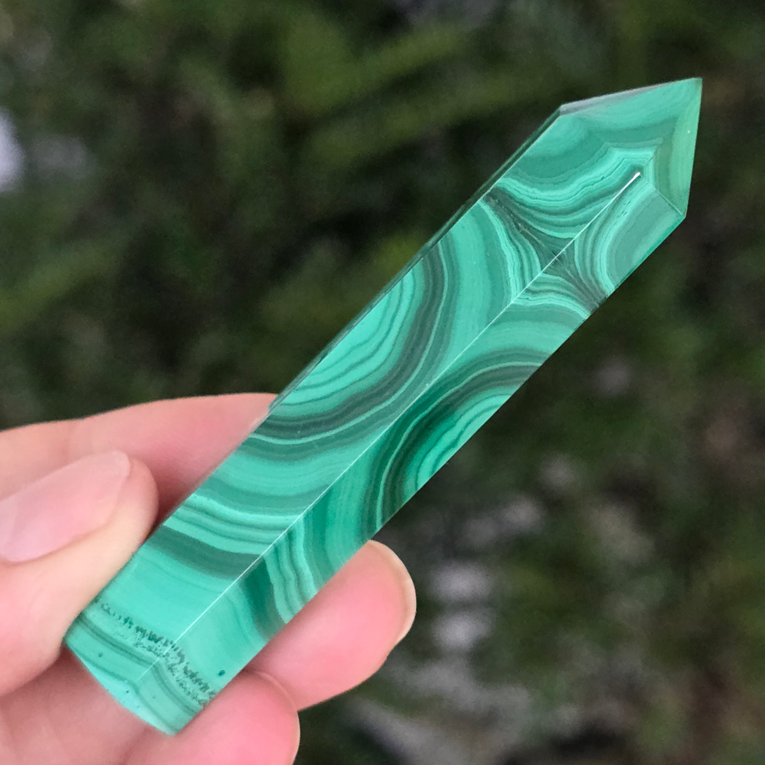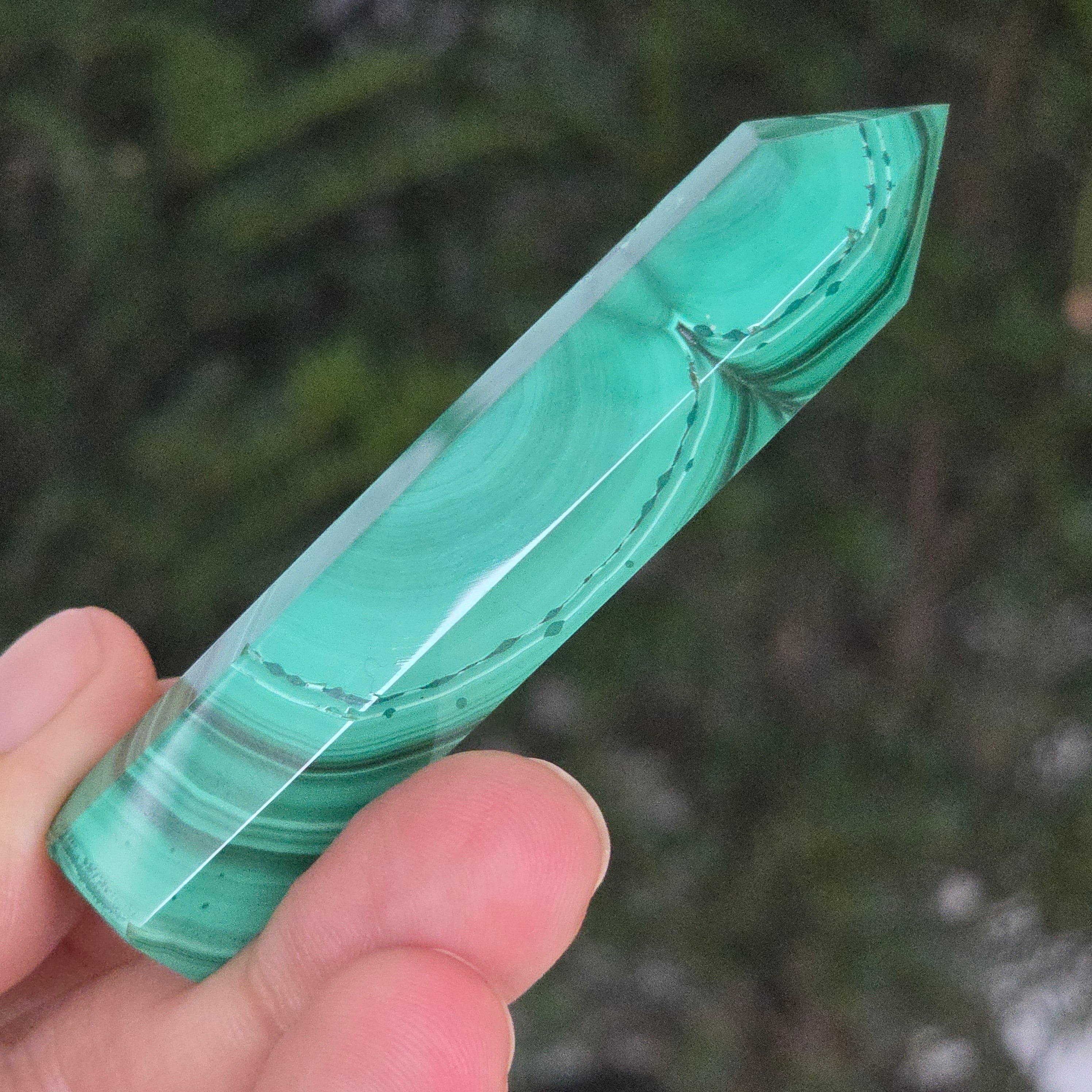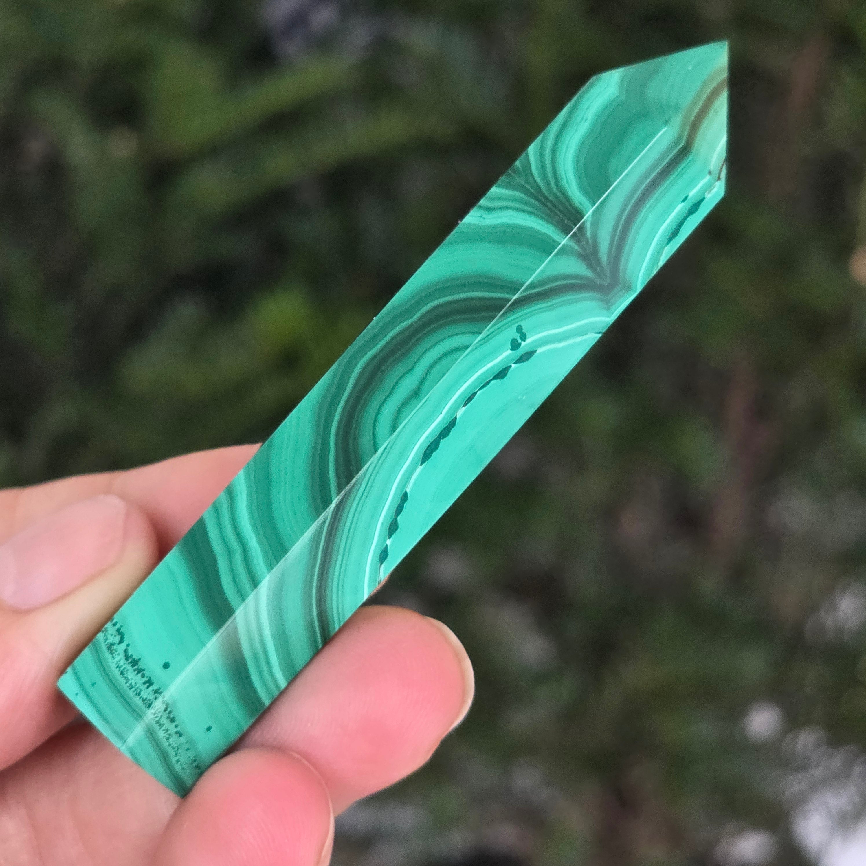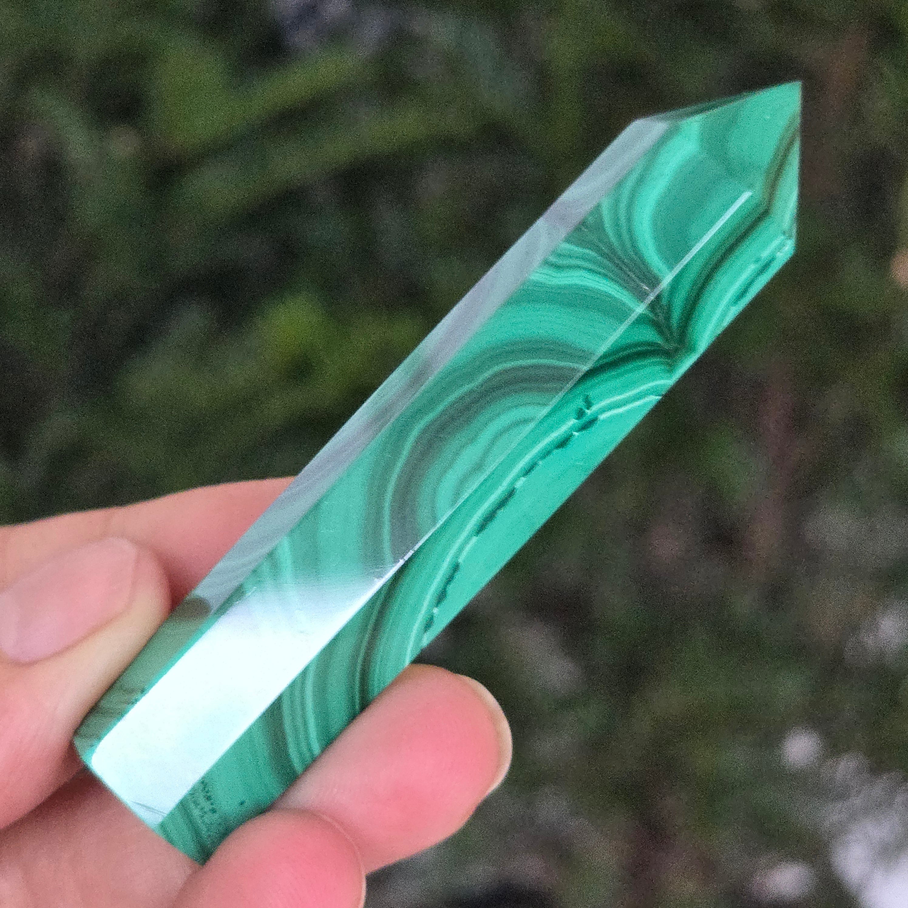 Обелиск, който сякаш е оживял от зелените дълбини на планетата. този уникално парче естествен малахит, разкрива хипнотизиращи слоеве от изумрудено зелено, тъмнозелено и копринени нюанси на нефрит, подредени в уникални концентрични шарки като карти на вътрешните енергии. Ръчно полиран до кадифен блясък, обелискът излъчва дълбока минерална елегантност.