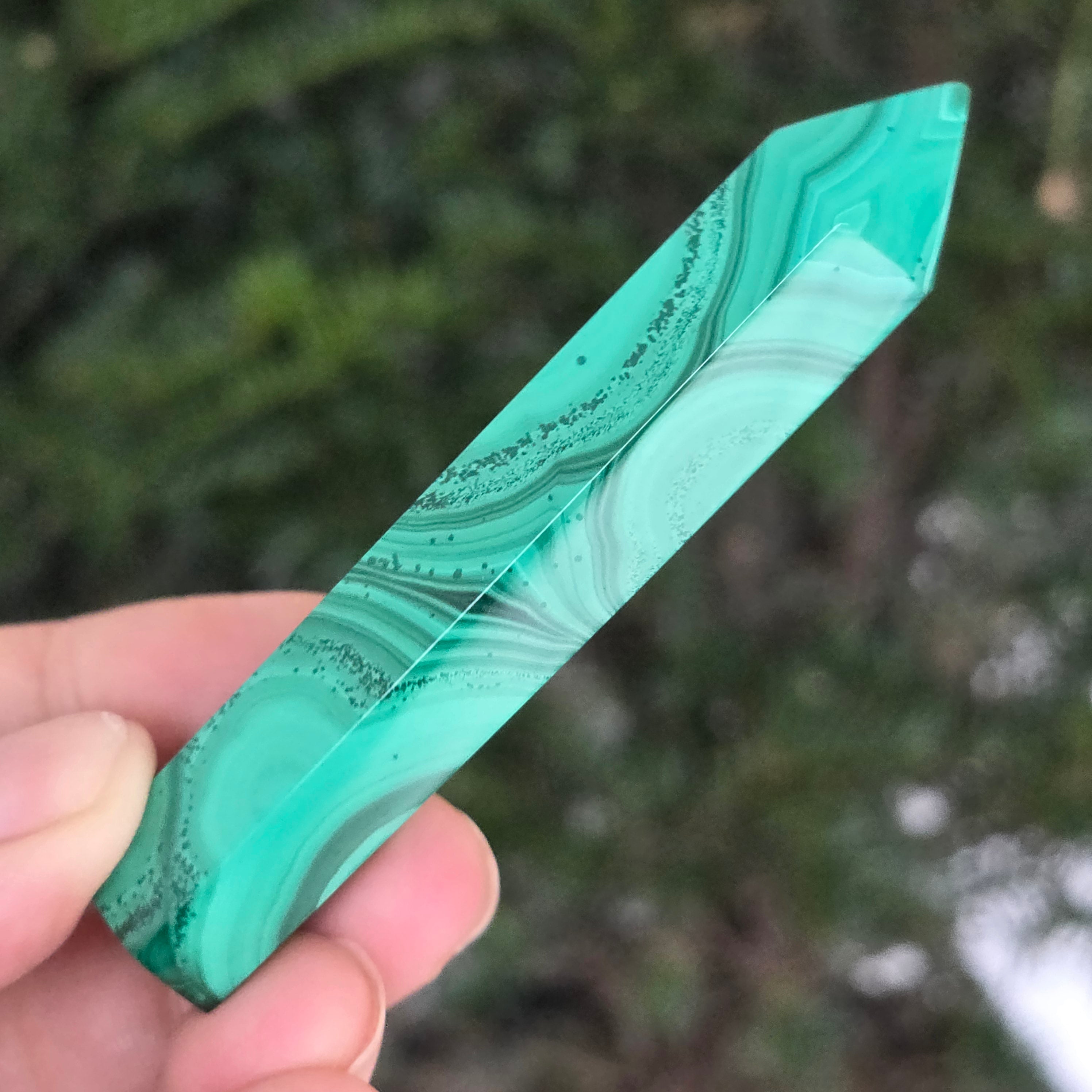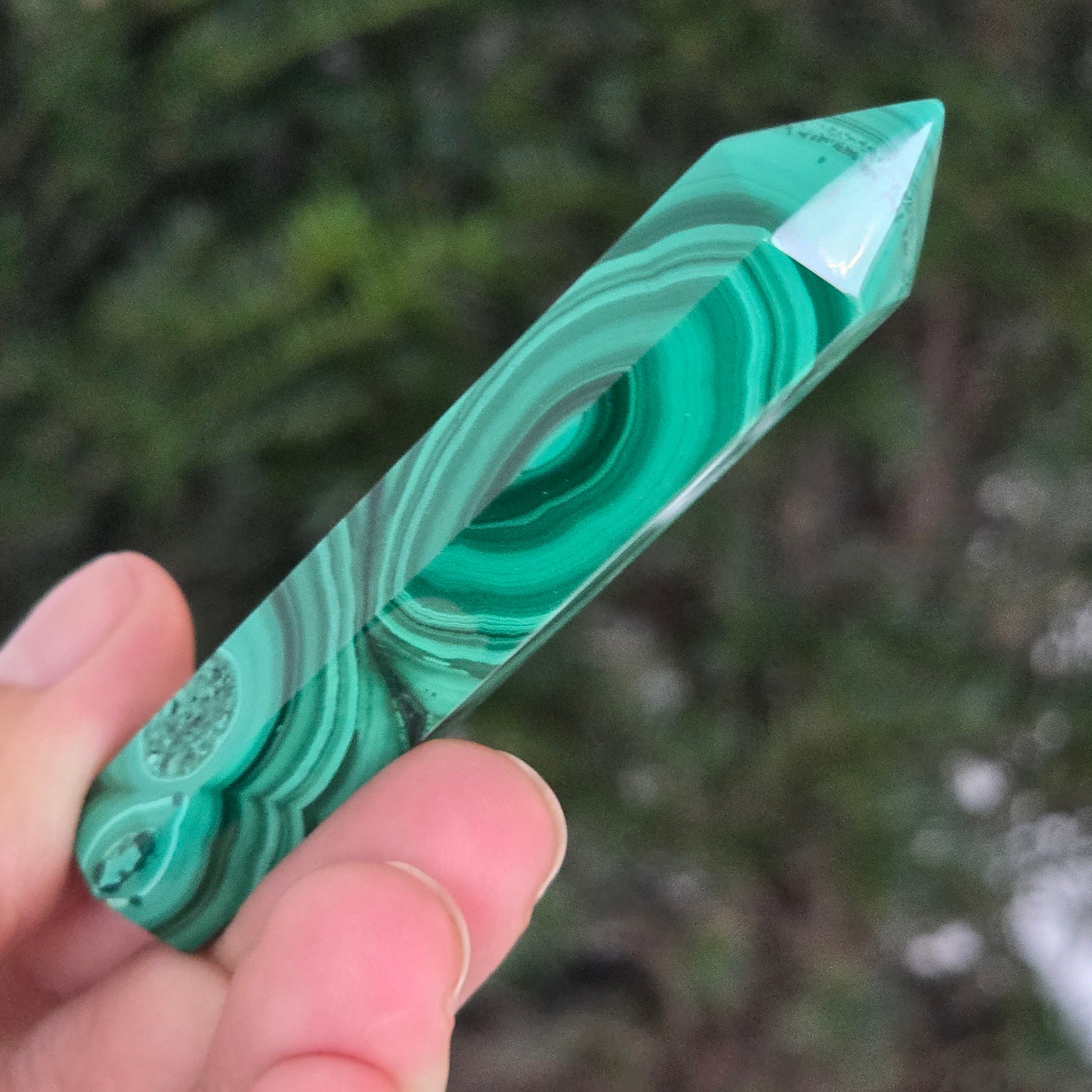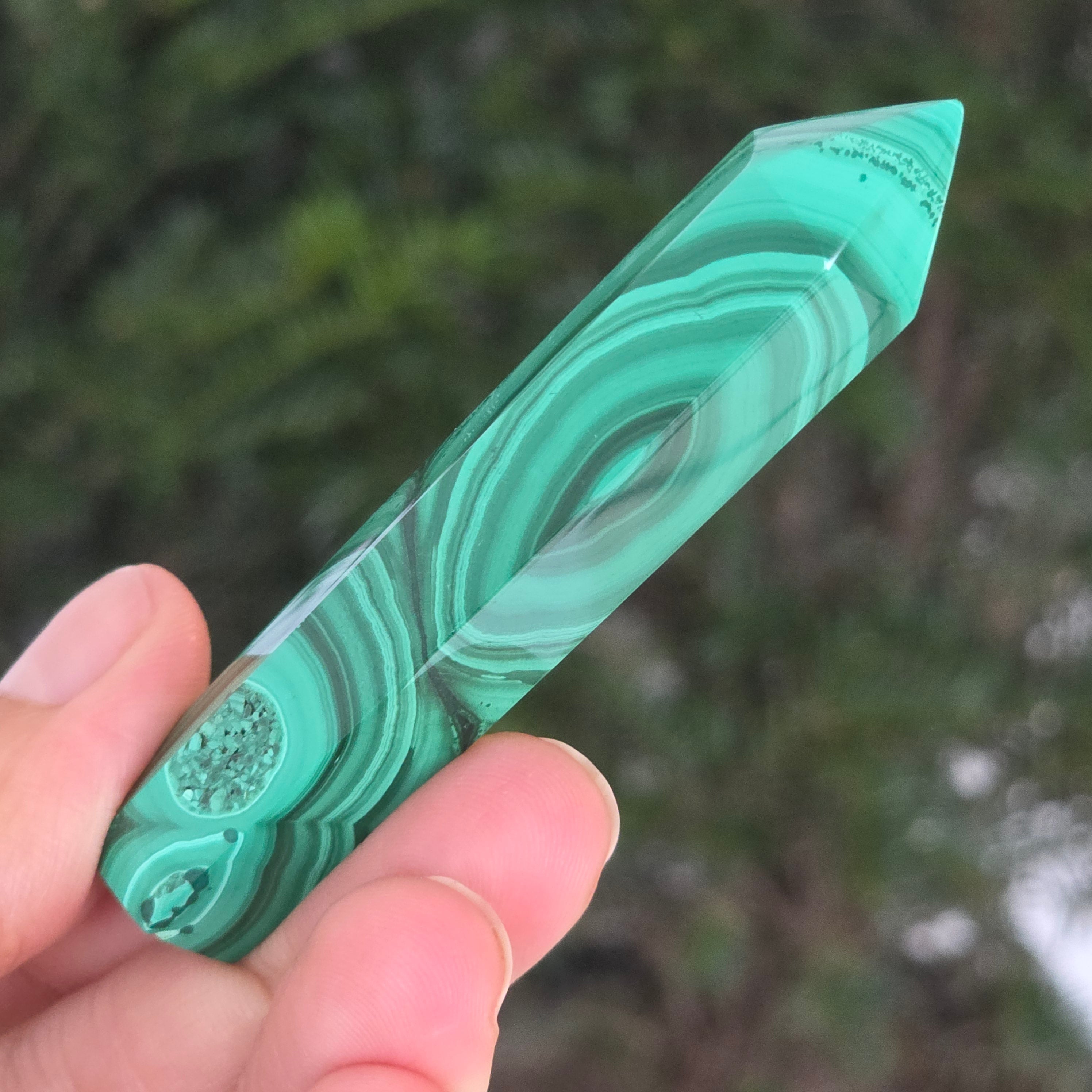 Обелиск, който сякаш е оживял от зелените дълбини на планетата. този уникално парче естествен малахит, разкрива хипнотизиращи слоеве от изумрудено зелено, тъмнозелено и копринени нюанси на нефрит, подредени в уникални концентрични шарки като карти на вътрешните енергии. Ръчно полиран до кадифен блясък, обелискът излъчва дълбока минерална елегантност.