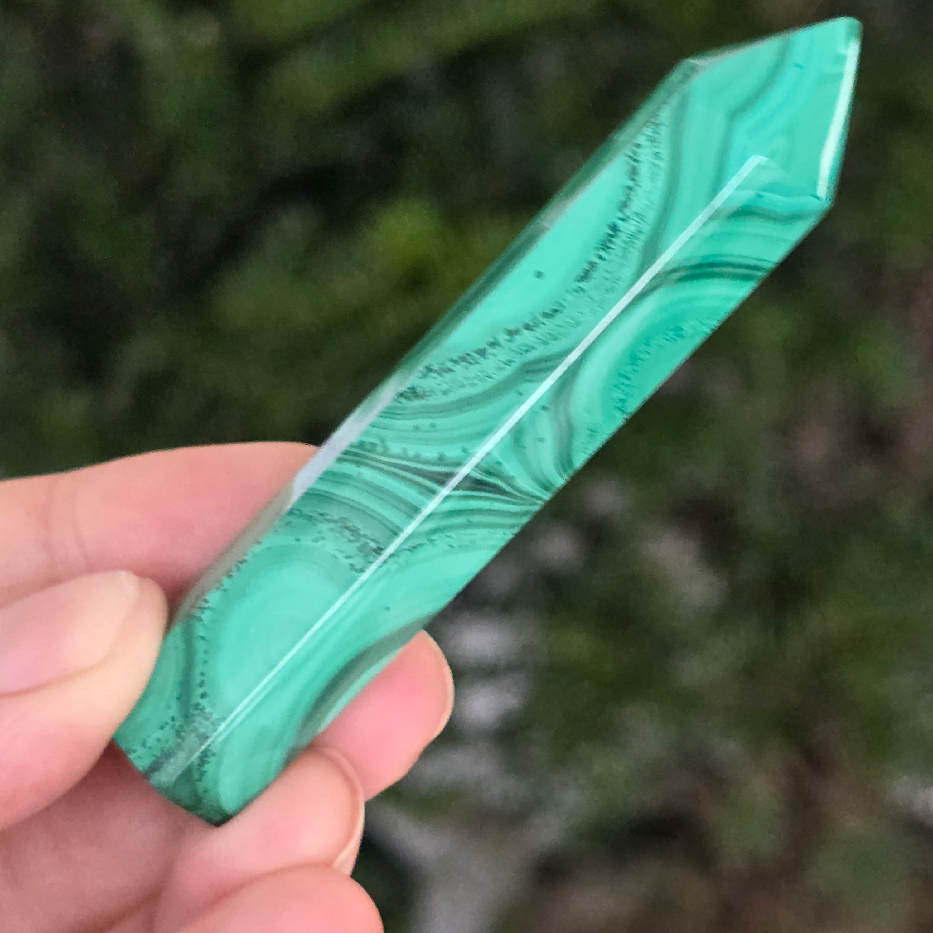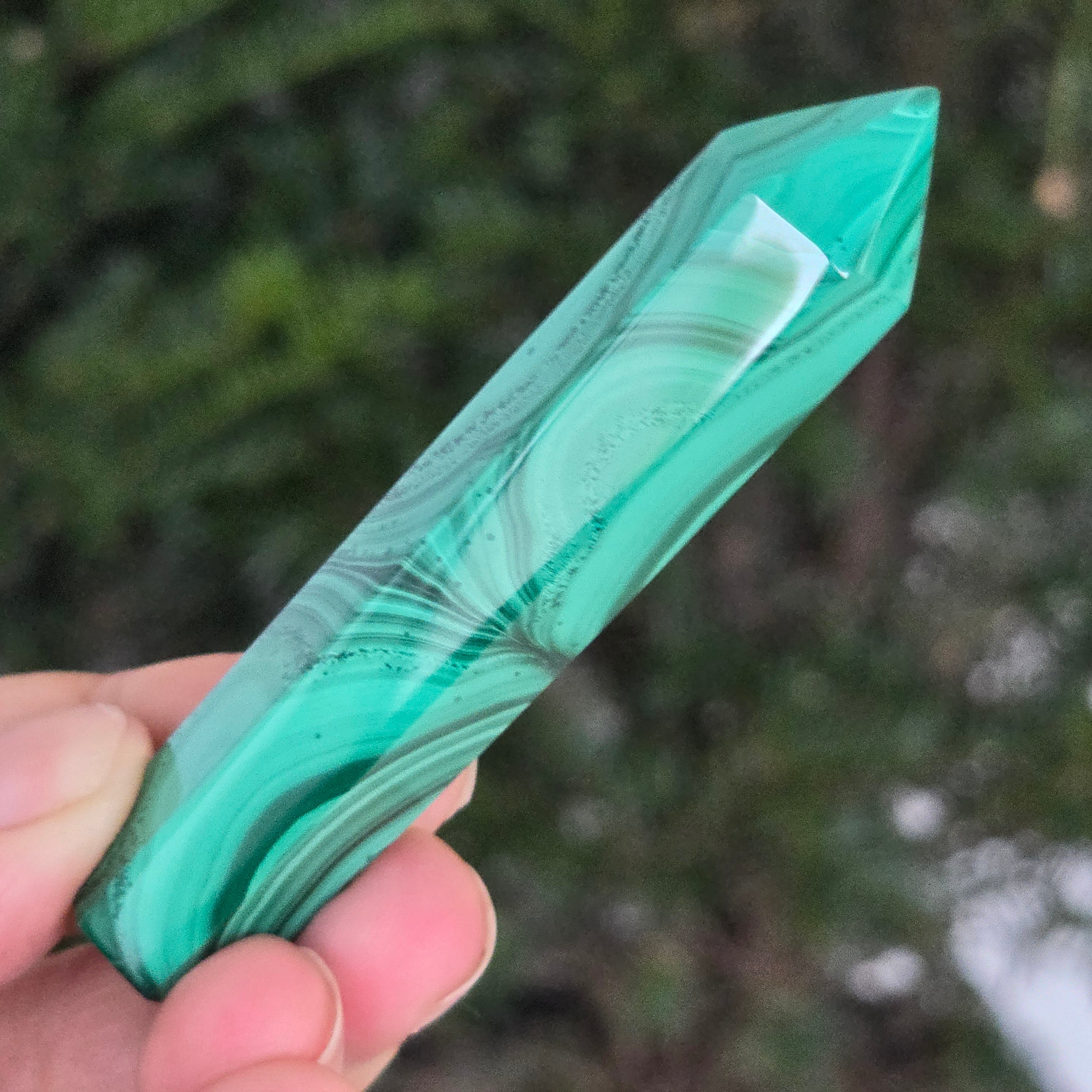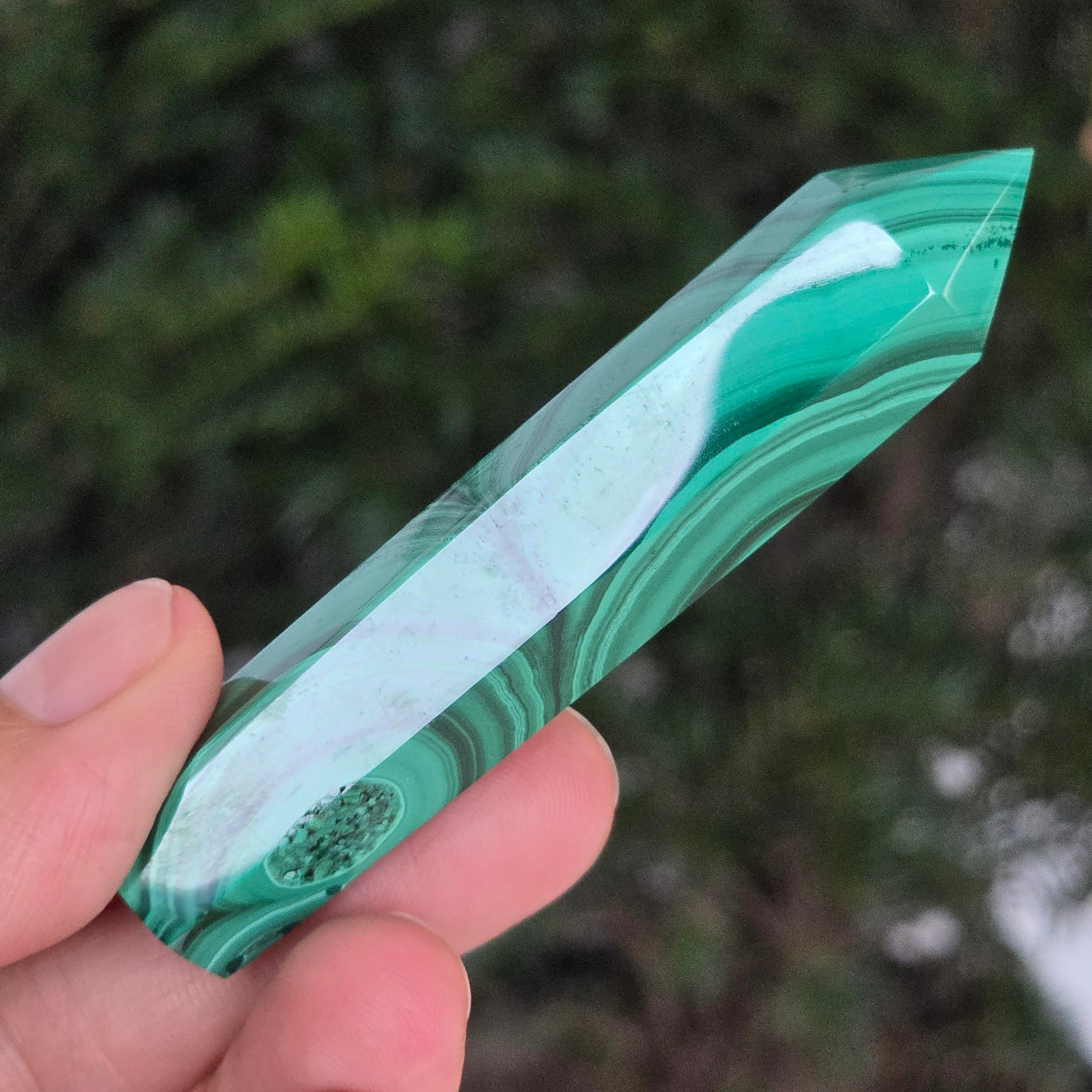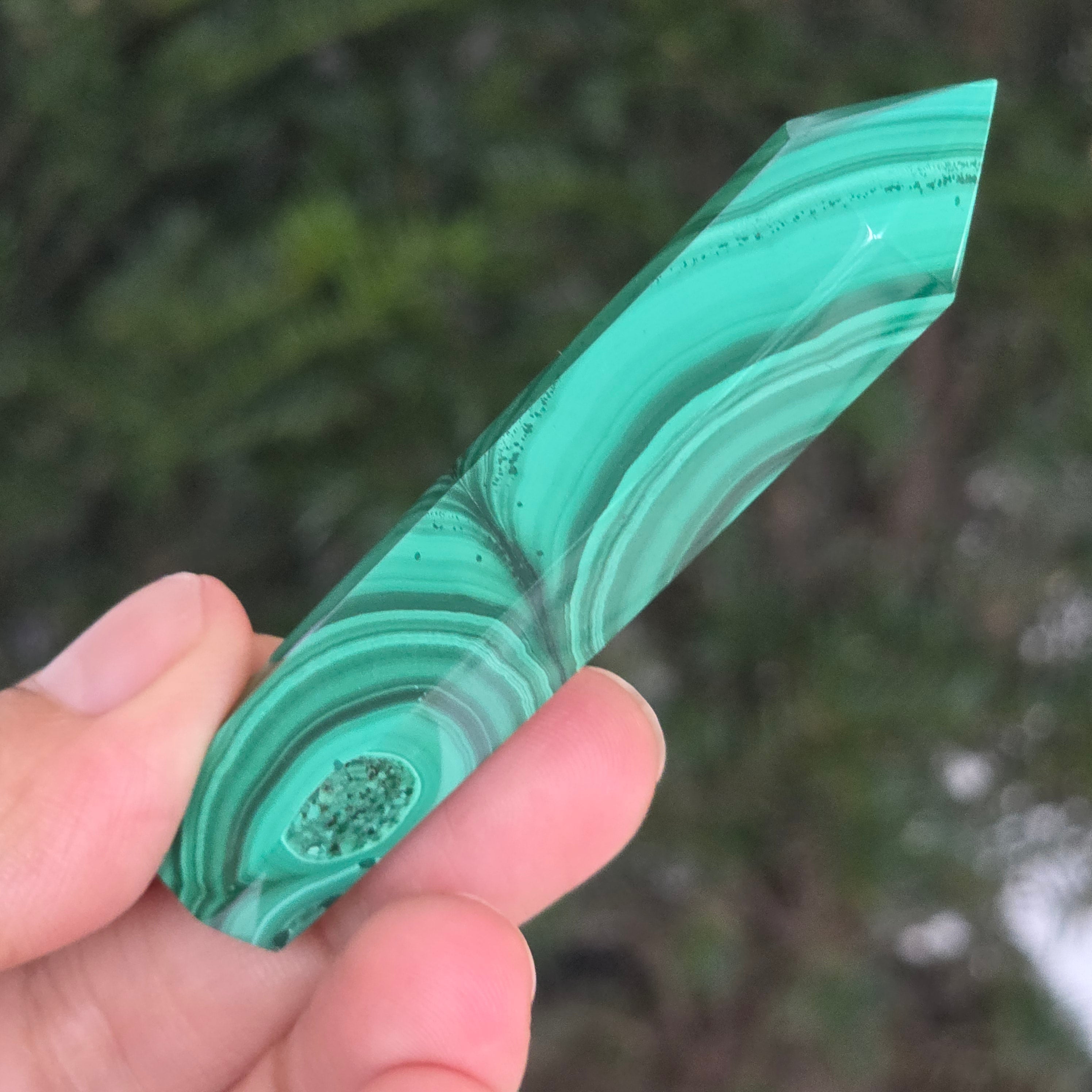 Обелиск, който сякаш е оживял от зелените дълбини на планетата. този уникално парче естествен малахит, разкрива хипнотизиращи слоеве от изумрудено зелено, тъмнозелено и копринени нюанси на нефрит, подредени в уникални концентрични шарки като карти на вътрешните енергии. Ръчно полиран до кадифен блясък, обелискът излъчва дълбока минерална елегантност.