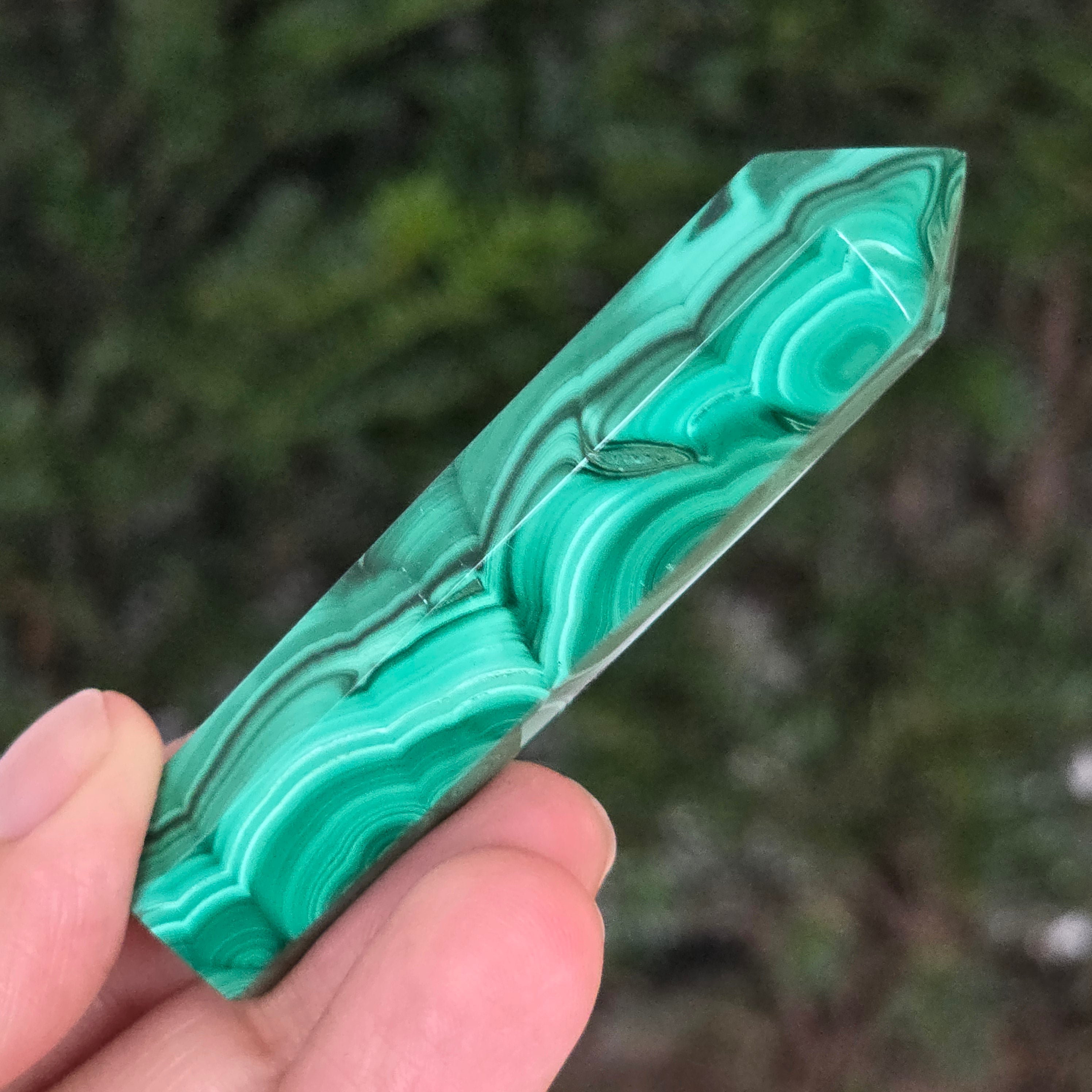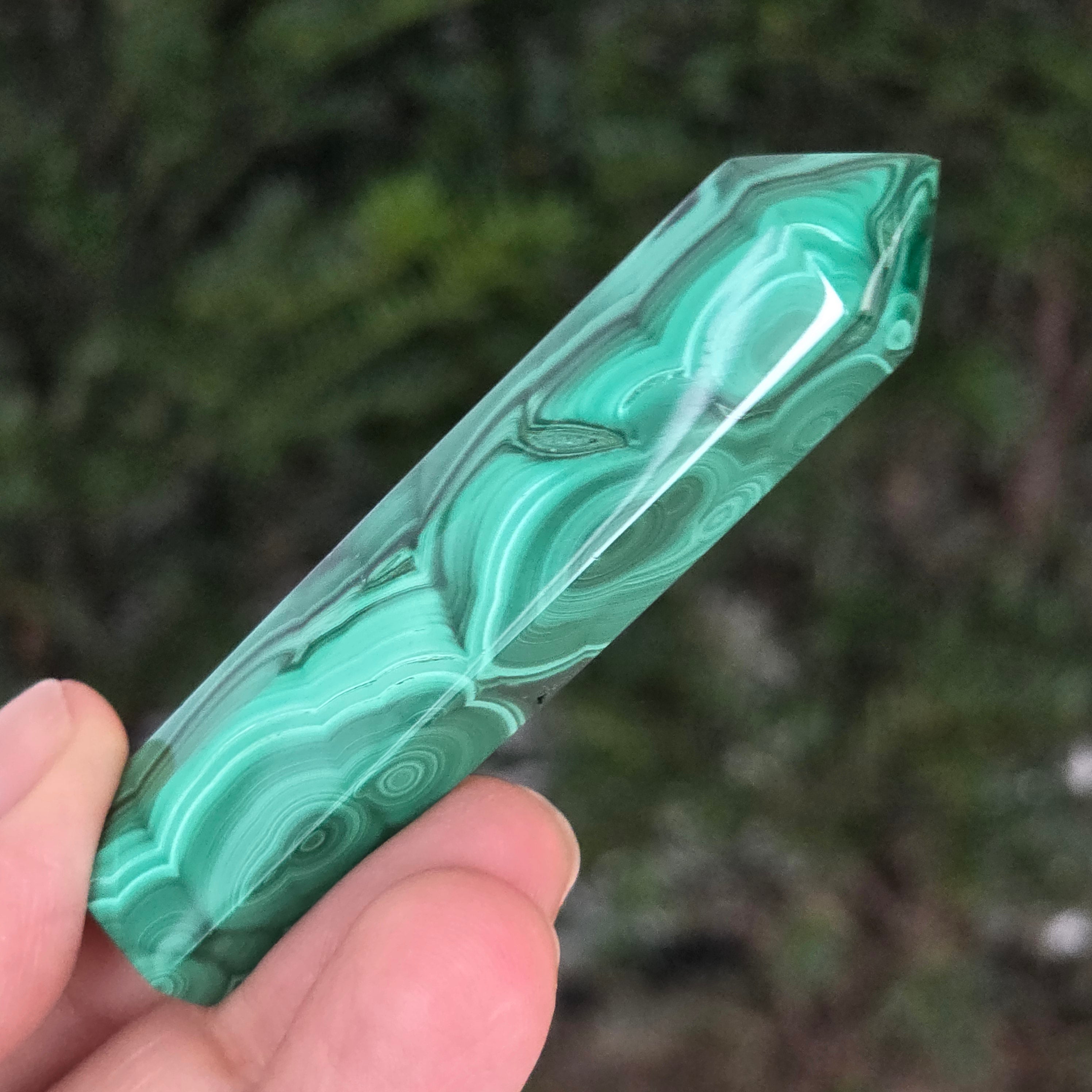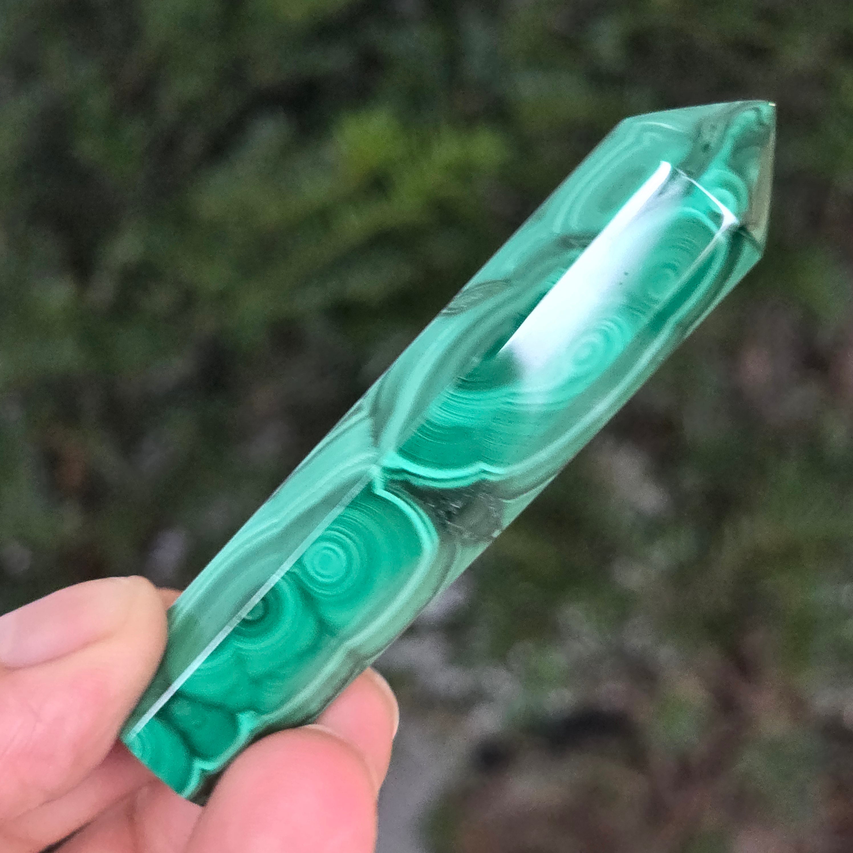 Обелиск, който сякаш е оживял от зелените дълбини на планетата. този уникално парче естествен малахит, разкрива хипнотизиращи слоеве от изумрудено зелено, тъмнозелено и копринени нюанси на нефрит, подредени в уникални концентрични шарки като карти на вътрешните енергии. Ръчно полиран до кадифен блясък, обелискът излъчва дълбока минерална елегантност.