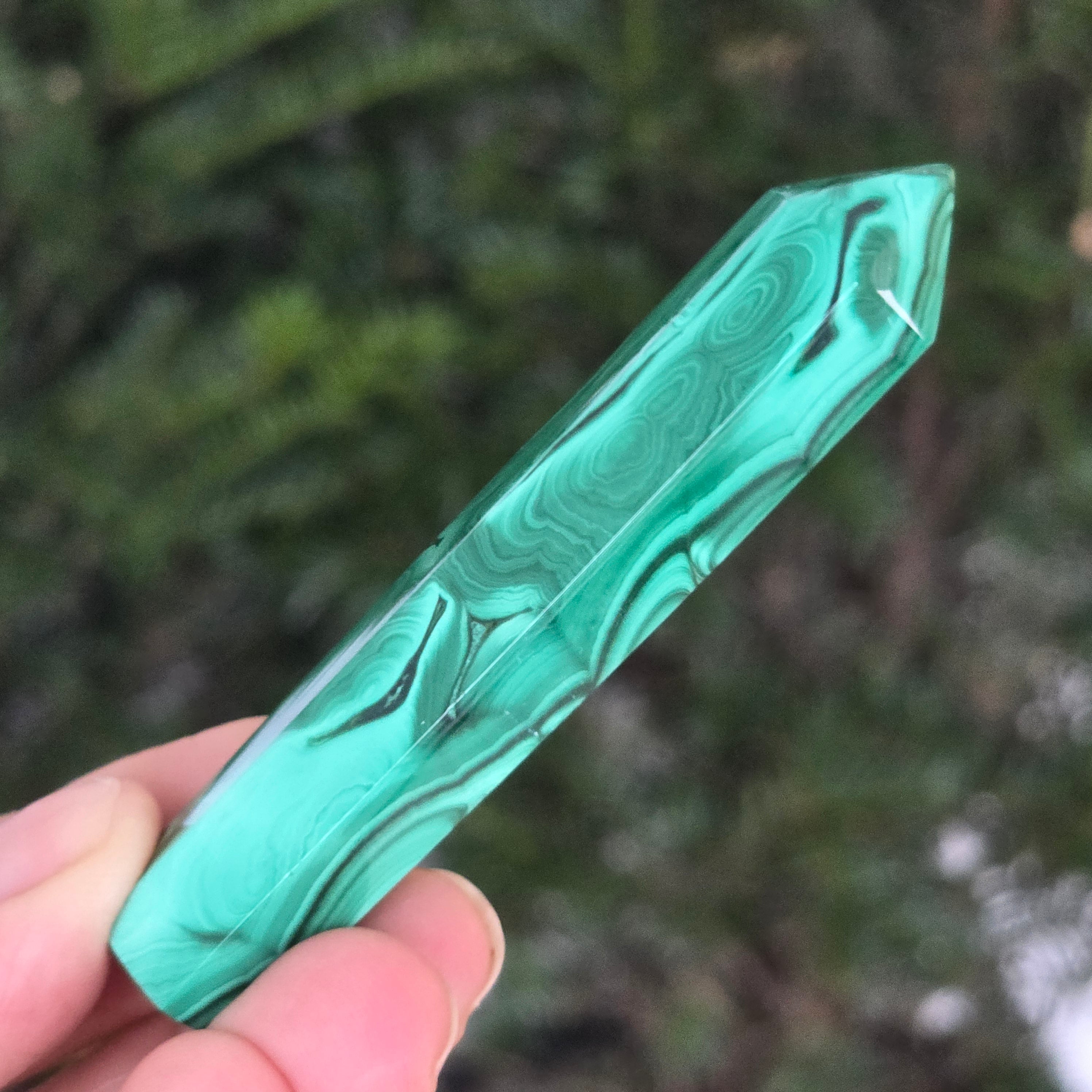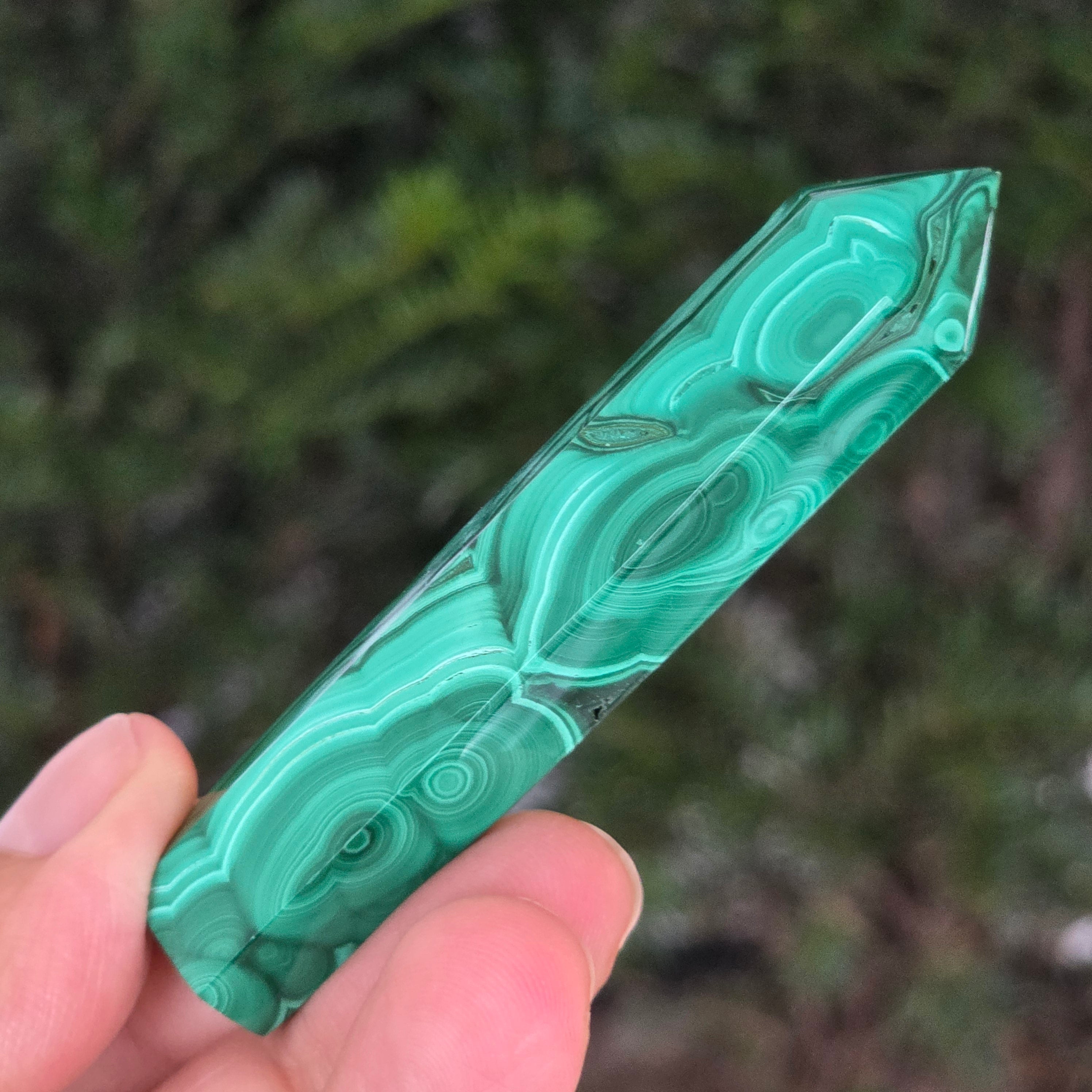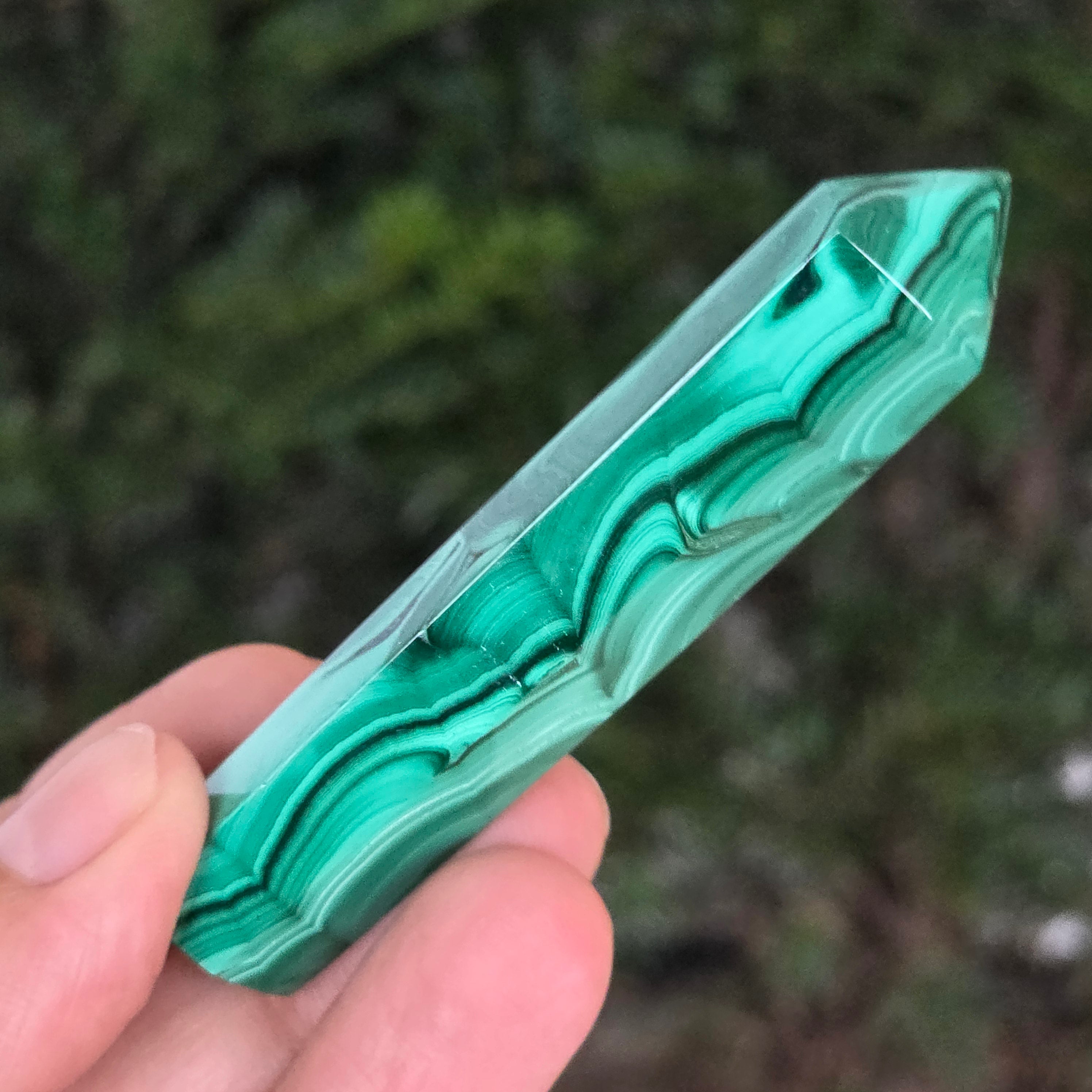 Обелиск, който сякаш е оживял от зелените дълбини на планетата. този уникално парче естествен малахит, разкрива хипнотизиращи слоеве от изумрудено зелено, тъмнозелено и копринени нюанси на нефрит, подредени в уникални концентрични шарки като карти на вътрешните енергии. Ръчно полиран до кадифен блясък, обелискът излъчва дълбока минерална елегантност.