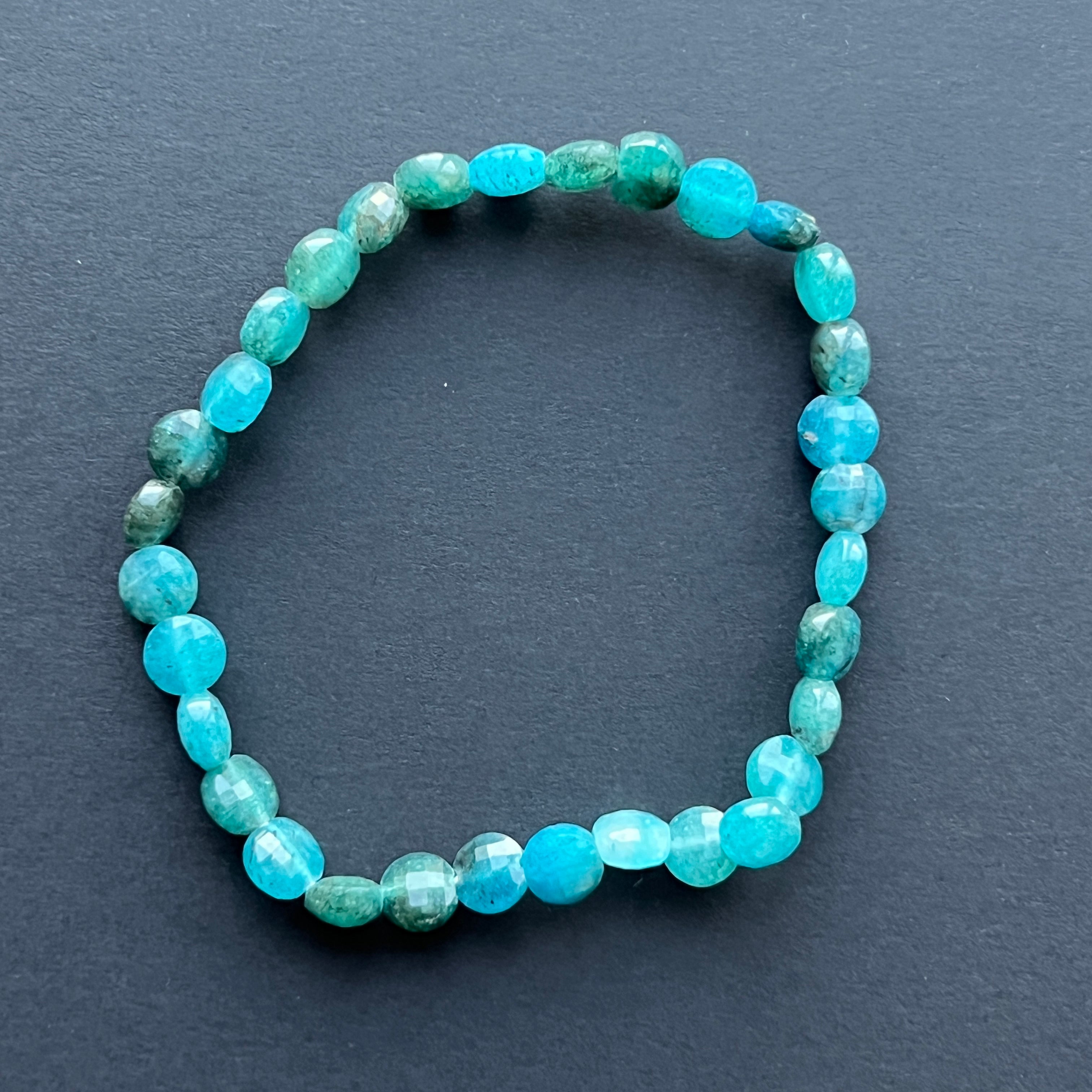 Избери гривната от апатит с фасетирани кръгли дискове, за да носиш винаги със себе си енергията на яснота и синьо вдъхновение. 🌊✨.