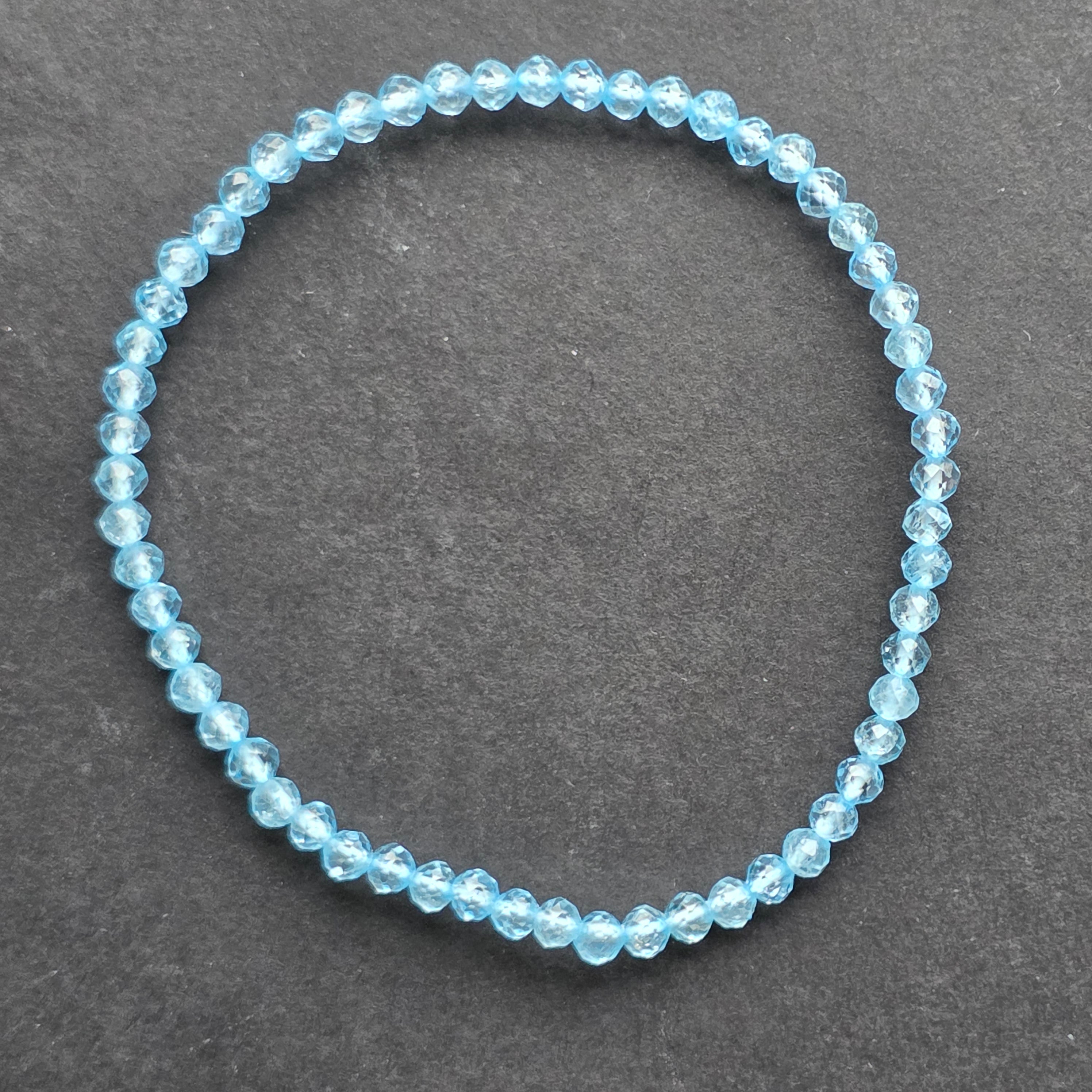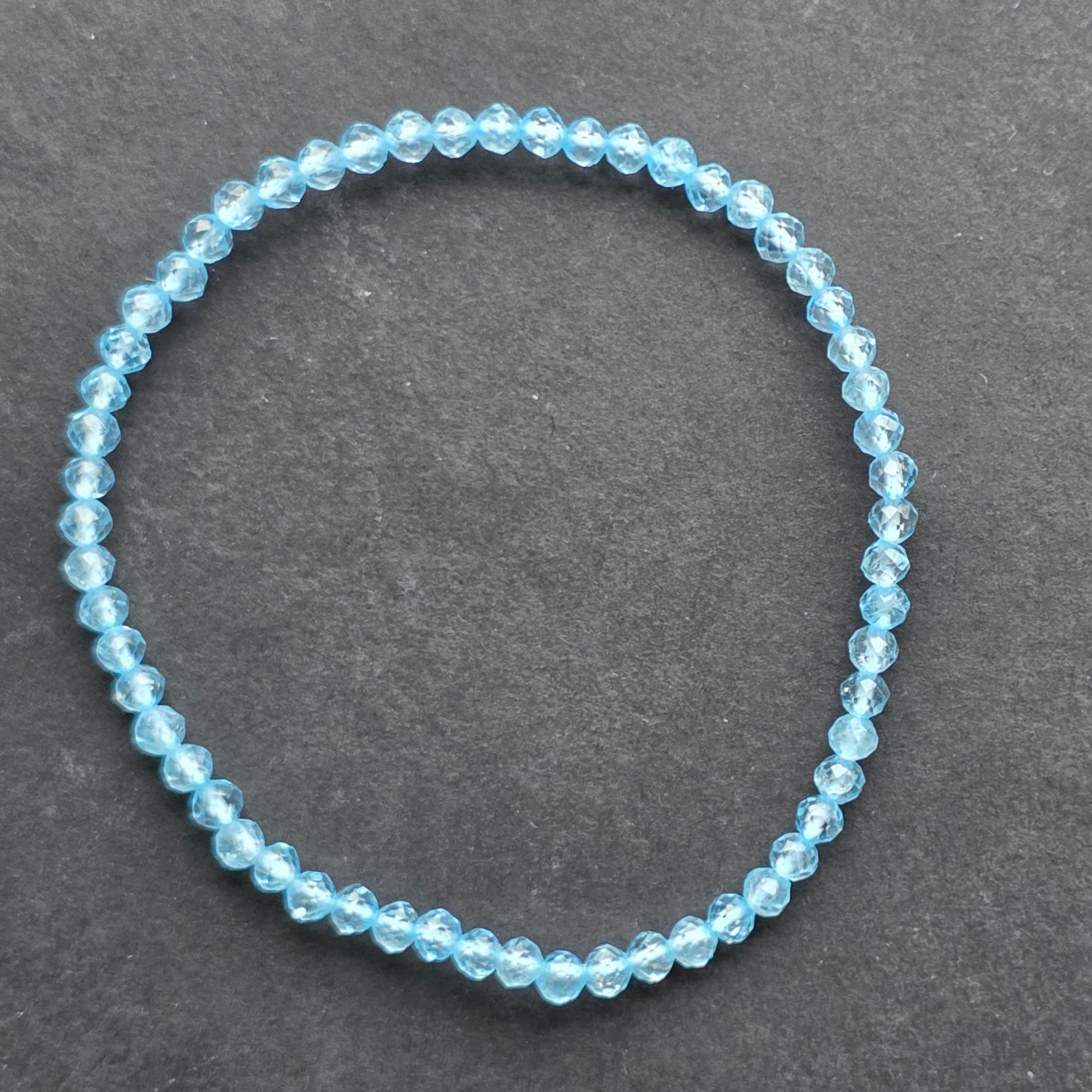 Нежна гривна като морски бриз, където светлината на небето се отразява във всяка страна. Мънистата фасетиран естествен син топаз, с диаметър от 3 мм, излъчва чист, кристален блясък, напомнящ бистрите води на ясно утро. Това е фин и изискан скъпоценен камък, създаден за тези, които търсят баланс и вътрешен мир.